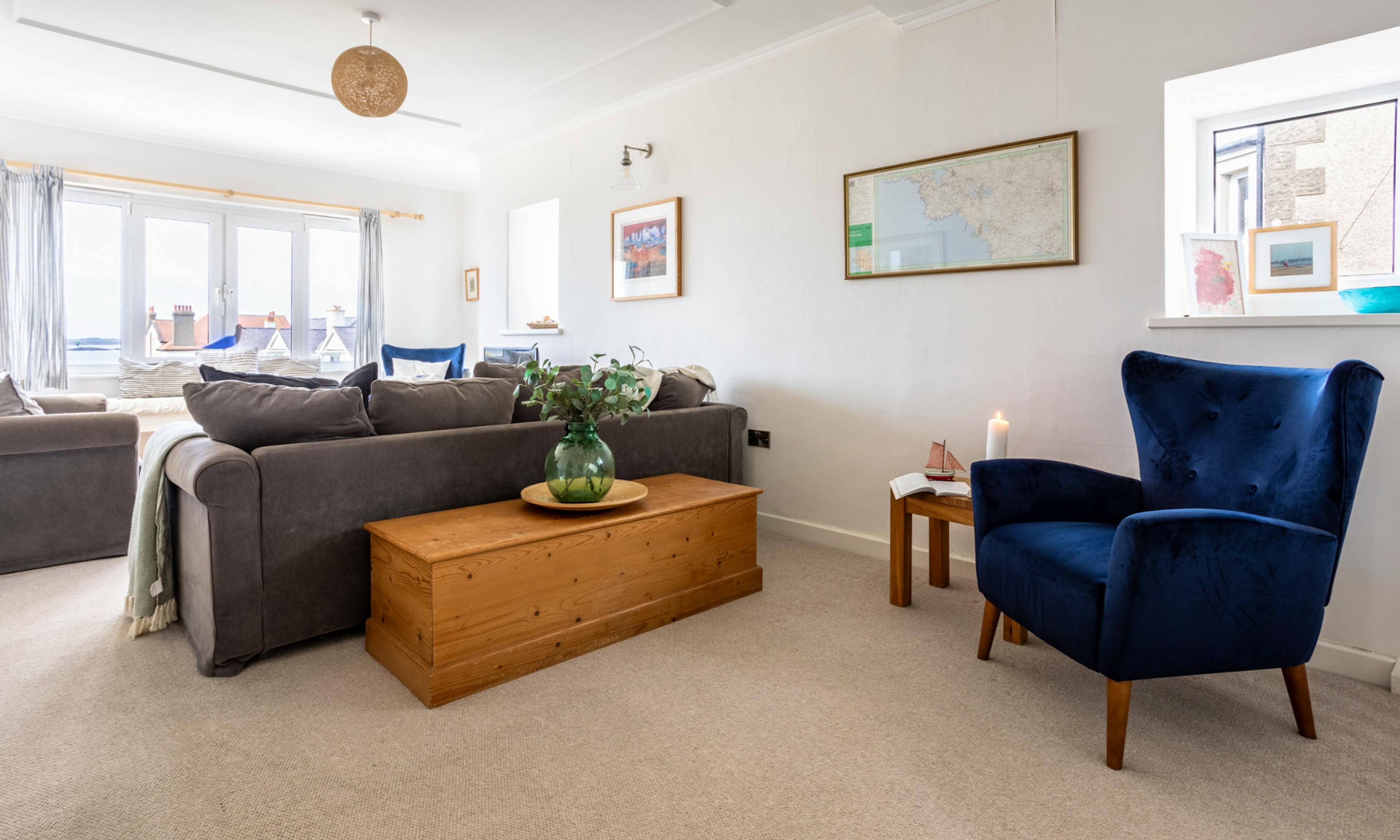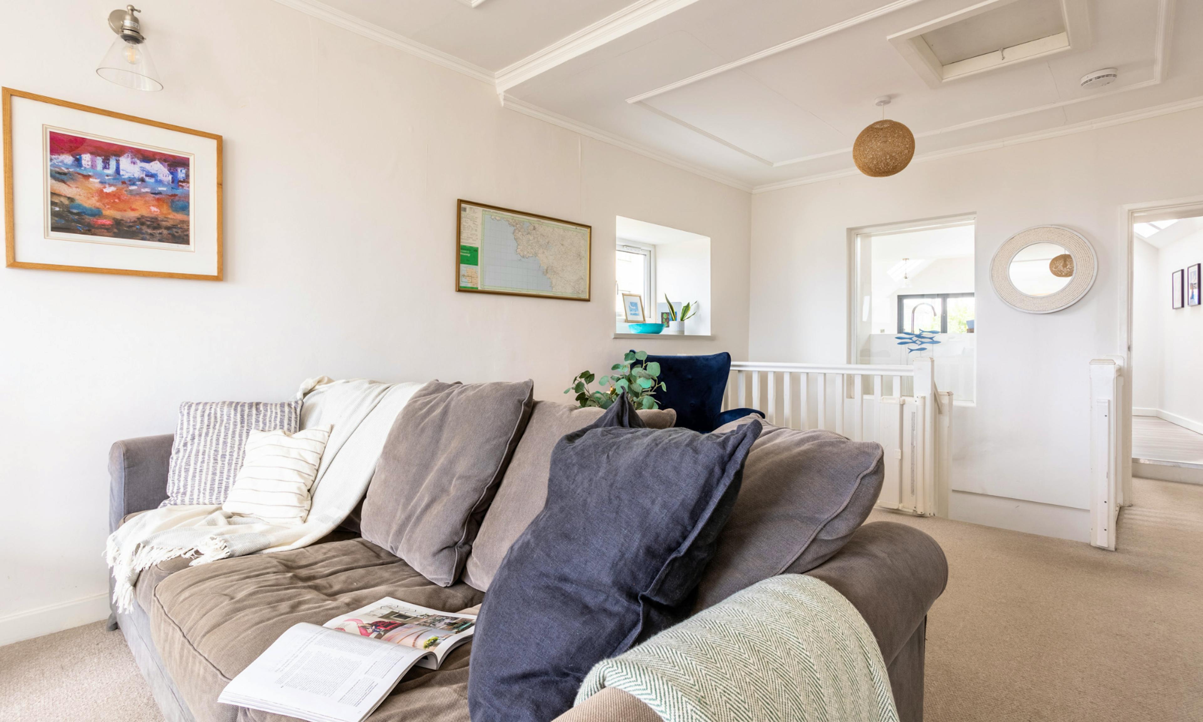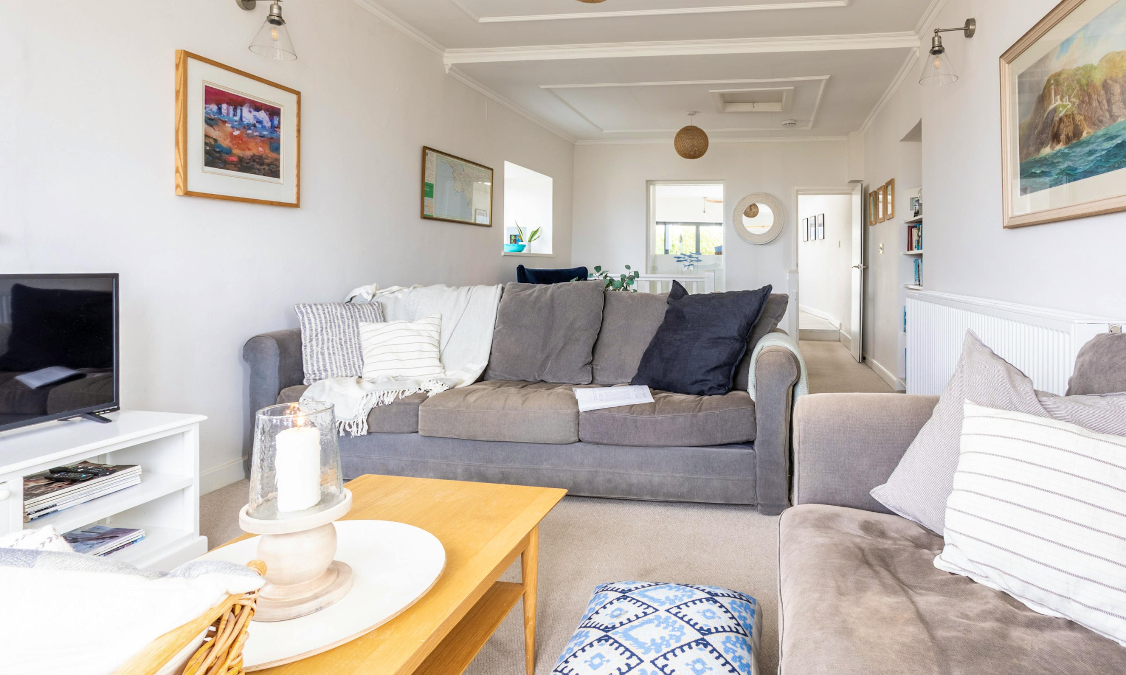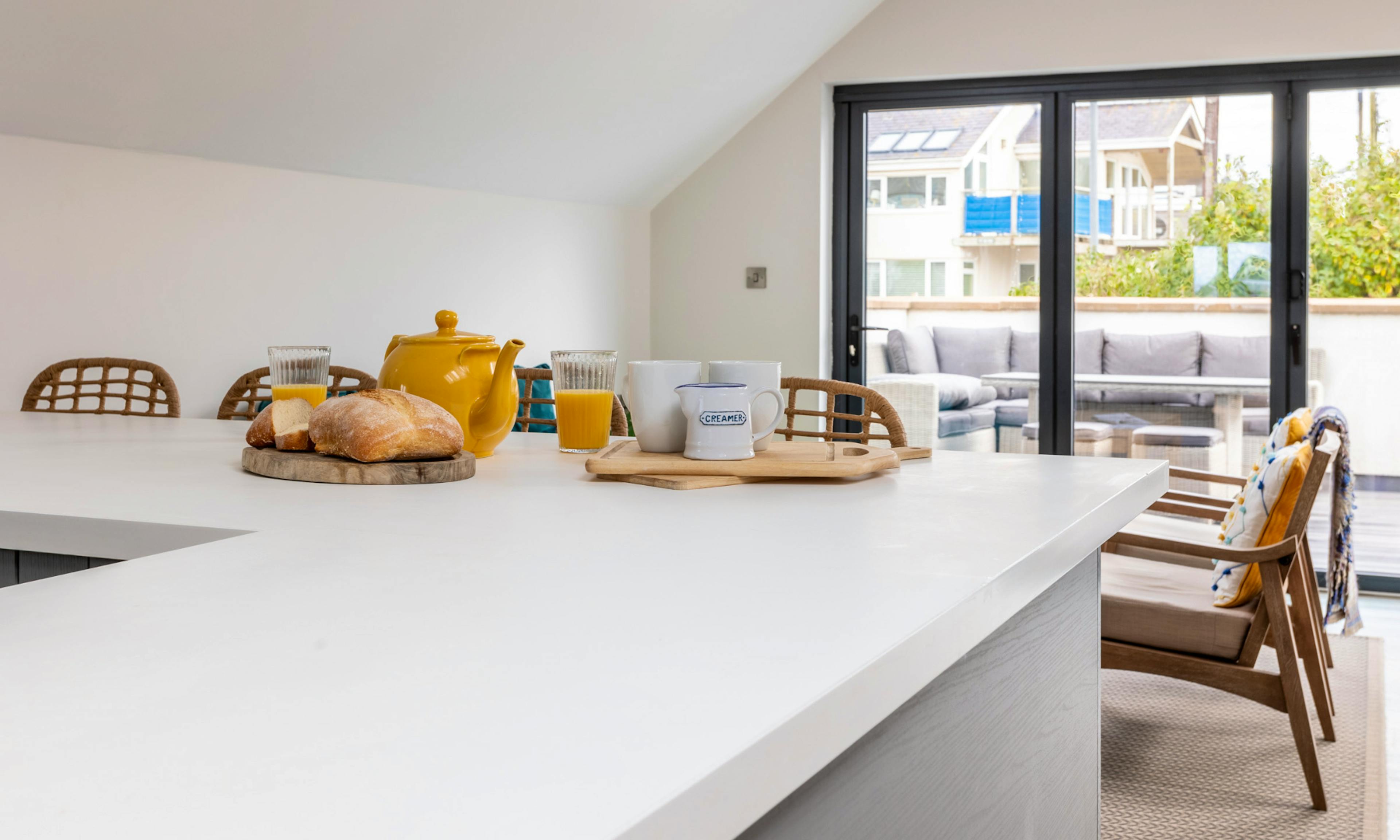 Light-filled open-plan living space upstairs with vaulted ceilings, a sleek kitchen, oversized sofas and a glass wall that opens onto a decked terrace with sea views.