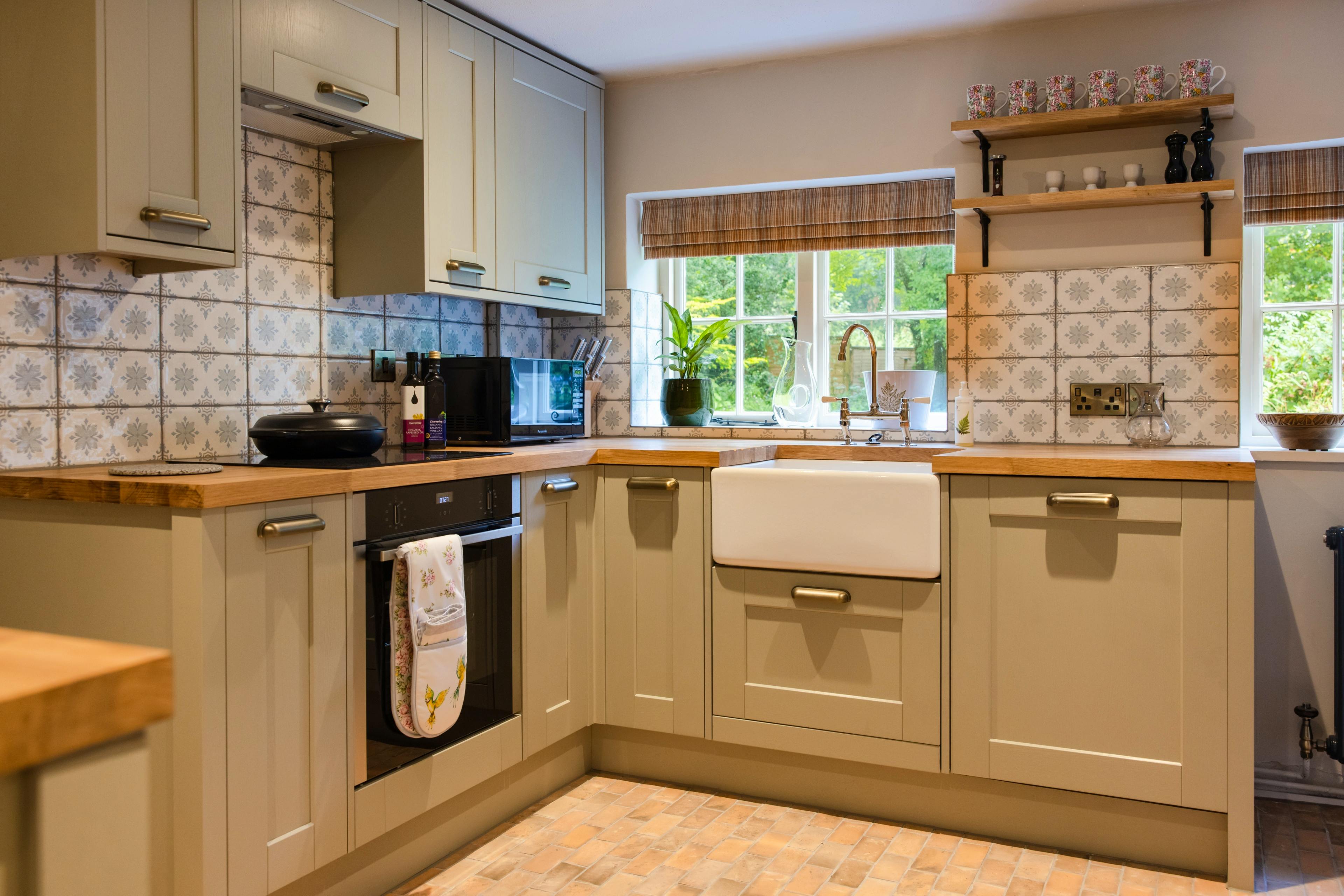 Charming farmhouse-style kitchen with butler sink, rustic details and modern appliances for effortless cooking.