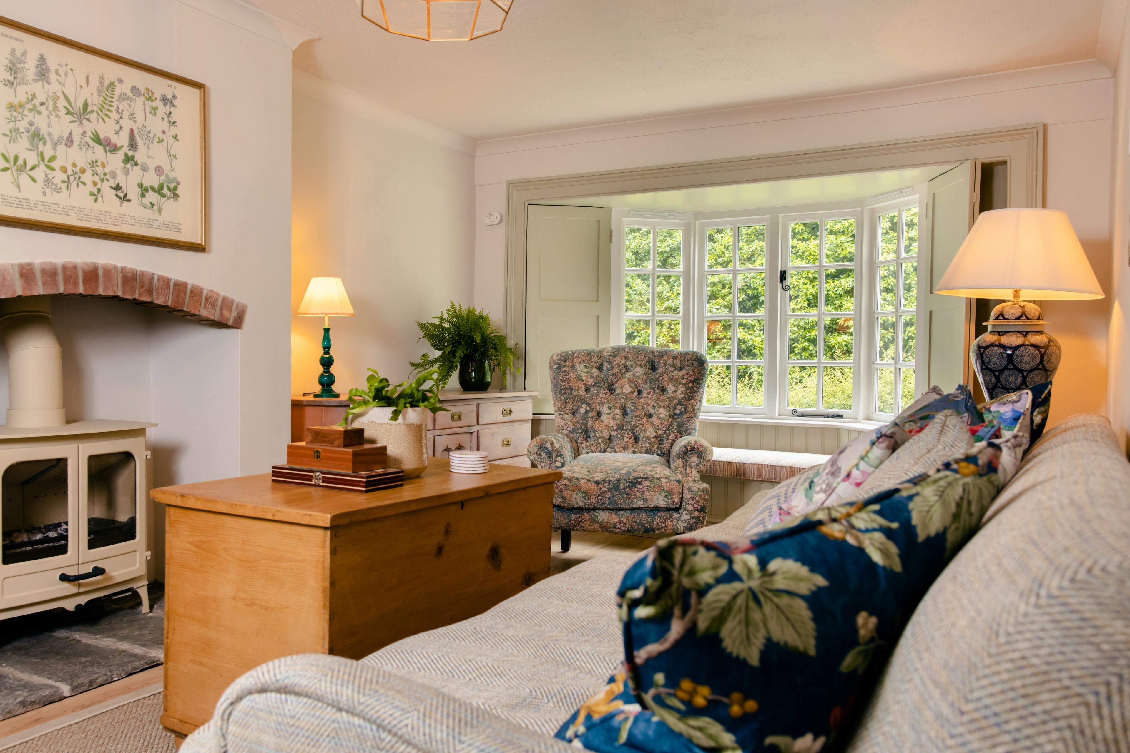 Cosy lounge with a wood-burner, comfy seating and a warm, homely atmosphere.
