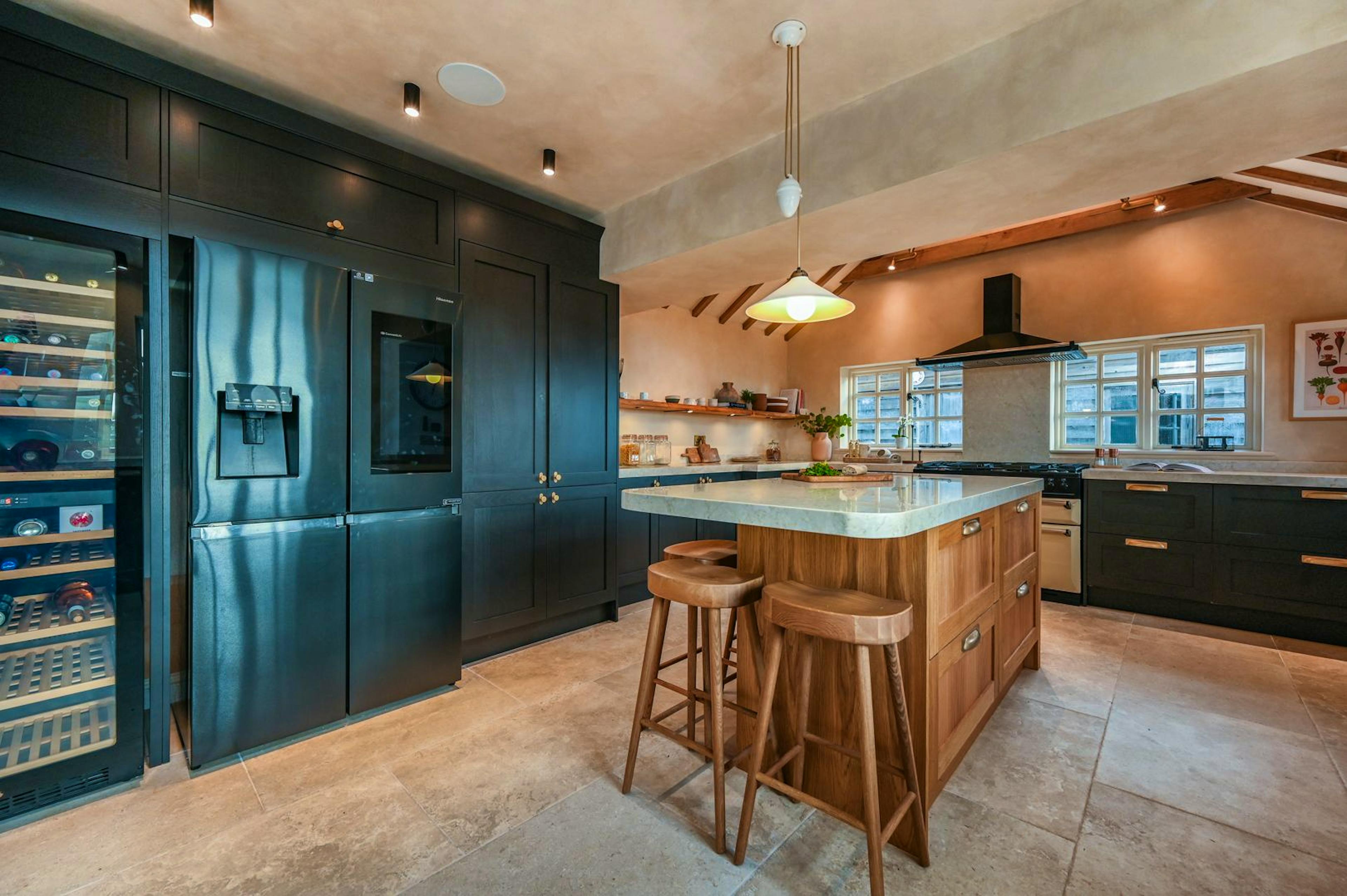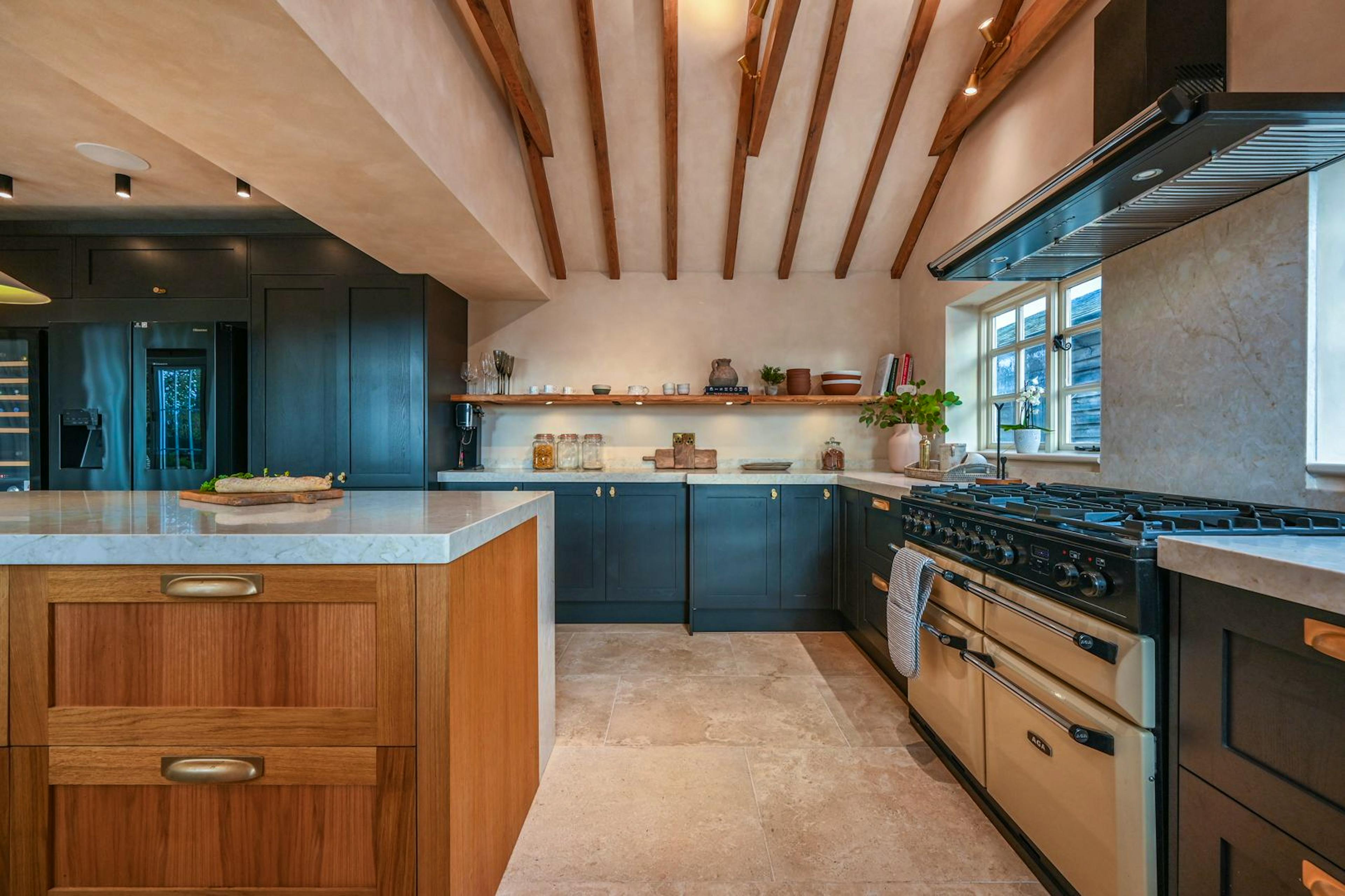 A showstopping kitchen with marble worktops, vaulted ceiling and island made for shared cooking and conversation.