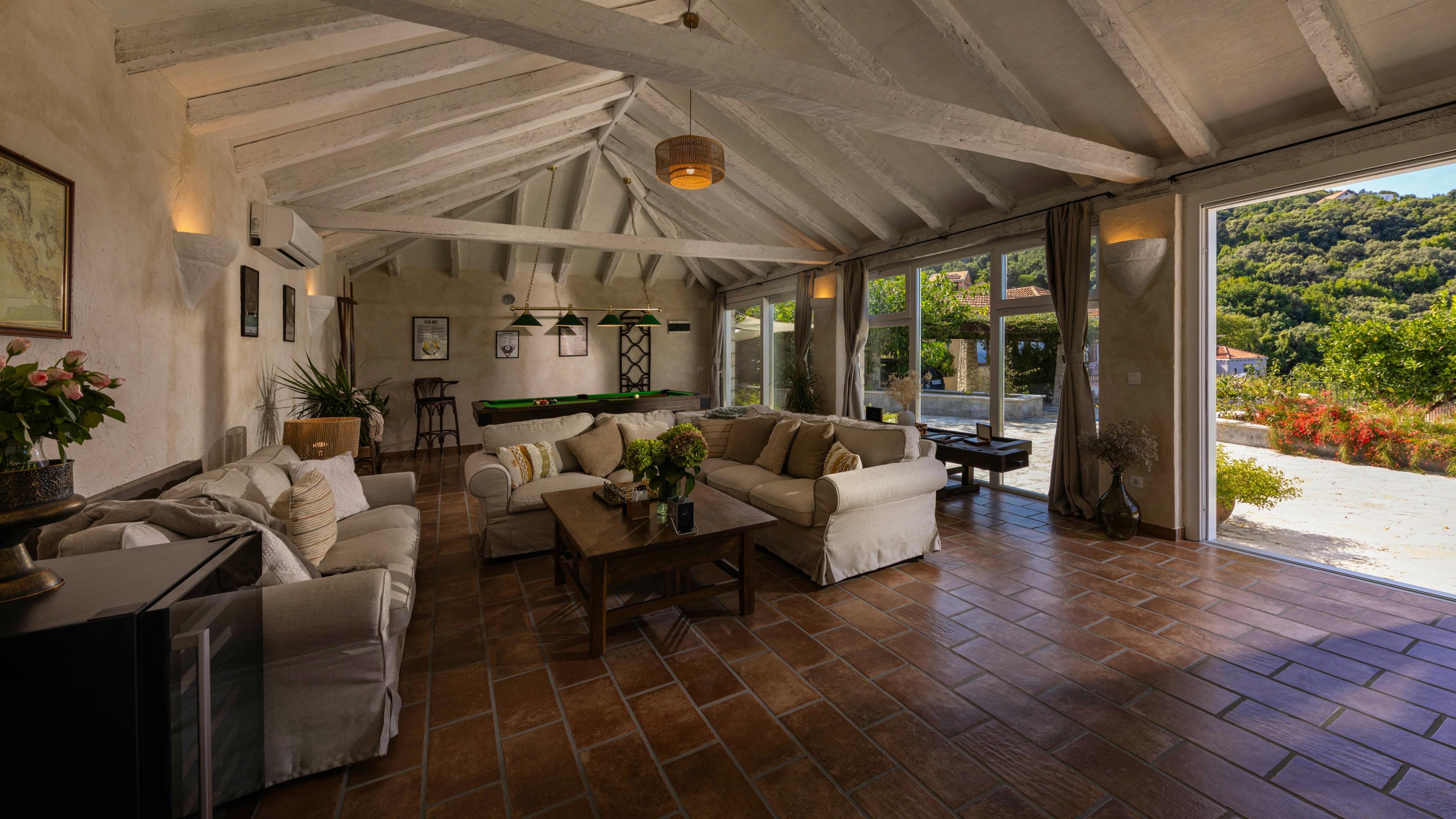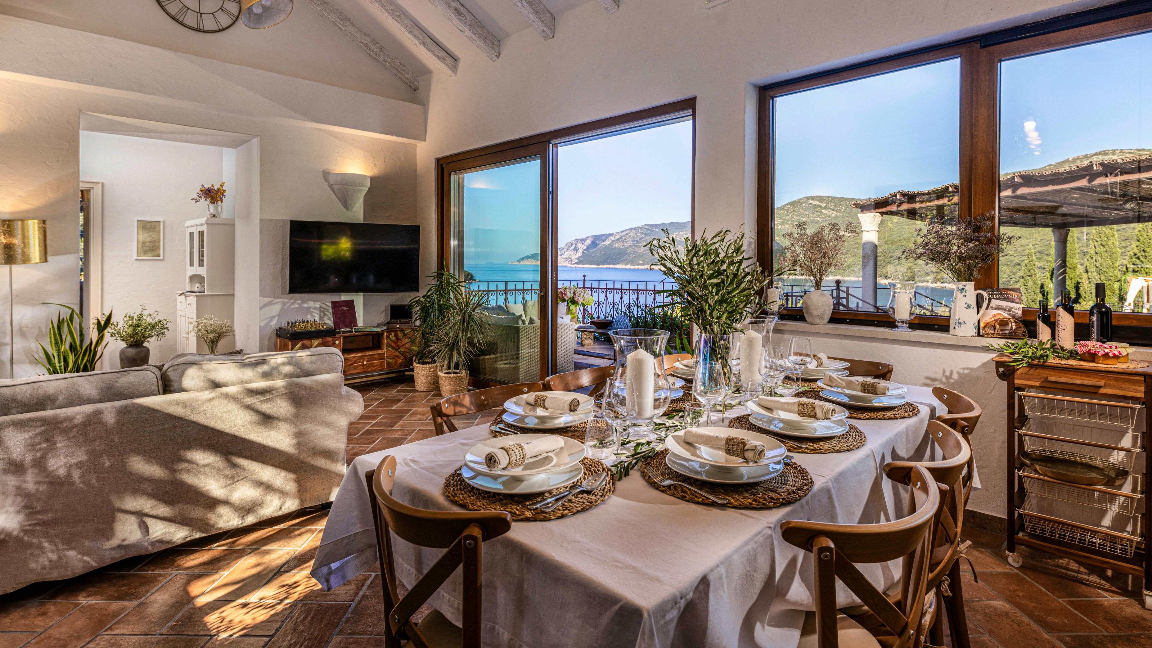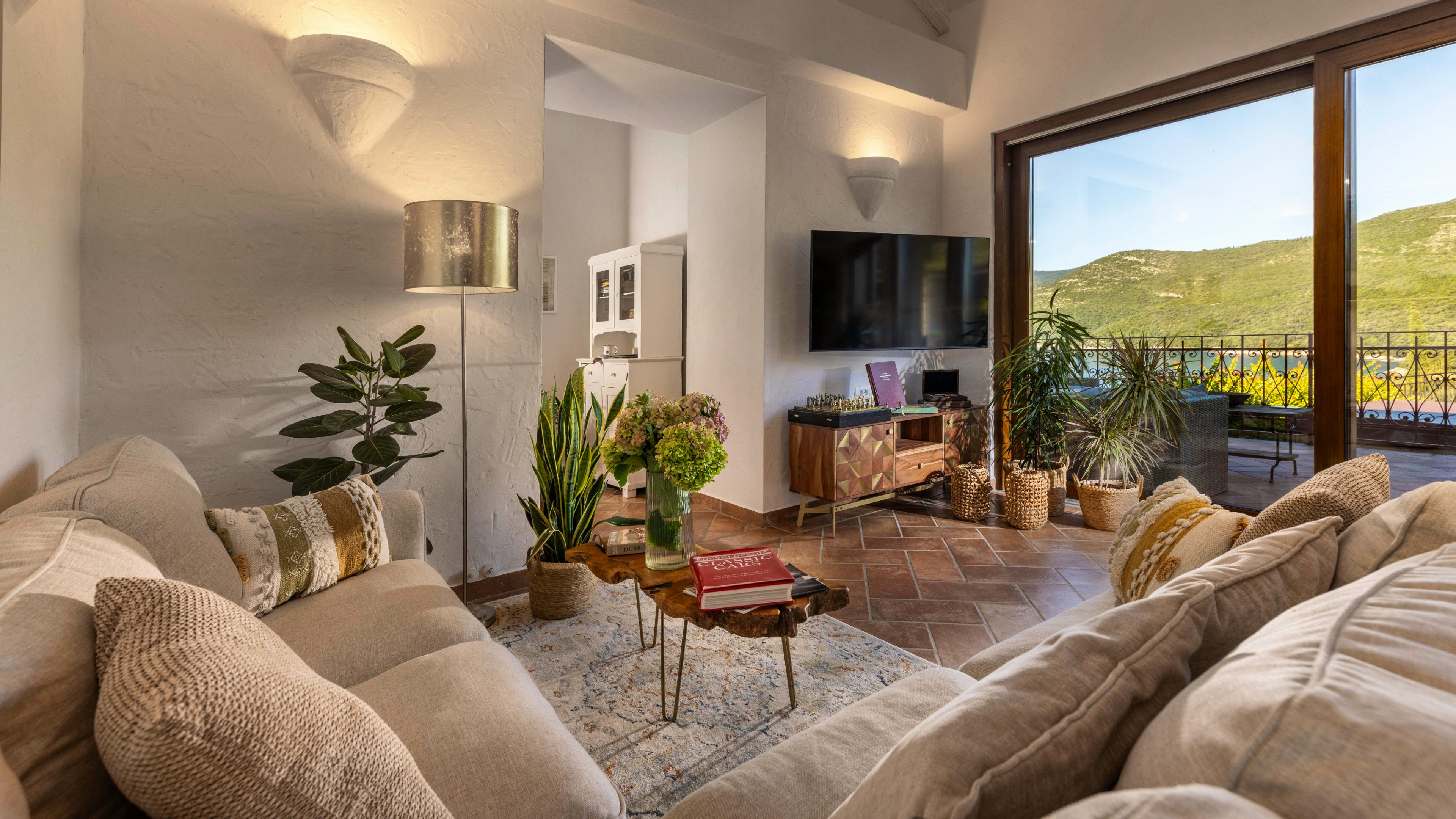 Inviting living space with terracotta floors, oakwood accents and vast glass doors that frame the endless blue of the Adriatic.