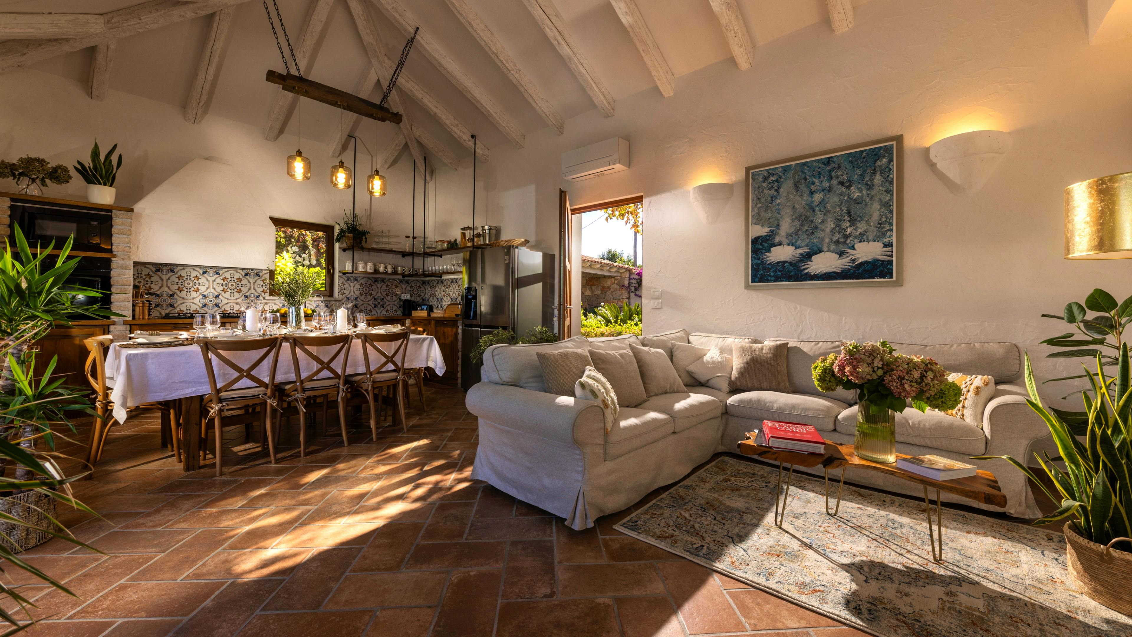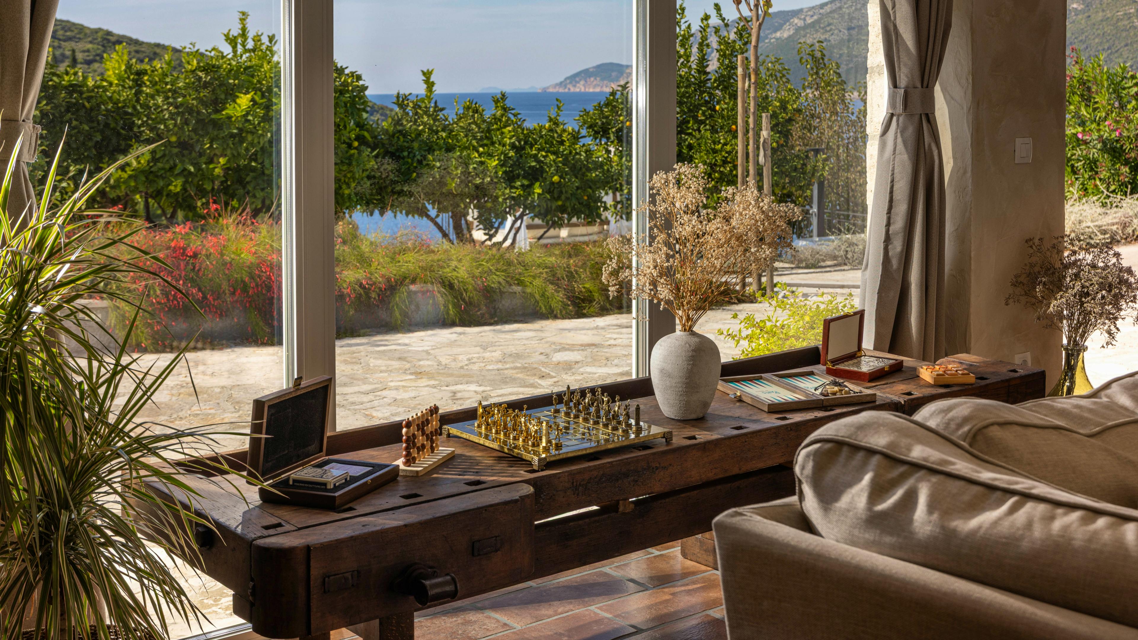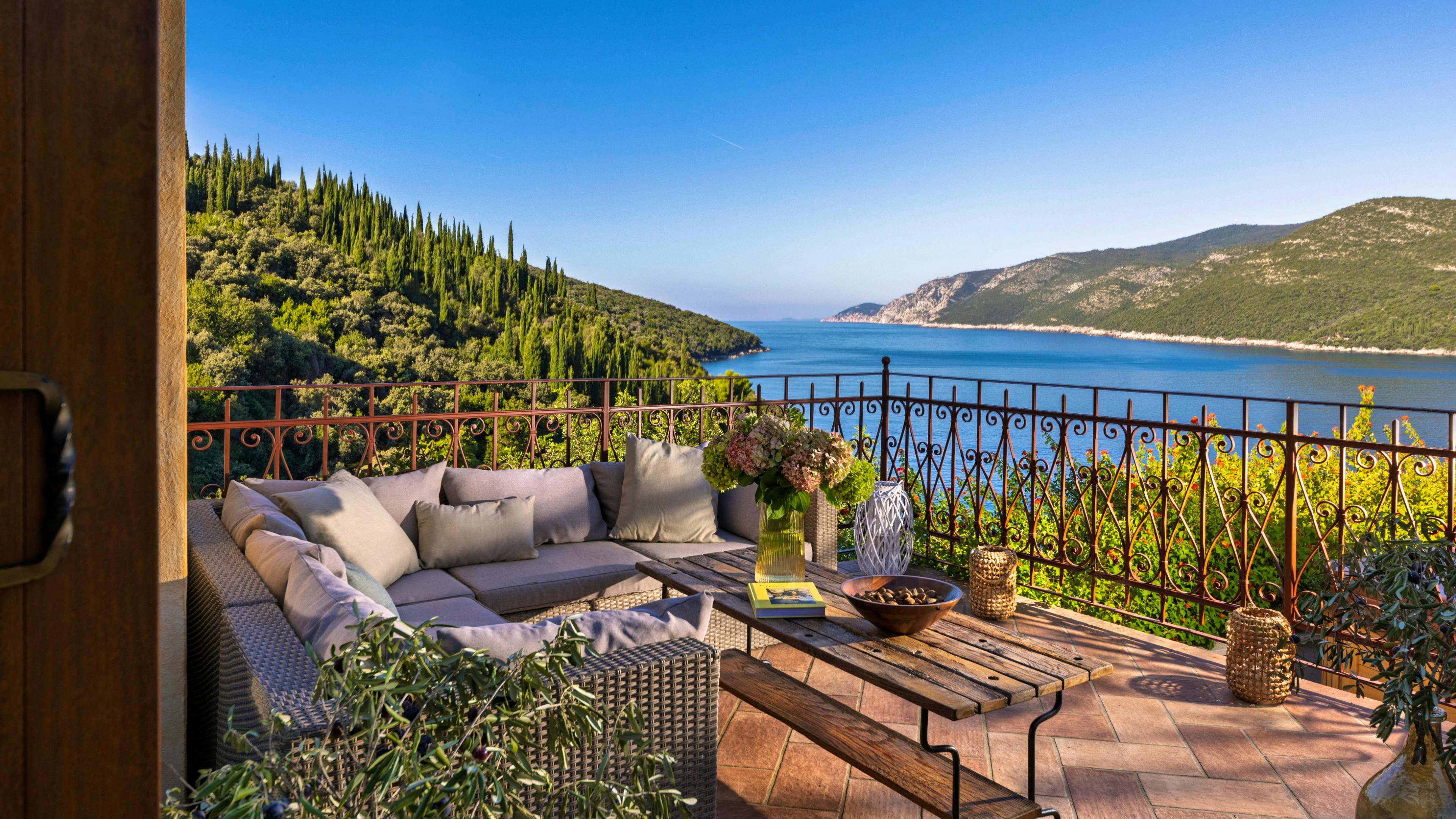 Inviting living space with terracotta floors, oakwood accents and vast glass doors that frame the endless blue of the Adriatic.