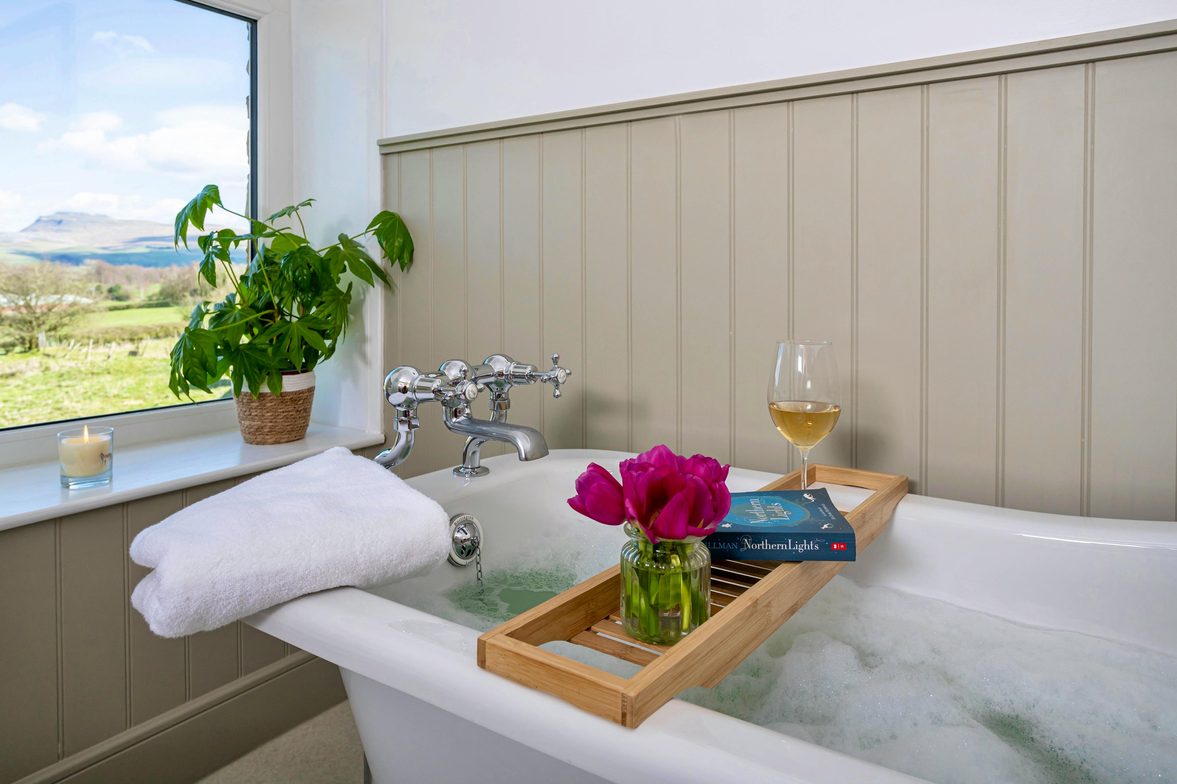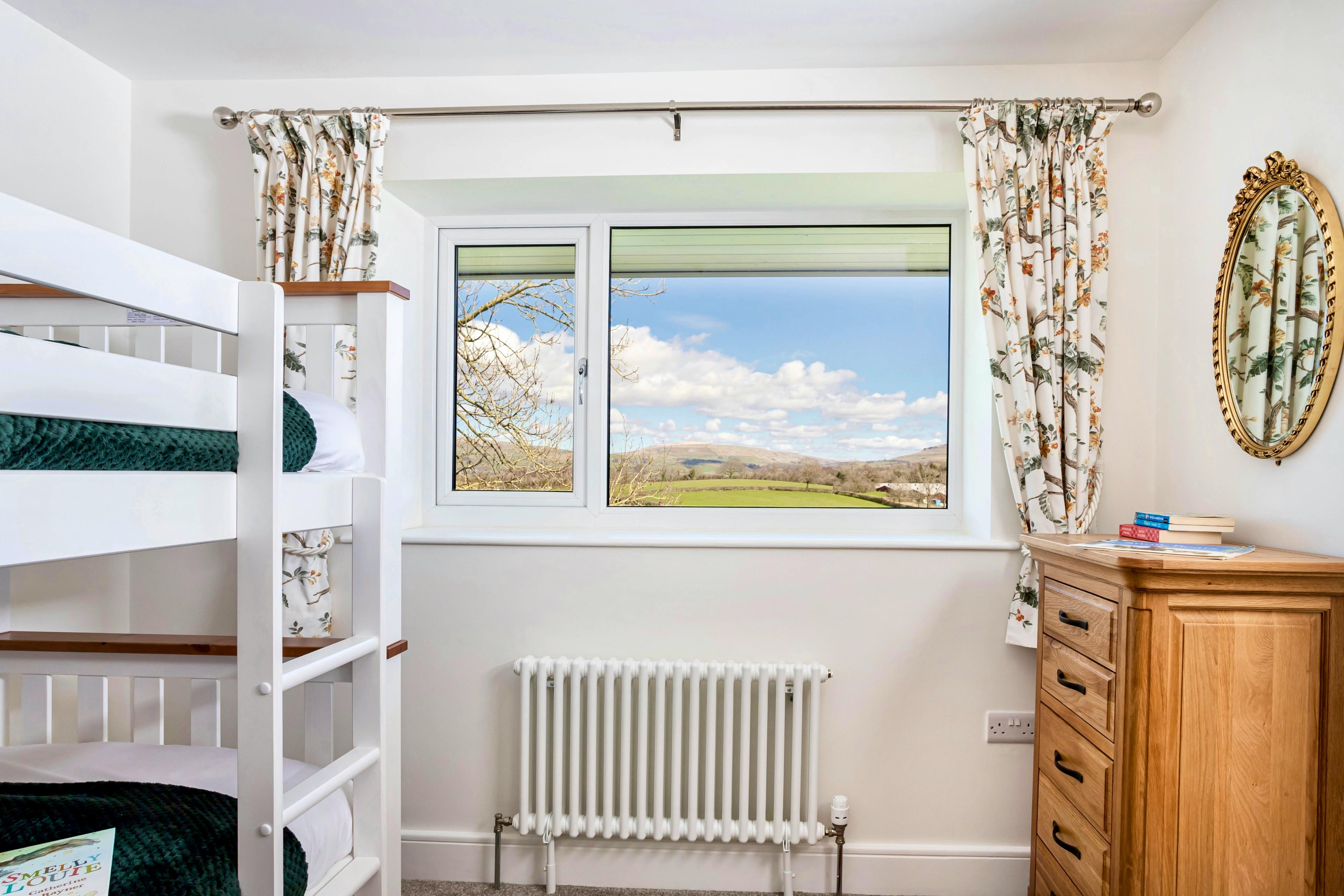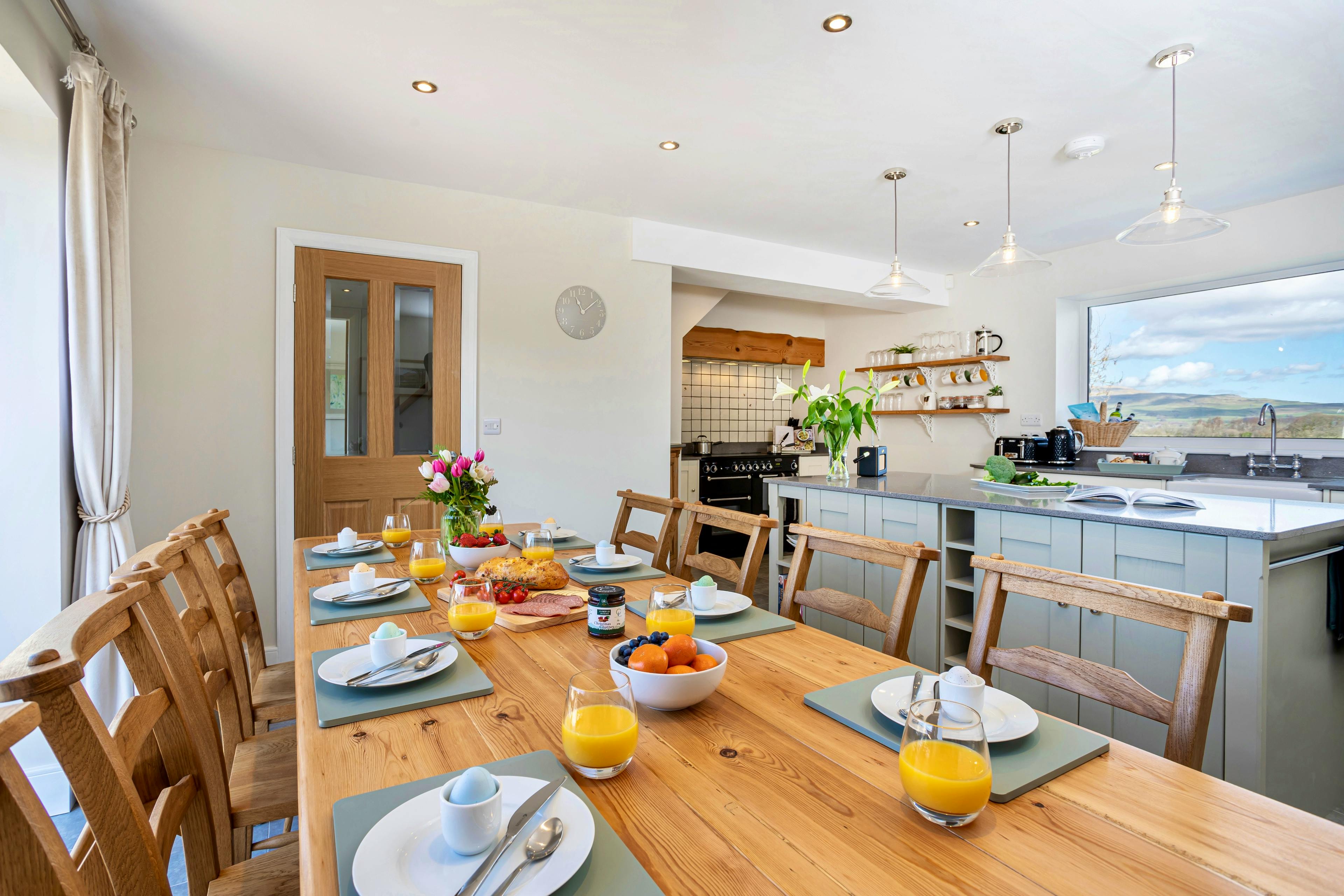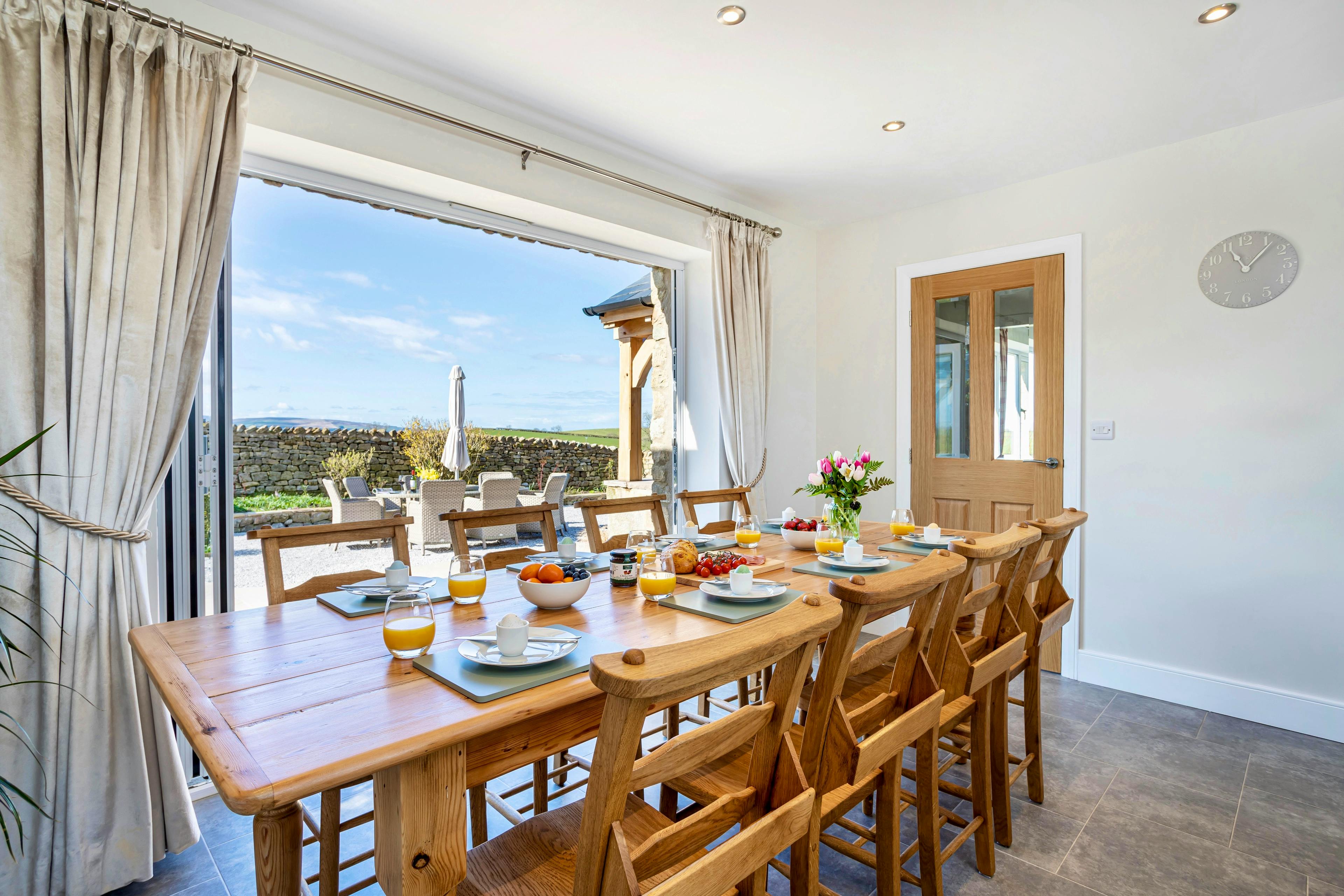 Steeped in history and wrapped in big-sky views, New Thornber is a beautifully restored Yorkshire stone cottage sitting right on the edge of the Yorkshire Dales National Park. From the moment you arrive, the sense of space, calm and connection to the landscape is striking, with panoramic views stretching across the iconic Yorkshire Three Peaks and rolling countryside beyond. This is a place to slow down, breathe deeply and truly settle into Dales life. Inside, the cottage blends traditional charm with thoughtful modern luxury. Exposed stone, soft textures and carefully chosen artwork create a warm, welcoming atmosphere that feels both refined and relaxed. The heart of the home is the open-plan kitchen and dining space, designed for long, sociable meals and easy togetherness. A range cooker, generous worktops and a beautiful antique farmhouse table make cooking a pleasure, while bi-fold doors open onto the terrace for effortless alfresco dining on sunny days. The living room is equally inviting, with deep sofas, an electric Aga-style log burner and postcard-worthy views framed by every window. Whether you’re curling up with a book, enjoying a family film night on the Smart TV or simply watching the light shift across the hills, this space encourages you to unwind completely. New Thornber sleeps up to eight guests across four beautifully designed bedrooms, making it ideal for multi-generational families and small groups. A ground floor super-king size bedroom with zip-and-link beds sits beside a shower room, perfect for those who prefer easy access. Upstairs, you’ll find a double bedroom with ensuite, another elegant double and a cosy bunk room. The luxurious family bathroom features a walk-in shower and a roll-top slipper bath positioned to soak up views of Ingleborough and Whernside. Outside, secluded cottage gardens and terraces invite you to enjoy the setting from sunrise to sunset. Morning coffee, evening drinks and unforgettable stargazing under the Yorkshire Dales Dark Sky Reserve all come as standard here. When it’s time to explore, you’re perfectly placed for the very best of the Dales. Walk the Ingleton Waterfalls Trail, visit Ribblehead Viaduct or head to Malham Cove and Gordale Scar. Nearby Settle, Kirkby Lonsdale and Hawes offer welcoming pubs, independent shops and local produce, rounding off a stay that captures everything people love about the Yorkshire Dales.