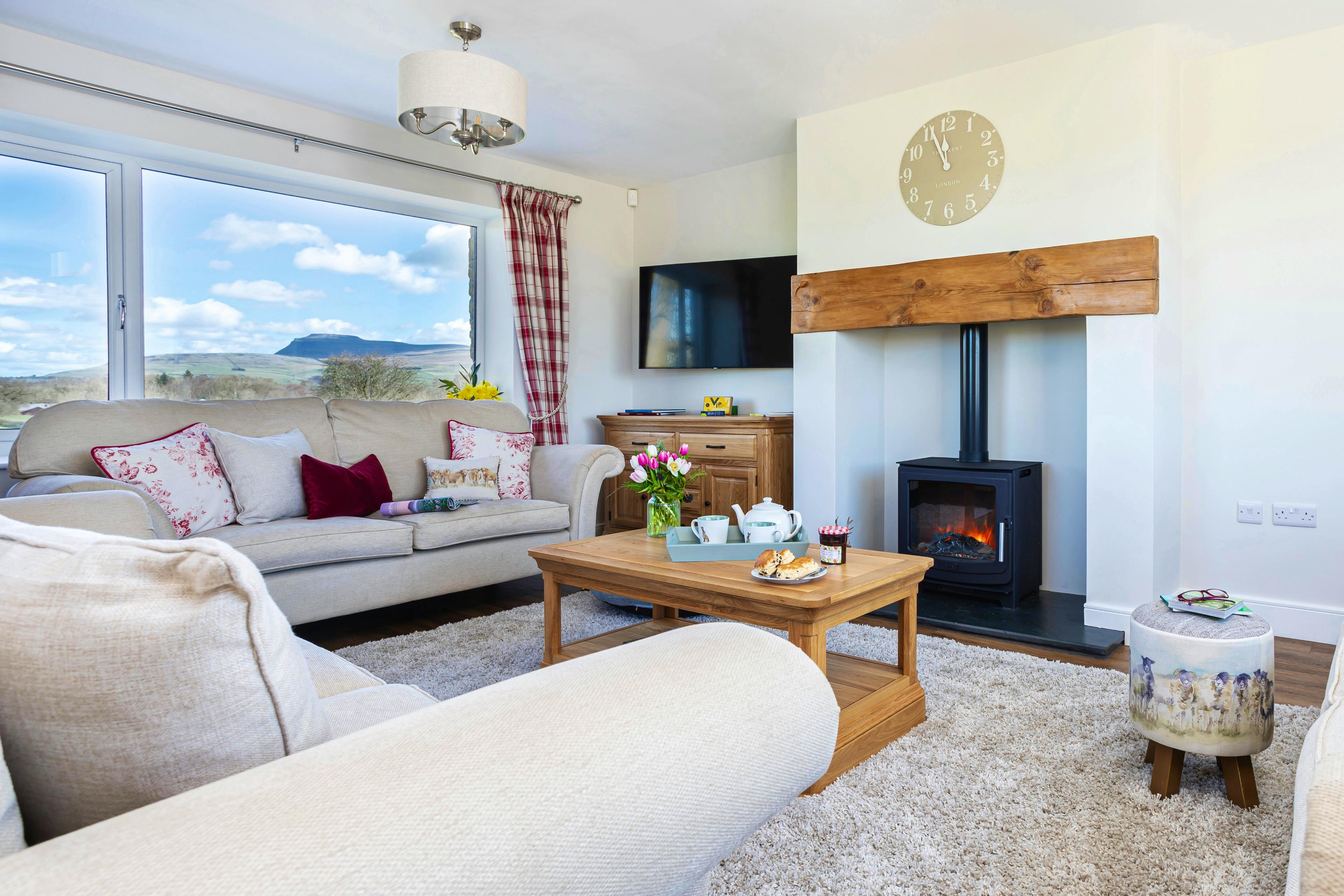 A cosy living room with deep sofas, an electric Aga-style log burner and panoramic countryside views from every window.