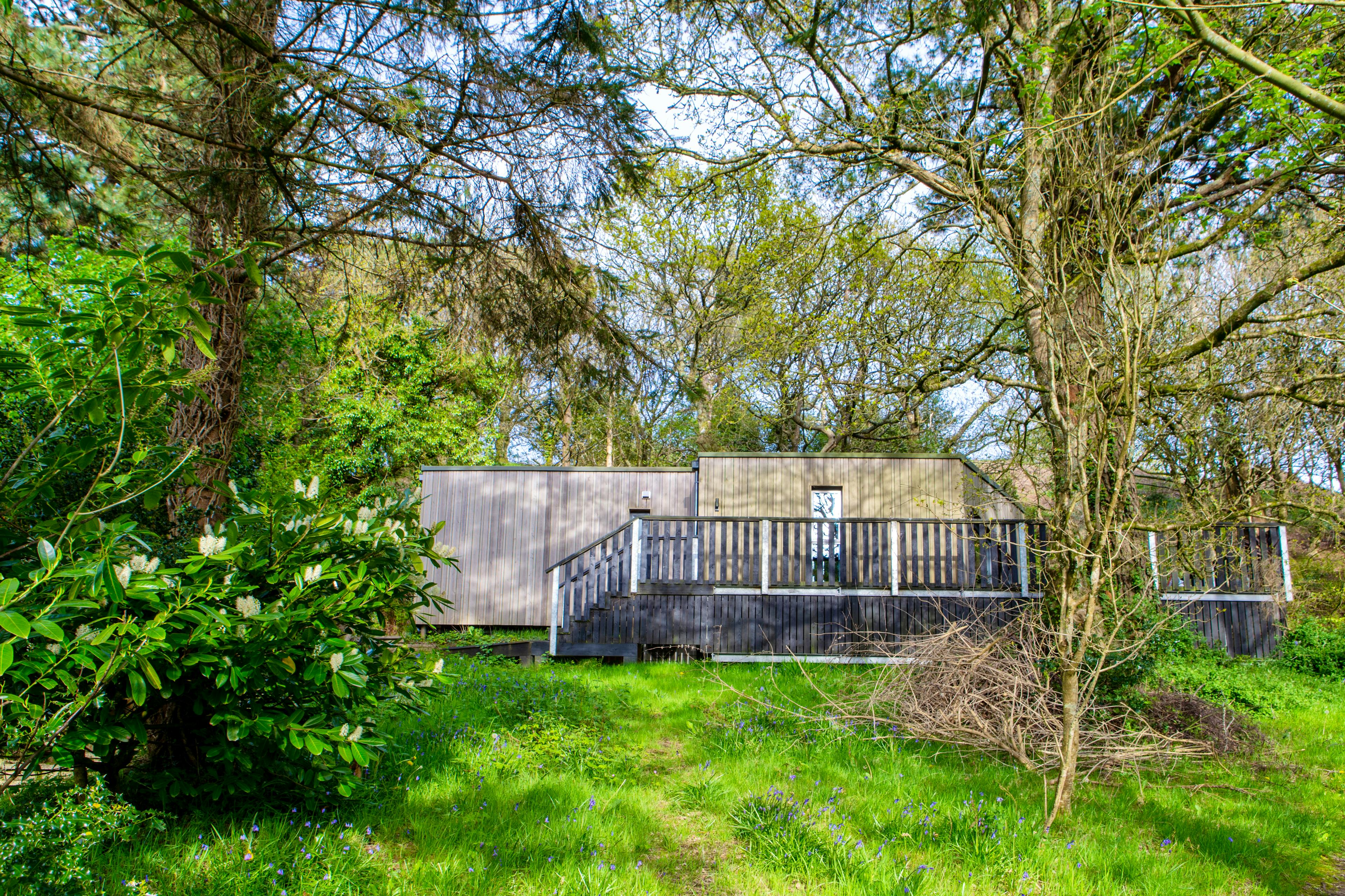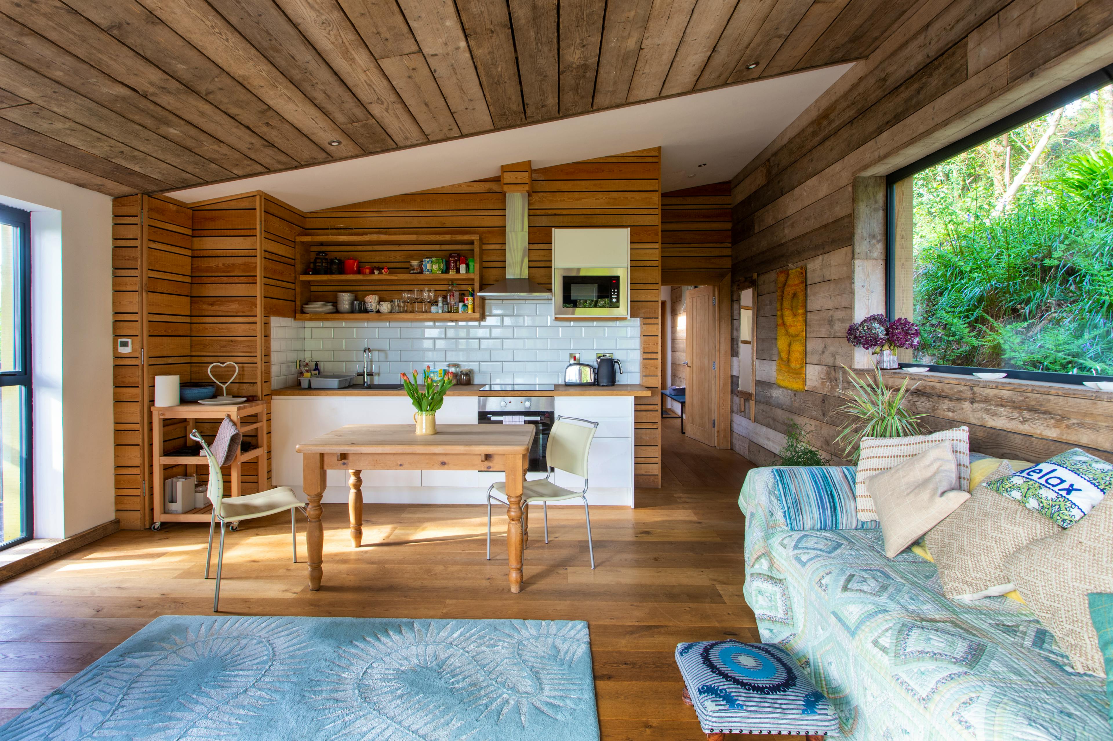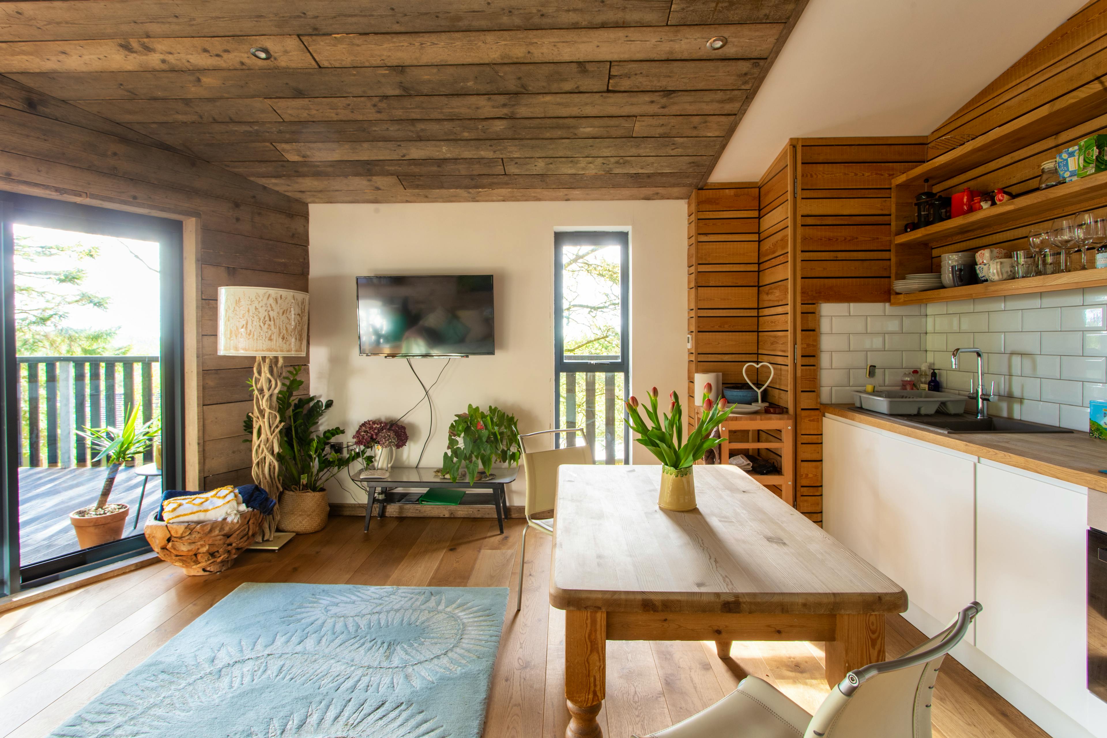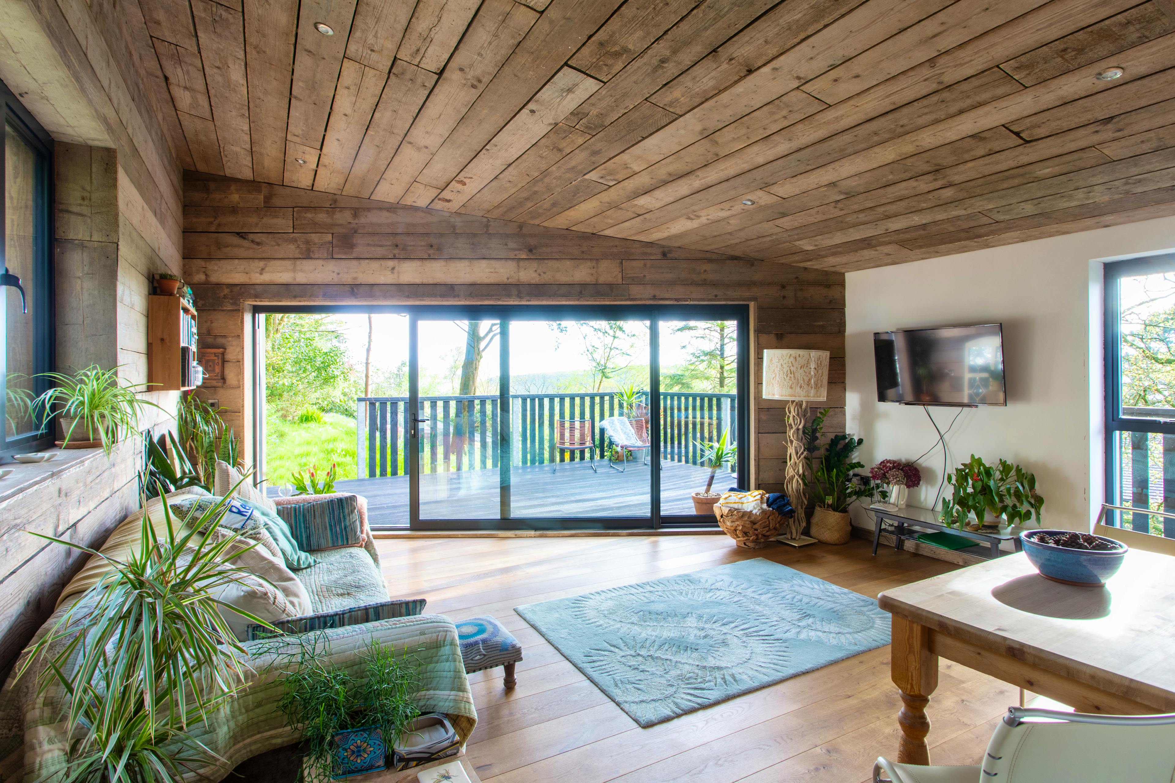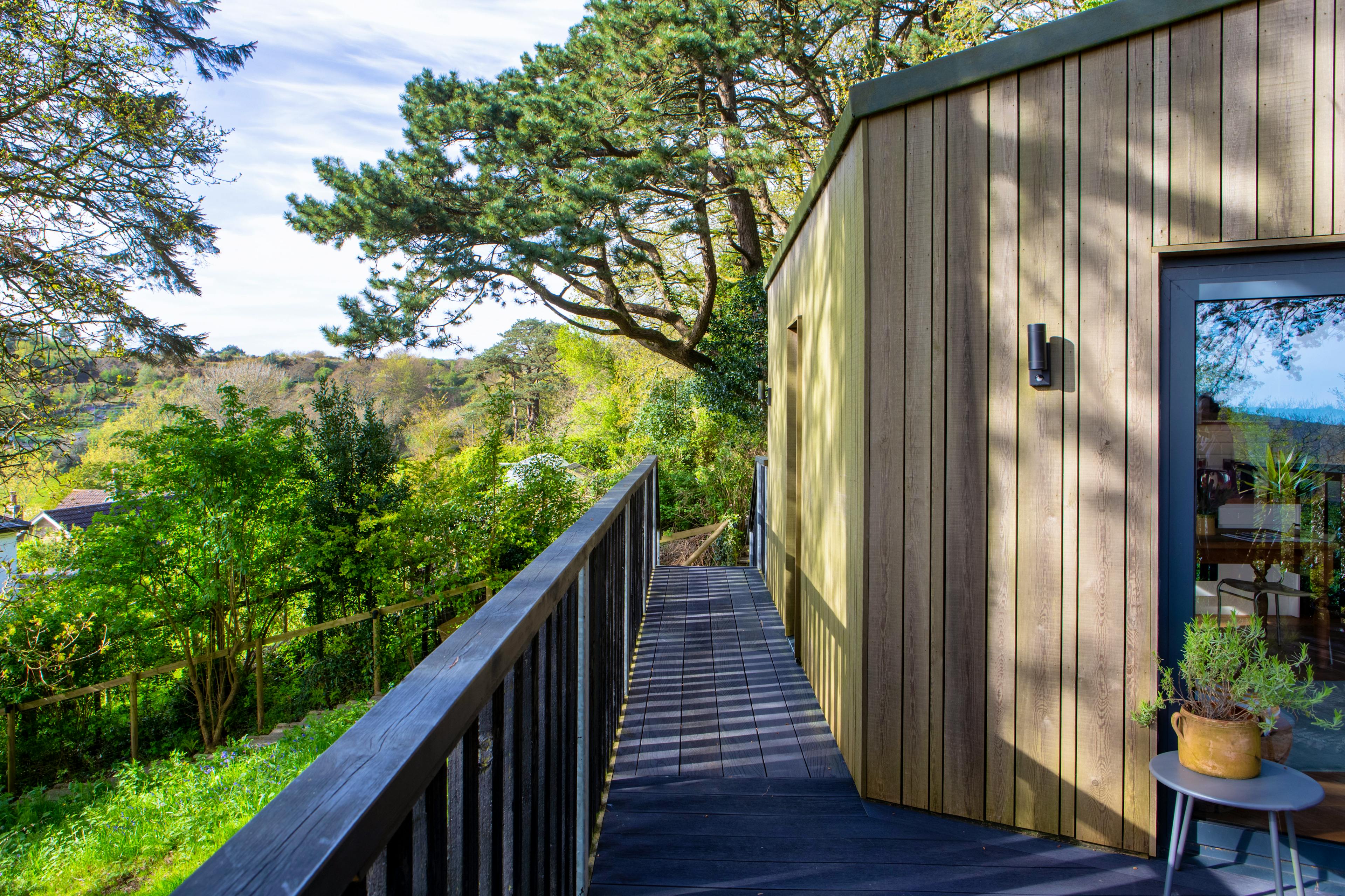 Luxurious timber framed chalet nestled into the hillside close to heathland walks and beaches with cosy interior and open deck in Morcombelake, Dorset.