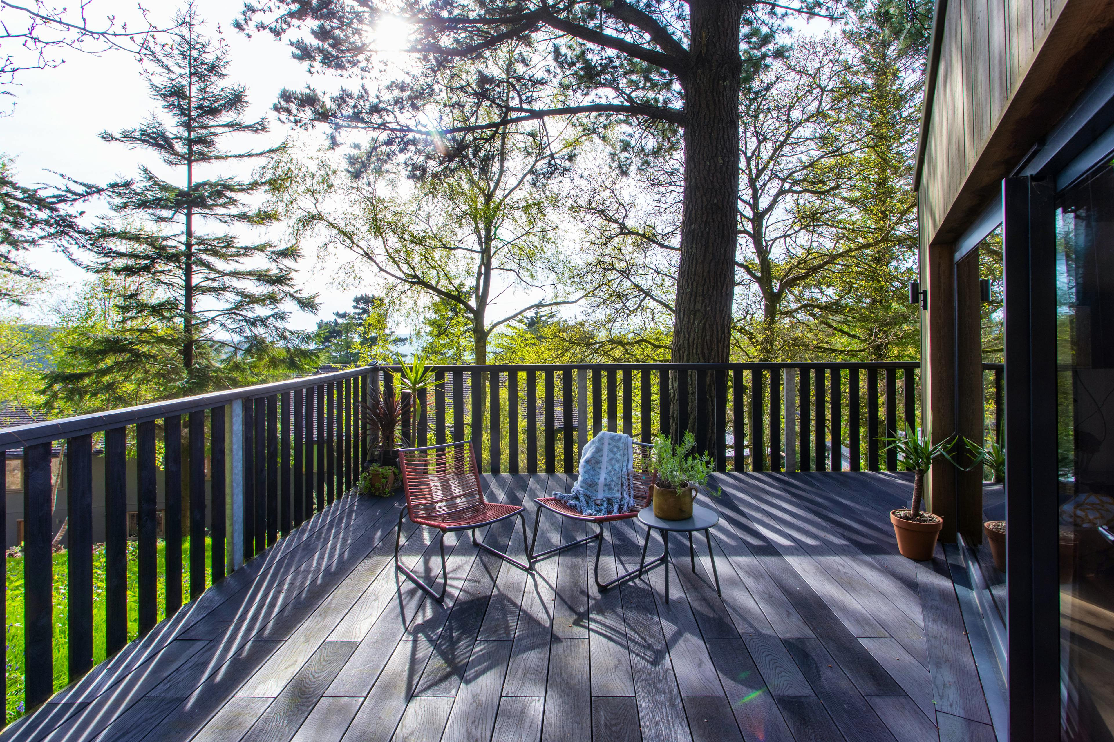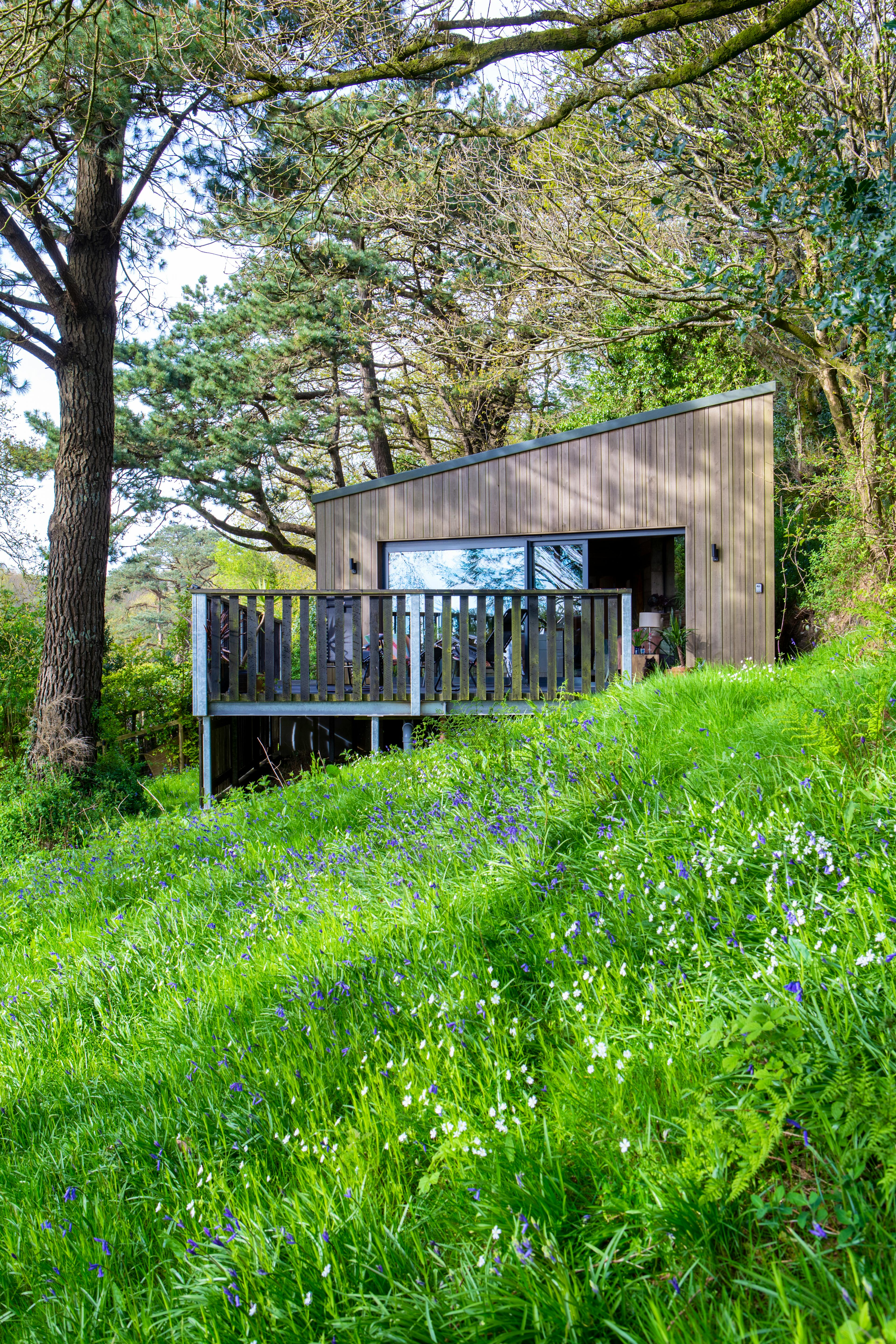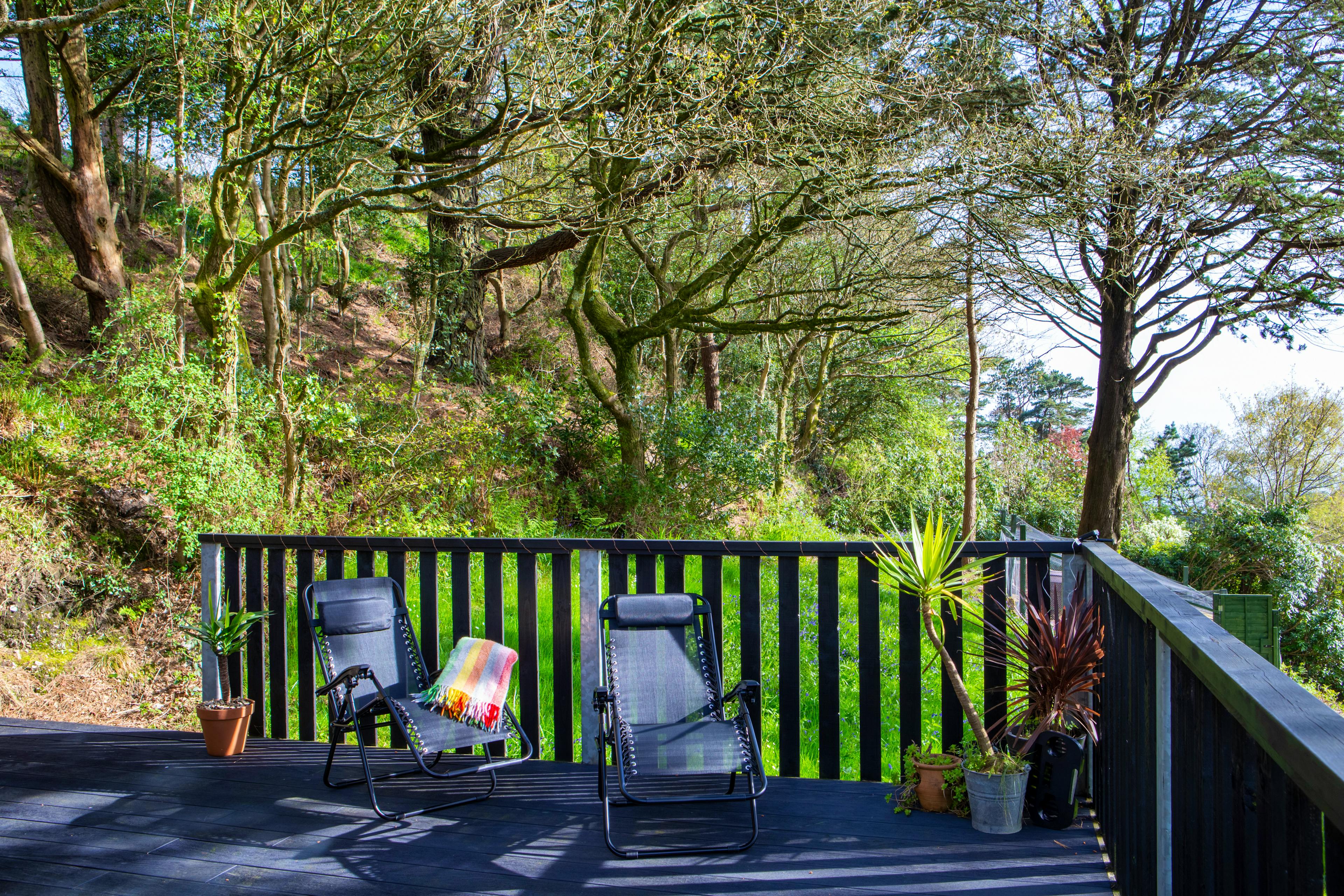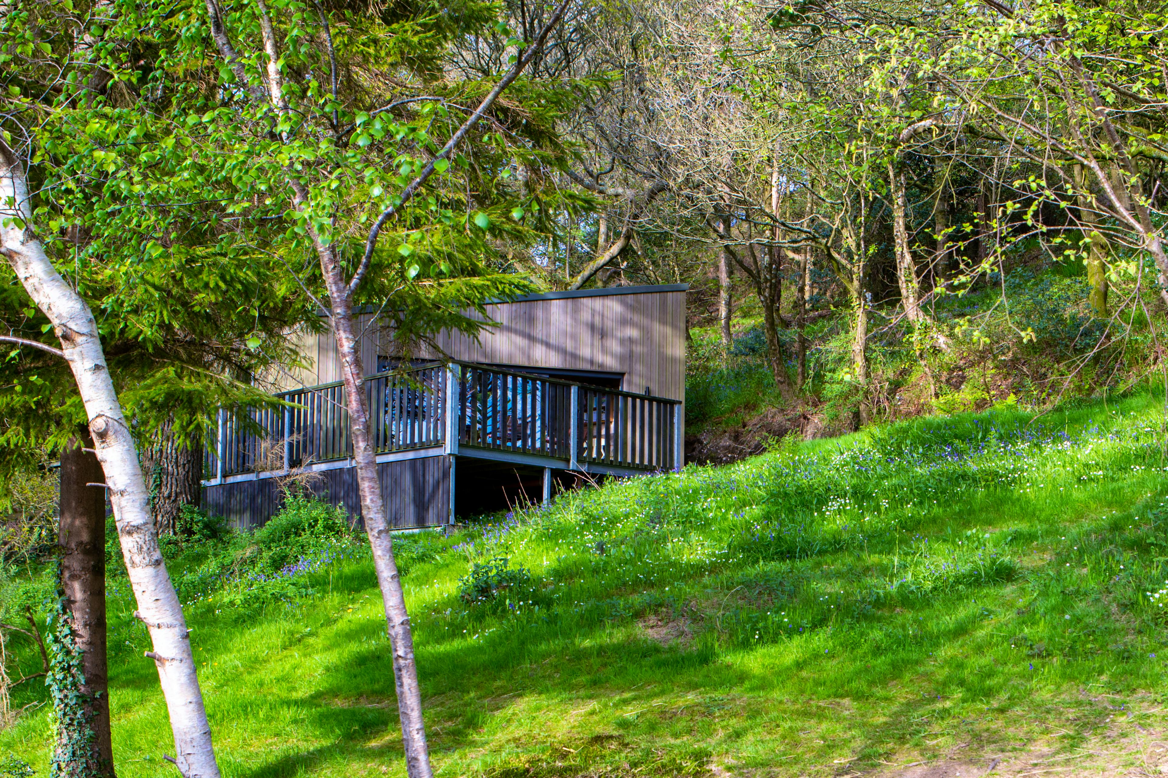 Luxurious timber framed chalet nestled into the hillside close to heathland walks and beaches with cosy interior and open deck in Morcombelake, Dorset.