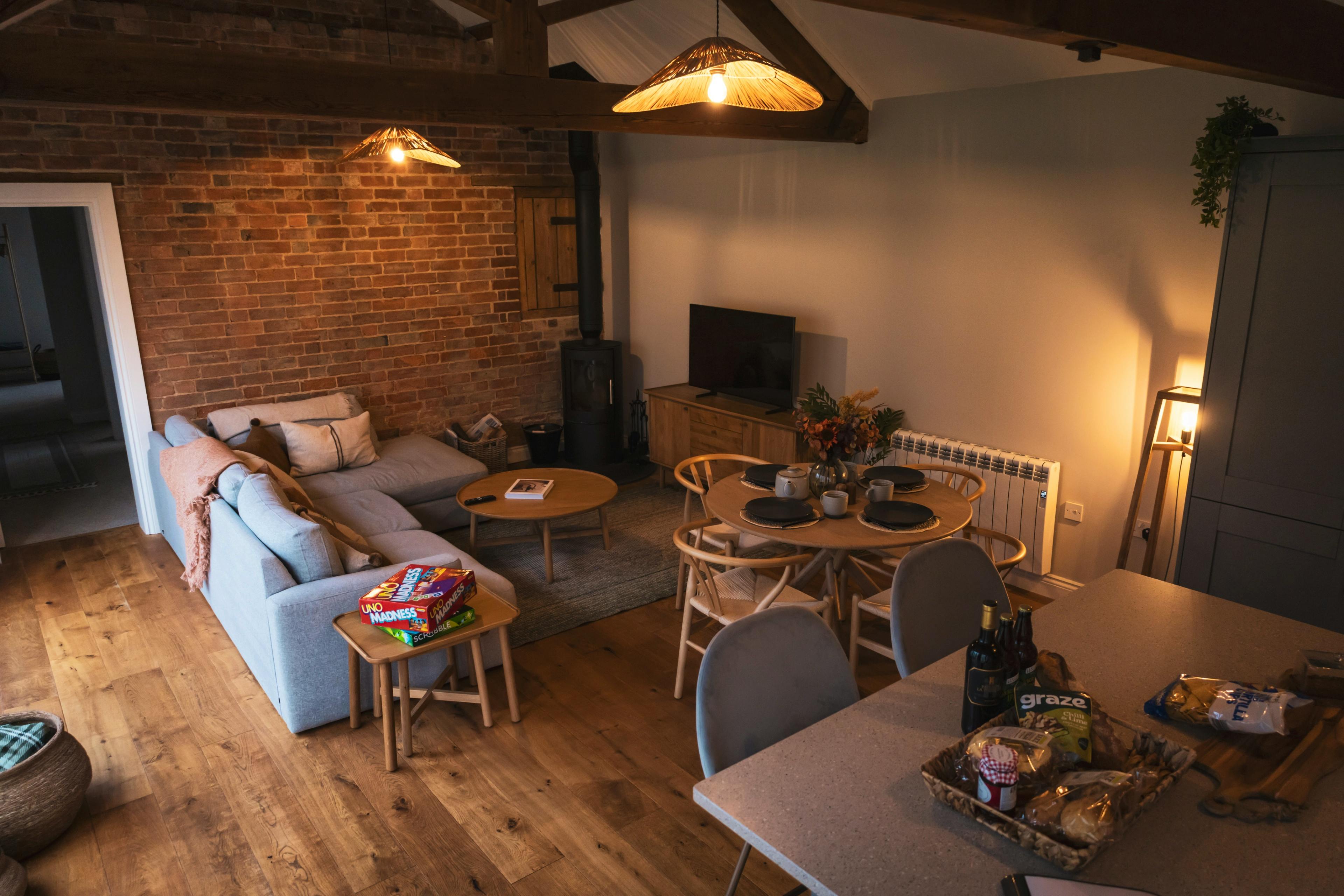 Enjoy relaxed living in a beautifully converted barn with rustic beams, exposed brickwork and a crackling wood burning stove filling evenings with warmth.