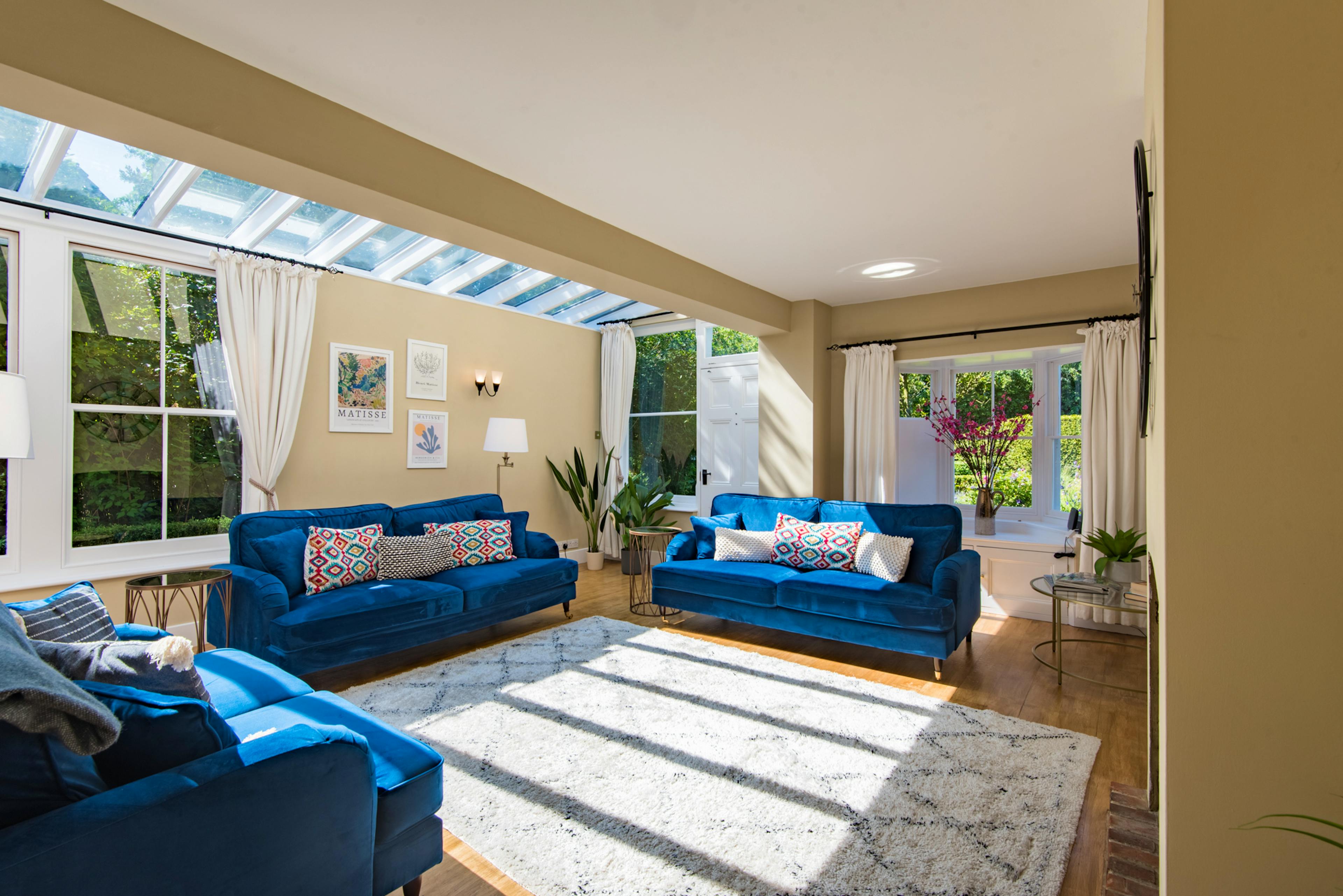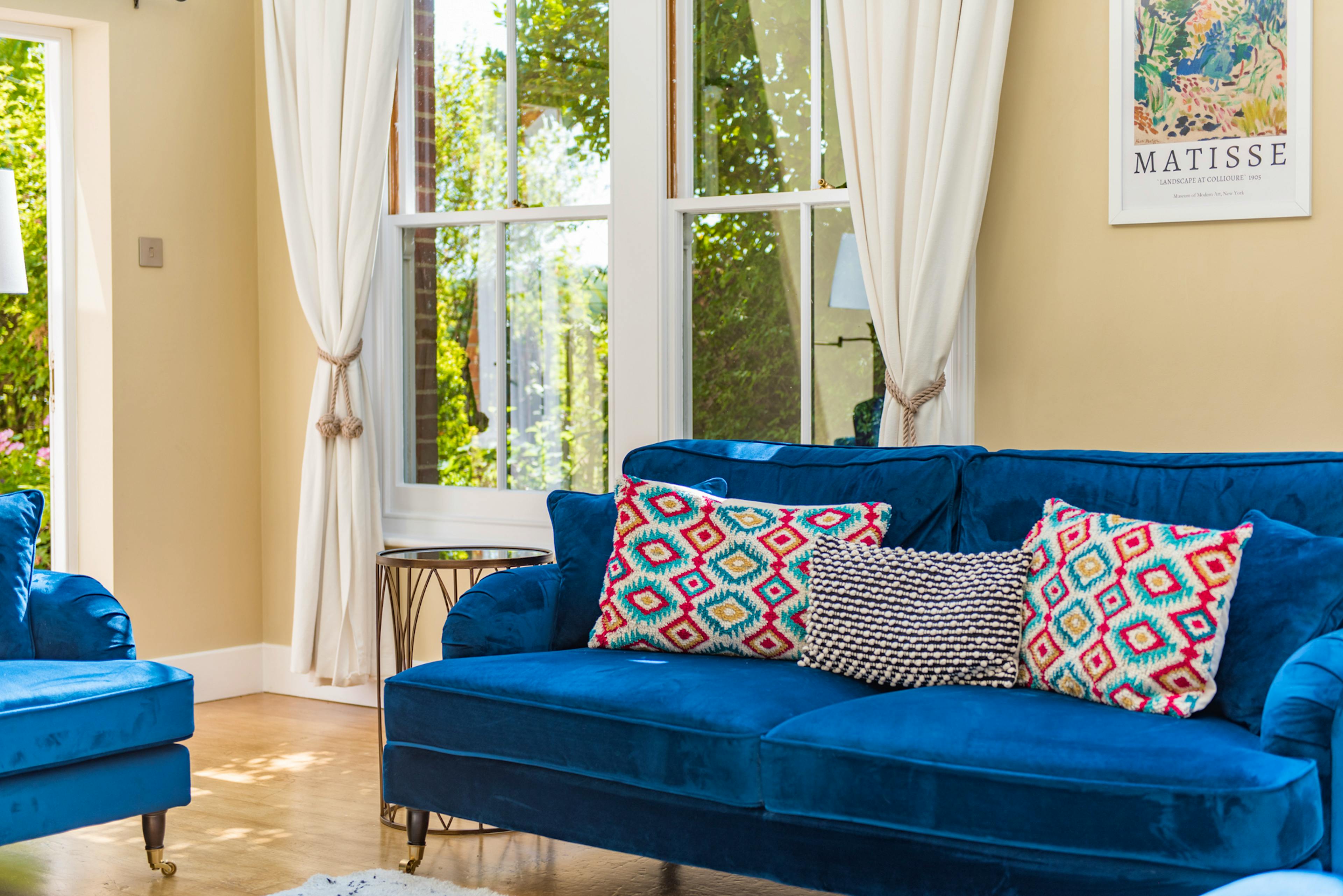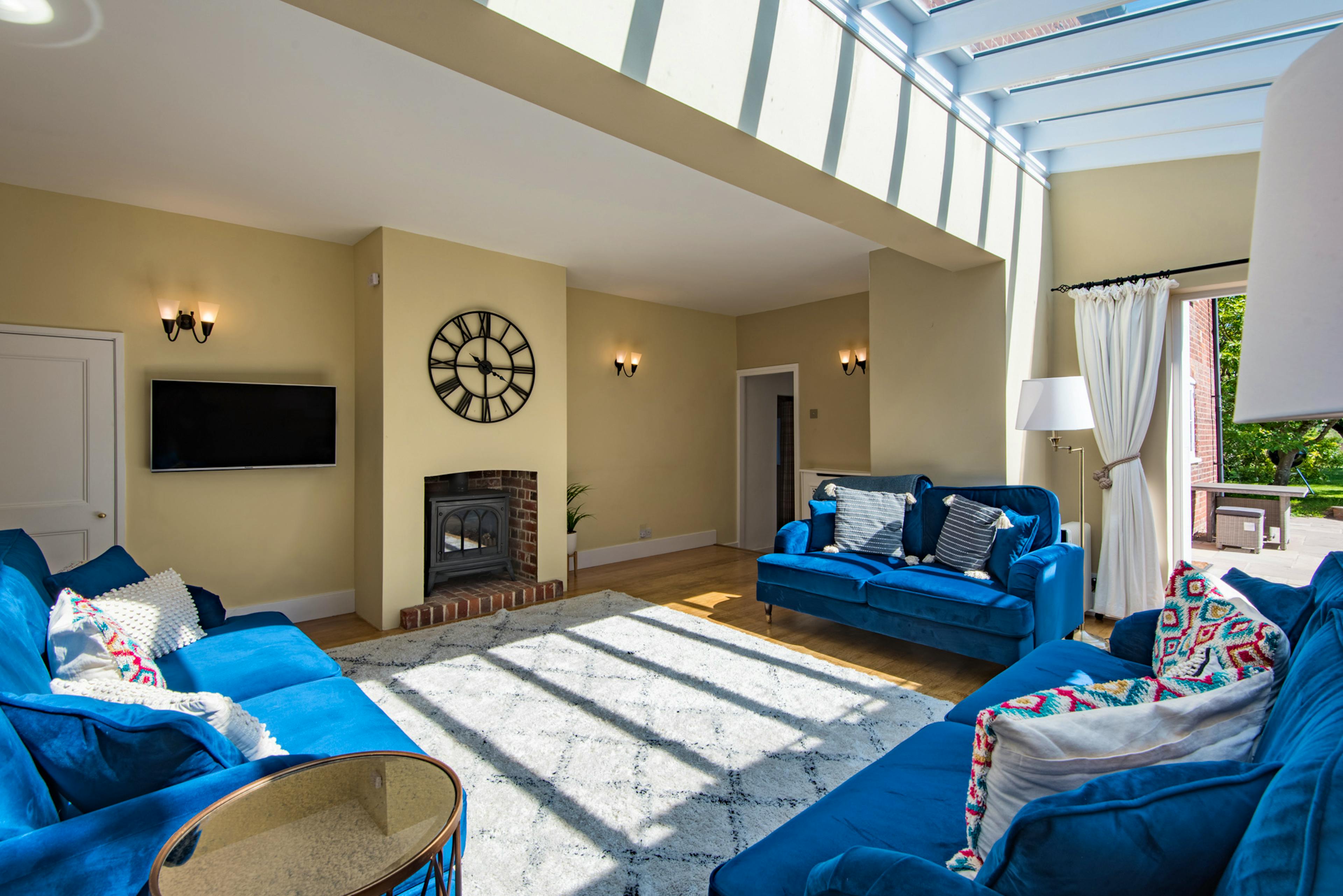 Cosy double-aspect sitting room with a gas effect wood-burning stove and smart TV.