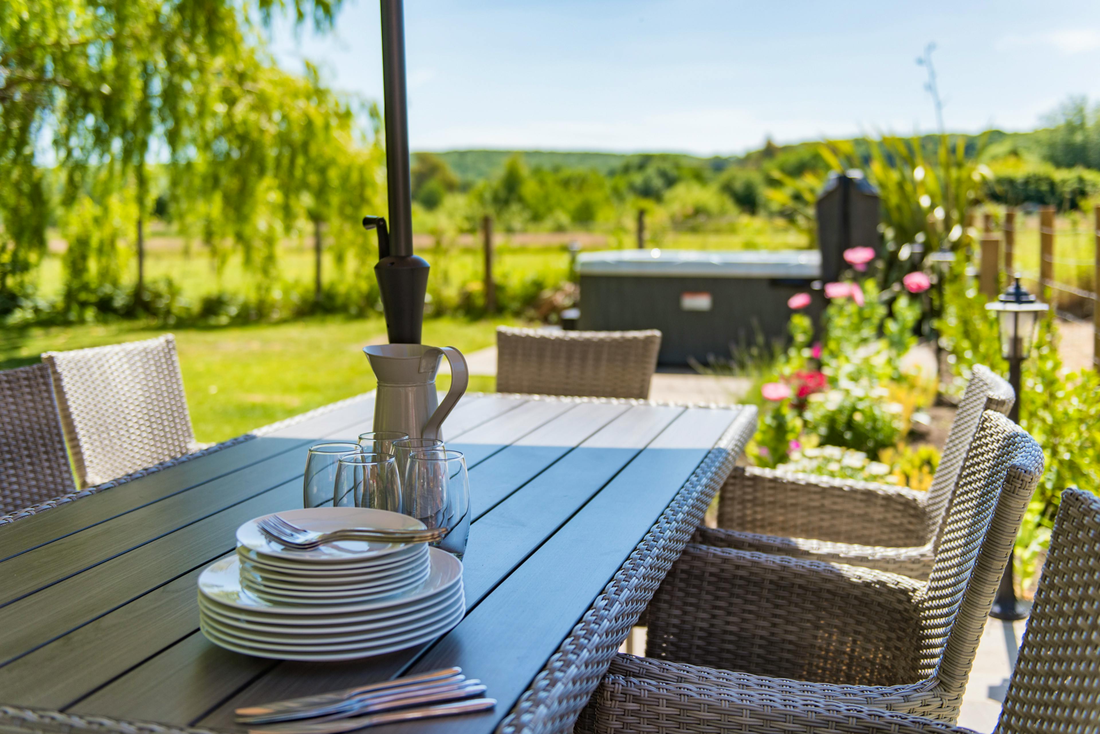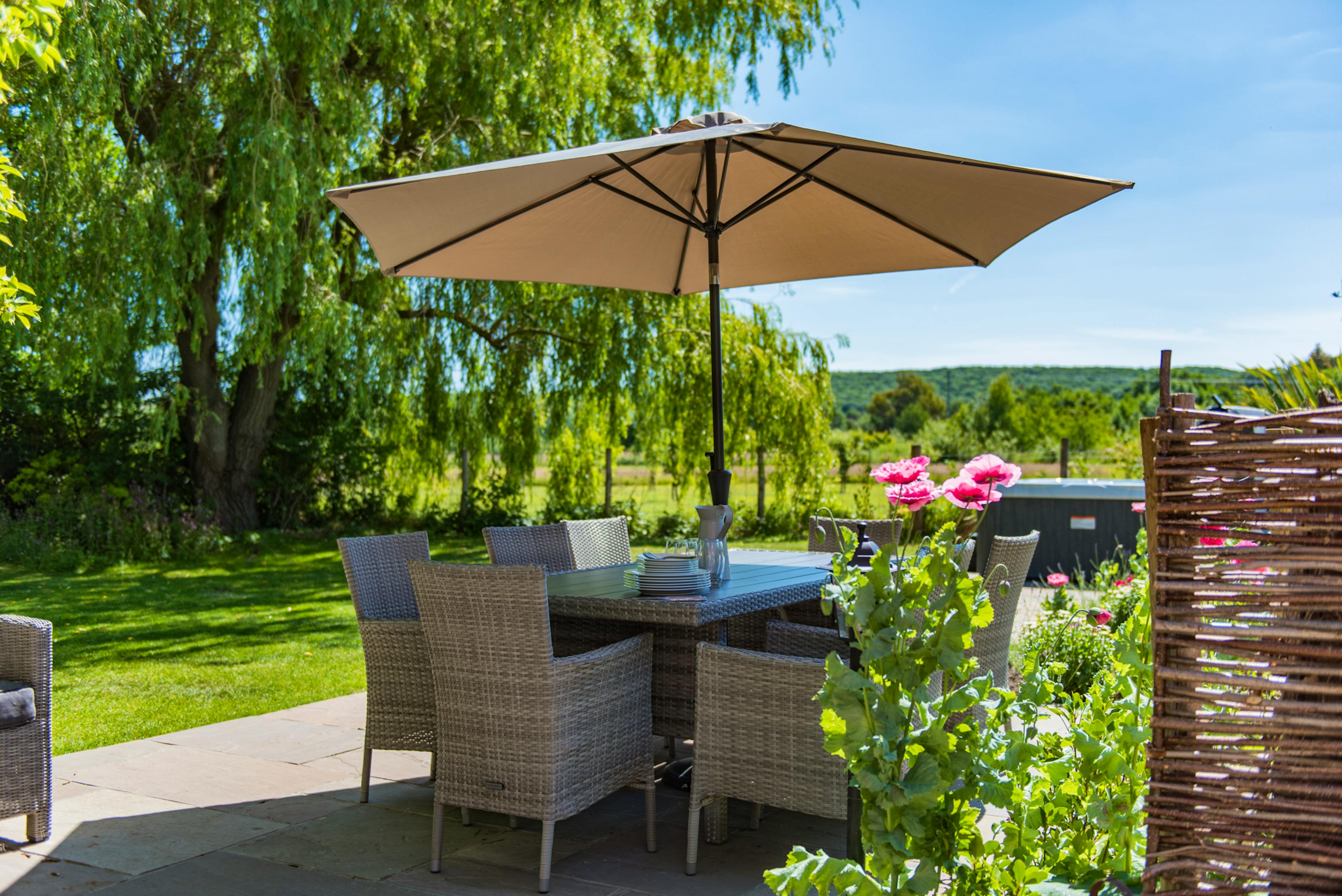 Features a relaxing hot tub and mature gardens with orchard views.