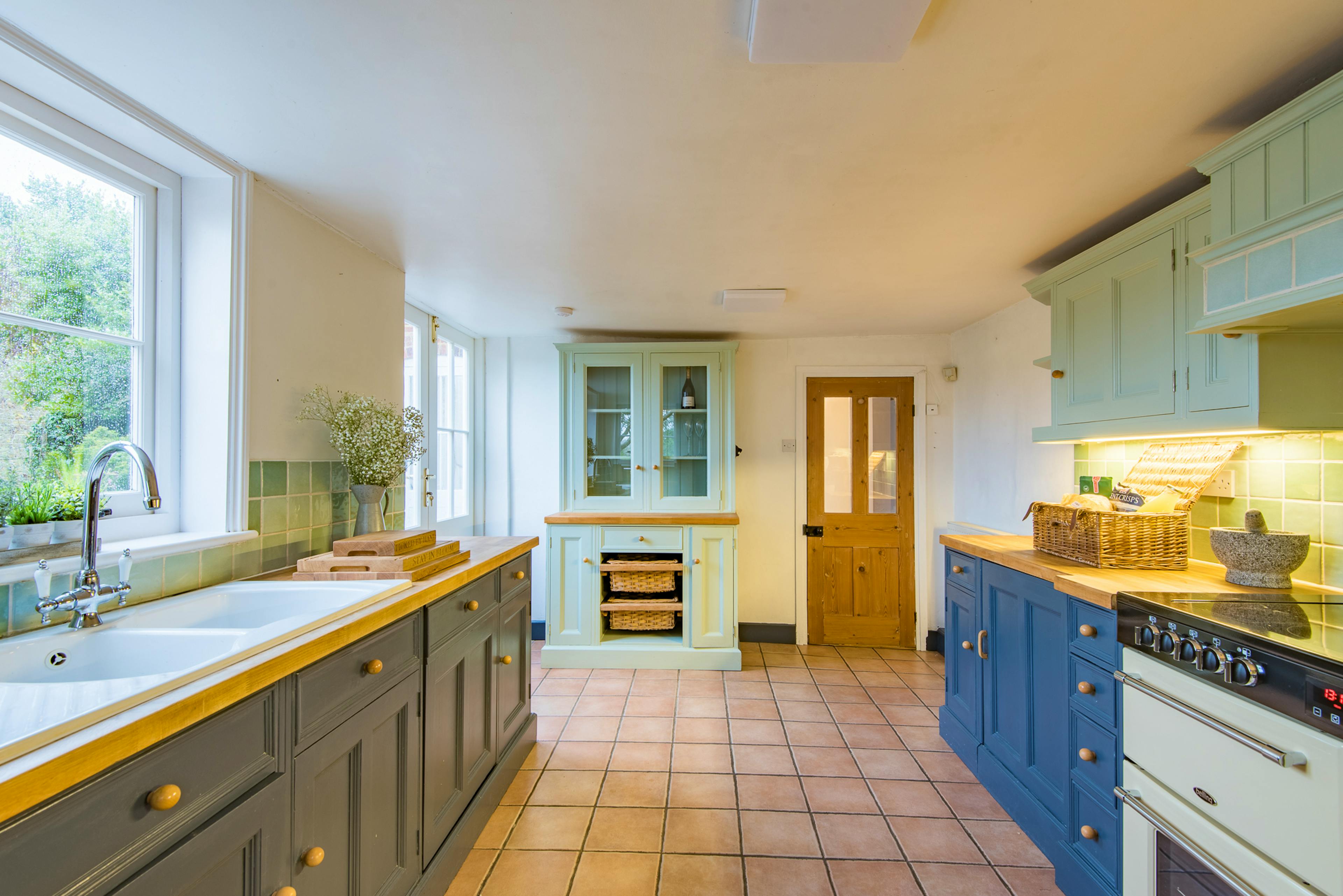 Well-equipped kitchen with farmhouse style, electric range cooker and modern appliances.