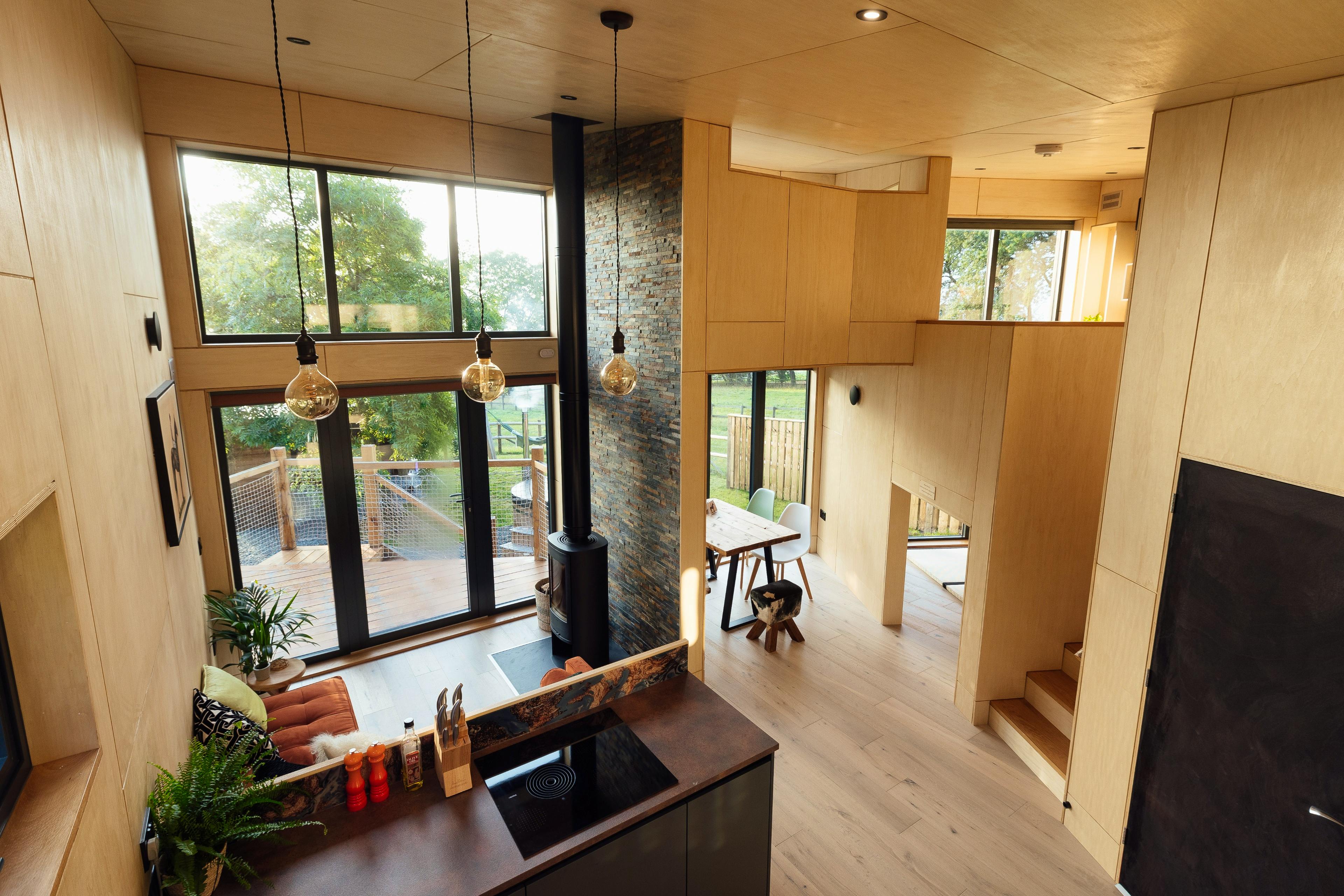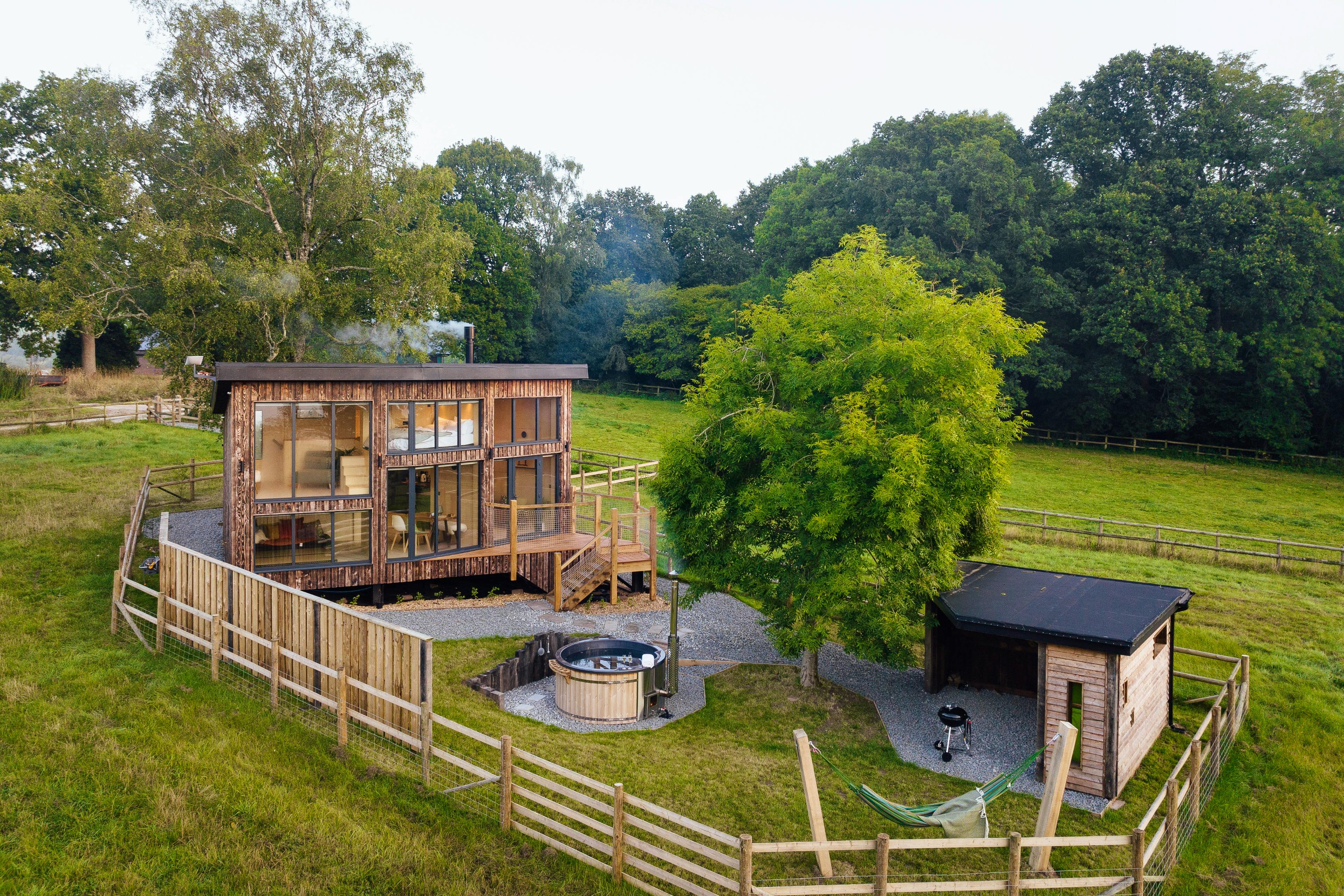 Stunning Scandi treetop cabins in rural Herefordshire with wood-fired hot tubs, cinematic dens and epic hill views.