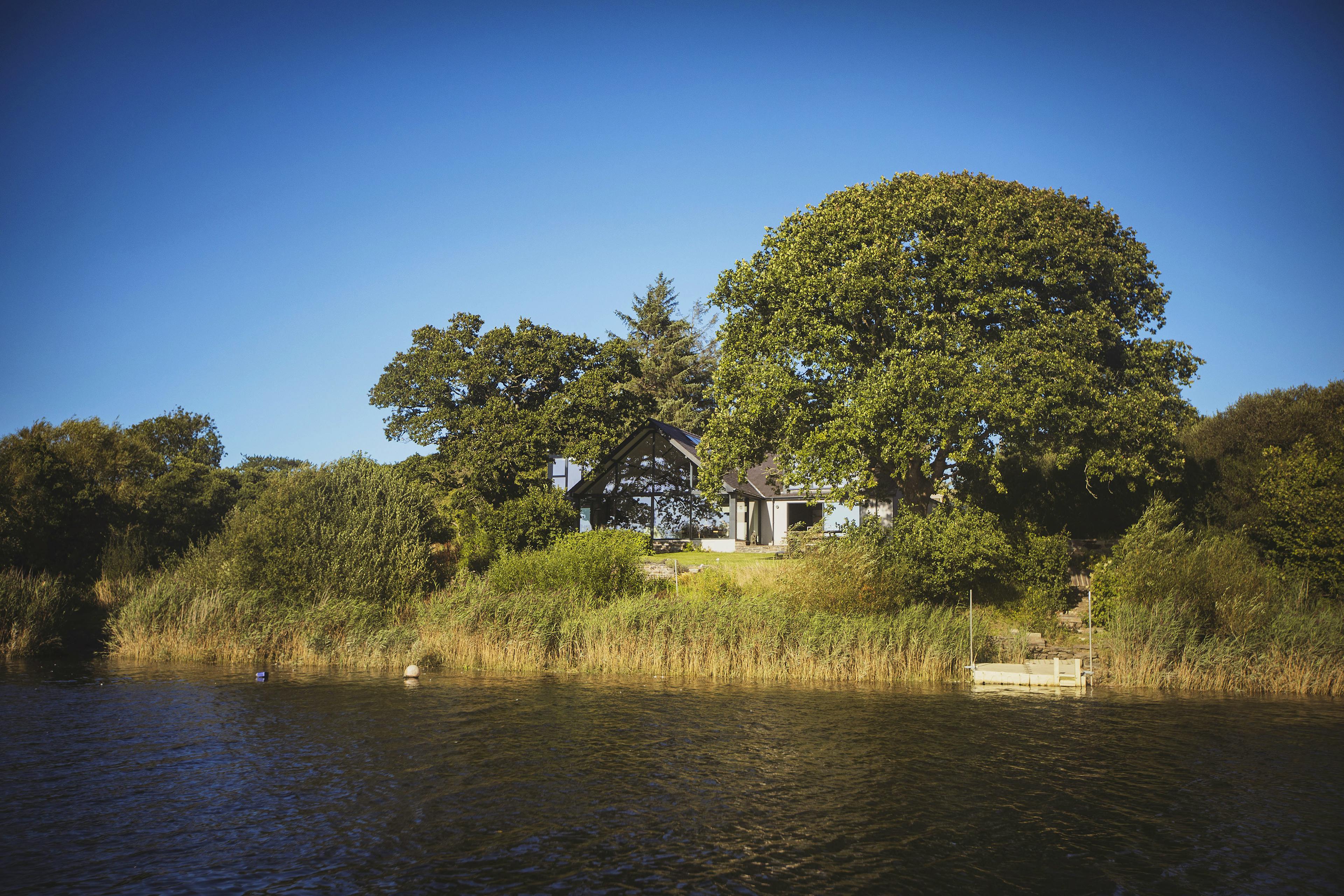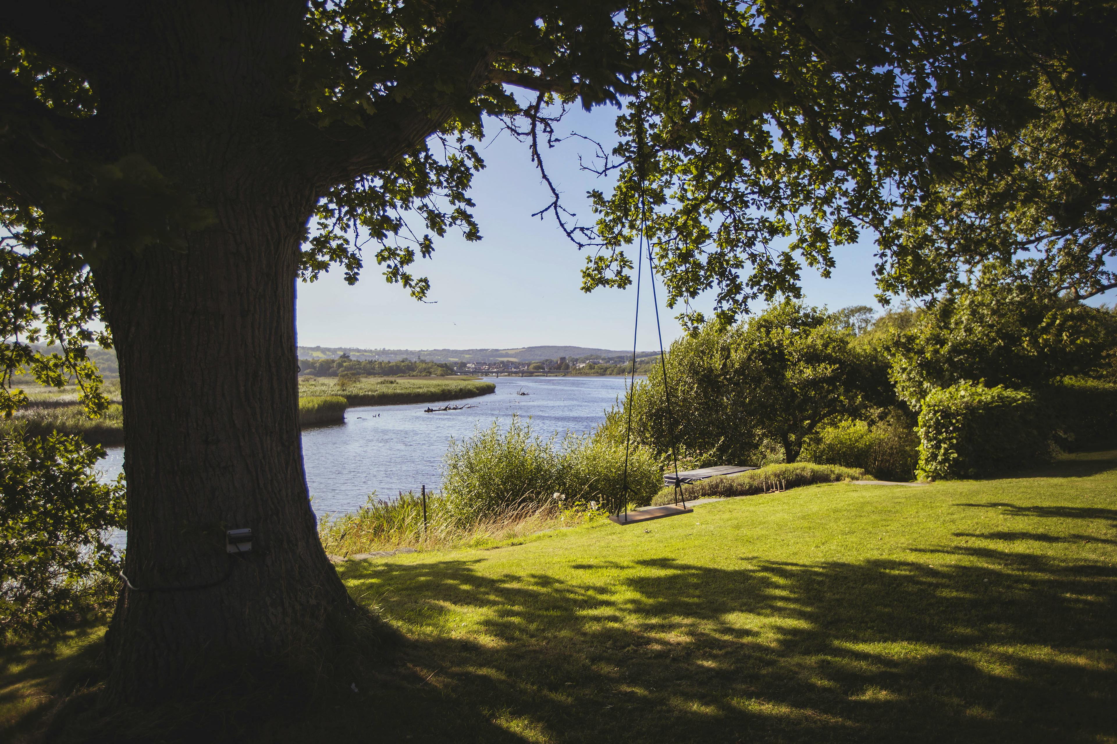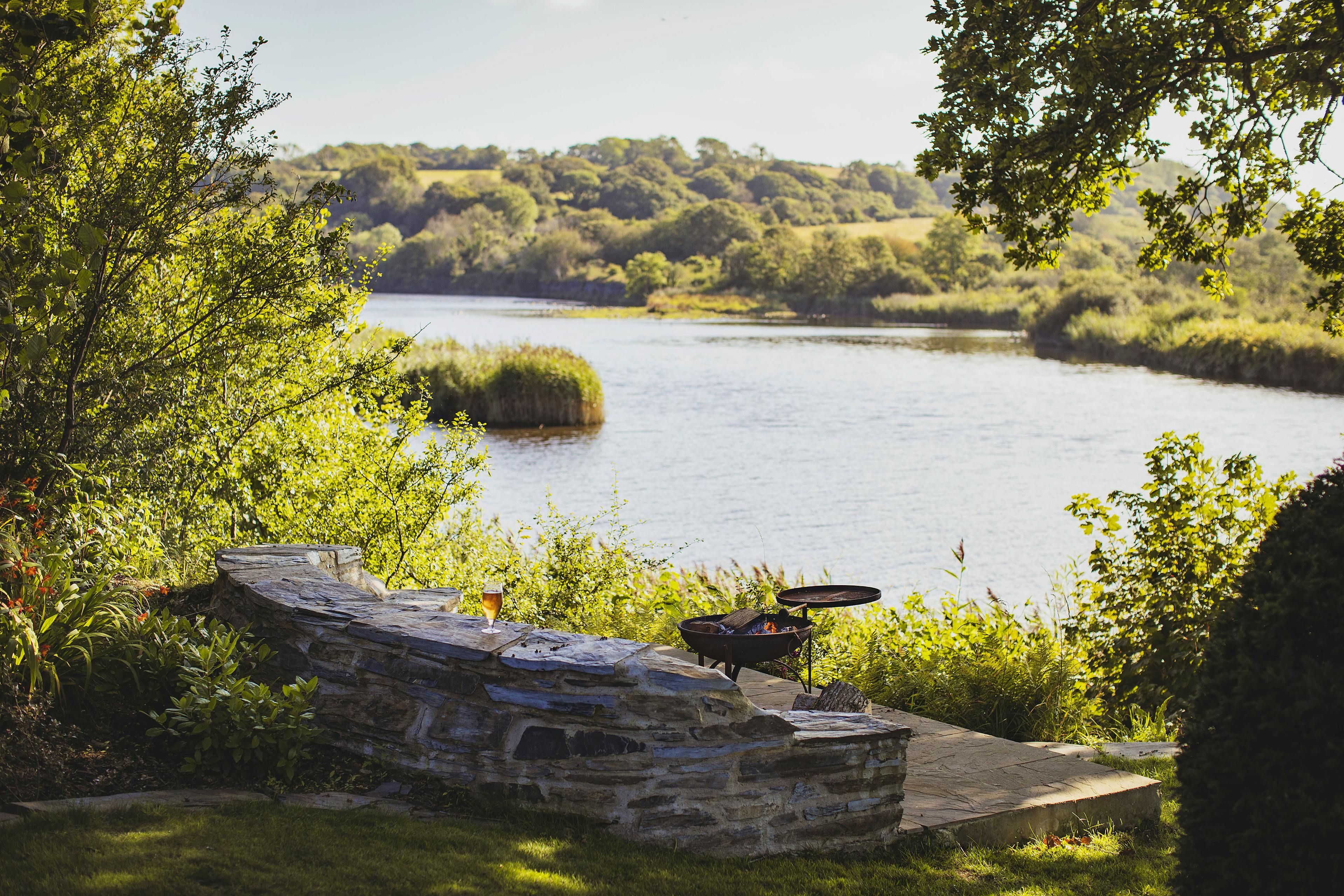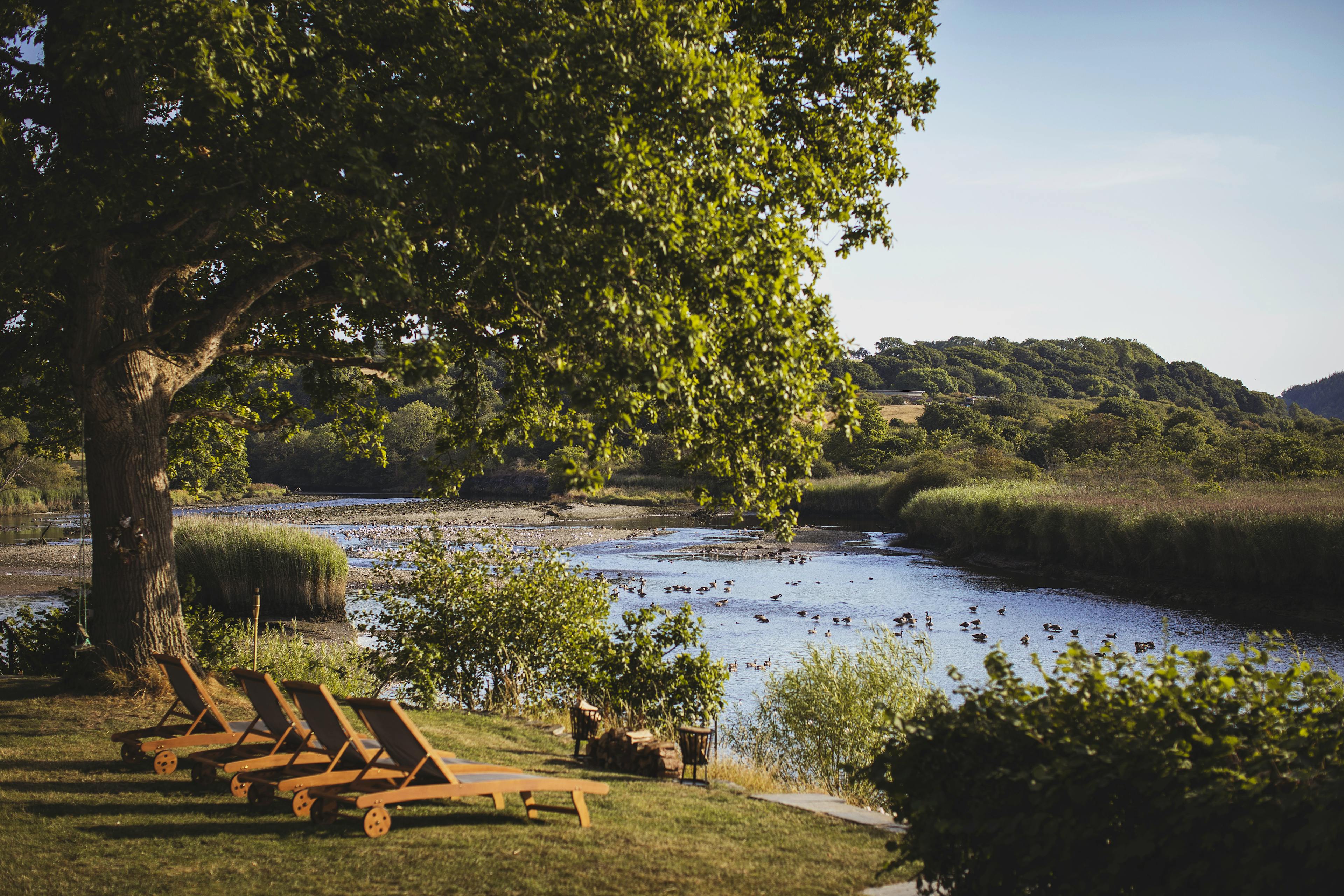 Stunning retreat on the River Teifi offering deluxe furnishings, grand social spaces, a wood-fired sauna and a hot tub overlooking the water.