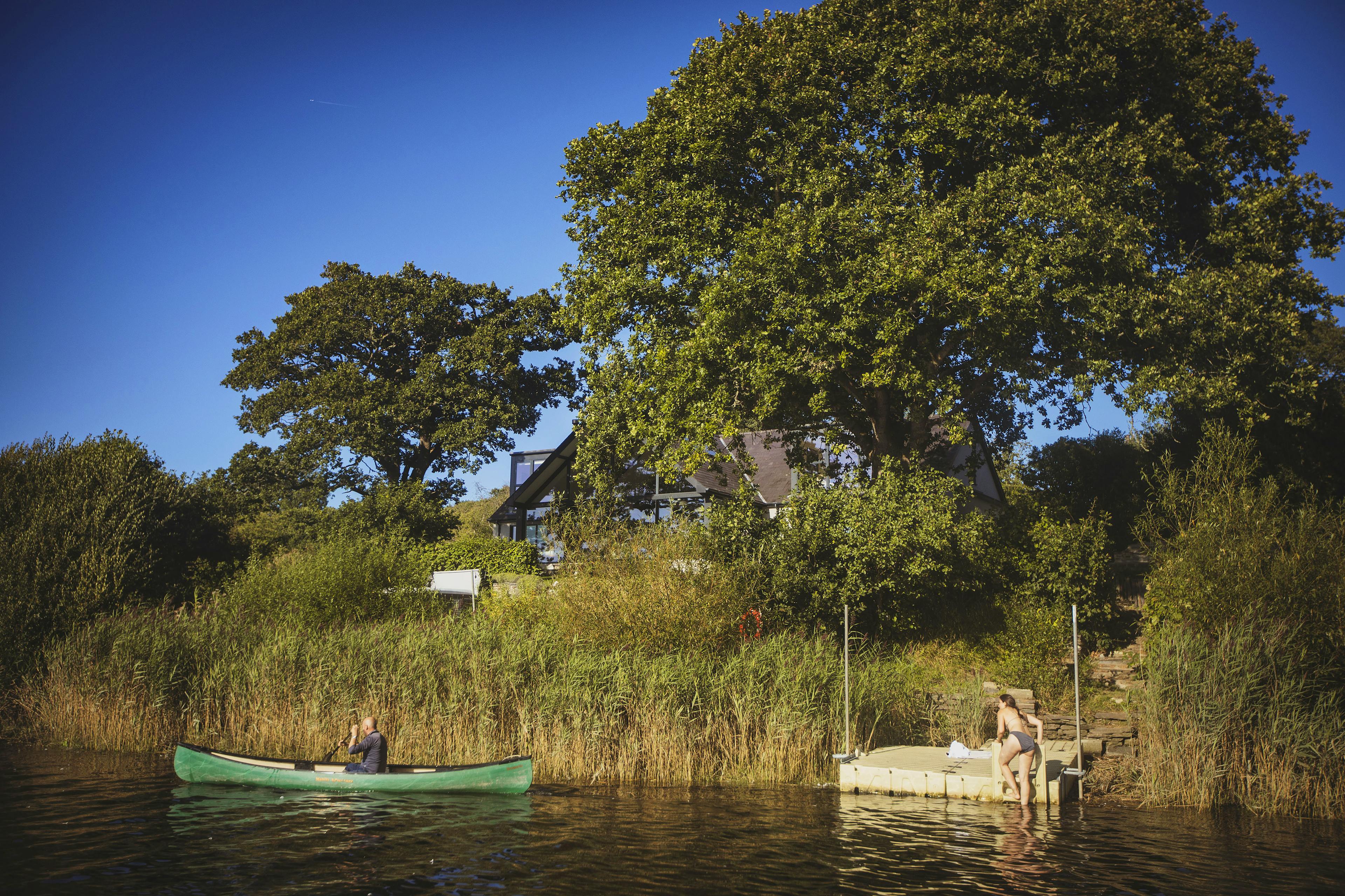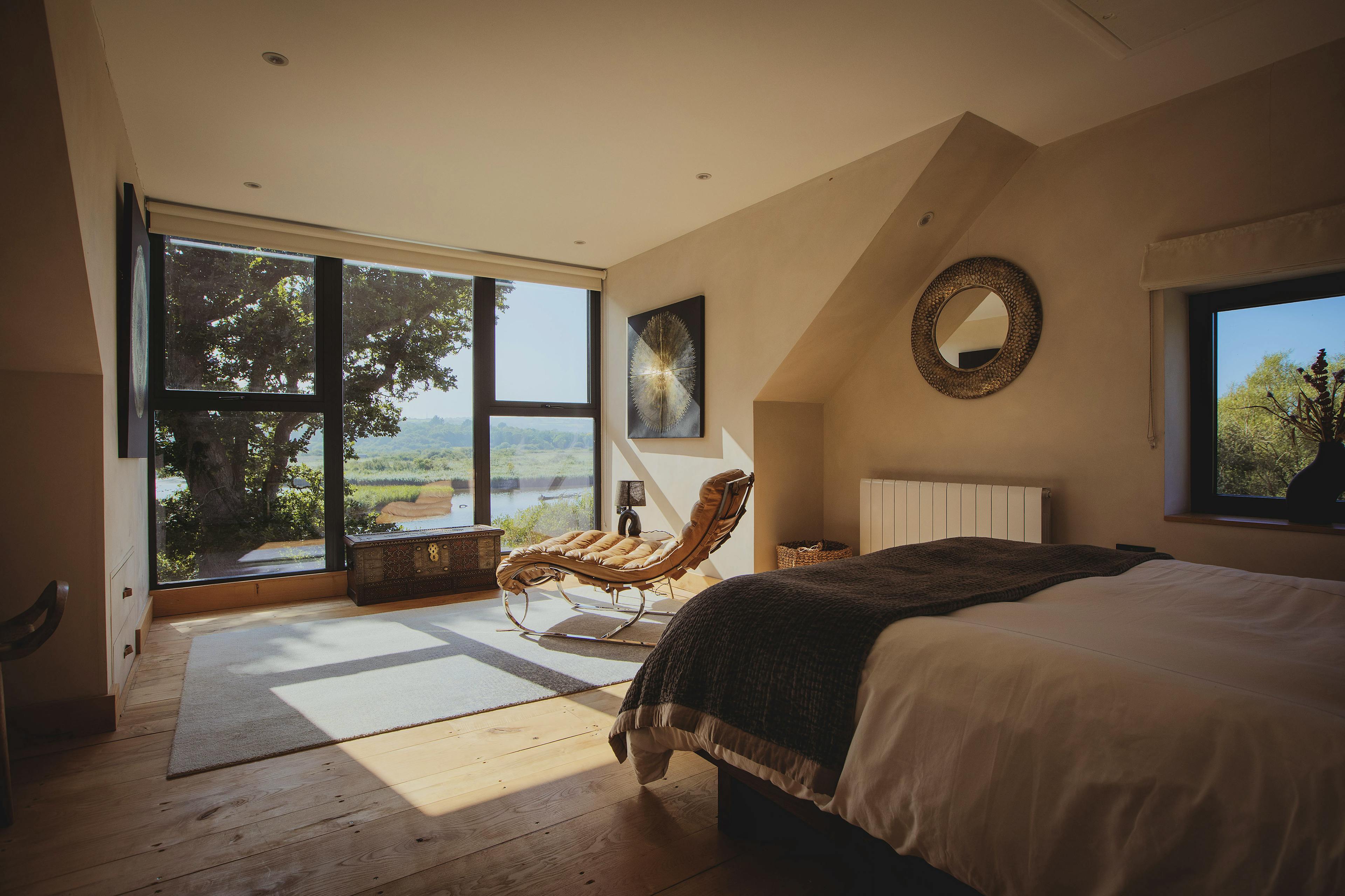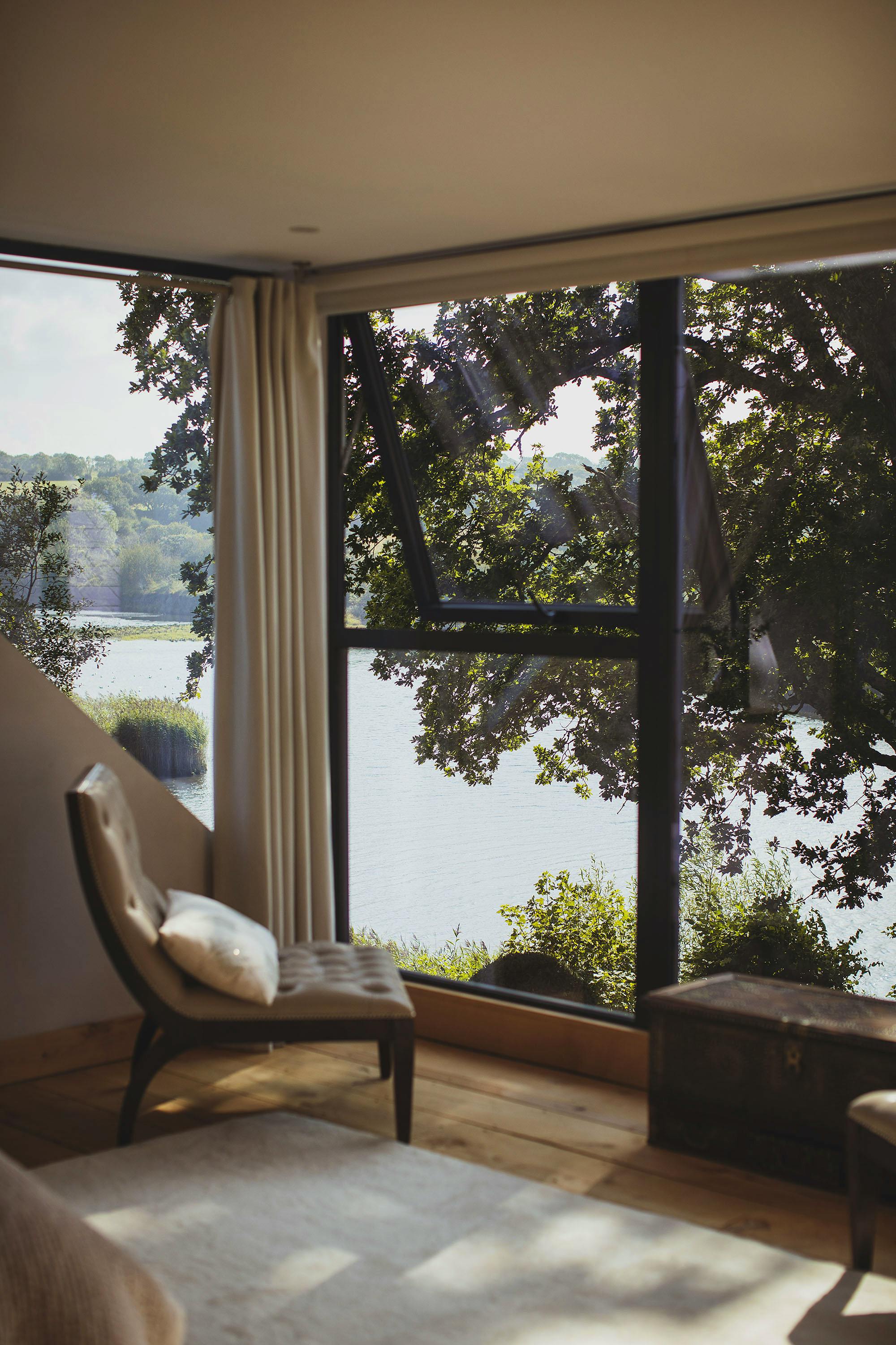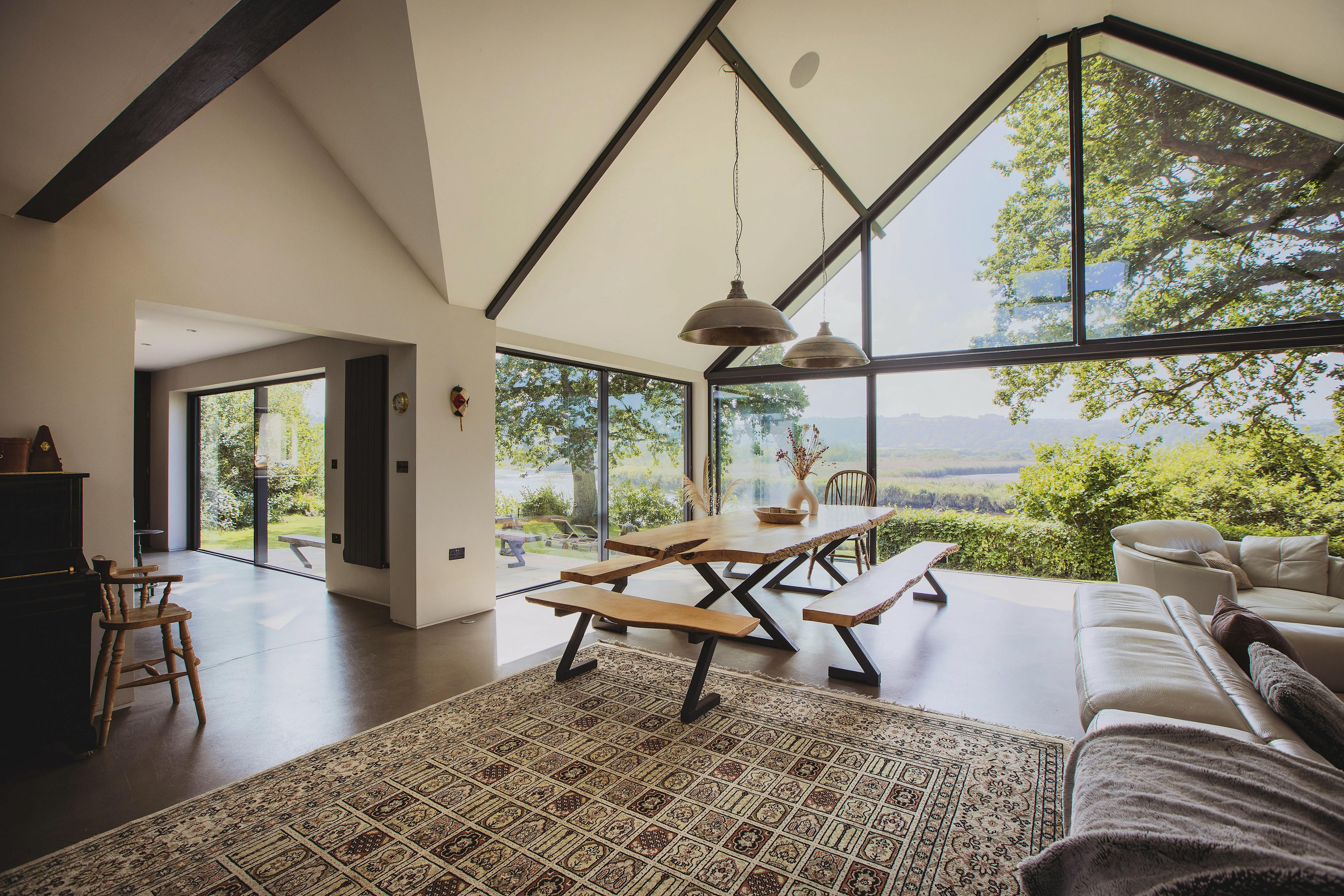 Stunning retreat on the River Teifi offering deluxe furnishings, grand social spaces, a wood-fired sauna and a hot tub overlooking the water.