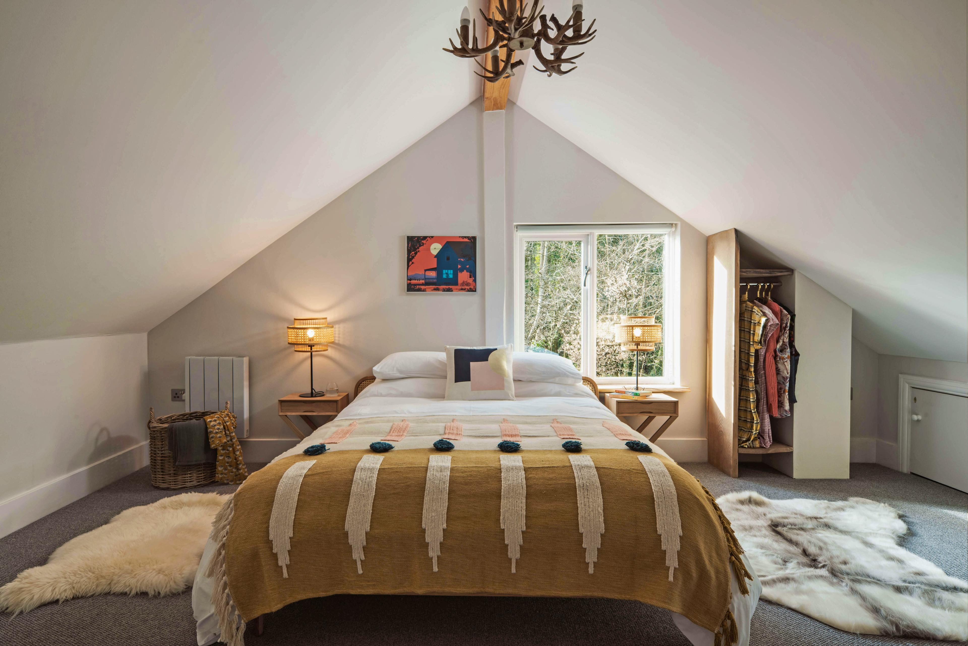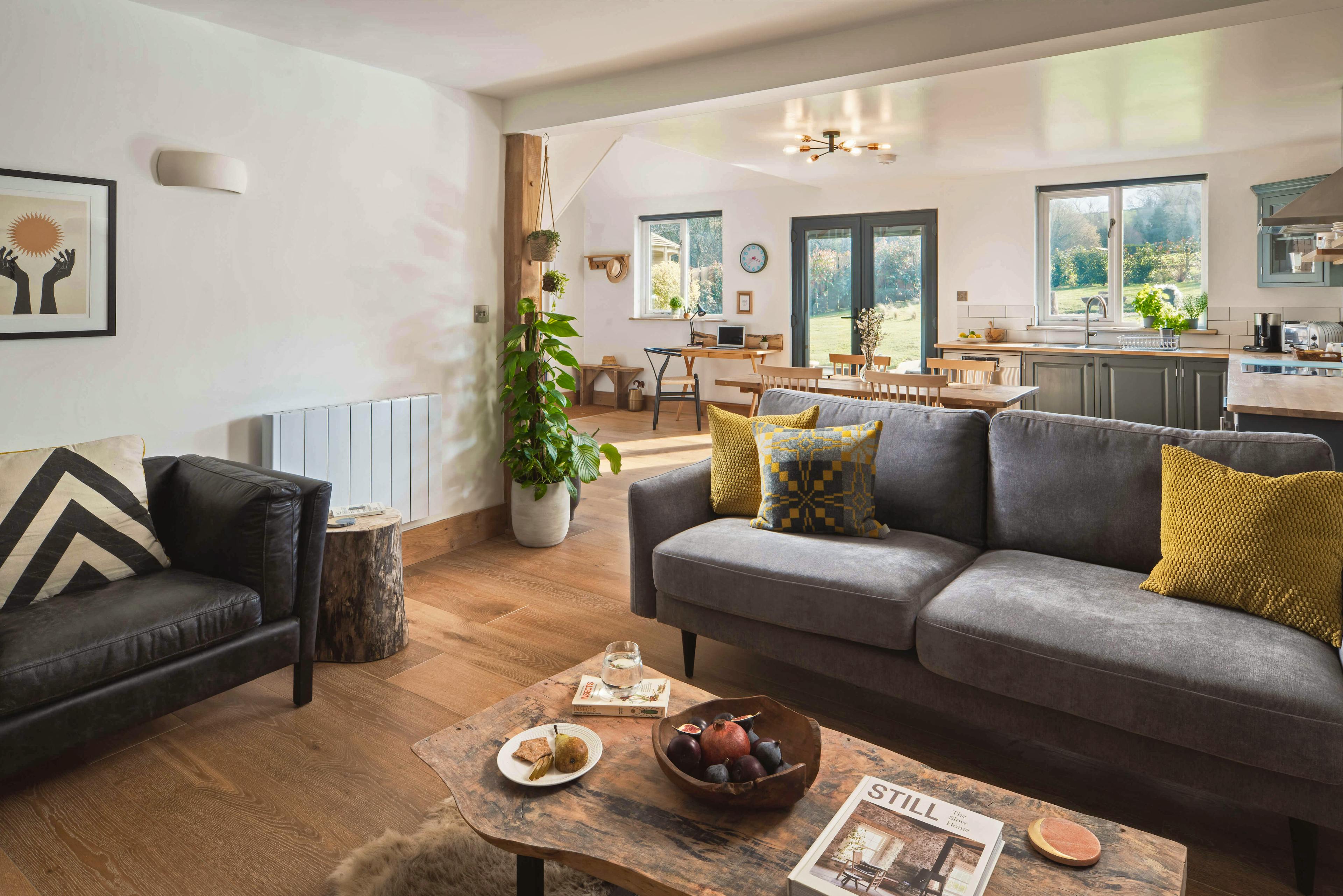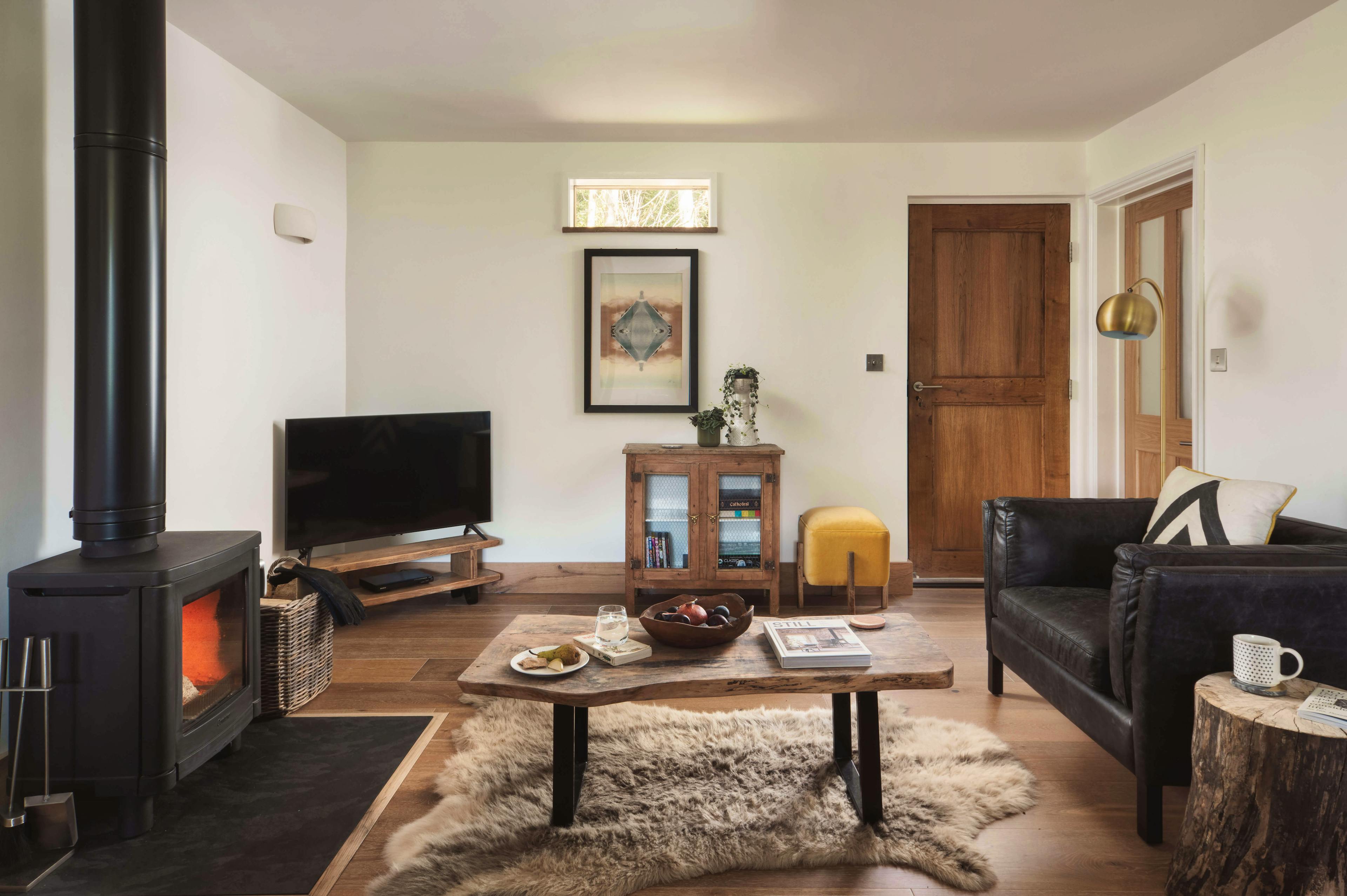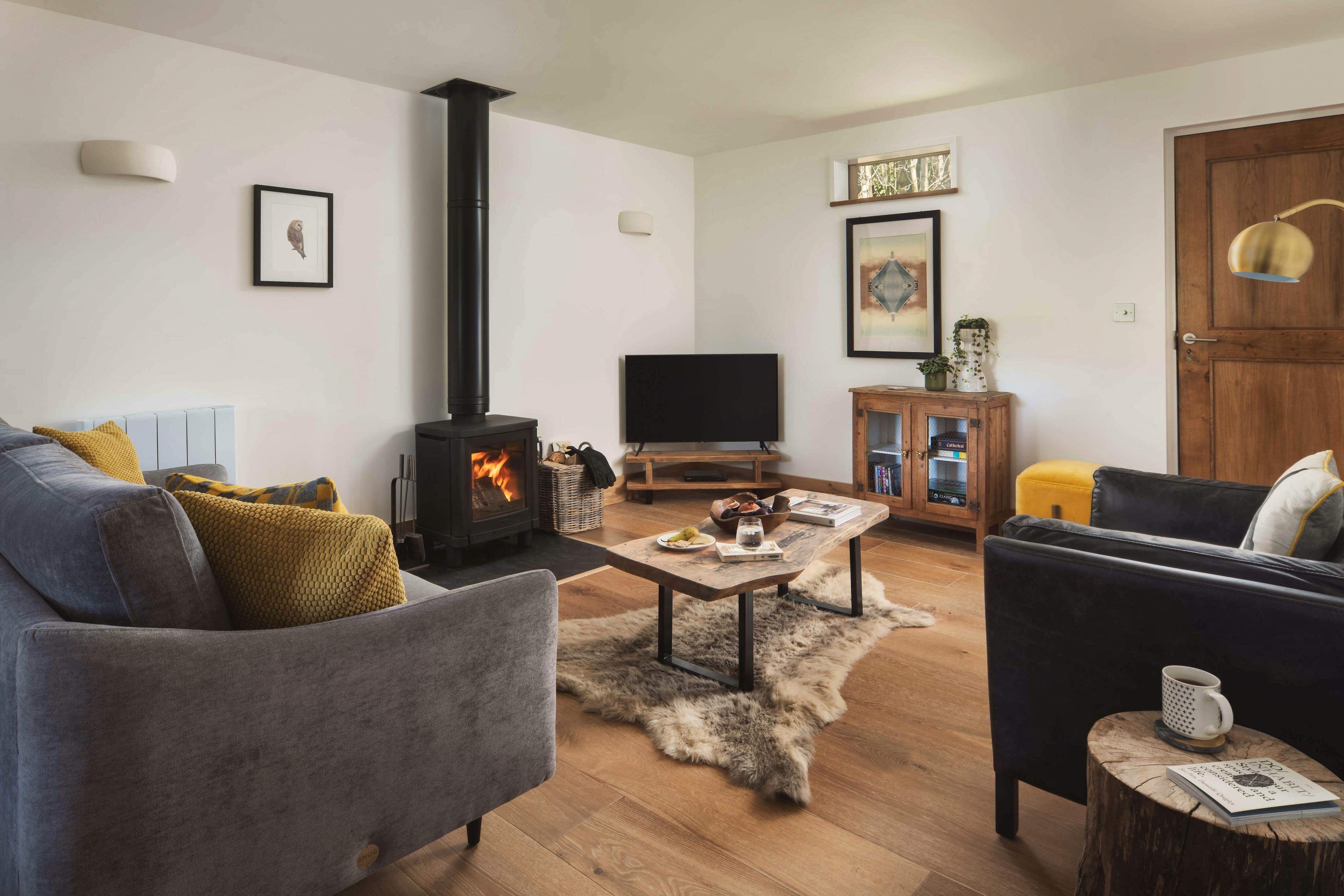 Spend magical evenings relaxing in the hot tub underneath the sparkling skies of this pretty Somerset idyll. Stare out at the beautiful garden and enjoy uninterrupted views of the fields beyond while the birds serenade you with their night song. For those looking to relax, unwind and reconnect with the natural world, then this is the perfect spot. Owl Cabin is a beautifully styled property sitting amongst woodland on an organic farm. The exterior is very much contemporary cabin style, with timber cladding, aluminium frames and an abundance of glass to maximise the experience of living amongst nature. The interior is no less impressive, a vaulted ceiling creates a spacious feel and allows natural light to pour in. The kitchen is country-style with pretty blue cupboards and all the modern conveniences guests might need to put together meals. You will love enjoying lengthy breakfasts at the large wooden kitchen table which sits in the centre of this spacious area, enjoying the tranquility and wonderful views through patio doors which lead out to the garden Should inspiration hit, there is a handy workspace where guests can enjoy the natural world outside while writing a journal or a poem or maybe simply checking the emails. A stylish sitting room awaits guests after long days exploring the area, leave the boots at the door, grab a glass of wine from the kitchen, put up your feet and stretch out in front of the cosy wood burning fire or binge watch a box set on the flat screen television. Come bedtime and a lovely exposed staircase curves around the kitchen and takes guests onto a large mezzanine level. There you find a kingsize bed dressed with white linens and a woollen blanket, whilst sheepskin rugs which cover the floor to keep feet cosy. A modern take on the traditional antler-style chandelier is a lovely quirky touch which adds character to this beautiful cabin. There is a handy toilet en-suite and larger family bathroom can be found on the ground floor, with a large rainfall shower and freestanding bath tub. Visitors may be excused for never leaving the comfort of the cabin but those wishing to explore will find a lovely gastro-pub, The Lord Poulett Arms, just a 15 minute stroll from the cabin. Or pack a picnic and head to the Jurassic Coast for some fossil hunting and sea swimming. You're also close to the East Devon Area of Outstanding Natural Beauty and the Blackdown Hills Area of Outstanding Natural Beauty, so be sure to bring your walking boots!