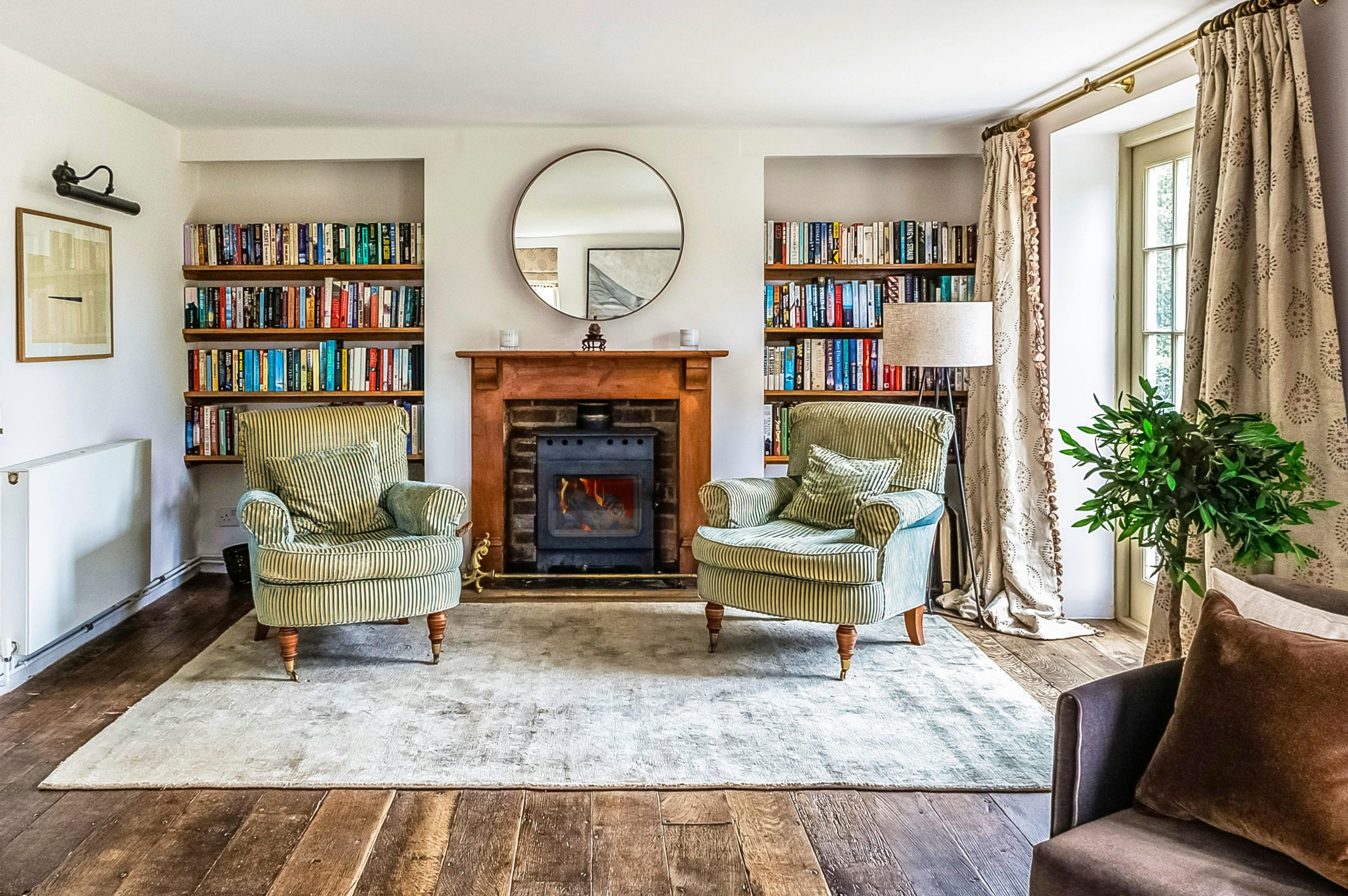 A cosy living room with woodburning stove and shelves of books, ideal for switching off after days spent outdoors.