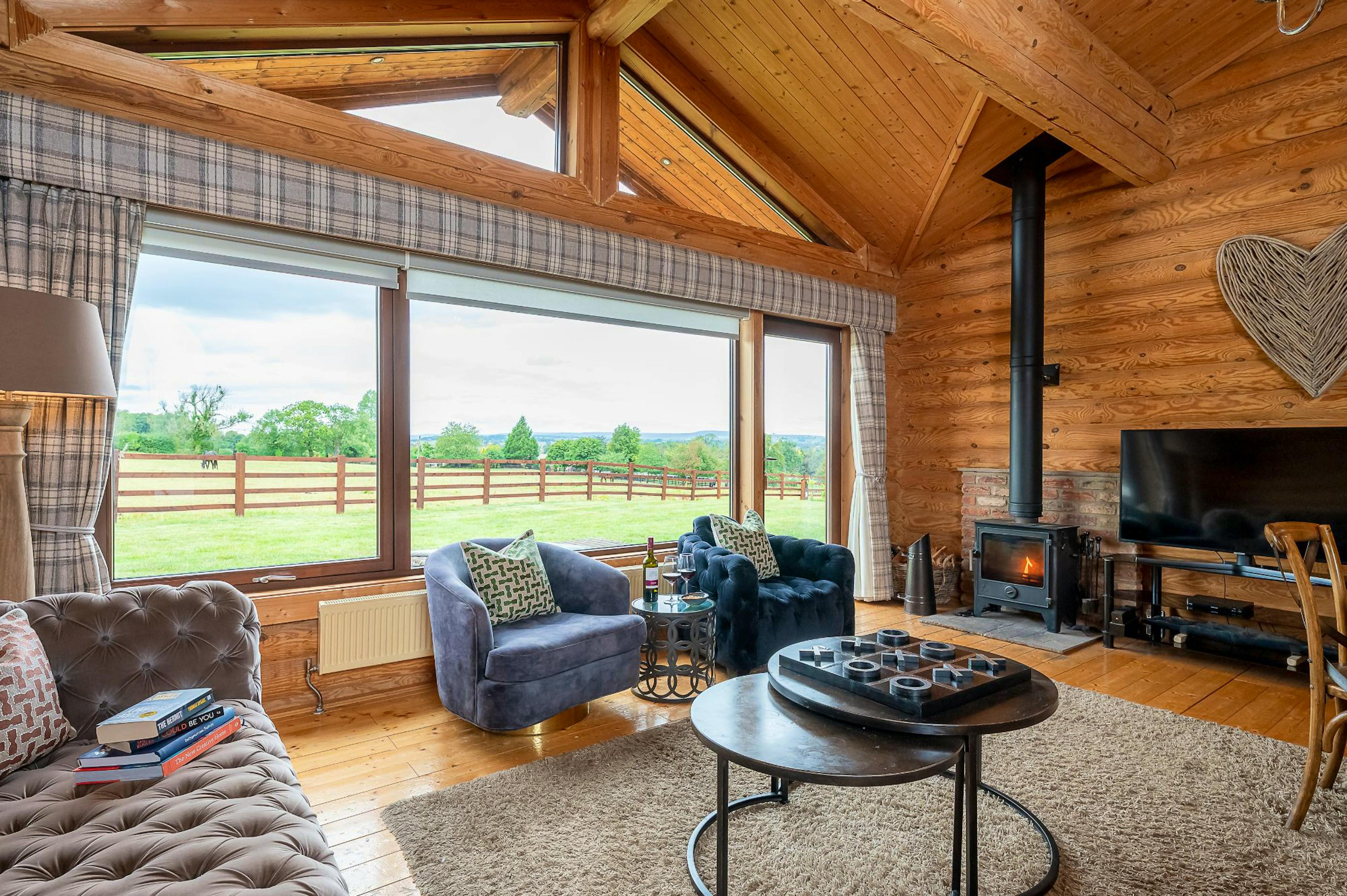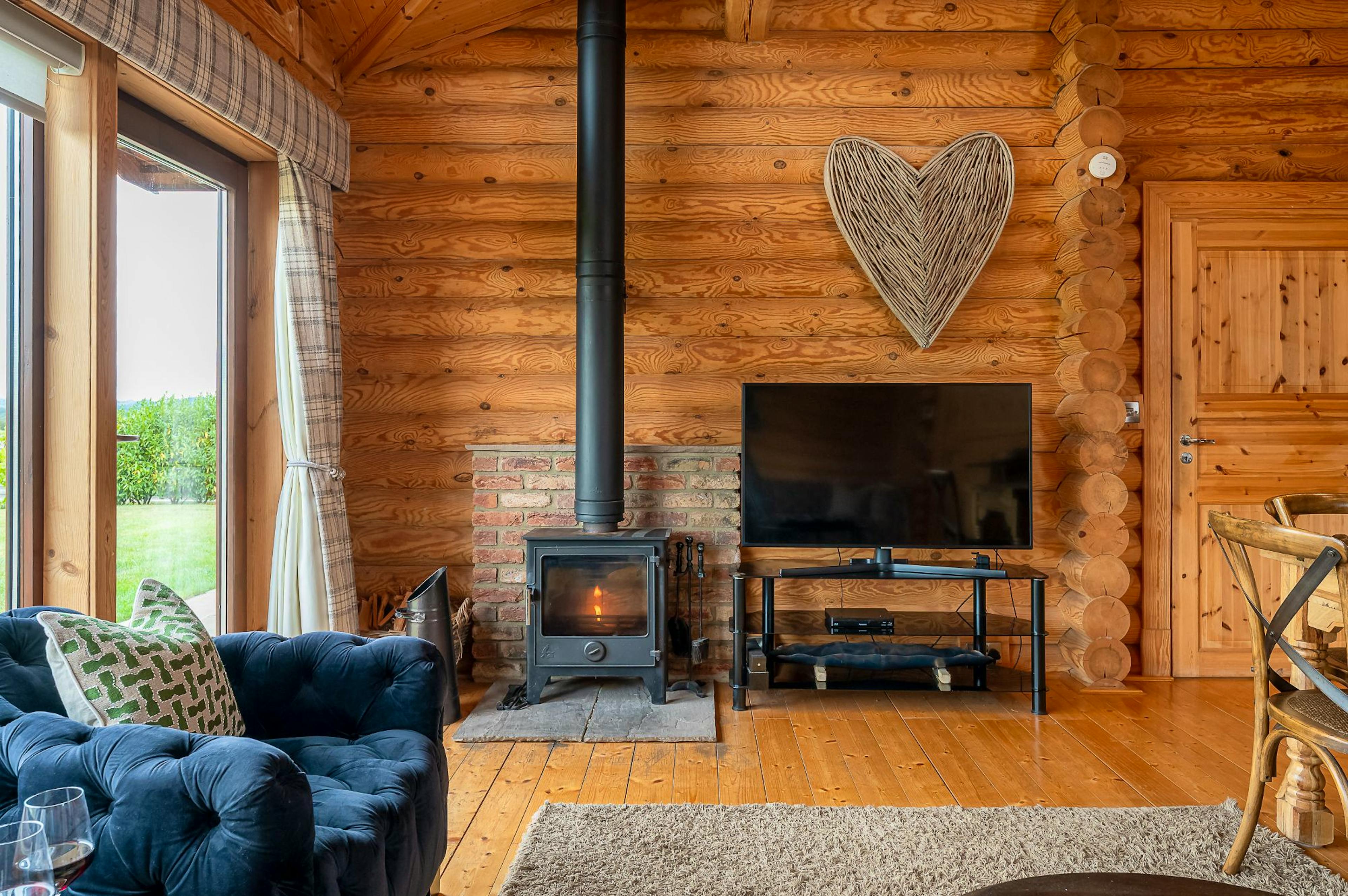Open-plan living space with woodburning stove, comfy sofas, Smart TV and large picture windows.