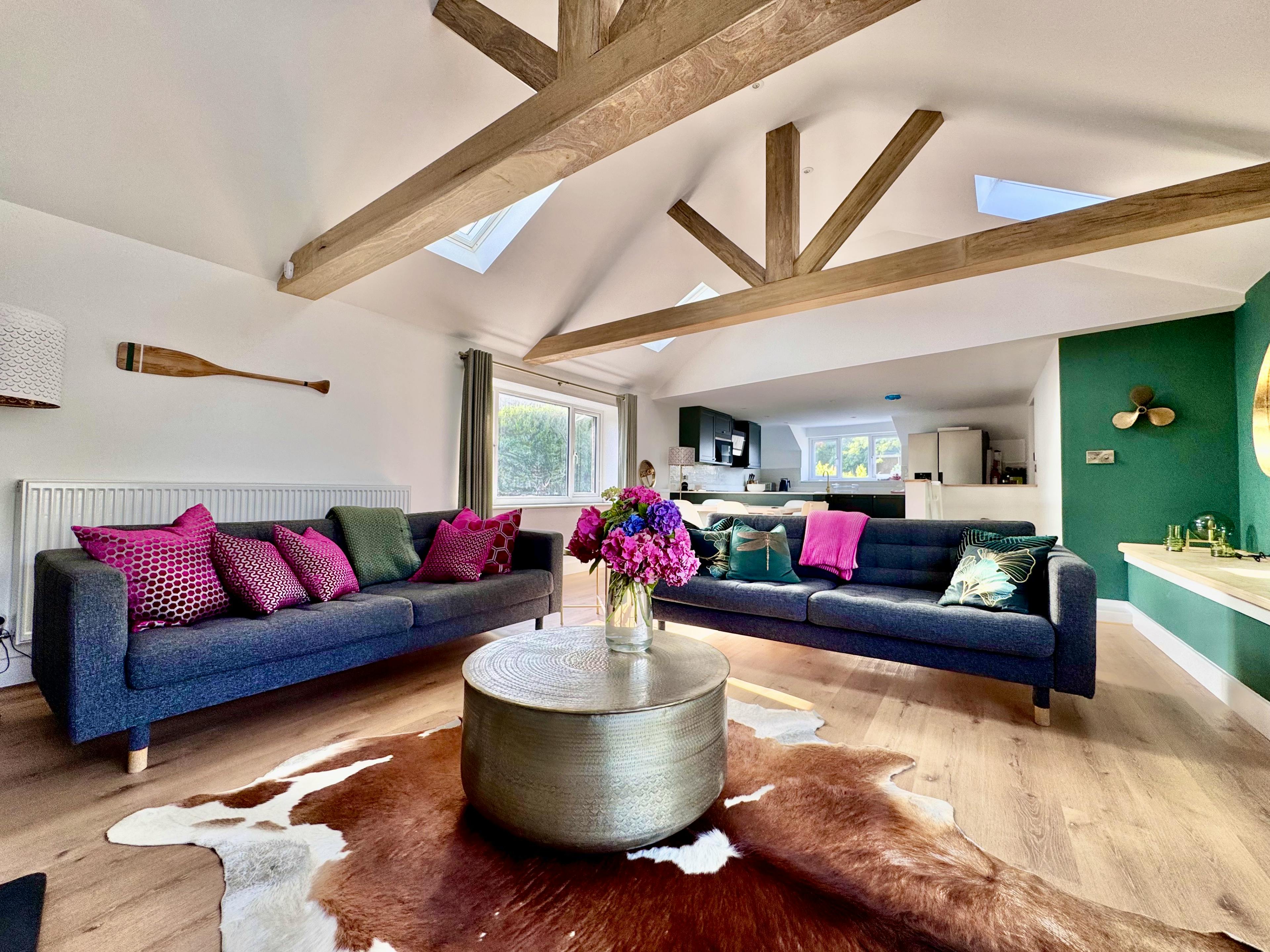 Airy open-plan living space with lofty ceilings, rustic exposed beams and sunlit whitewashed walls that create a warm, welcoming atmosphere.