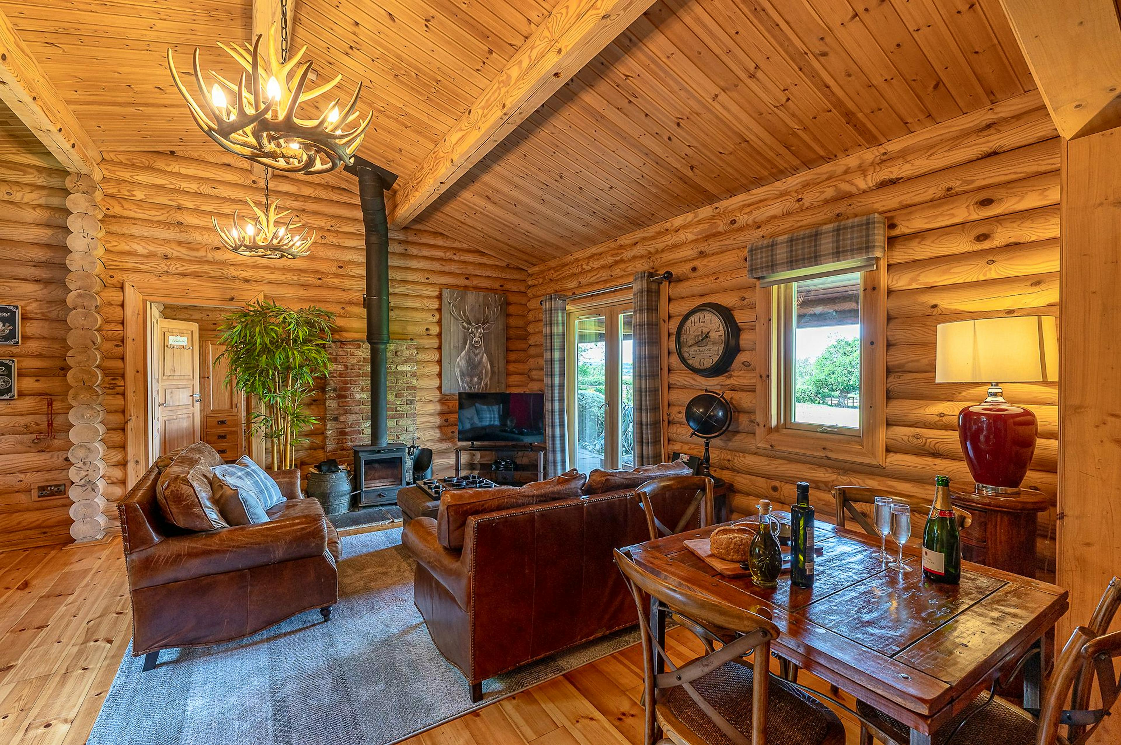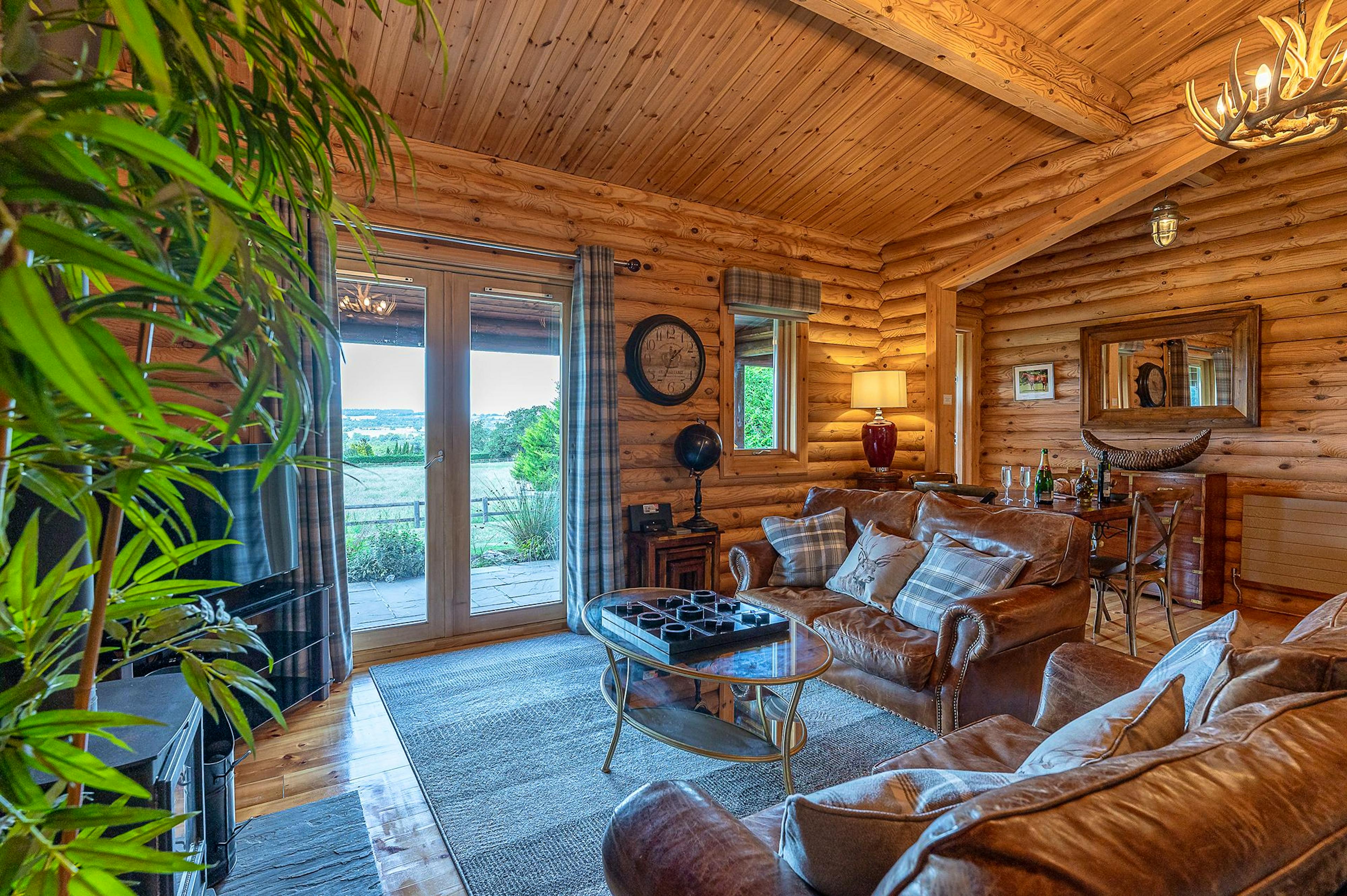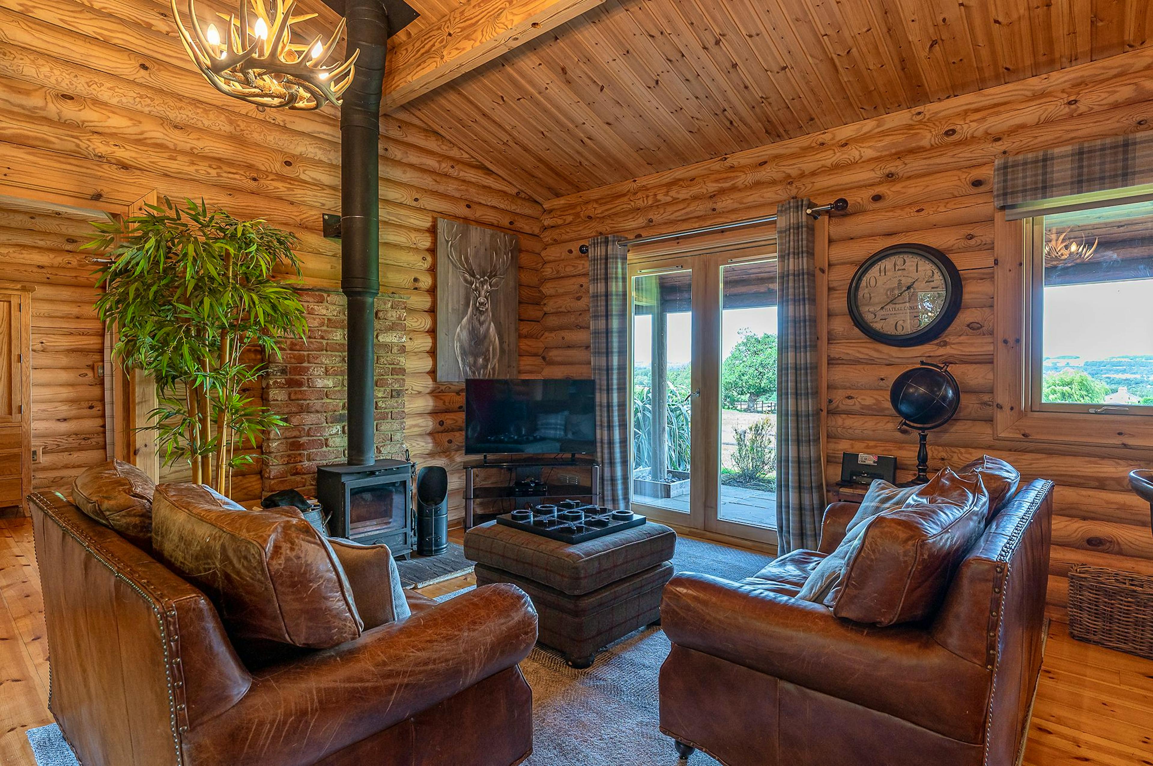 Open-plan living area with cosy sofas, log cabin charm, woodburning stove and large windows framing the rolling hills.