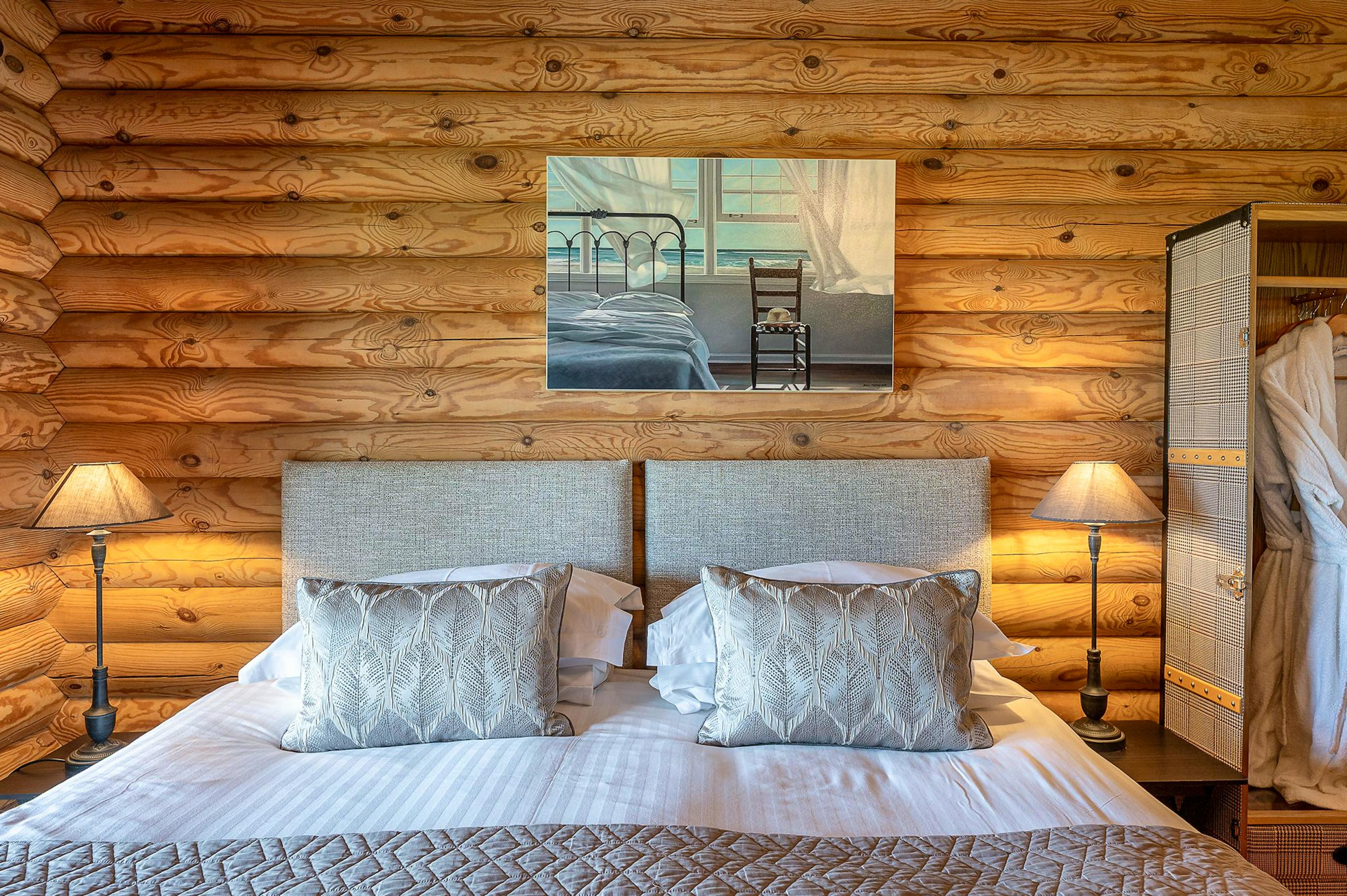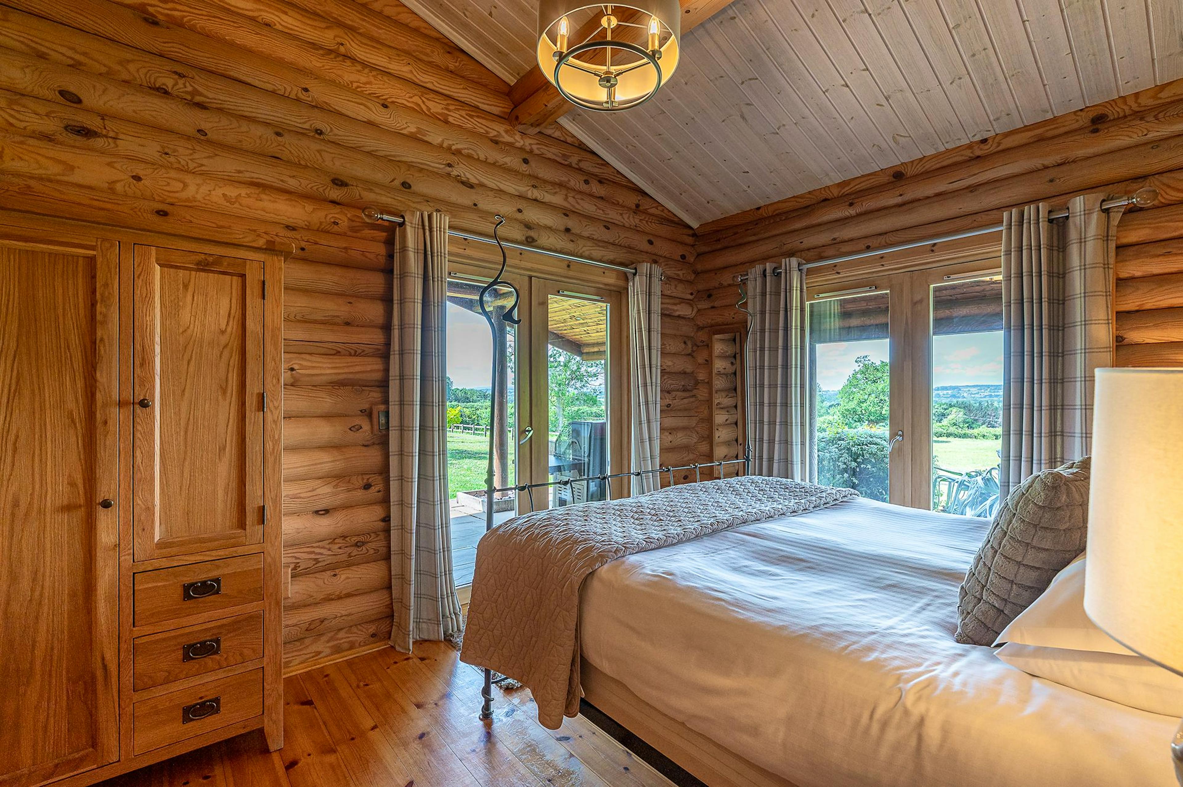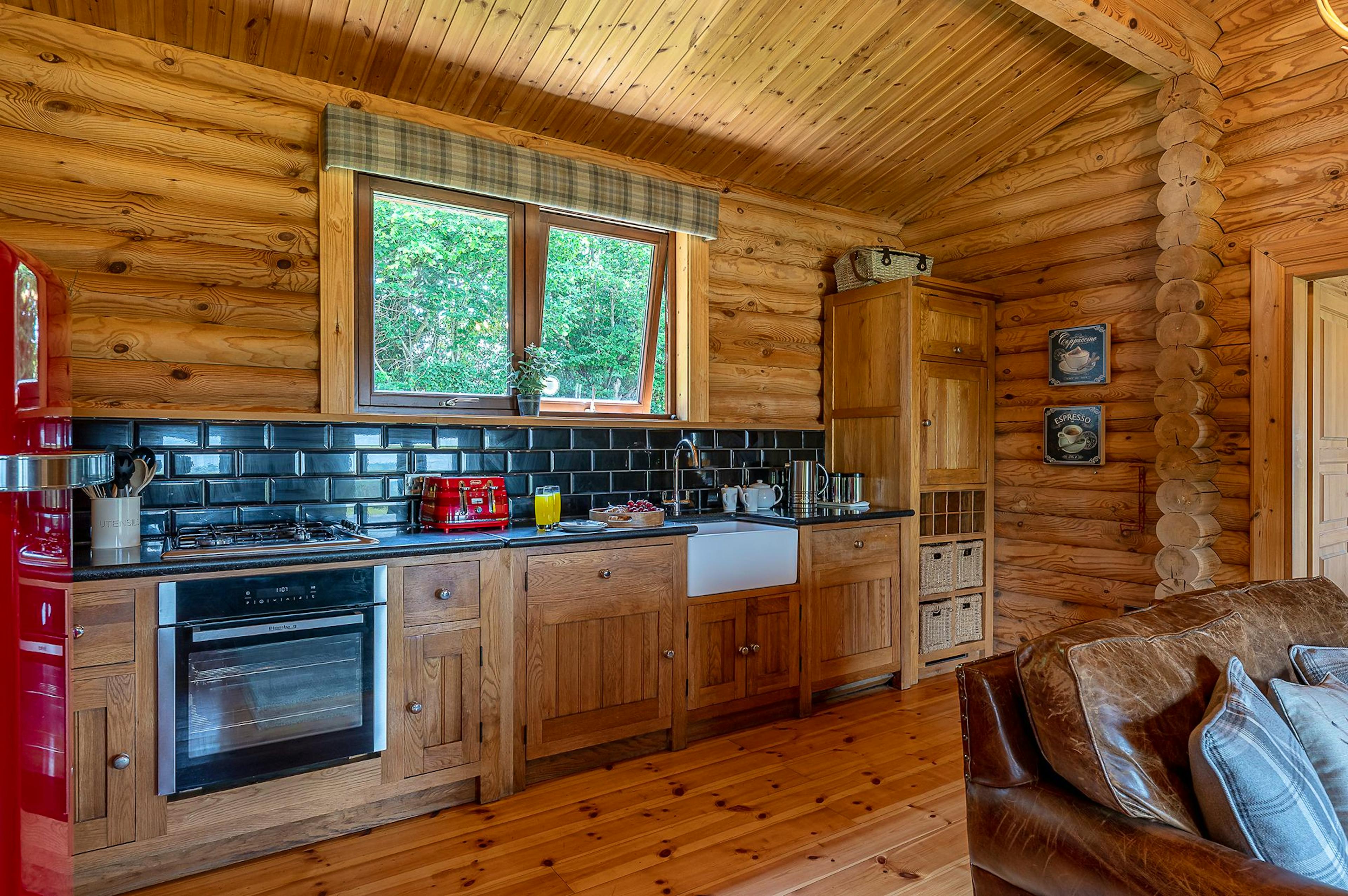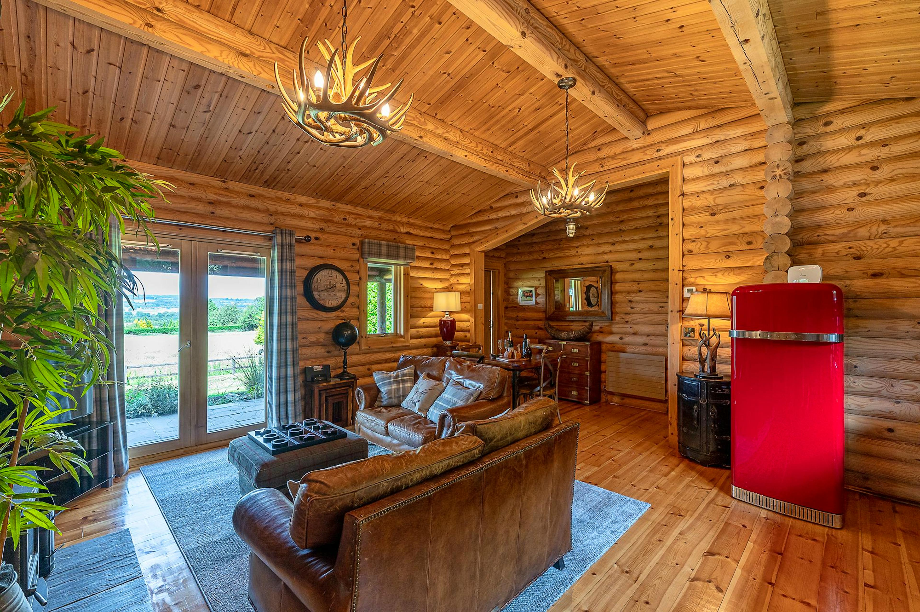 Open-plan living area with cosy sofas, log cabin charm, woodburning stove and large windows framing the rolling hills.
