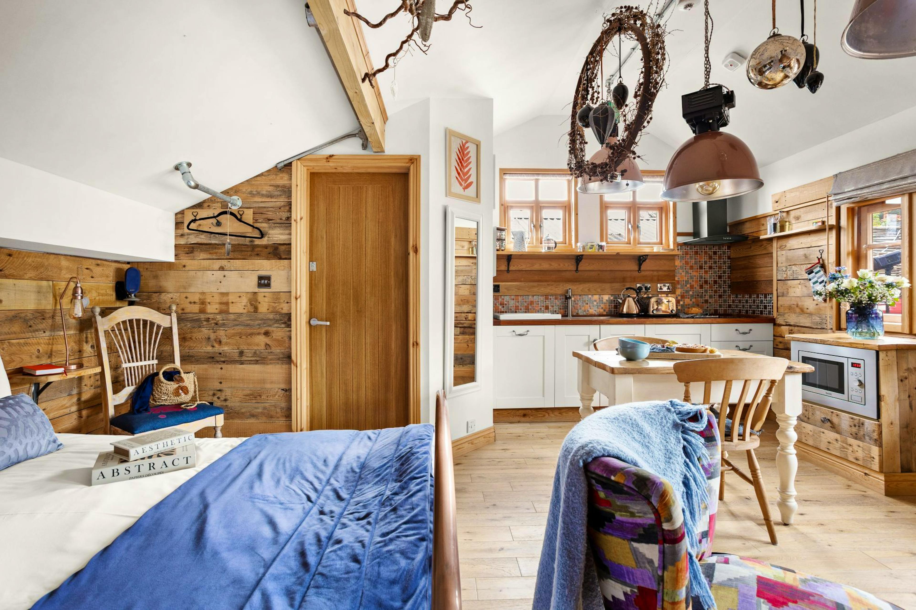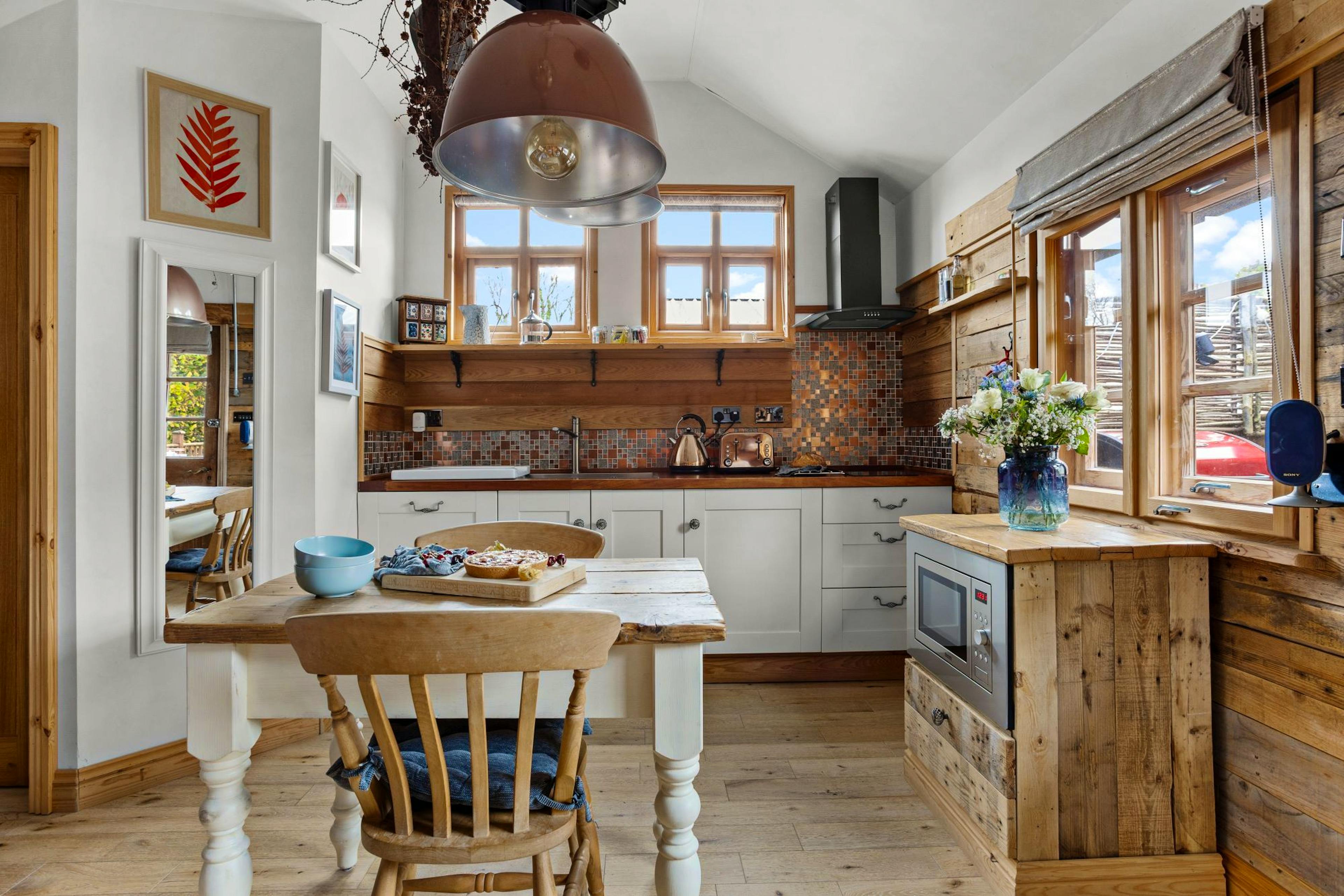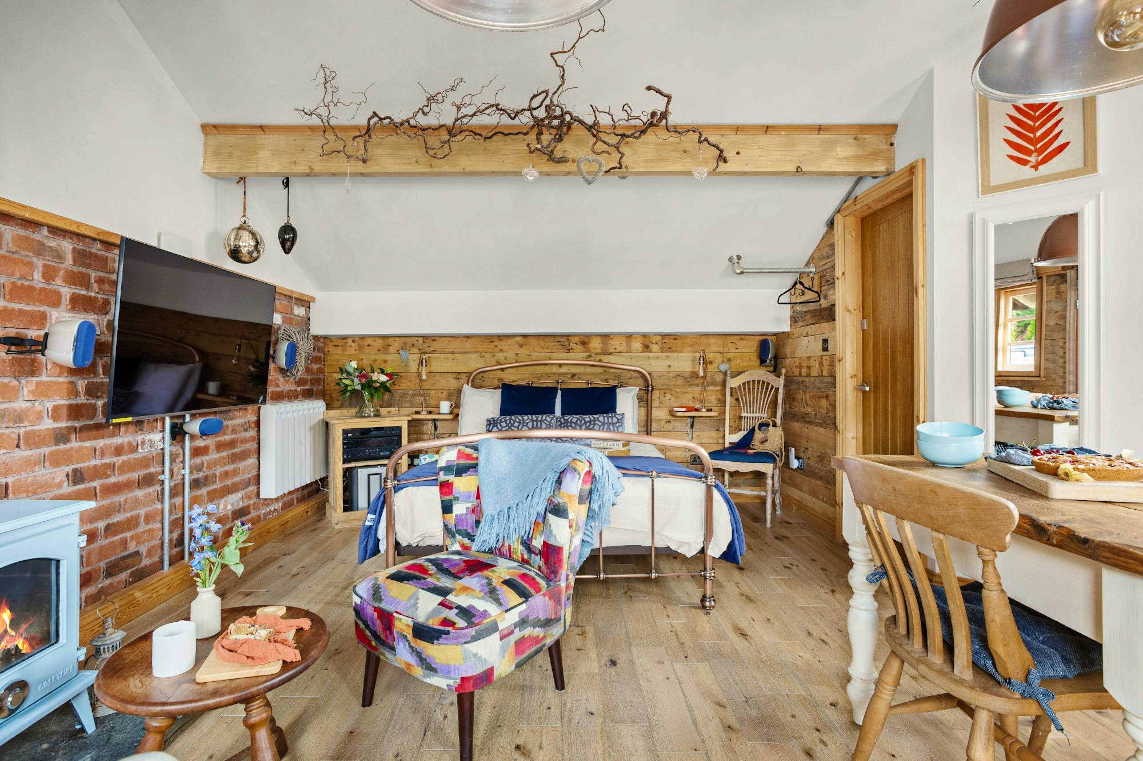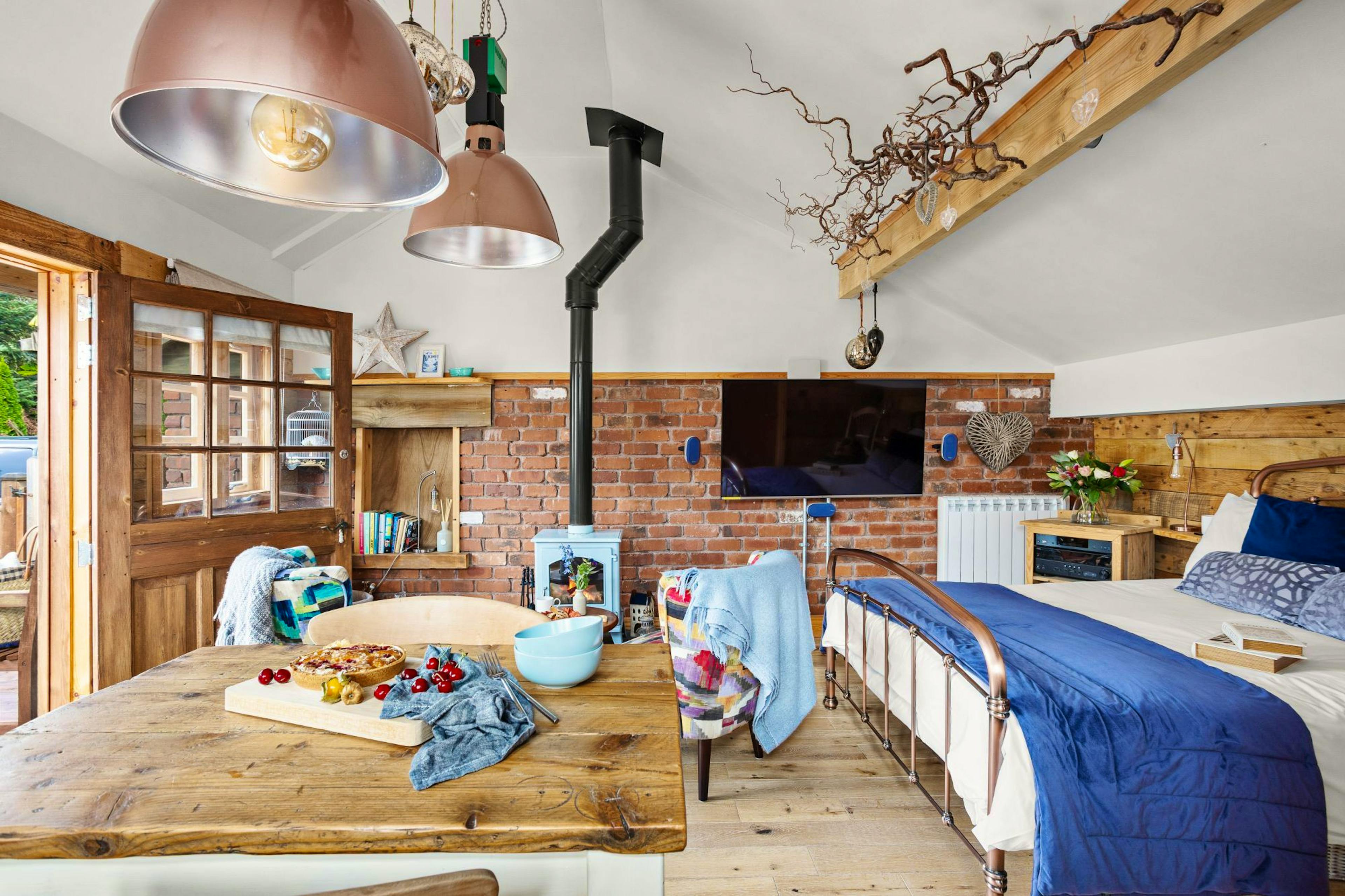Porth Chapel Cabin delivers that instant exhale feeling from the moment you arrive – a secluded, stylish hideout made for two, tucked within a quiet hamlet just outside Penzance and Newlyn. With the coast a mere four minutes away and a backdrop of rolling countryside, it’s the sort of retreat where slow mornings, long lunches and cosy evenings unfold effortlessly. Step inside and you’re greeted by cool contemporary design woven together with rustic charm. Unique reclaimed fittings – including lighting salvaged from a well-known Penzance hotel – pair with chunky wooden doors, warm panelling and exposed brick to bring a sense of history and heart to the space. The open plan layout creates an easy flow, perfect for unwinding side by side. Sink into the two armchairs beside the crackling log burner, cue up something special on the huge Smart TV or turn up the music with the surround-sound system as you settle in for the evening. The perfectly formed kitchen has everything you need for simple breakfasts or romantic suppers, while the dining table offers a lovely spot for lingering over a glass of wine. When it’s time to rest, the big brass bed promises deeply comfortable nights and lazy lie-ins with the morning light filtering through. Warm and welcoming in every season, the cabin is just as magical outside. A sprawling deck wraps around the front, furnished with sun loungers, a dining set and a gas BBQ for alfresco feasts on sunny days. As dusk settles, wrap up and step outside with a glass of bubbly to watch the stars appear above the quiet countryside. The local area is rich with places to explore. Wander through the orchards and tasting rooms of Polgoon Vineyard or visit the enchanting Trewidden Garden just up the lane. Newlyn is only minutes away and brimming with brilliant eateries and an exciting arts scene, while nearby Penzance offers a heated lido and handsome historic architecture. For postcard-worthy views, venture to Mousehole, one of Cornwall’s prettiest harbour villages, where seafood lunches and sea-sprayed strolls await. Walkers will love the South West Coast Path, especially the stunning stretch between Mousehole and Lamorna Cove. Trengwainton Garden, just ten minutes from the cabin, offers blissful dog-friendly grounds to explore. And for a breathtaking day out, head a little further to the white sands of Porthcurno where the world-famous Minack Theatre sits carved into the cliffs with the Atlantic glittering below.