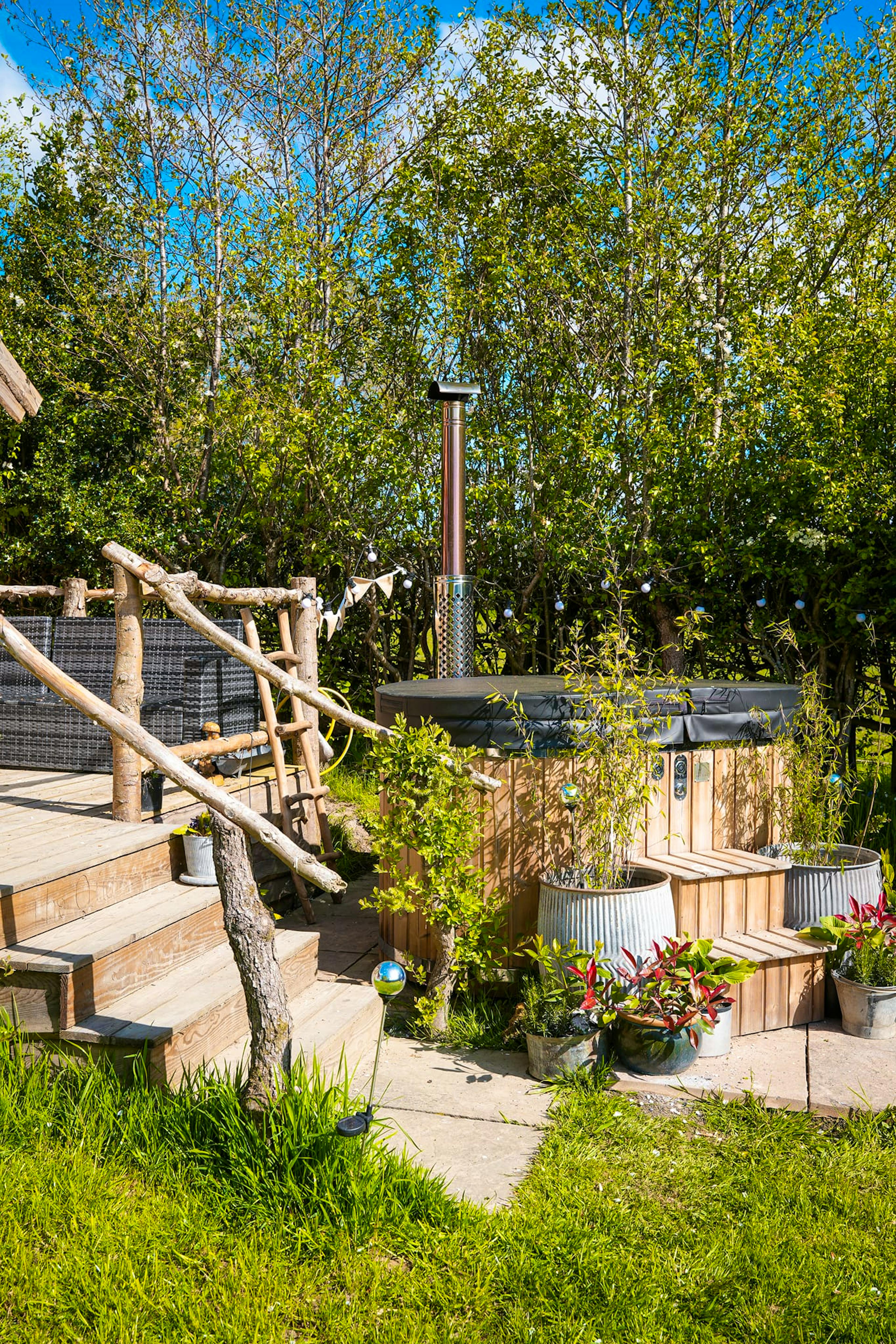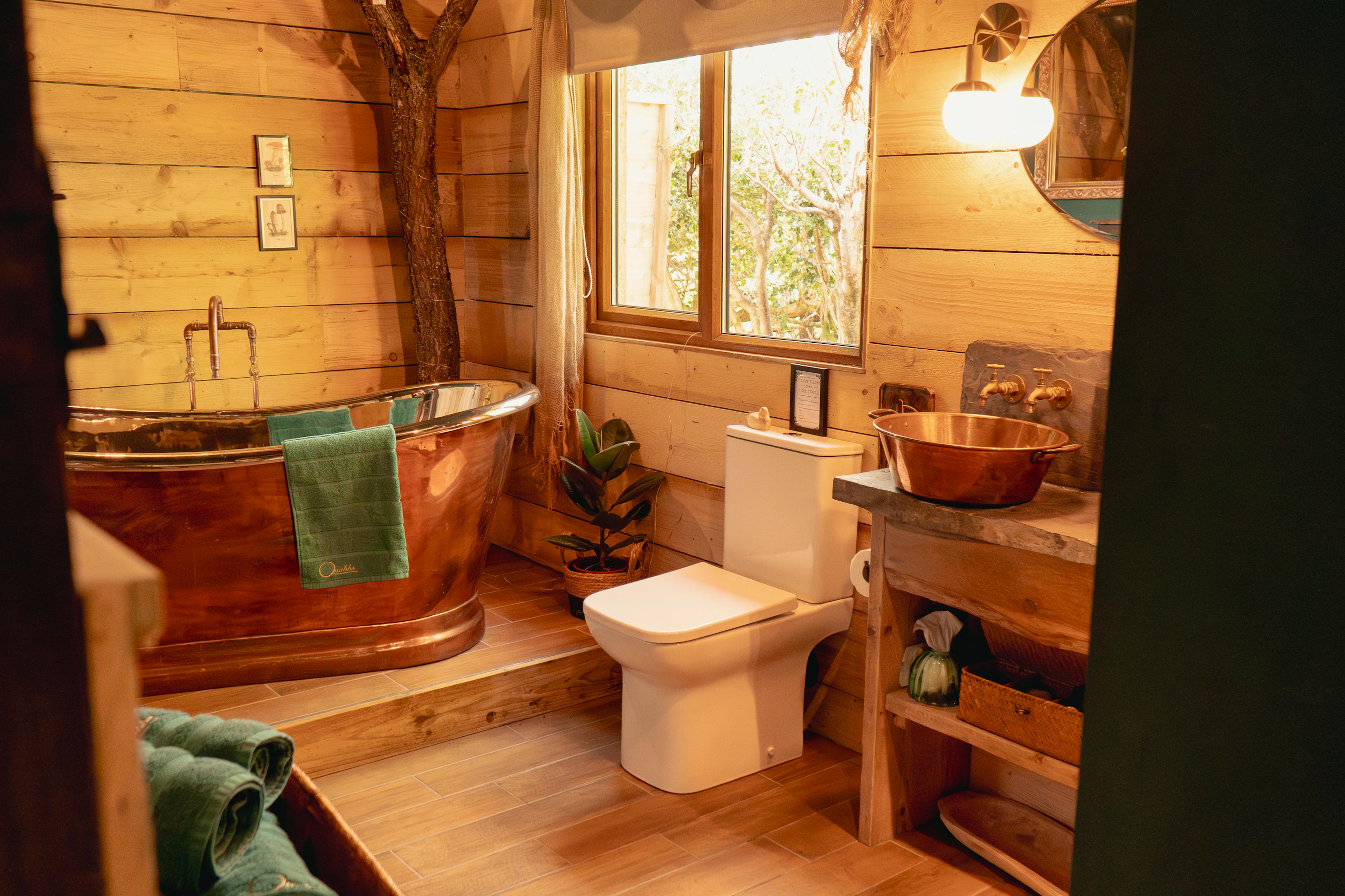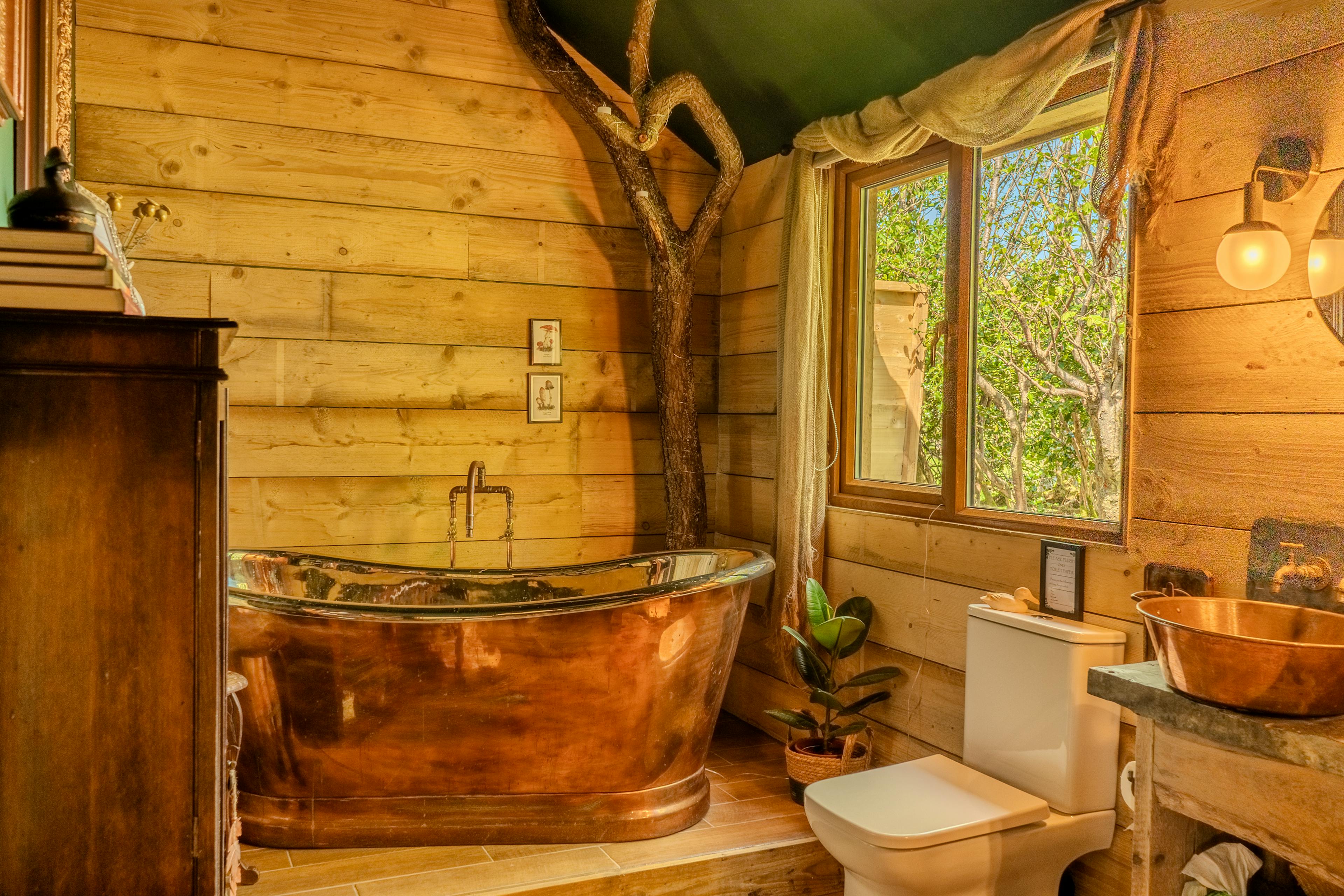 Indulgent freestanding copper bath, plus an outdoor hot tub for relaxing soaks under the stars.