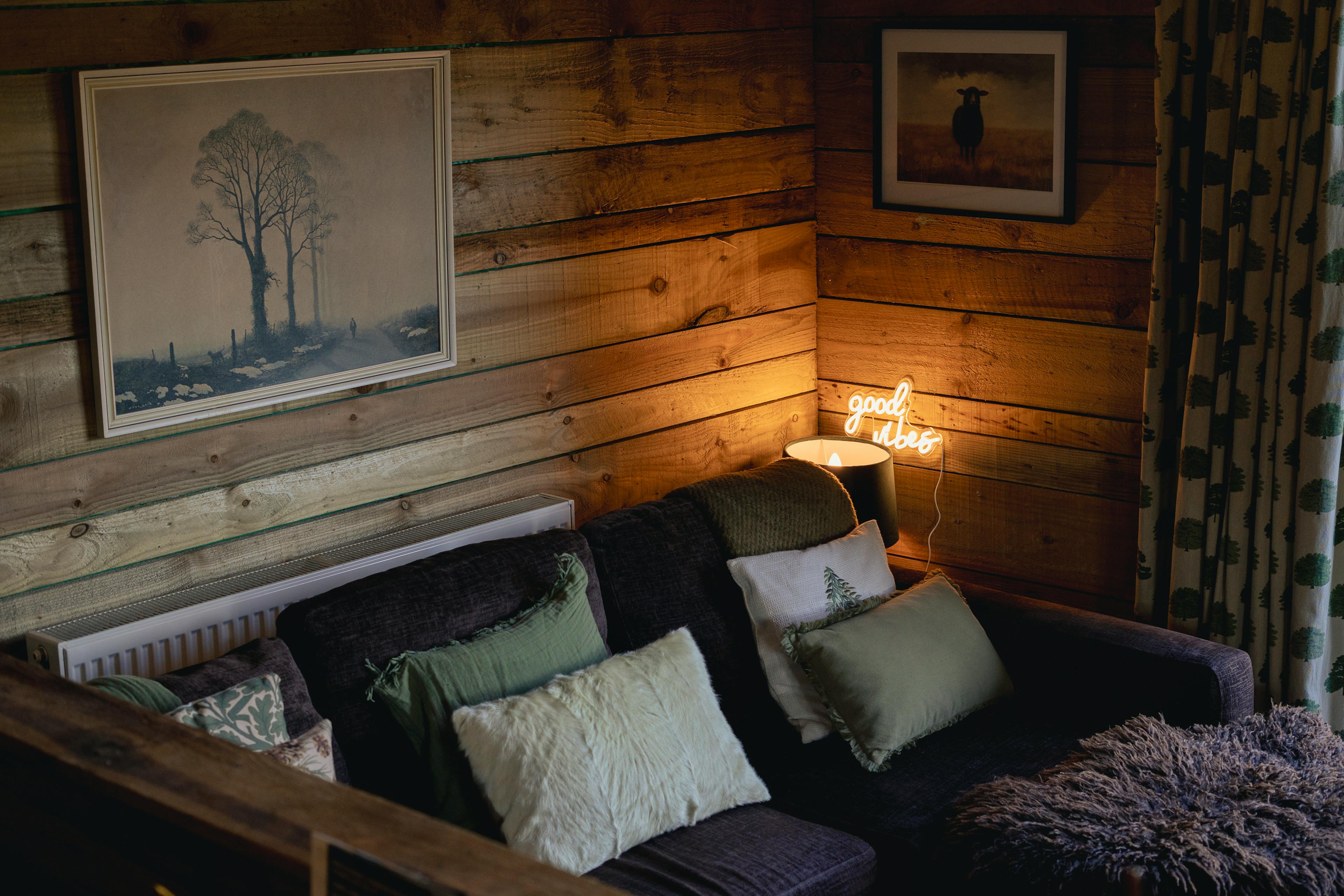 Handcrafted interiors with vaulted ceilings, exposed beams, a log burner, and a squashy sofa create a cosy yet luxurious retreat.