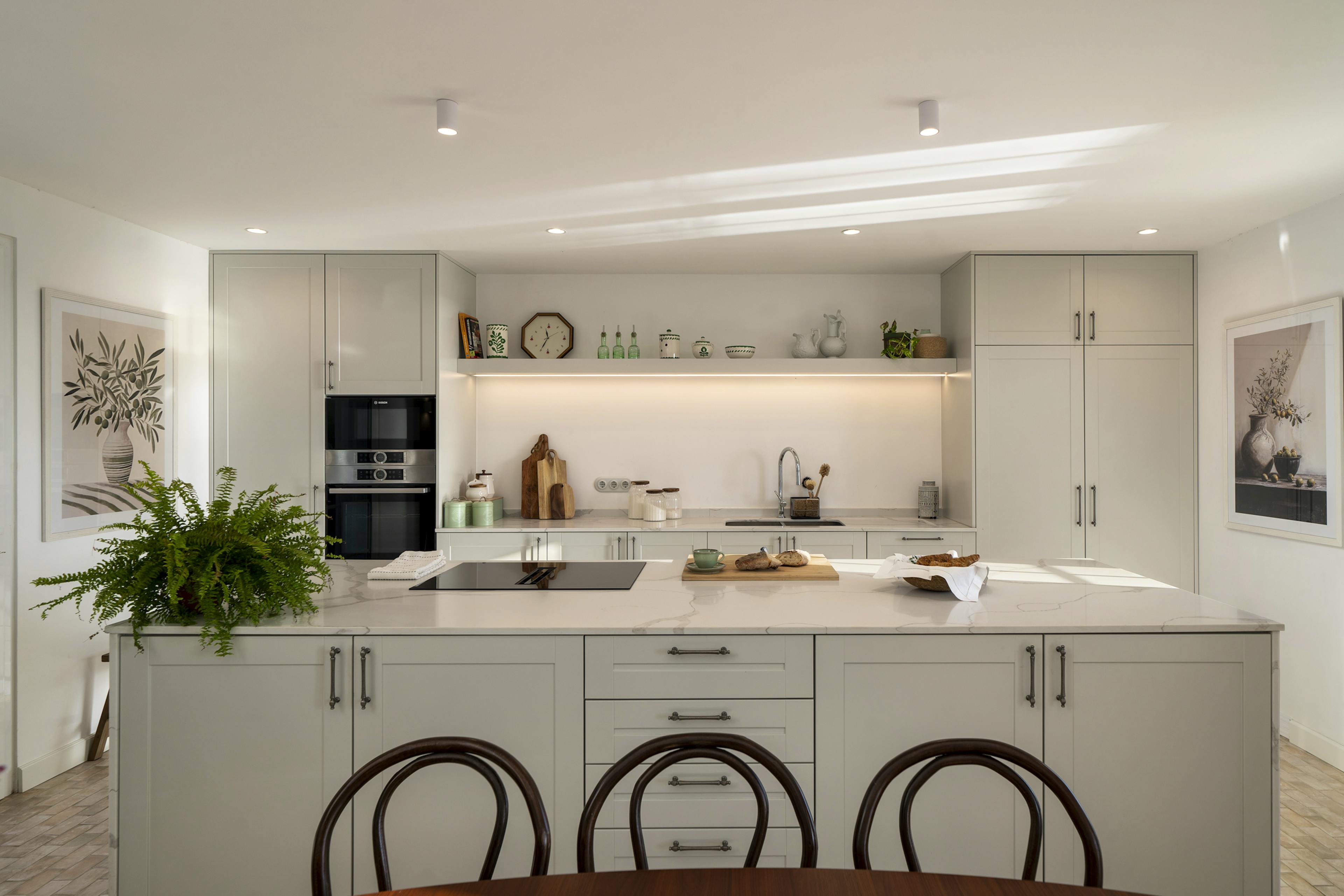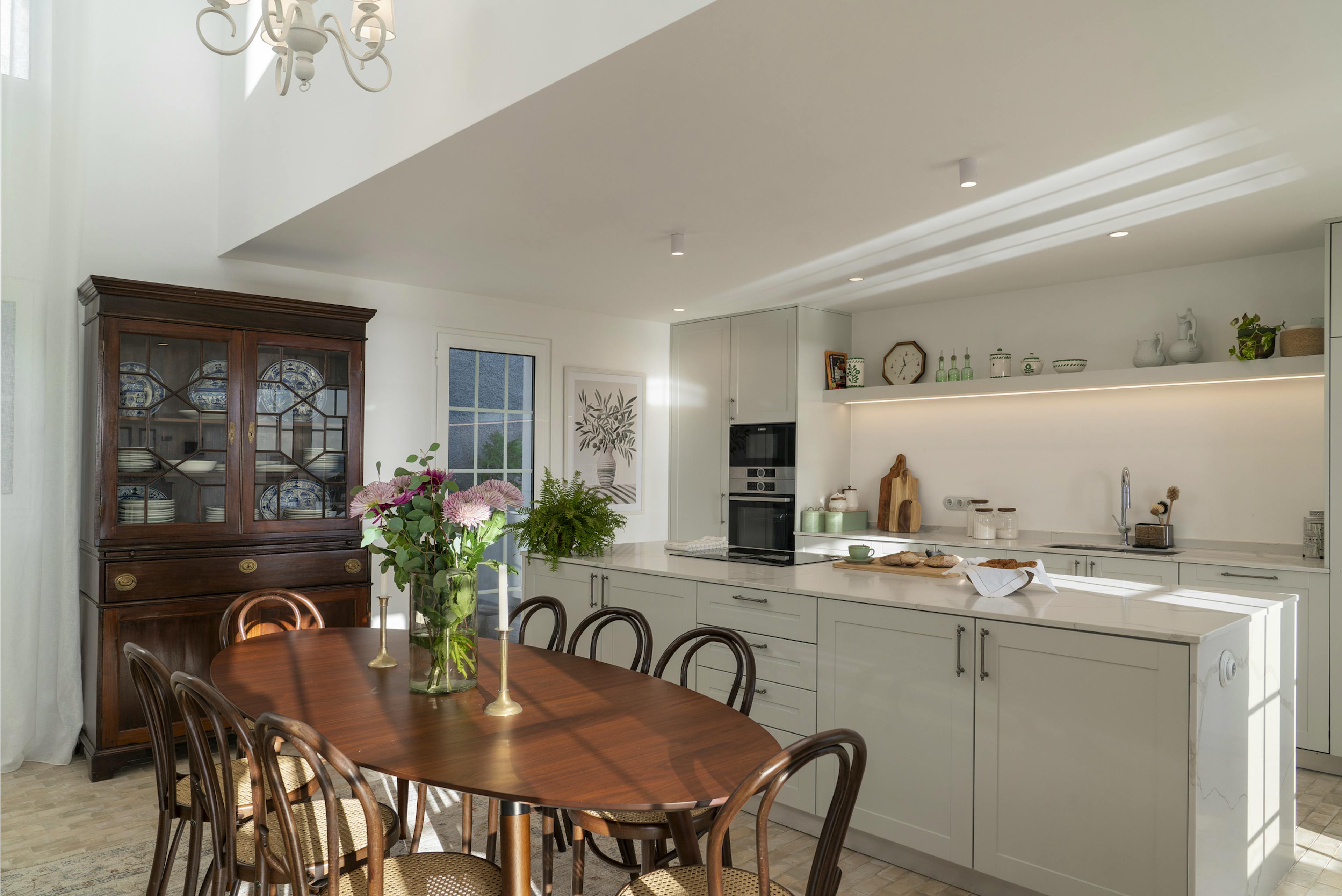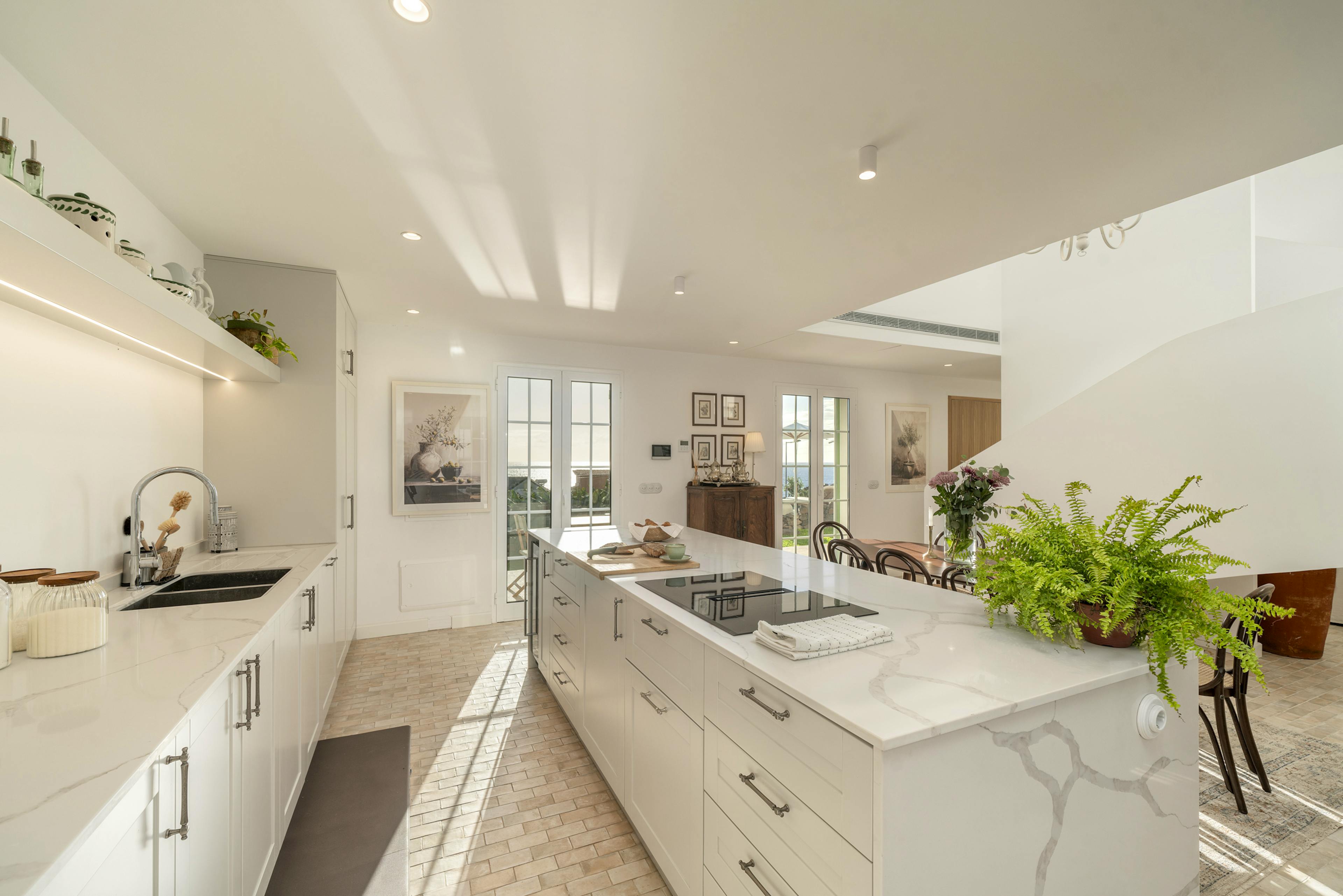 The villa features a spacious kitchen with a large island, a stylish dining area and a minimalist lounge with double-height ceilings.