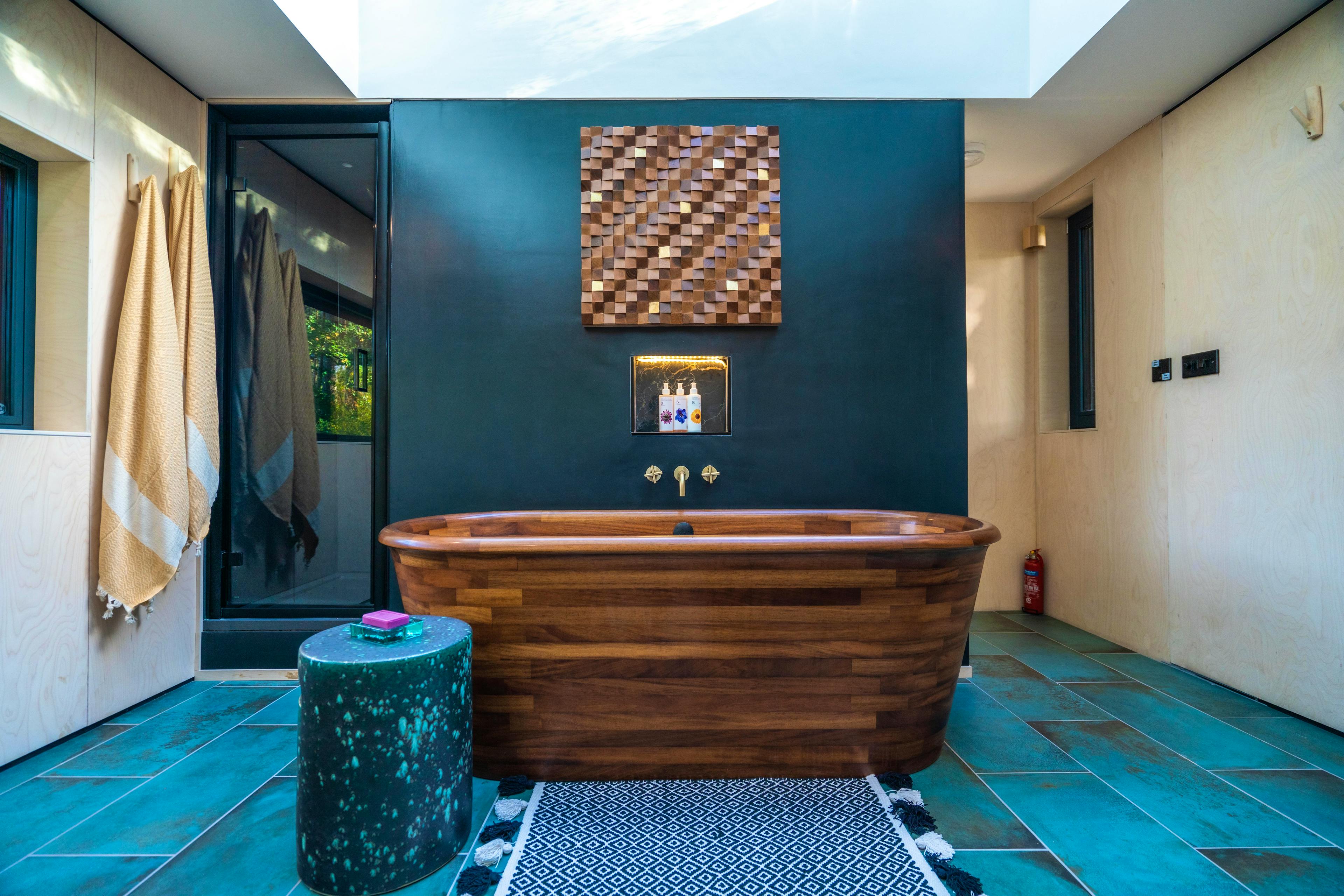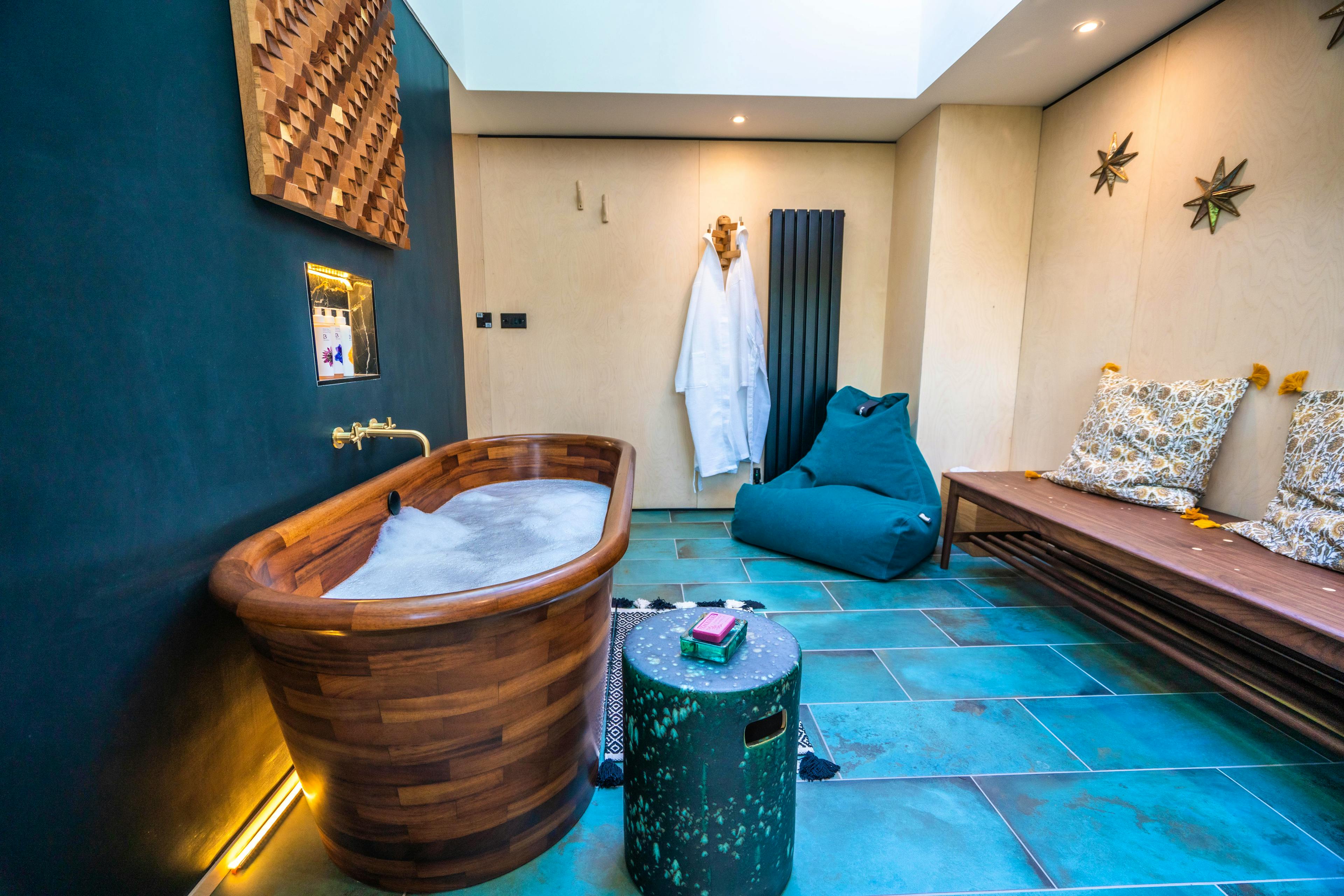 Huge wooden bathtub beneath a retractable roof, stargaze while you soak away your stresses.