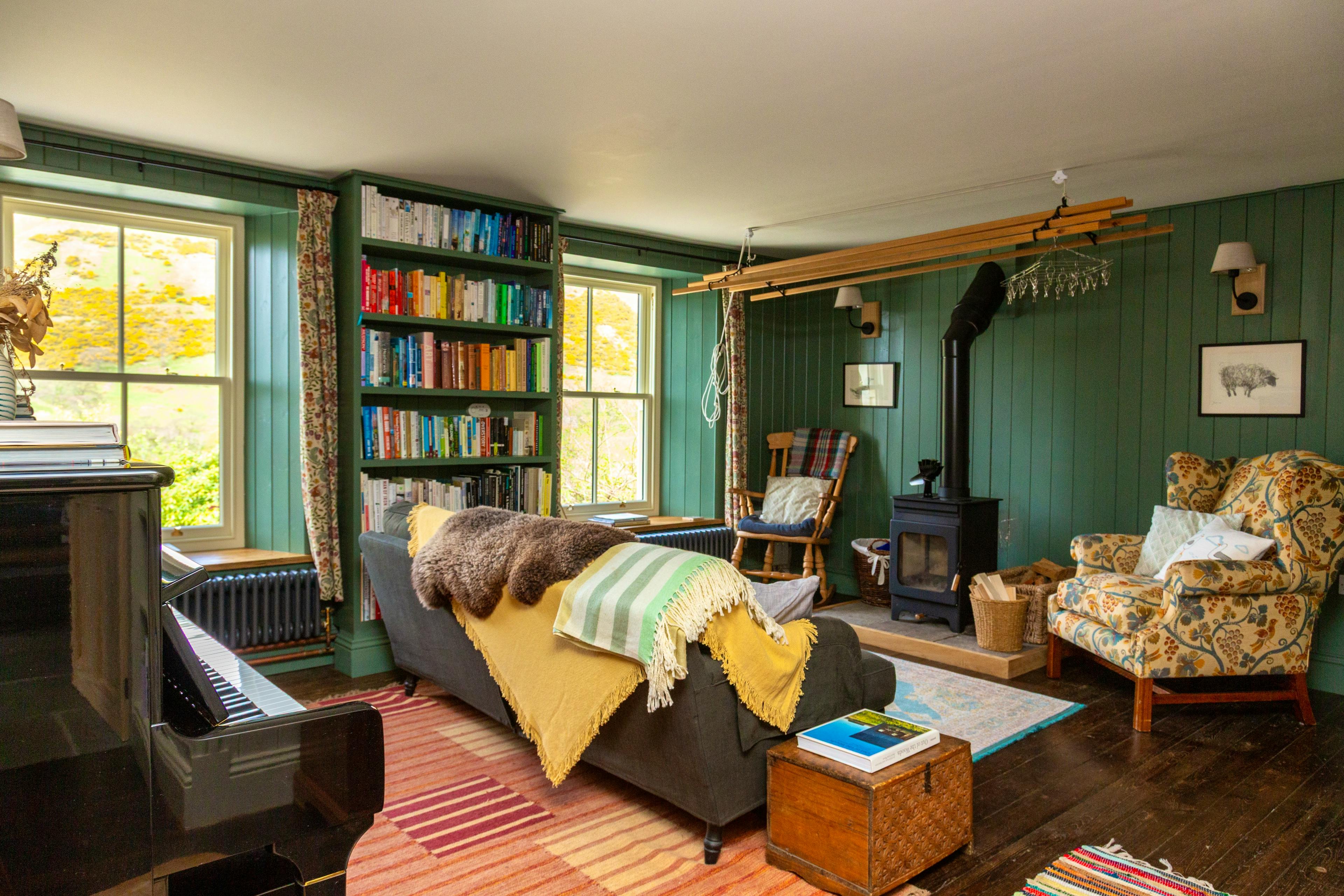 Cosy sitting room with log burner, large sofa, armchairs and a piano for relaxed, music-filled evenings.