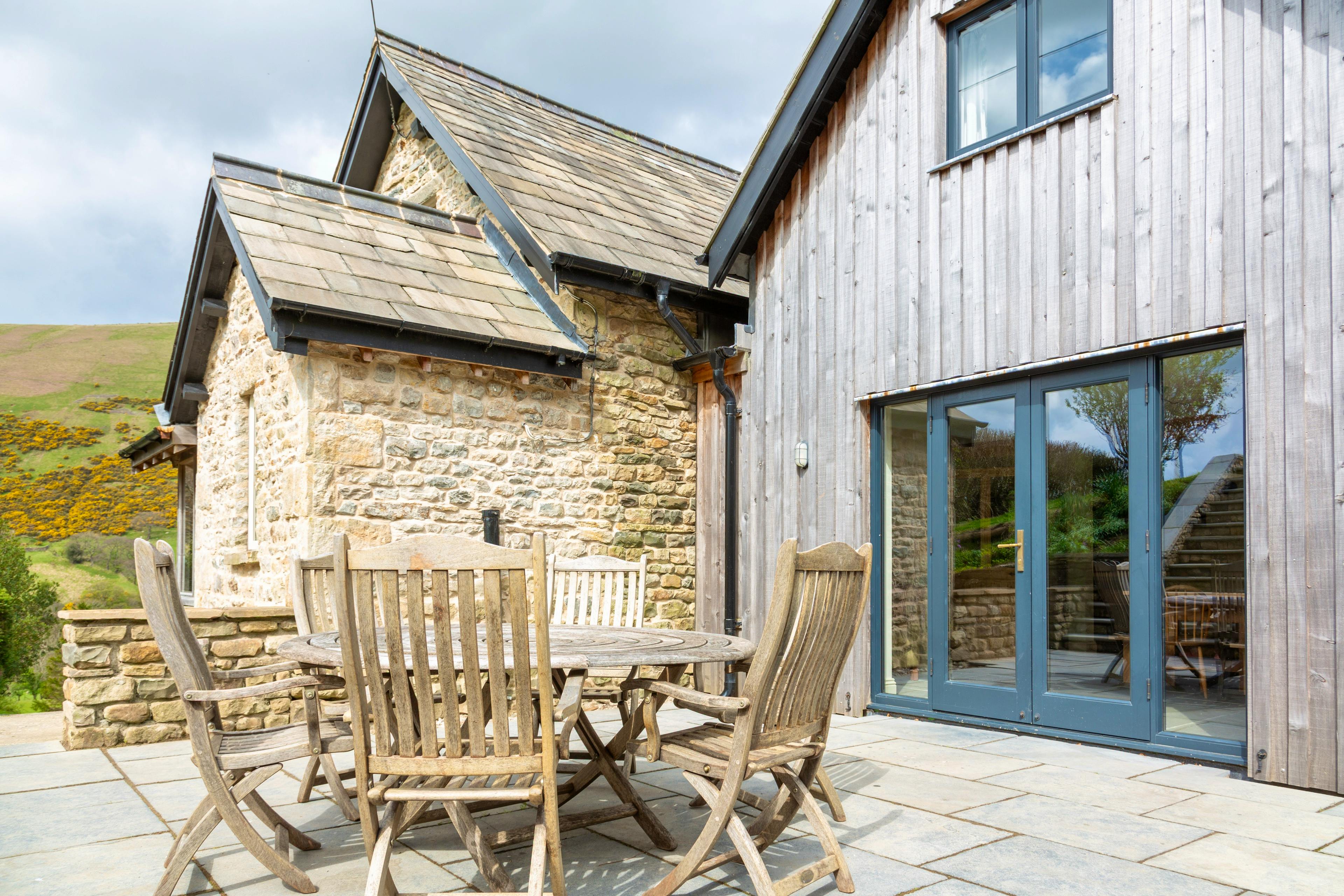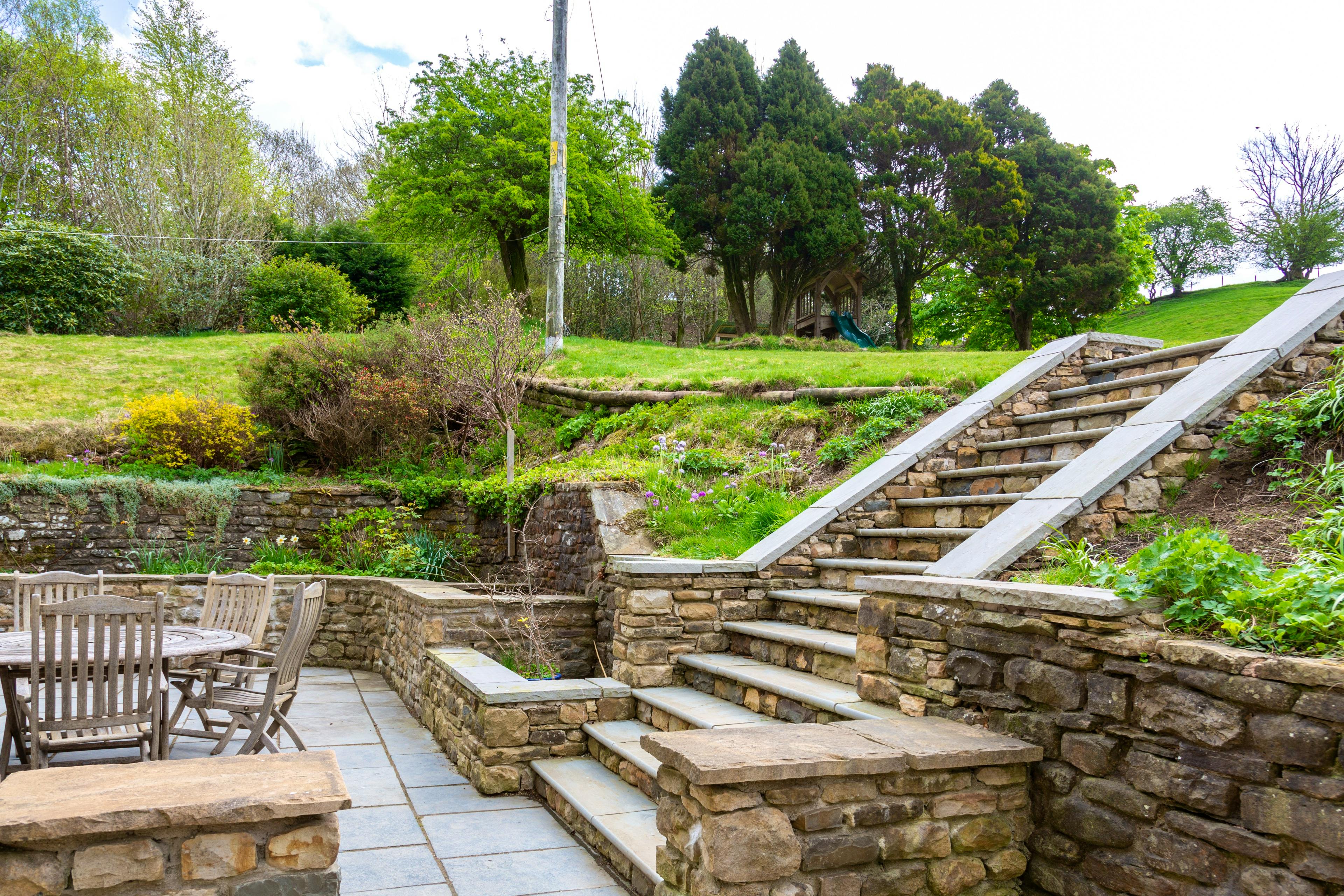 Sheltered patio with outdoor dining area and two acres of garden and woodland for wandering.