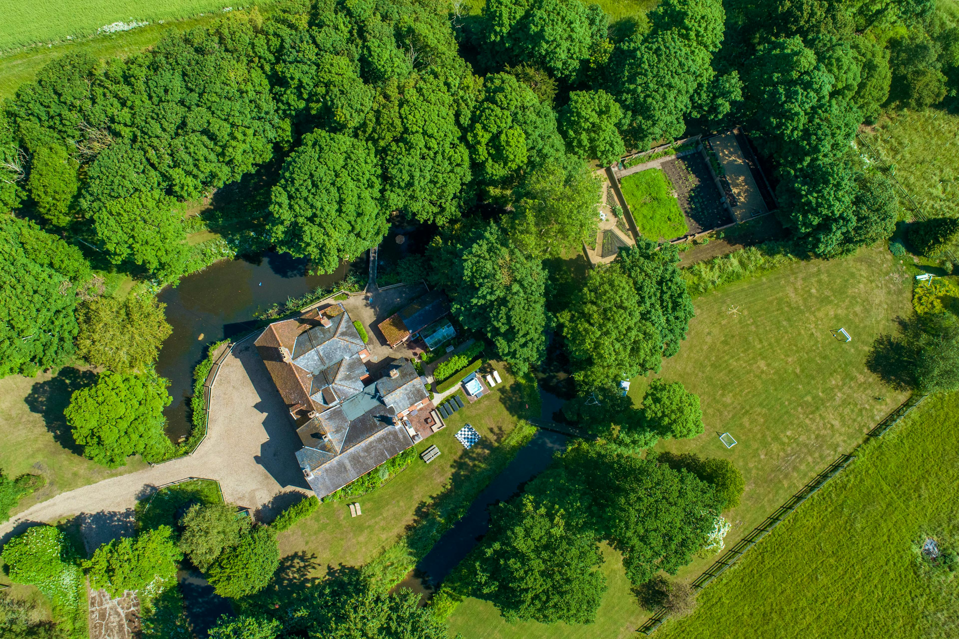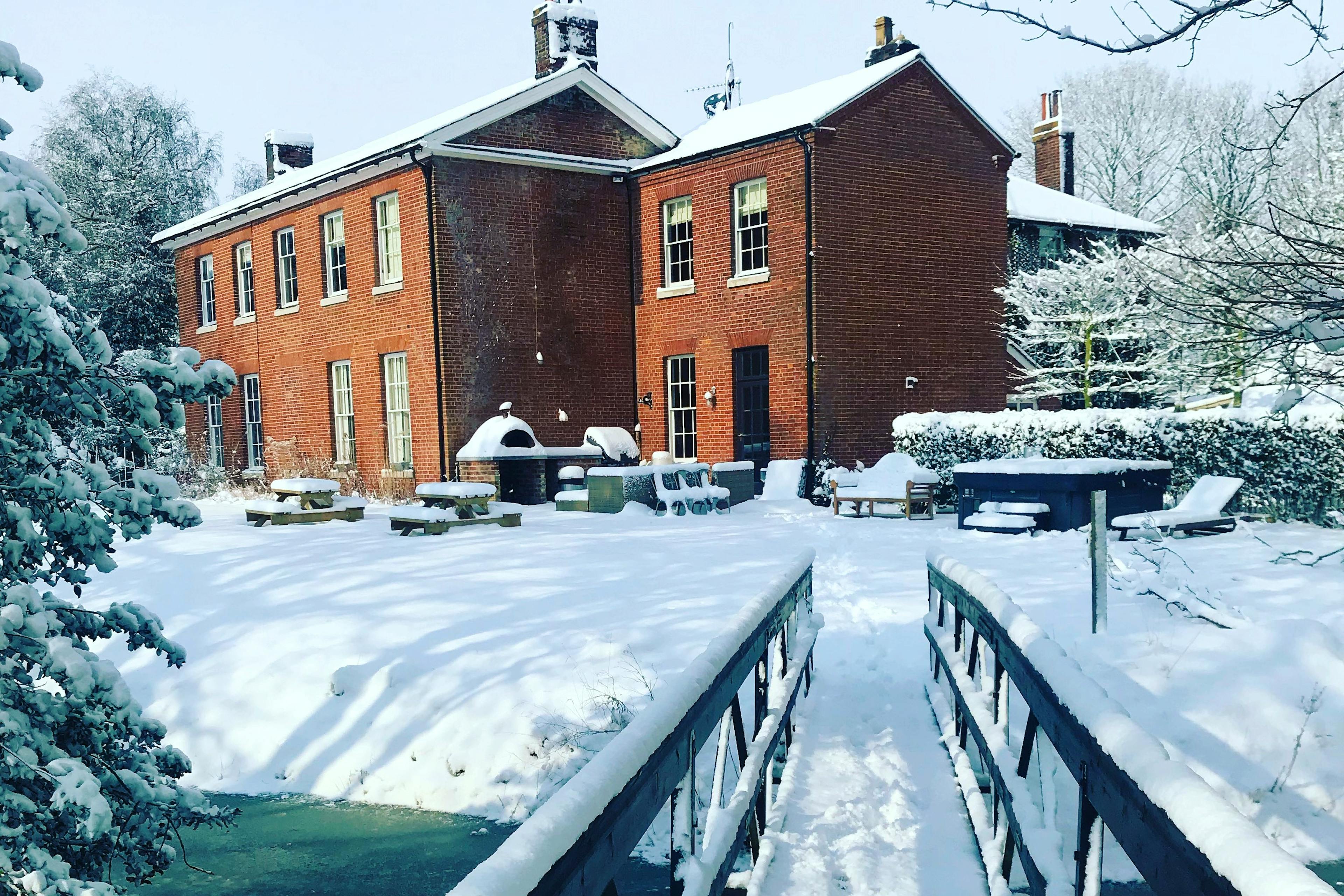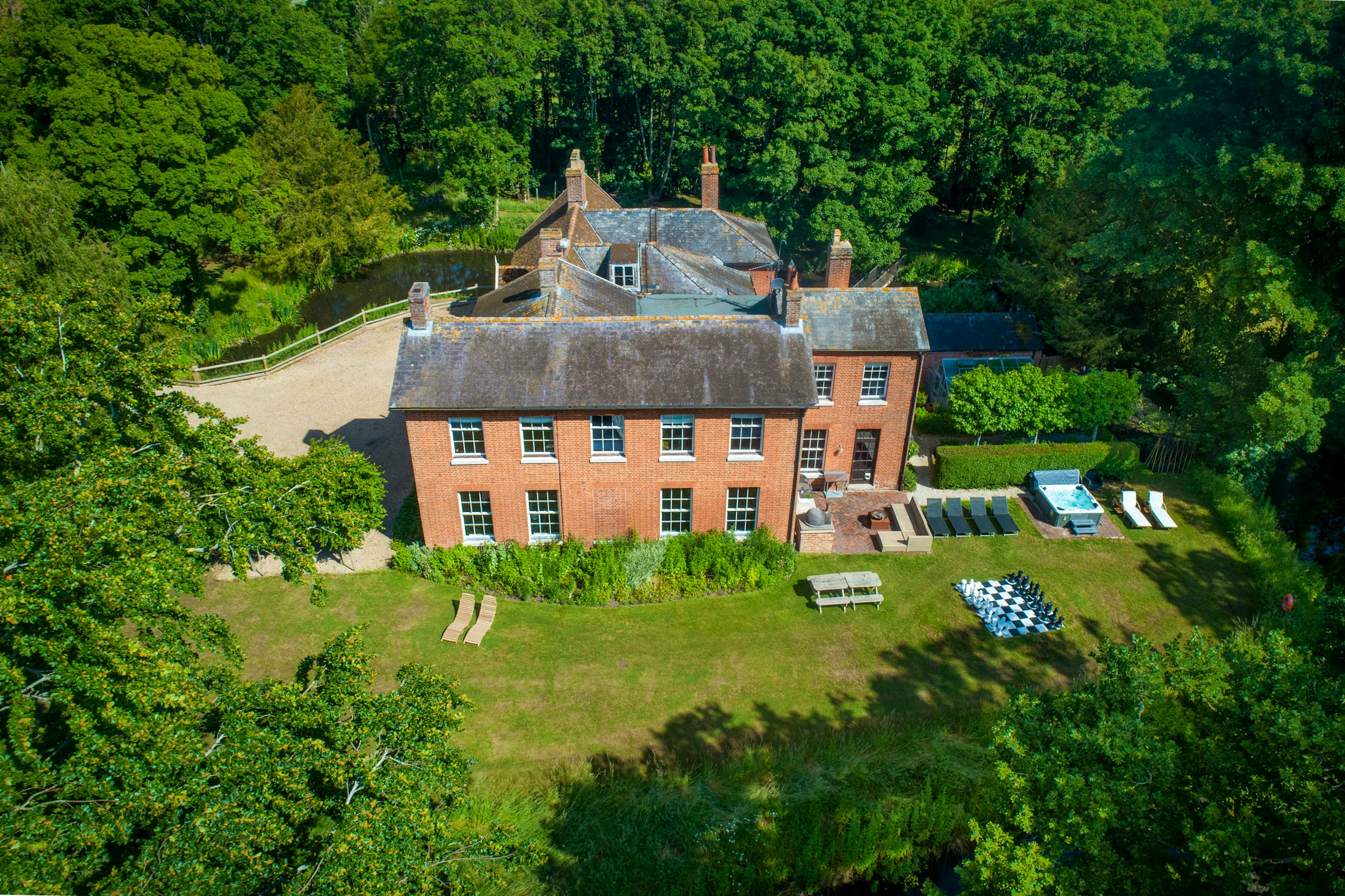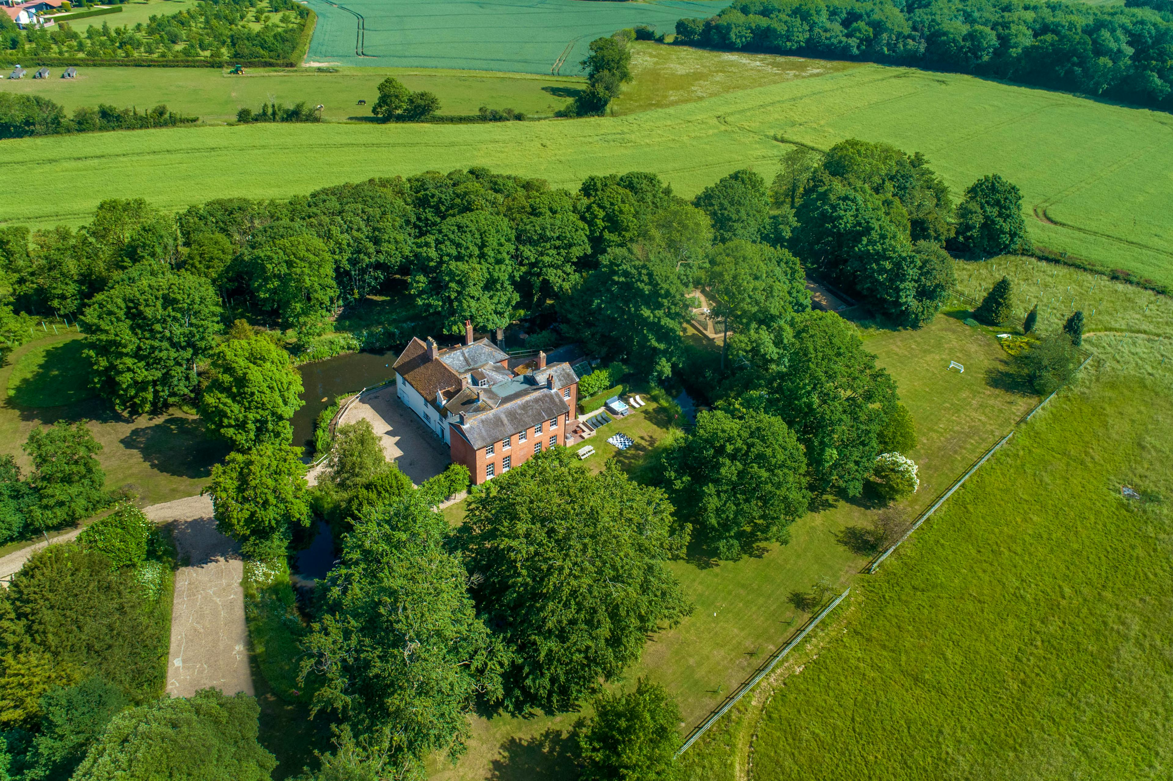 Grand, moated manor house in its own private estate in the Suffolk countryside with hot tub, stylish interiors, and spacious gardens.