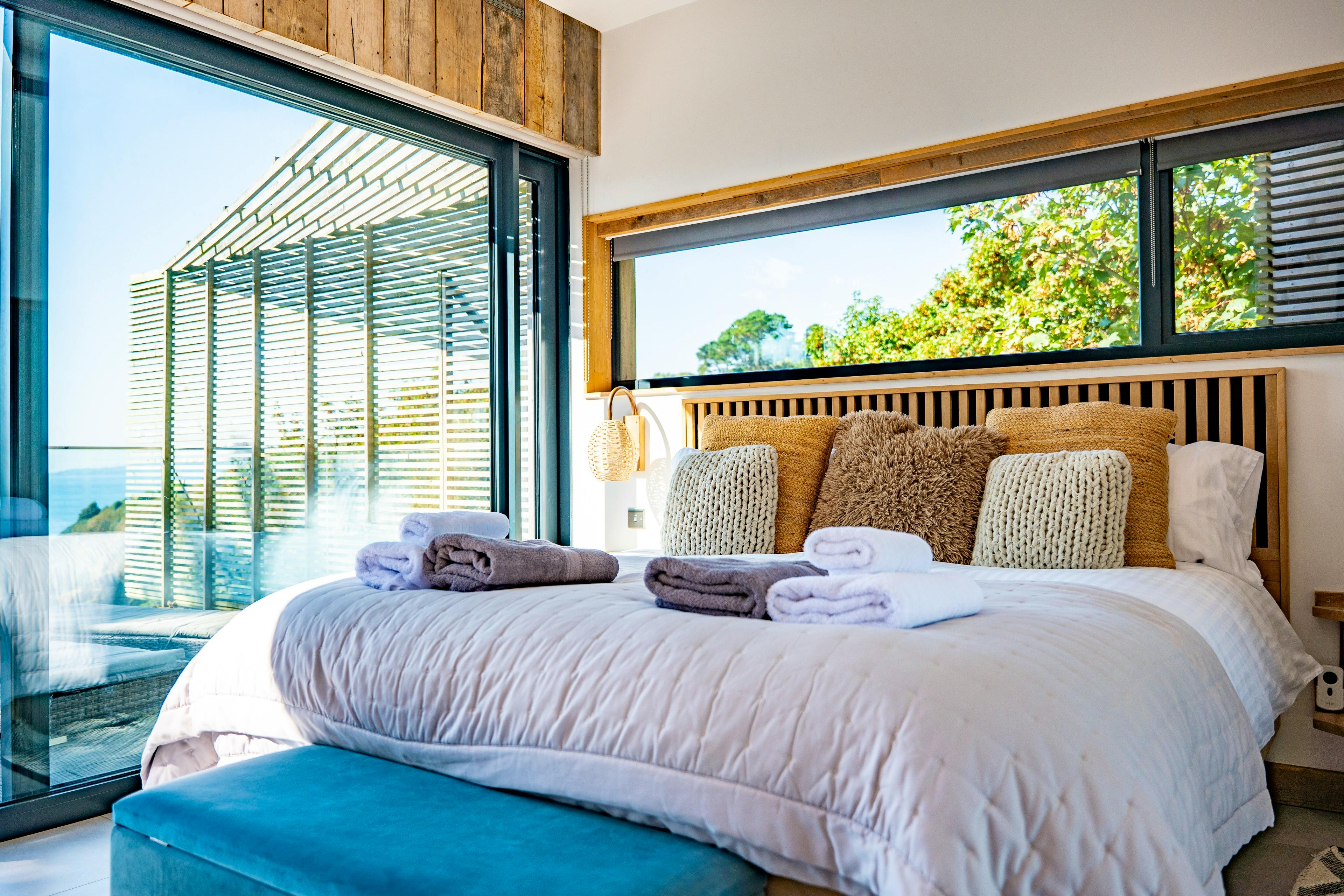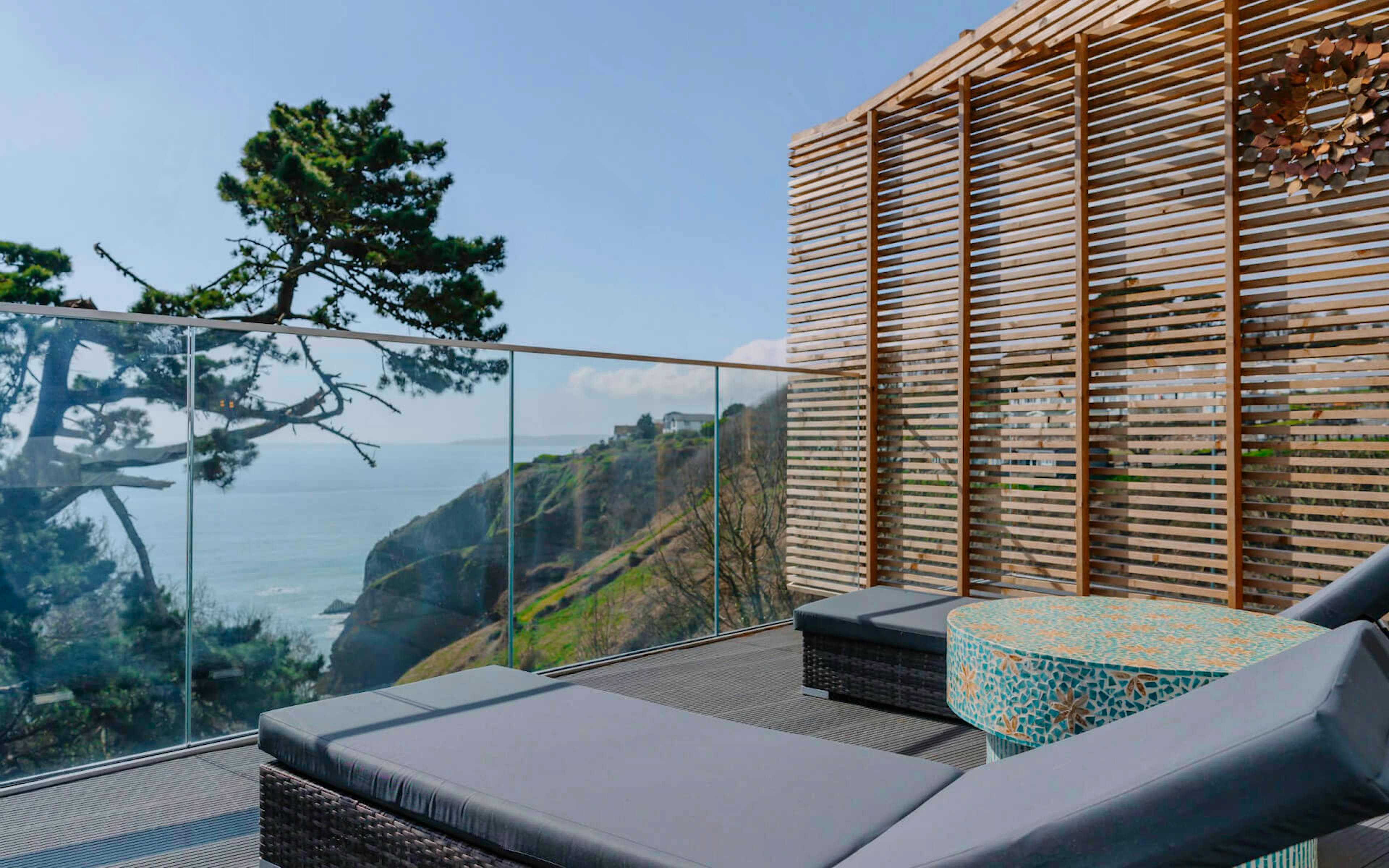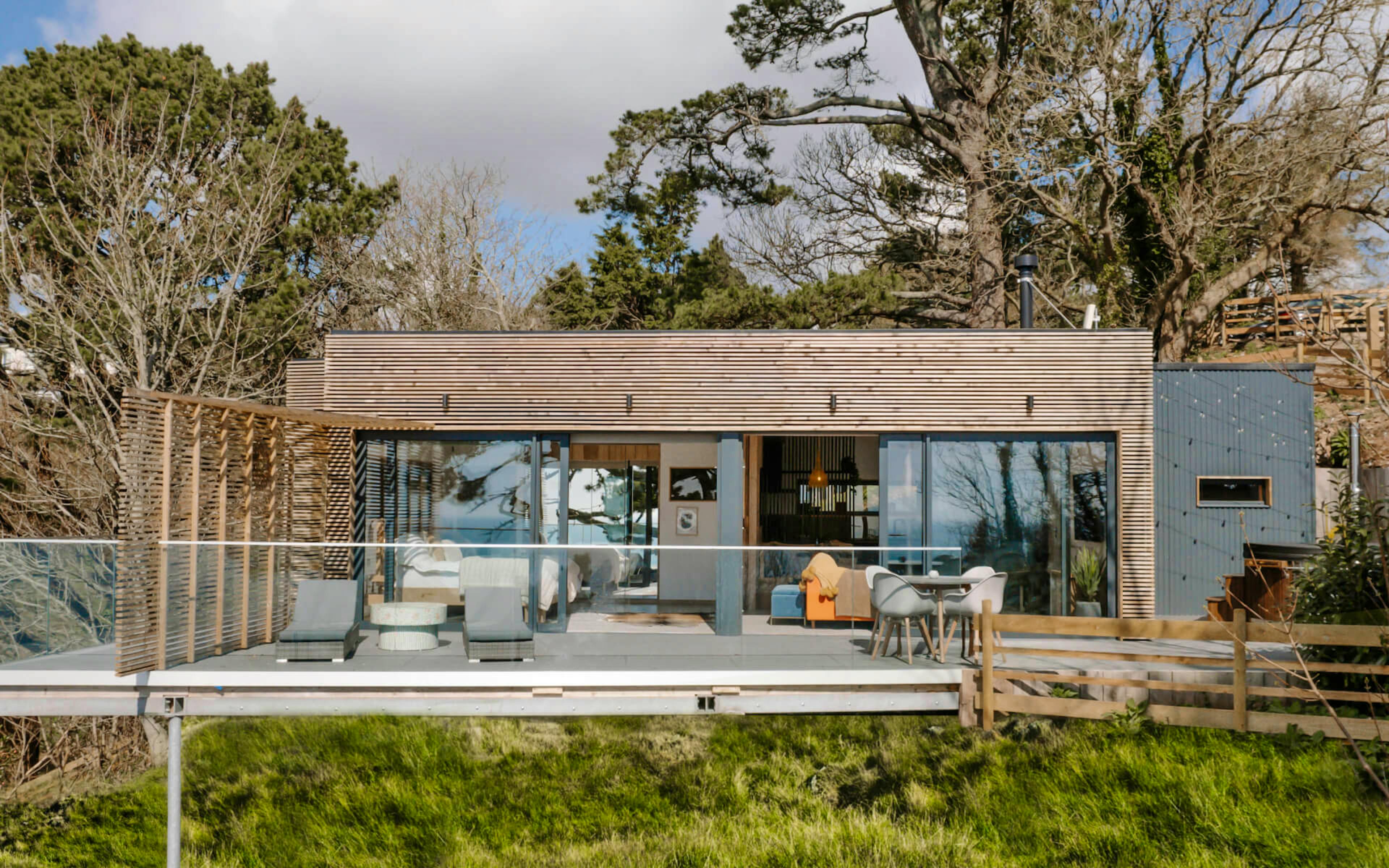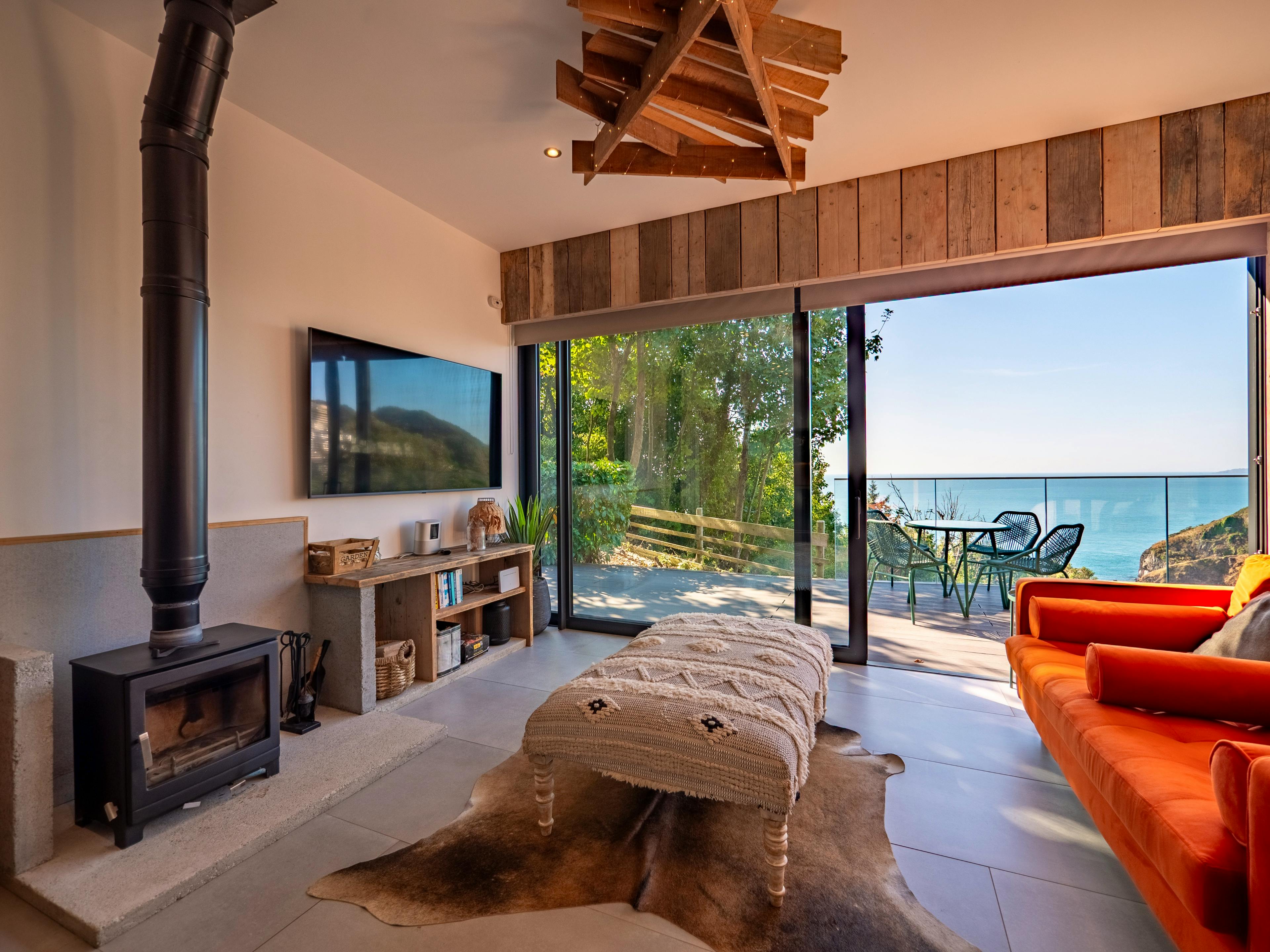 Stunning designer cabin with spectacular sea views and a hot tub on the beautiful South Devon coast, the perfect romantic hideaway.