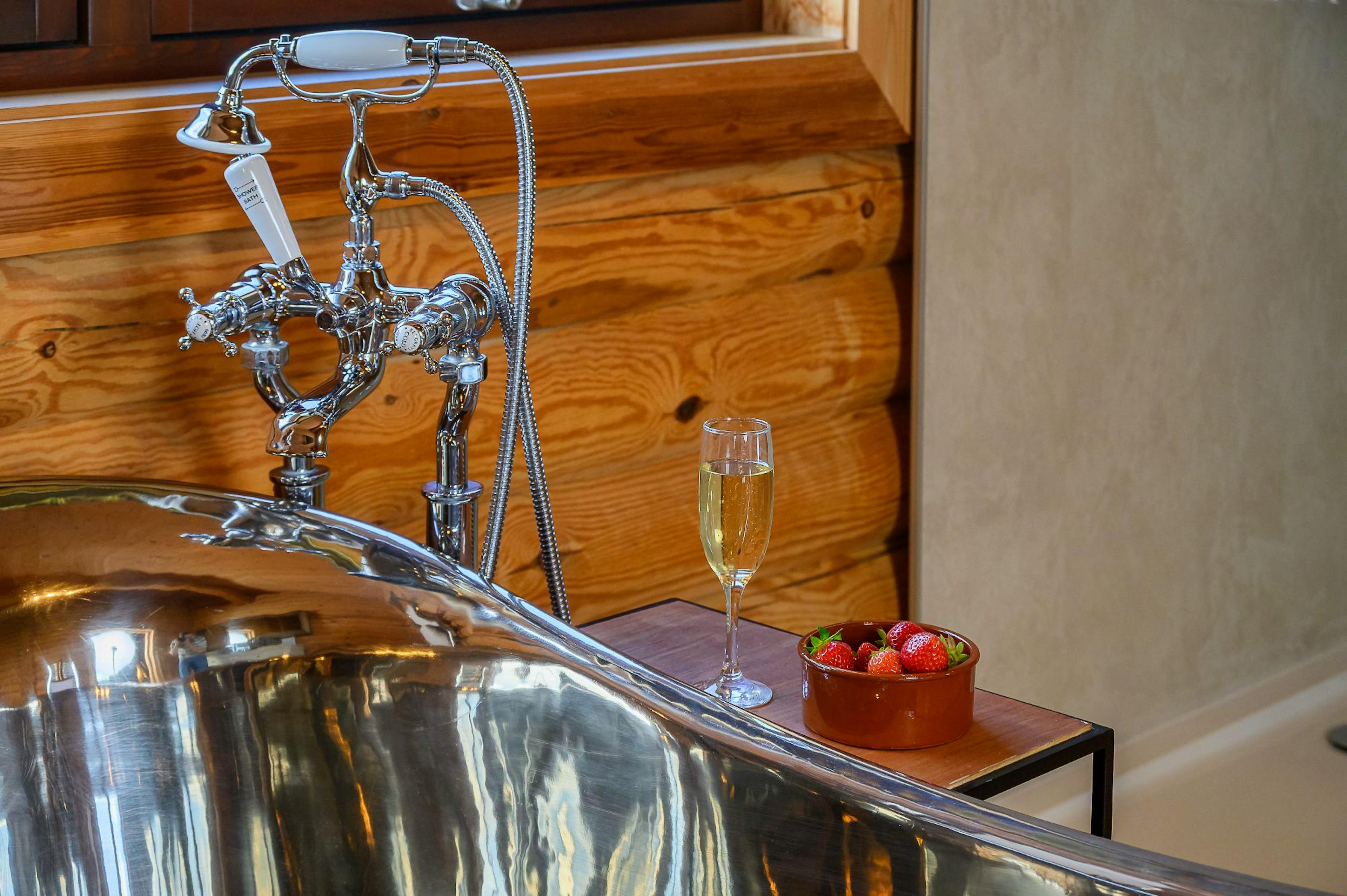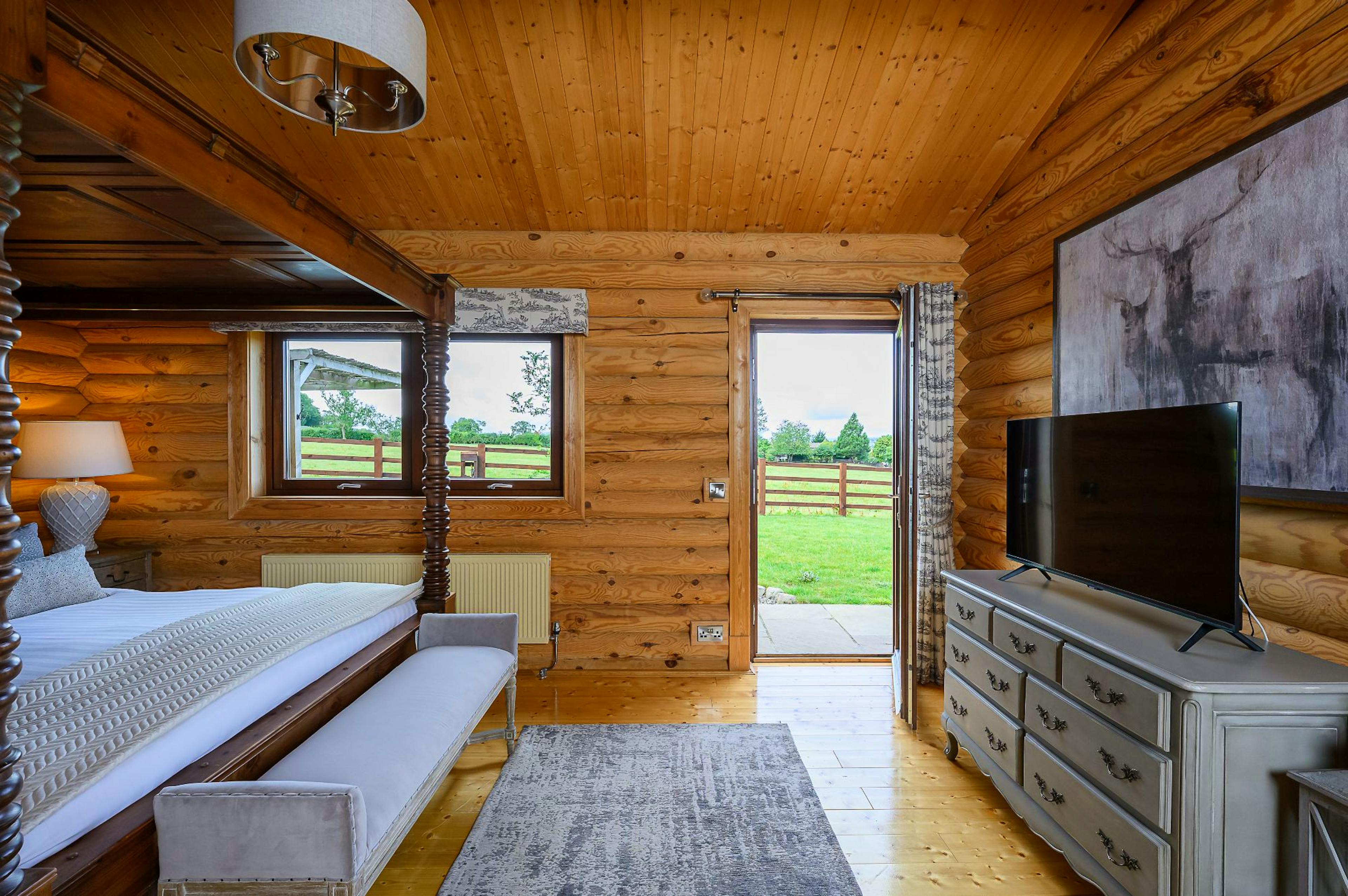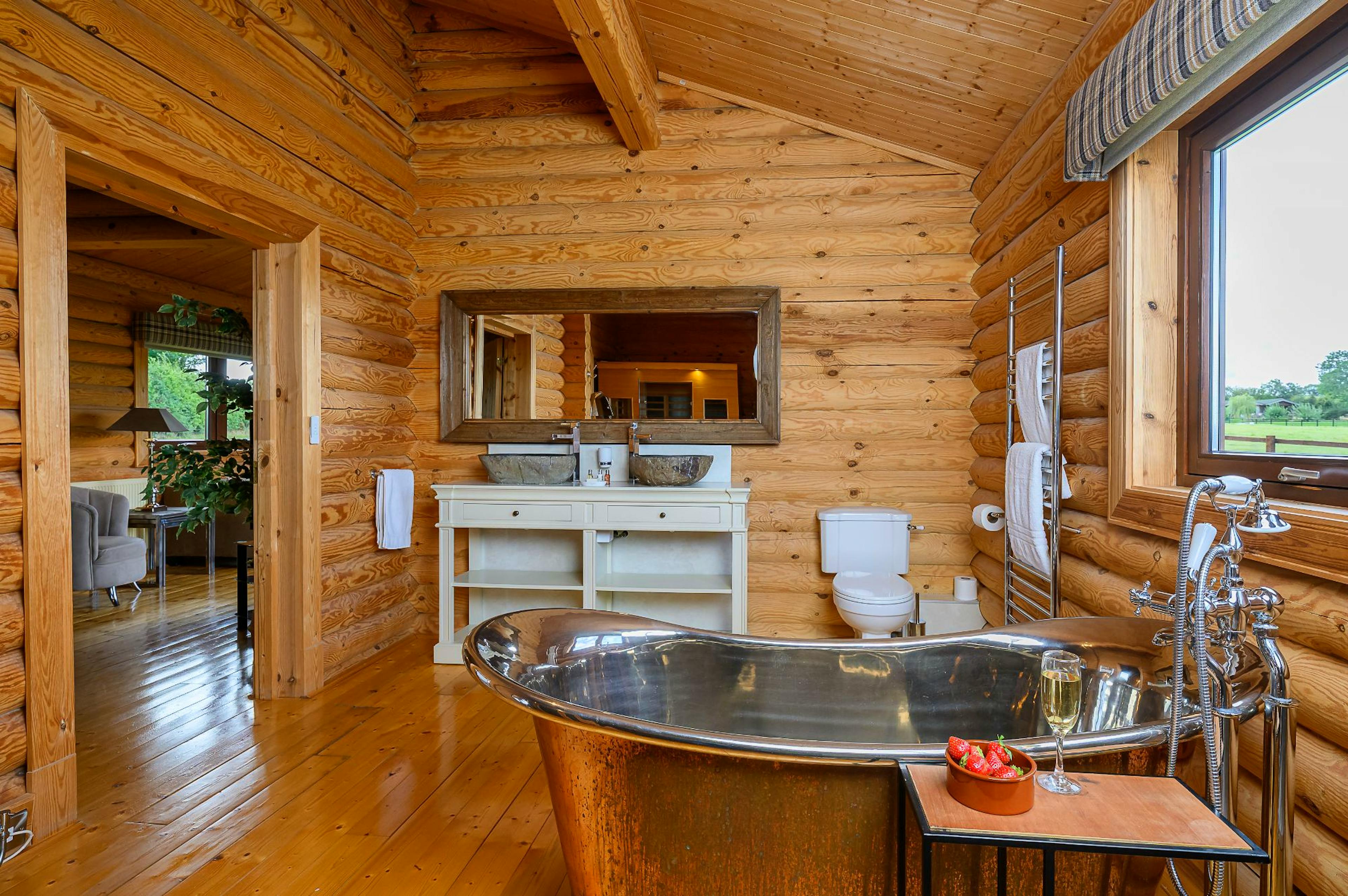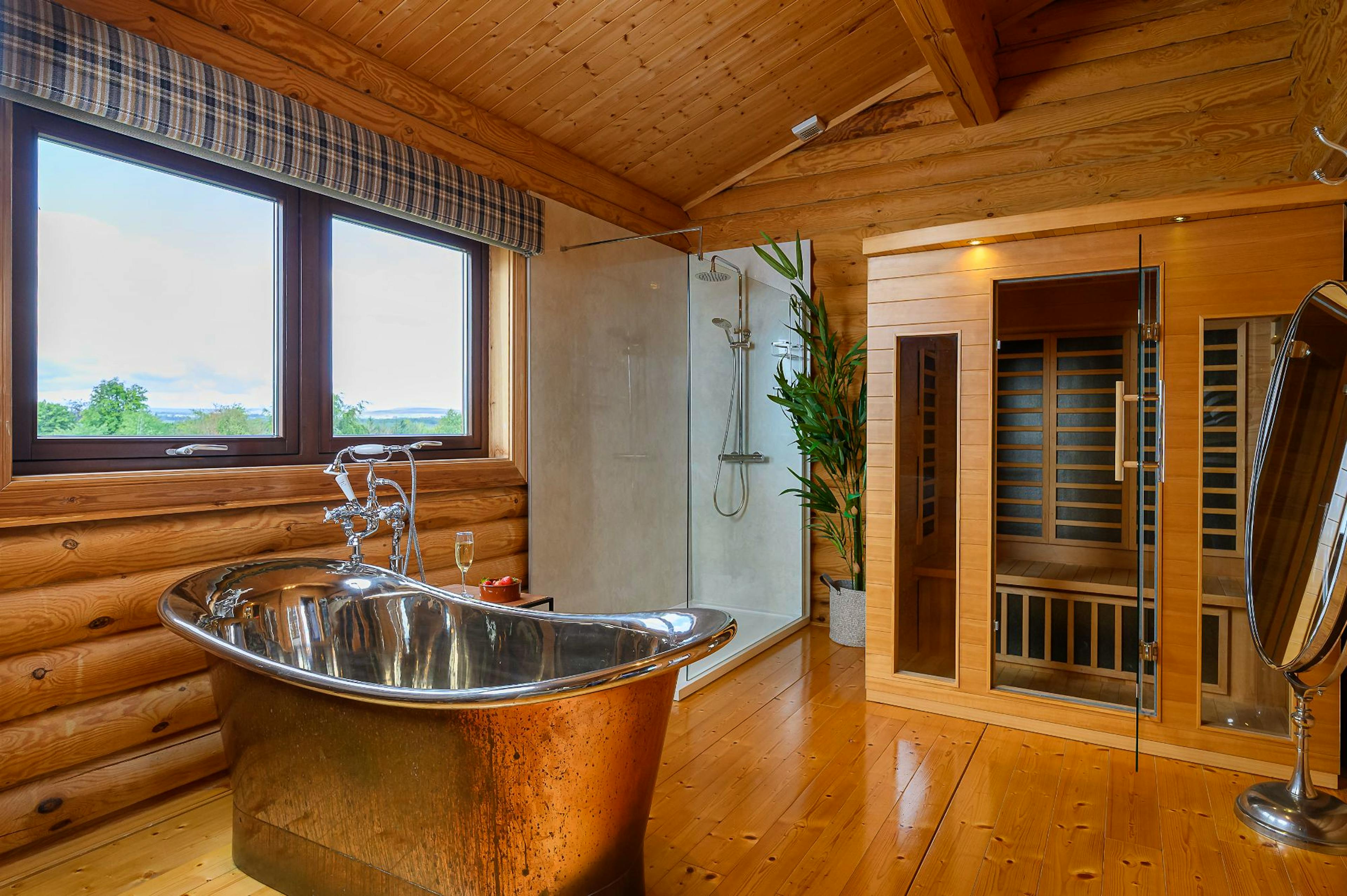 Super-king bedroom with Smart TV and an ensuite bathroom featuring a copper roll-top bath, separate shower and two-person infrared sauna for ultimate relaxation.