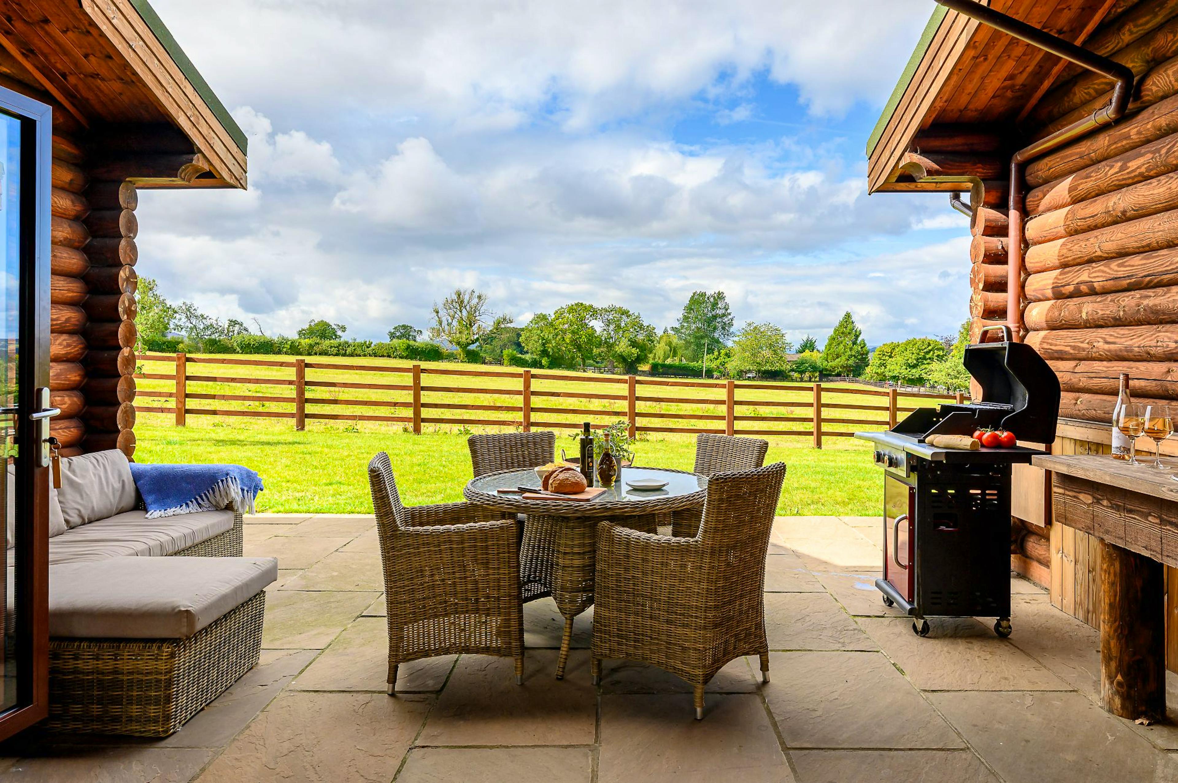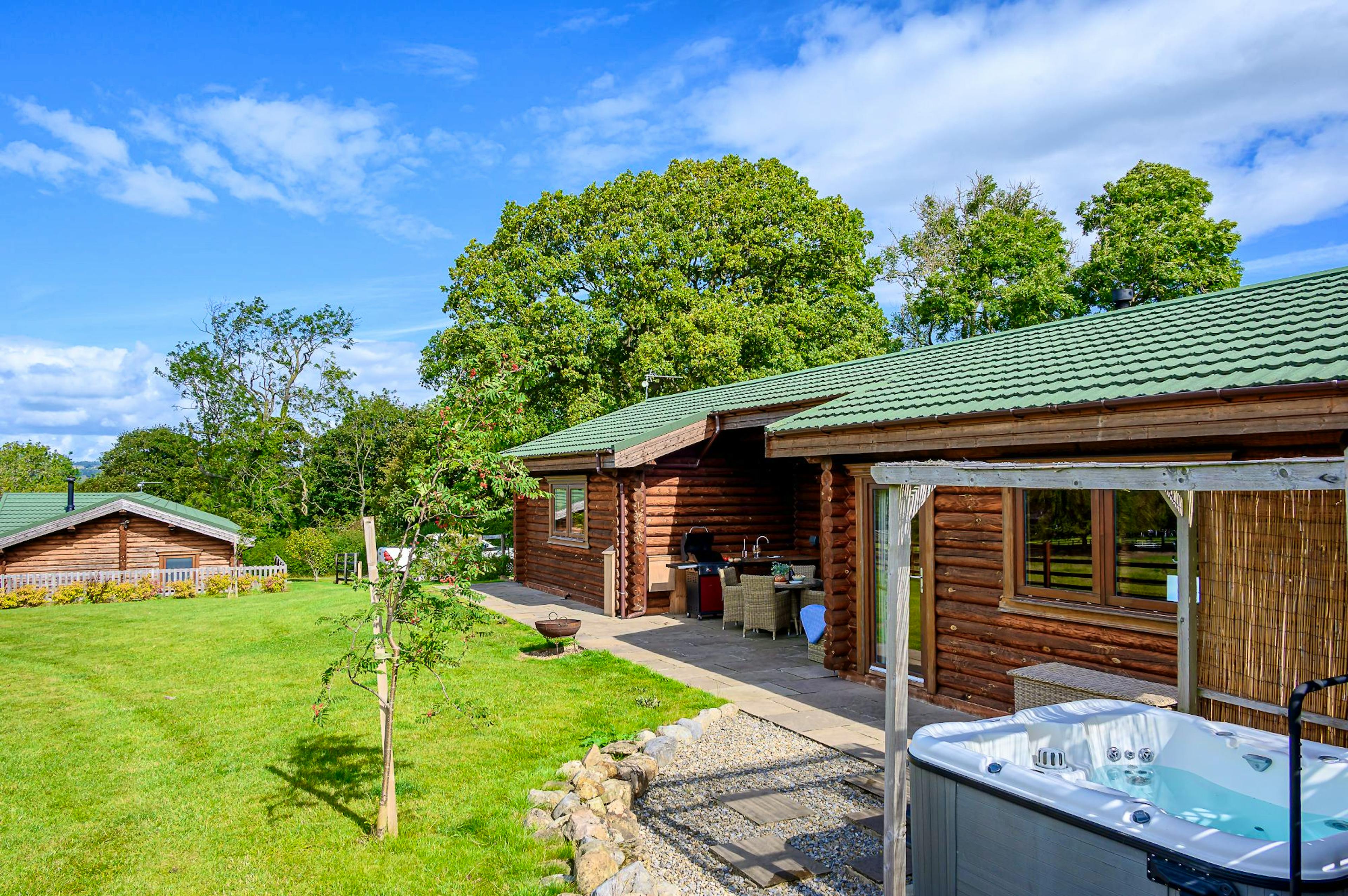 Outdoor amenities including covered hot tub, stone-flagged patio, rattan seating, gas BBQ and private garden ideal for dogs or peaceful al fresco moments.