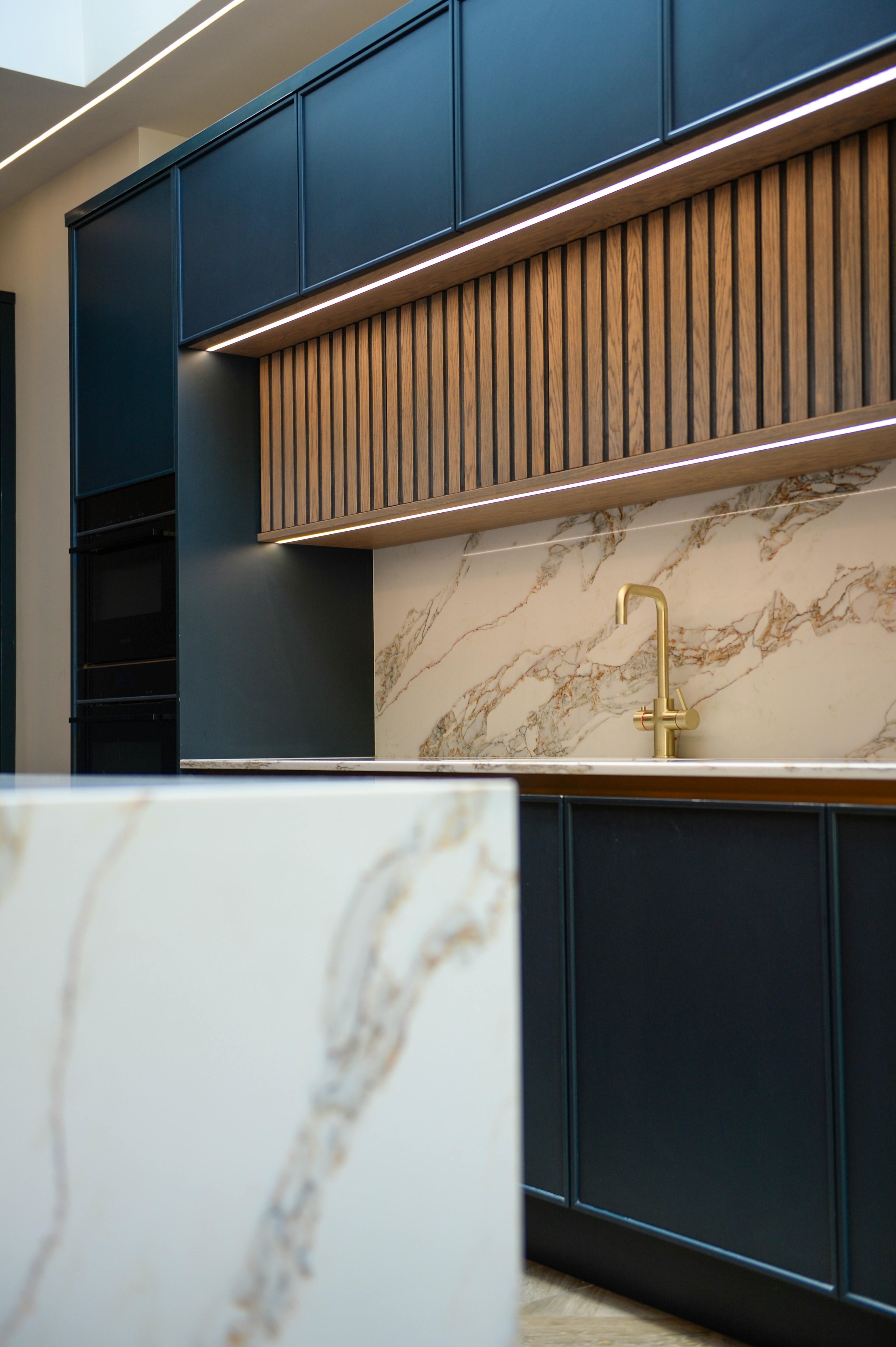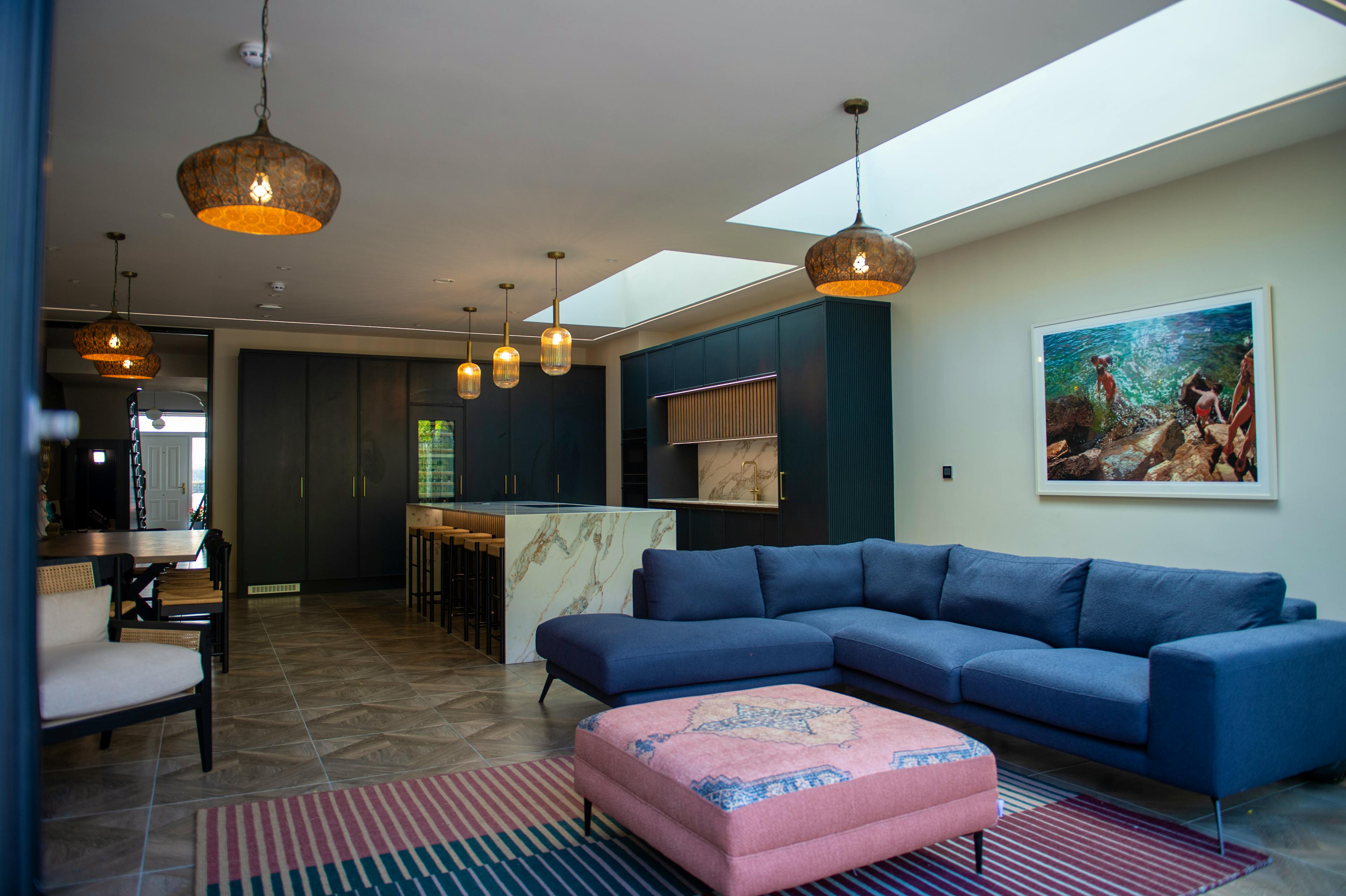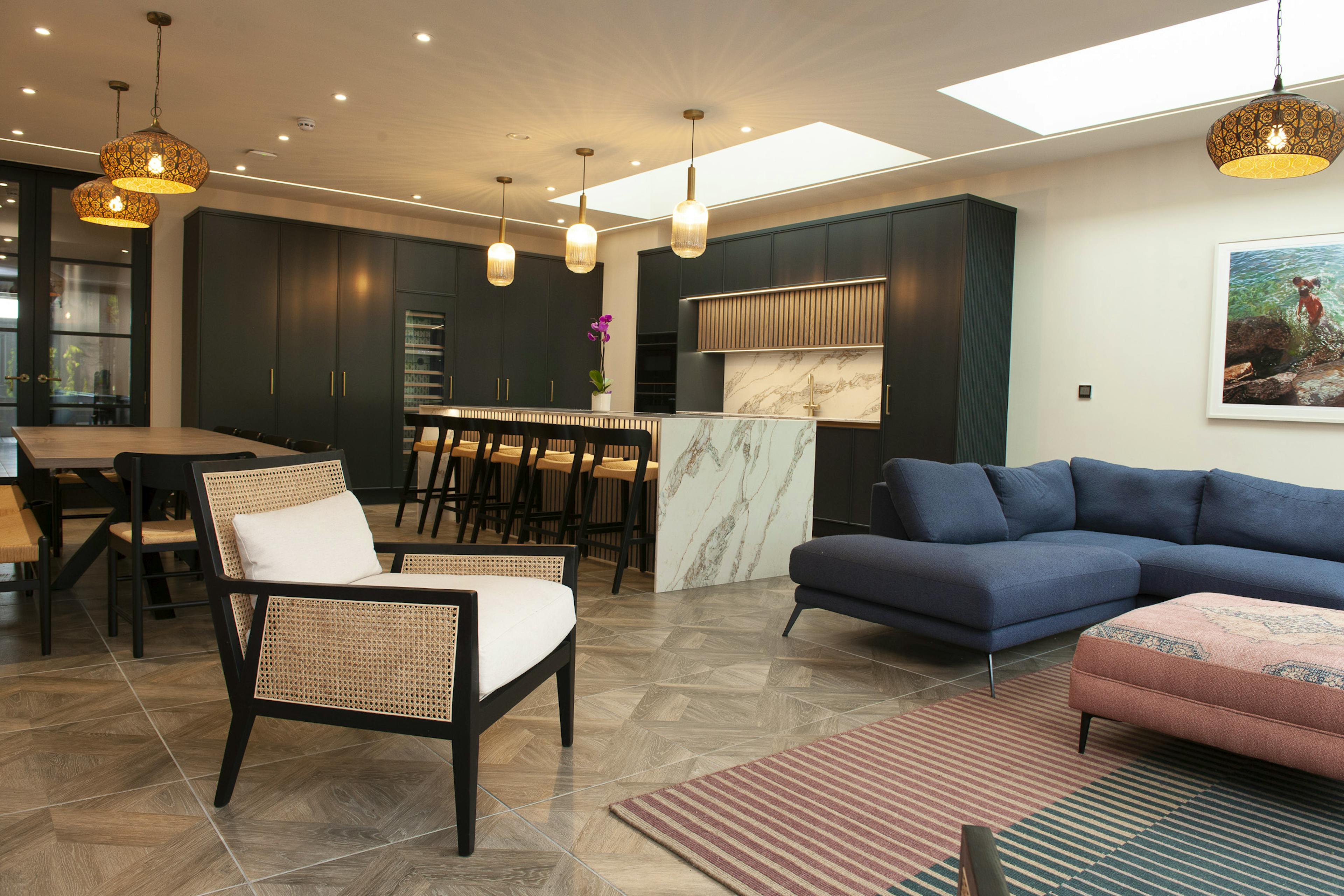The open-plan living area features a sleek kitchen with a large island, a stylish dining table and patio access for alfresco meals.