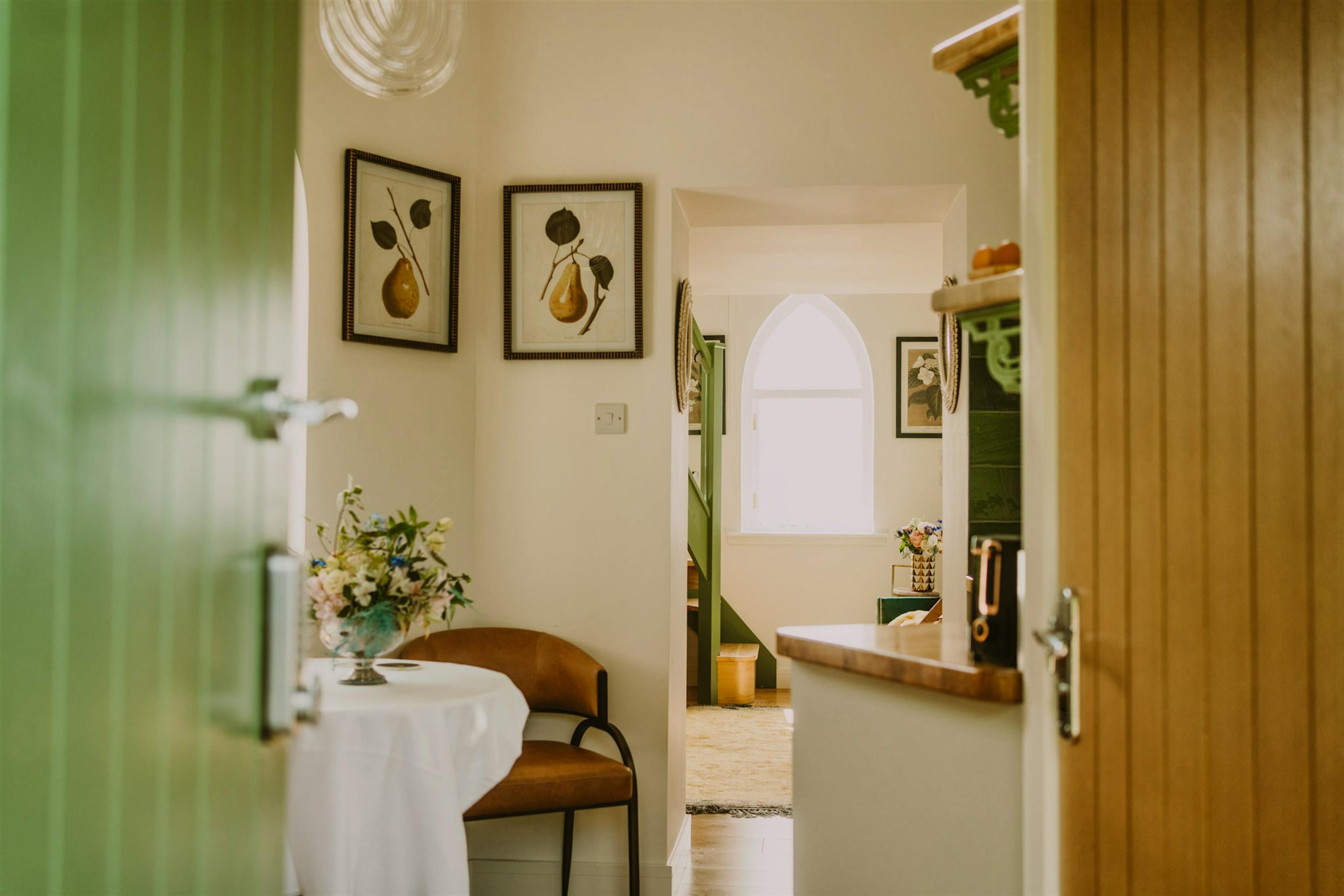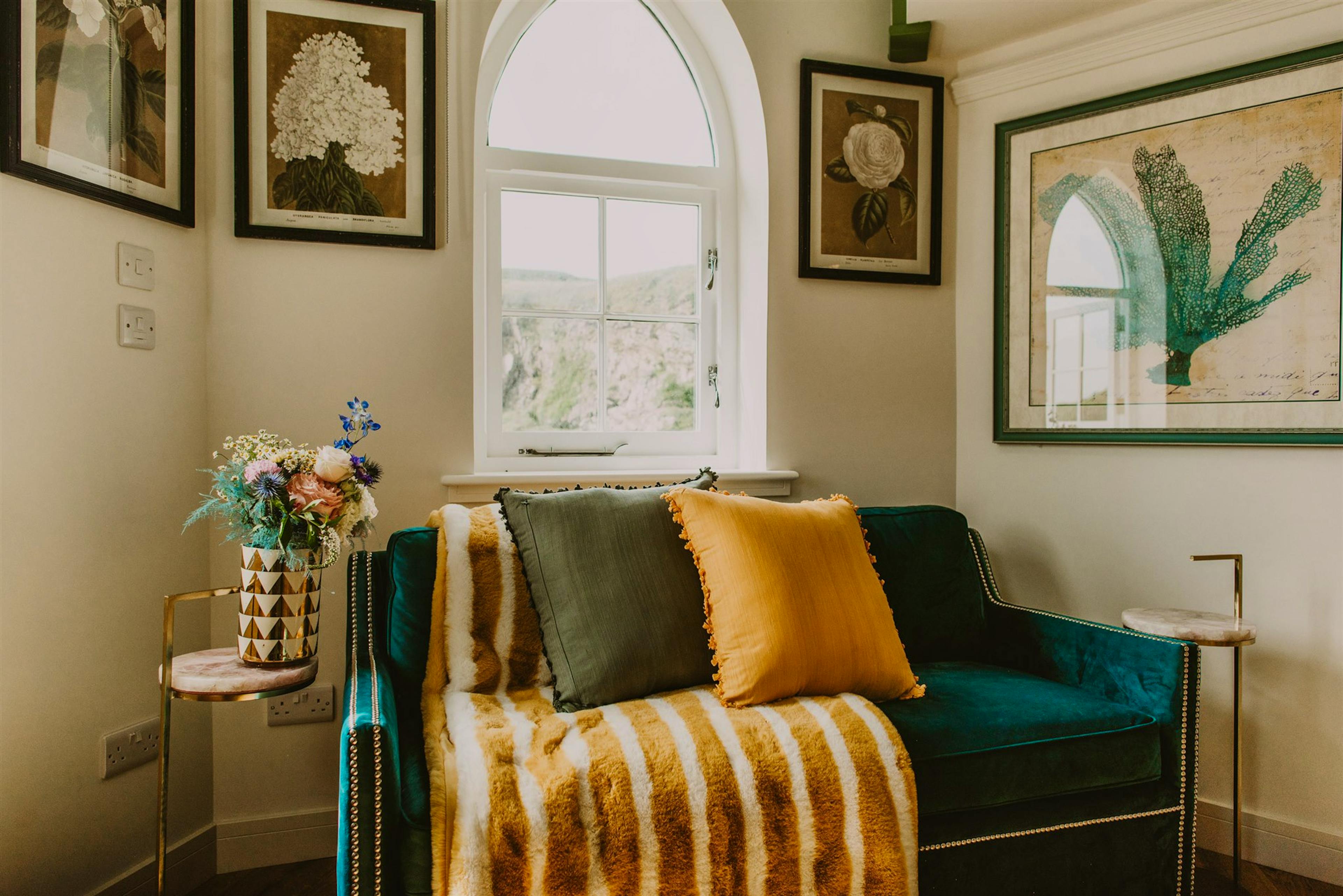 Unique coastal lodge with stunning old-world interiors featuring arched windows, curated artwork and lush textures.