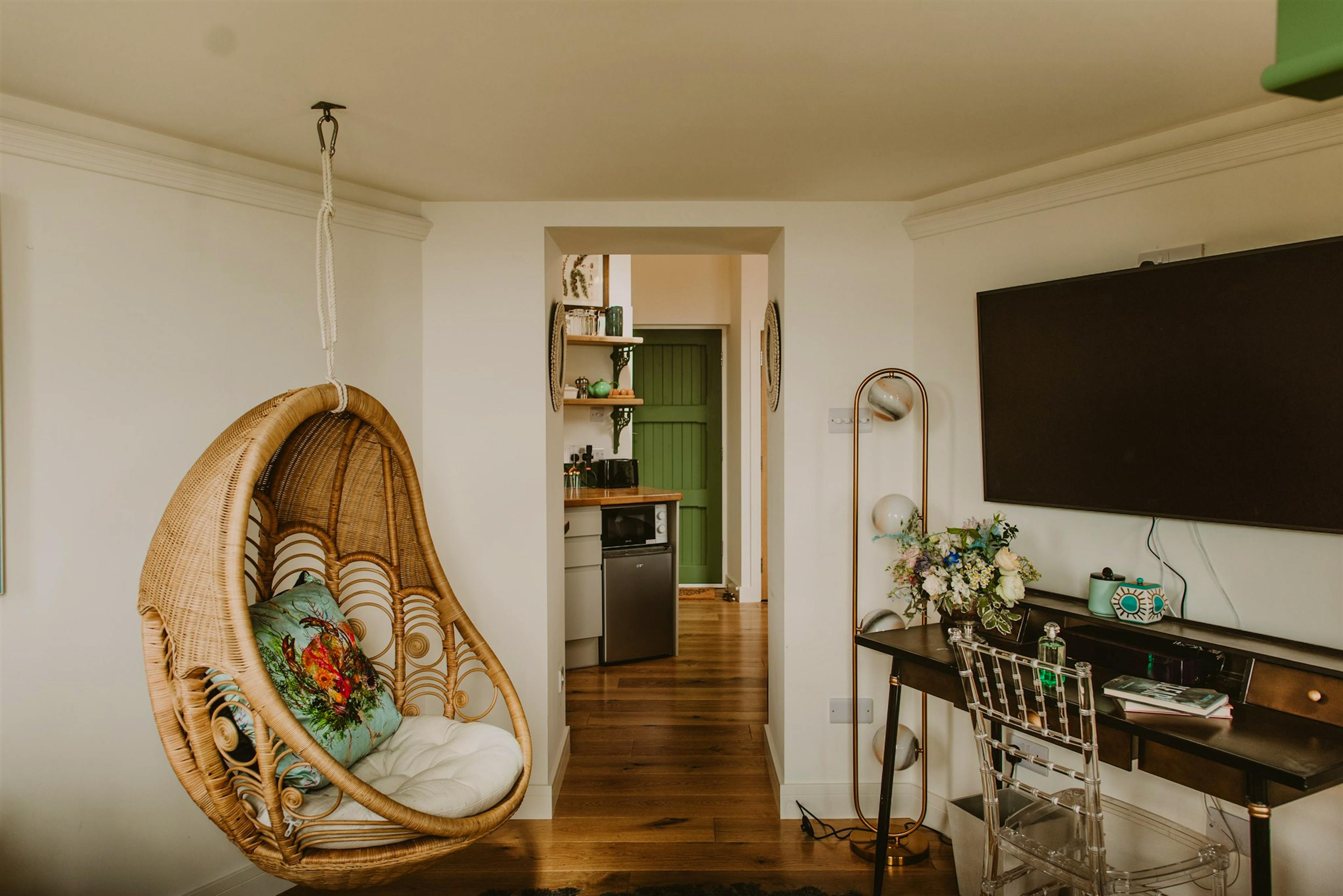 Cosy lounge with a quirky hanging egg chair and wall-mounted TV for movie nights.
