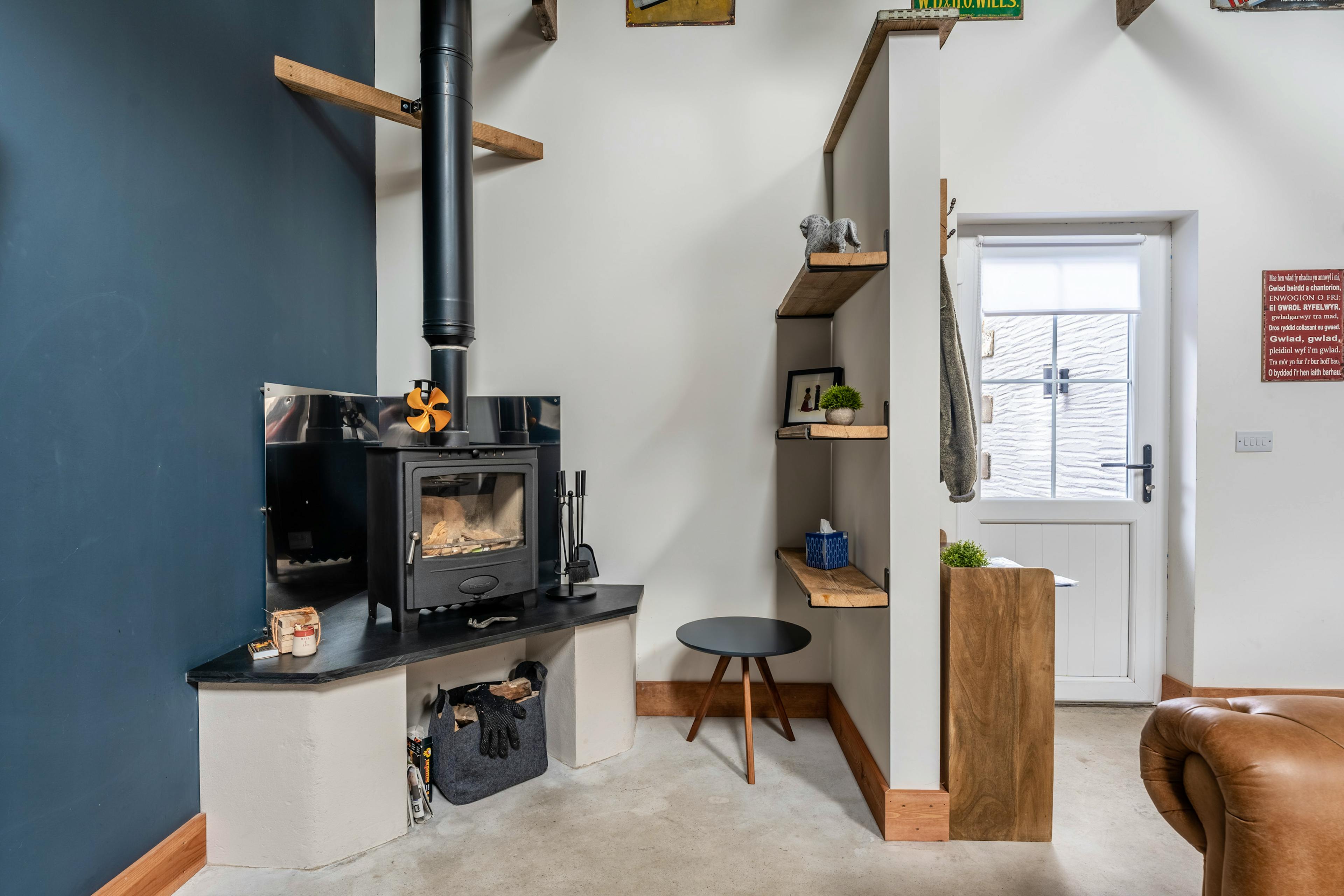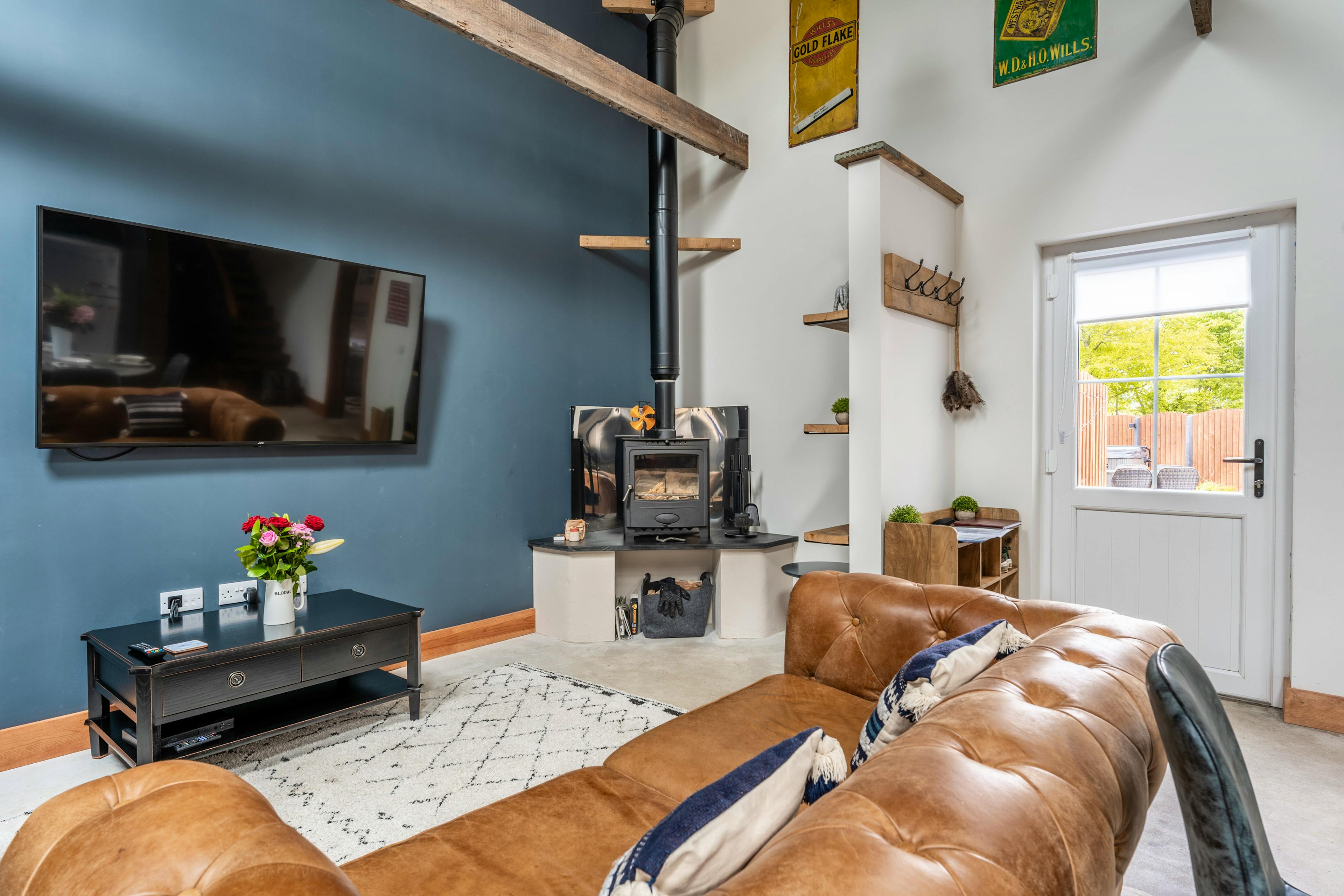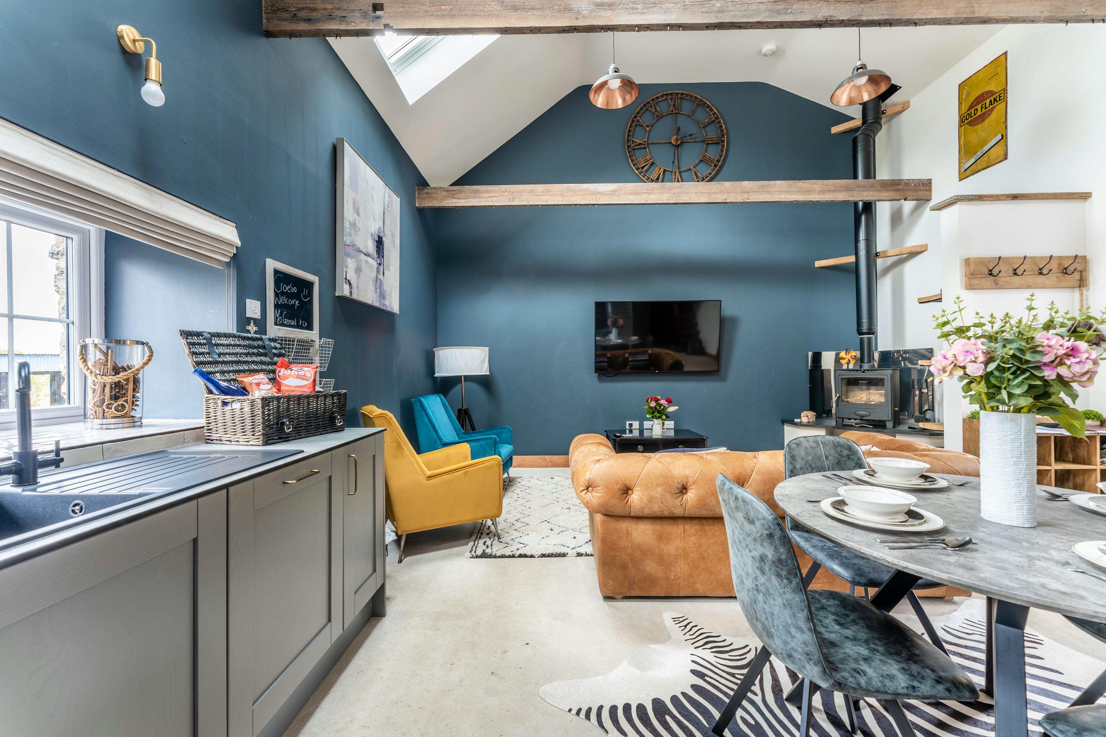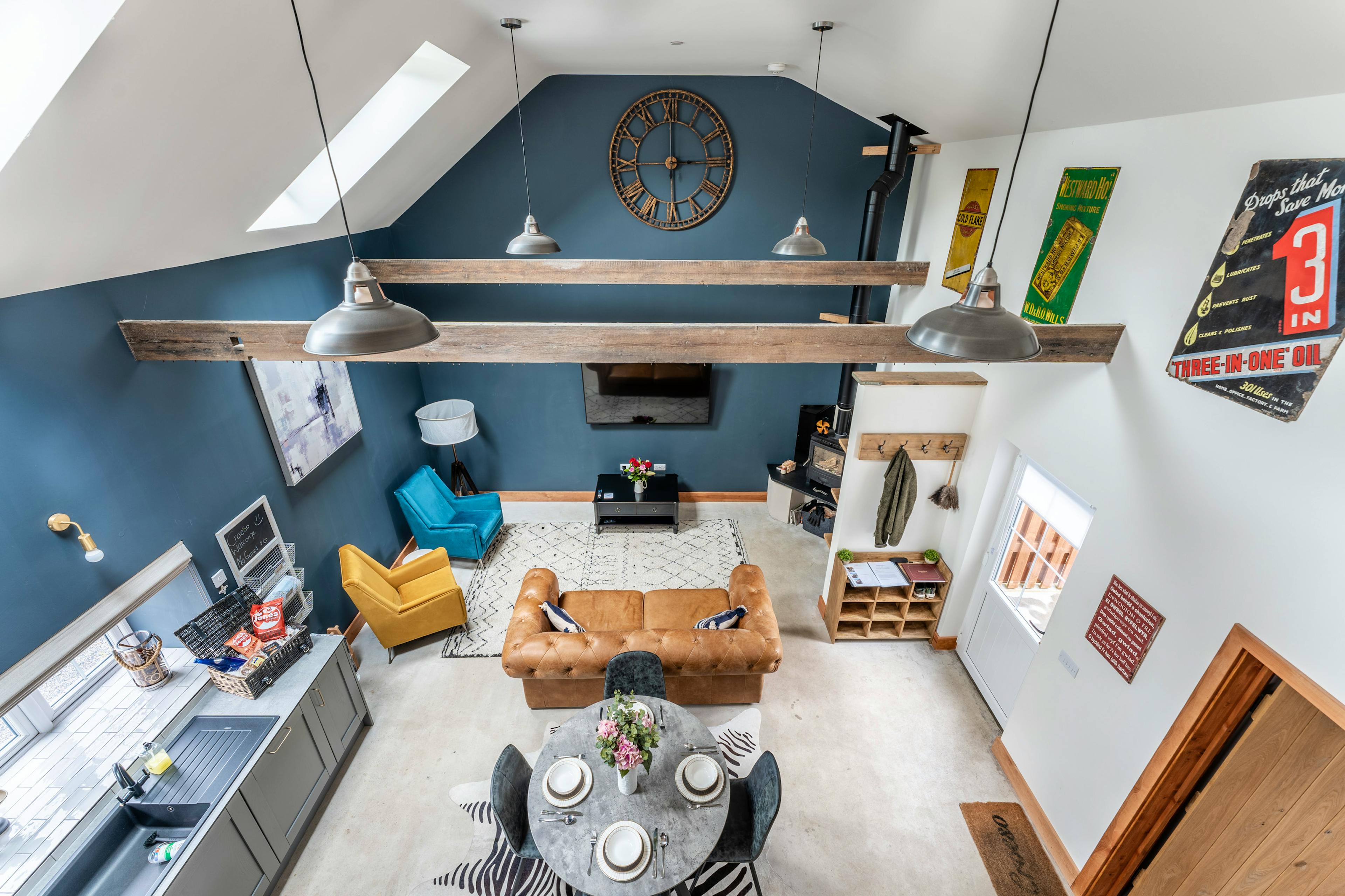 Open-plan living space with log burner, leather seating and full-size SMEG appliances.