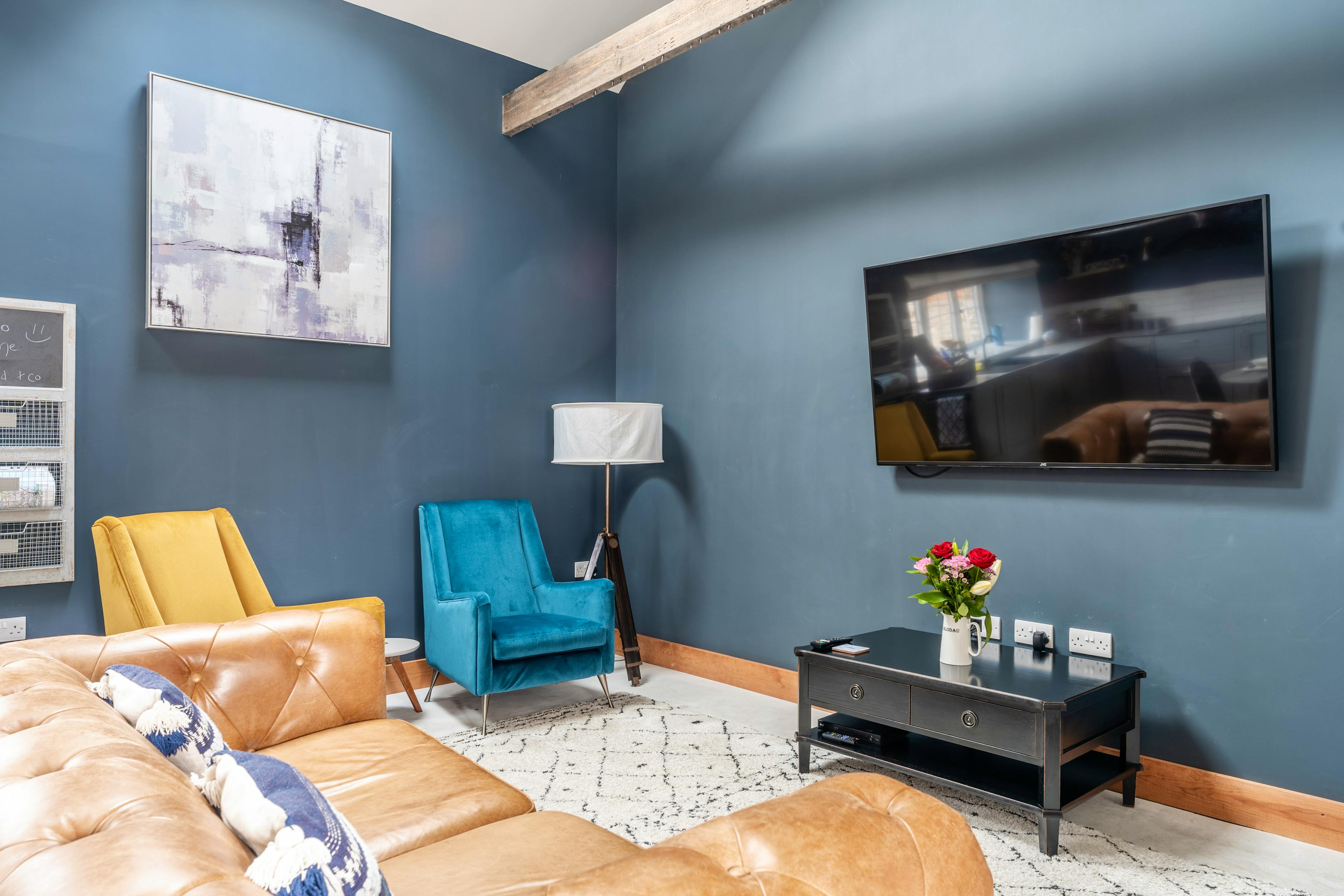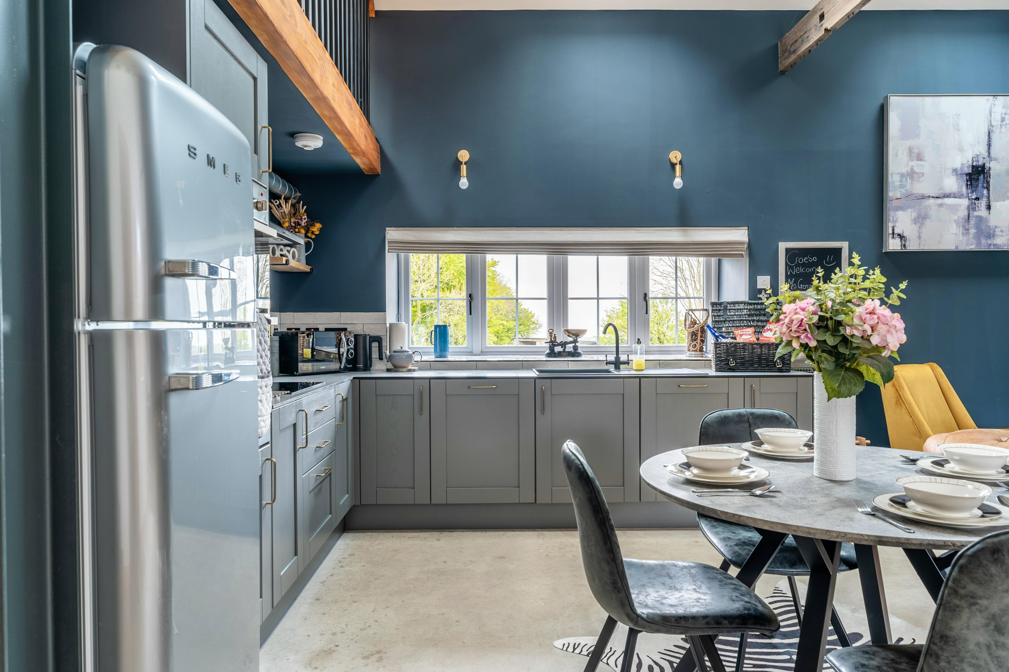 Set on a peaceful working farm just a few miles from the Ceredigion coastline, Sgubor Nantcoy is a stylish barn conversion that blends rustic Welsh charm with contemporary design. With its exposed beams, polished concrete floors and roaring wood burner, this is a beautifully modern retreat that feels warm and welcoming from the moment you arrive. Step outside to your private garden and sink into the bubbling hot tub as you watch the sunset over the distant sea — pure bliss after a day exploring the coast or countryside. Inside, the open-plan living space is both chic and inviting. The lounge features a leather sofa, armchairs and a wall-mounted TV - perfect for cosy evenings in by the fire. The modern kitchen is equipped with high-end appliances including a SMEG fridge and freezer, electric oven, hob, dishwasher and microwave, so you can prepare everything from hearty breakfasts to special dinners. A wooden dining table for four sits at the heart of the room, ideal for family meals or romantic suppers. The serene bedroom is a restful haven with a king size bed, soft lighting and views across the fields. The sleek bathroom adds a touch of luxury with a freestanding roll-top bath and a separate shower. Upstairs, a mezzanine snug offers a quiet space to unwind, with a leather sofa and skylight views stretching across the farm towards the sea. Outside, the private garden is fully enclosed - ideal for pets and safe play - with a paved terrace, outdoor dining area and, of course, your own hot tub. You’ll also find thoughtful touches throughout, from dog towels and shampoo to local guidebooks and maps. The location couldn’t be better for discovering Ceredigion’s highlights. The colourful harbour towns of Aberaeron and New Quay are just a short drive away, offering great restaurants, cafés, and boat trips to spot dolphins and seals. For those seeking adventure, the Cambrian Mountains beckon with breathtaking trails for walking, cycling, and birdwatching. After a day out, return to your peaceful barn, pour a glass of wine, and watch the stars come out over the Welsh hills.