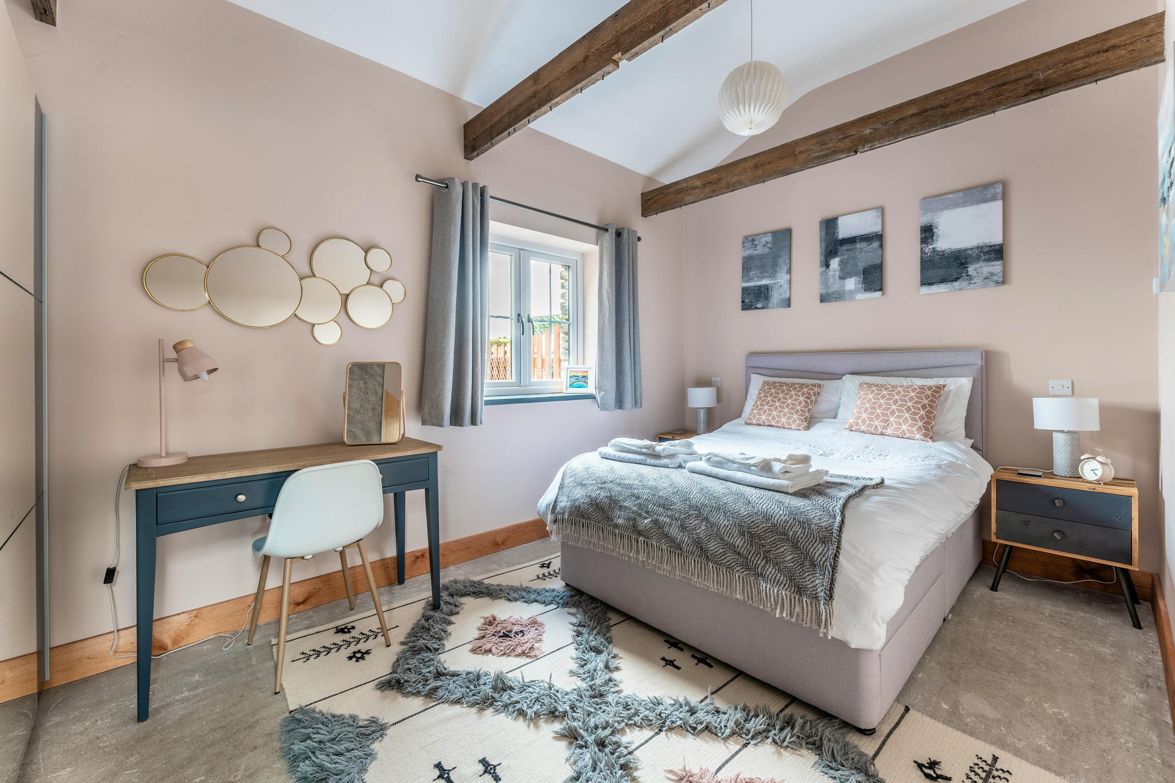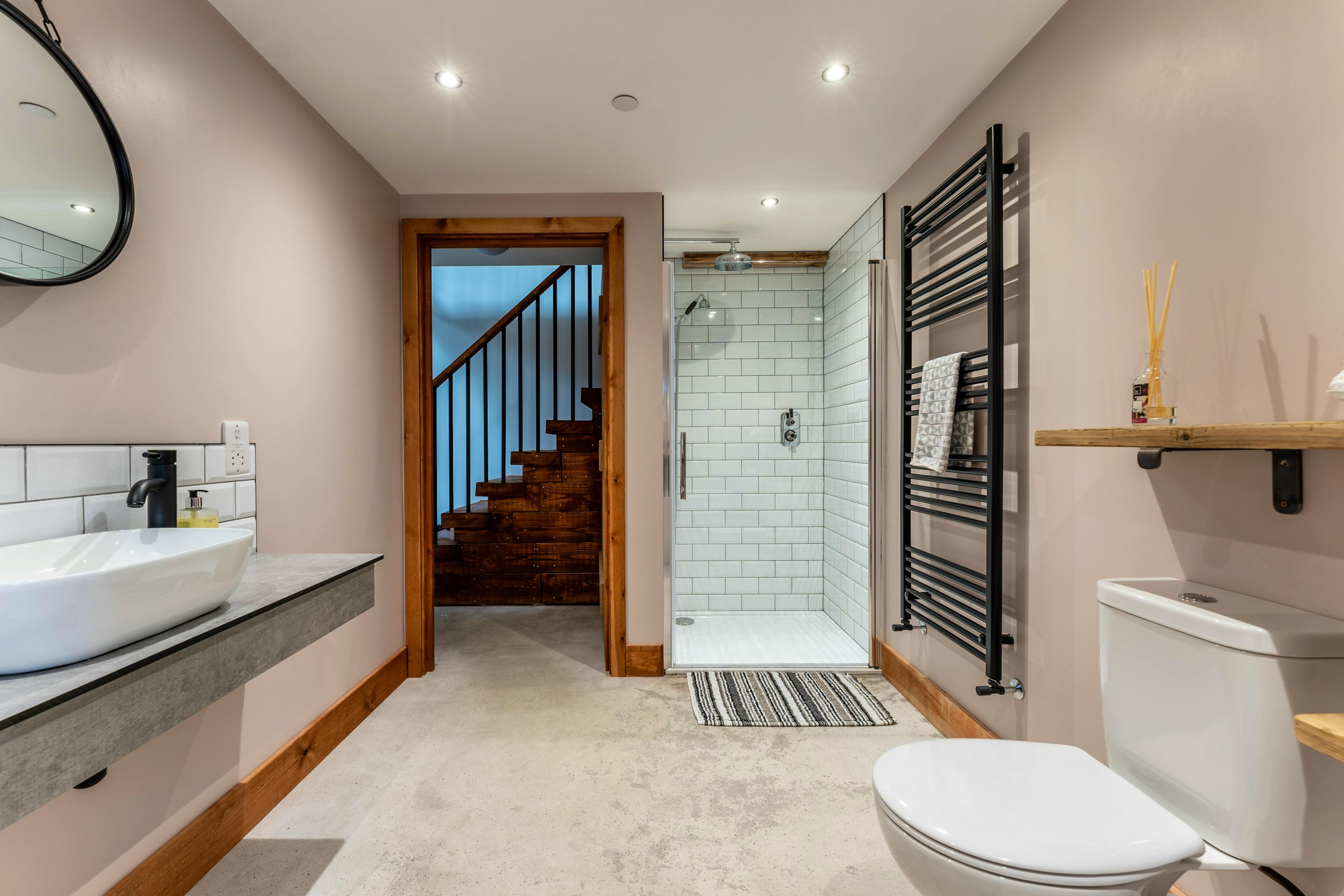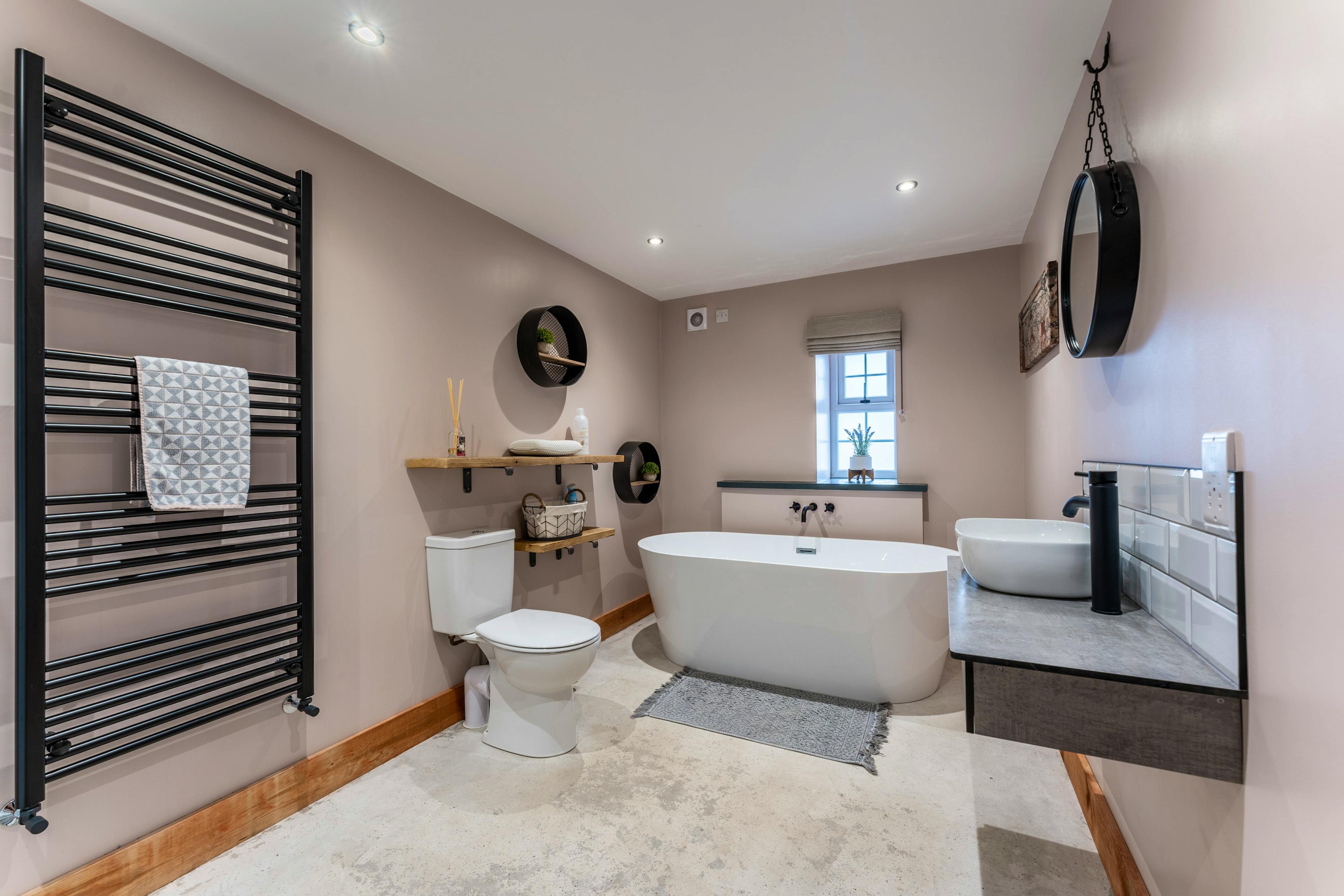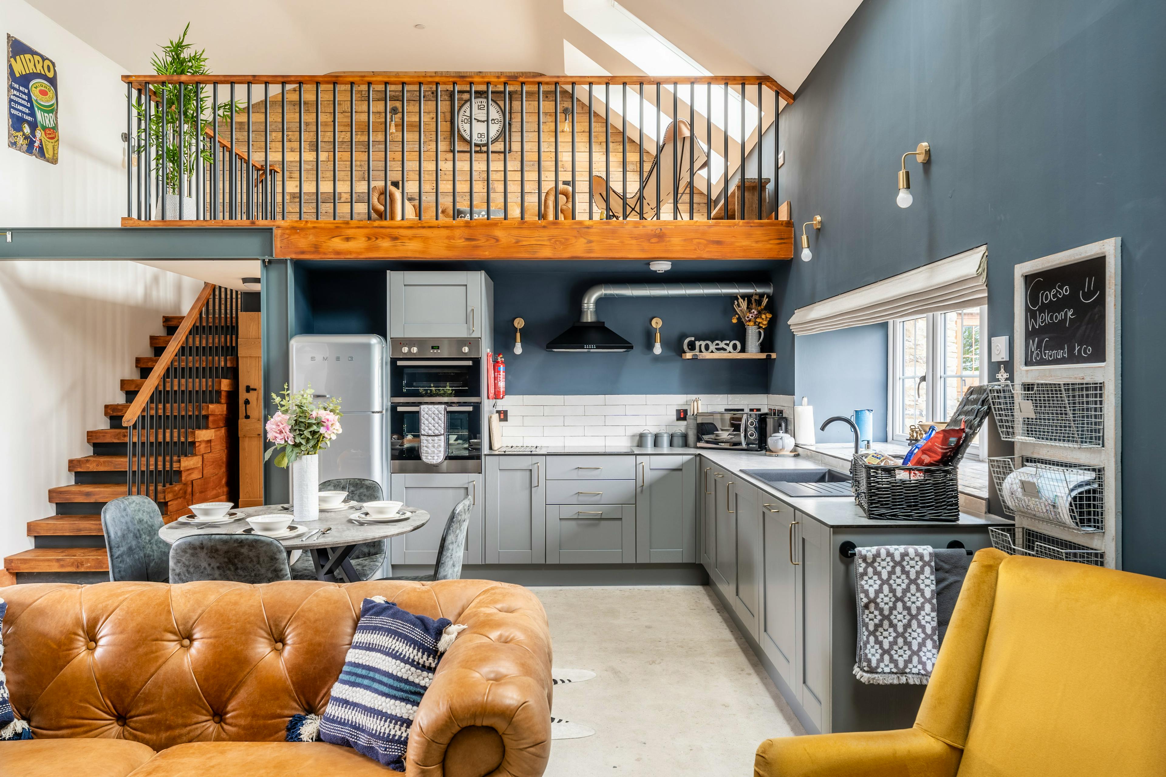 Stylish modern barn conversion combining rustic charm with polished concrete floors and designer touches.