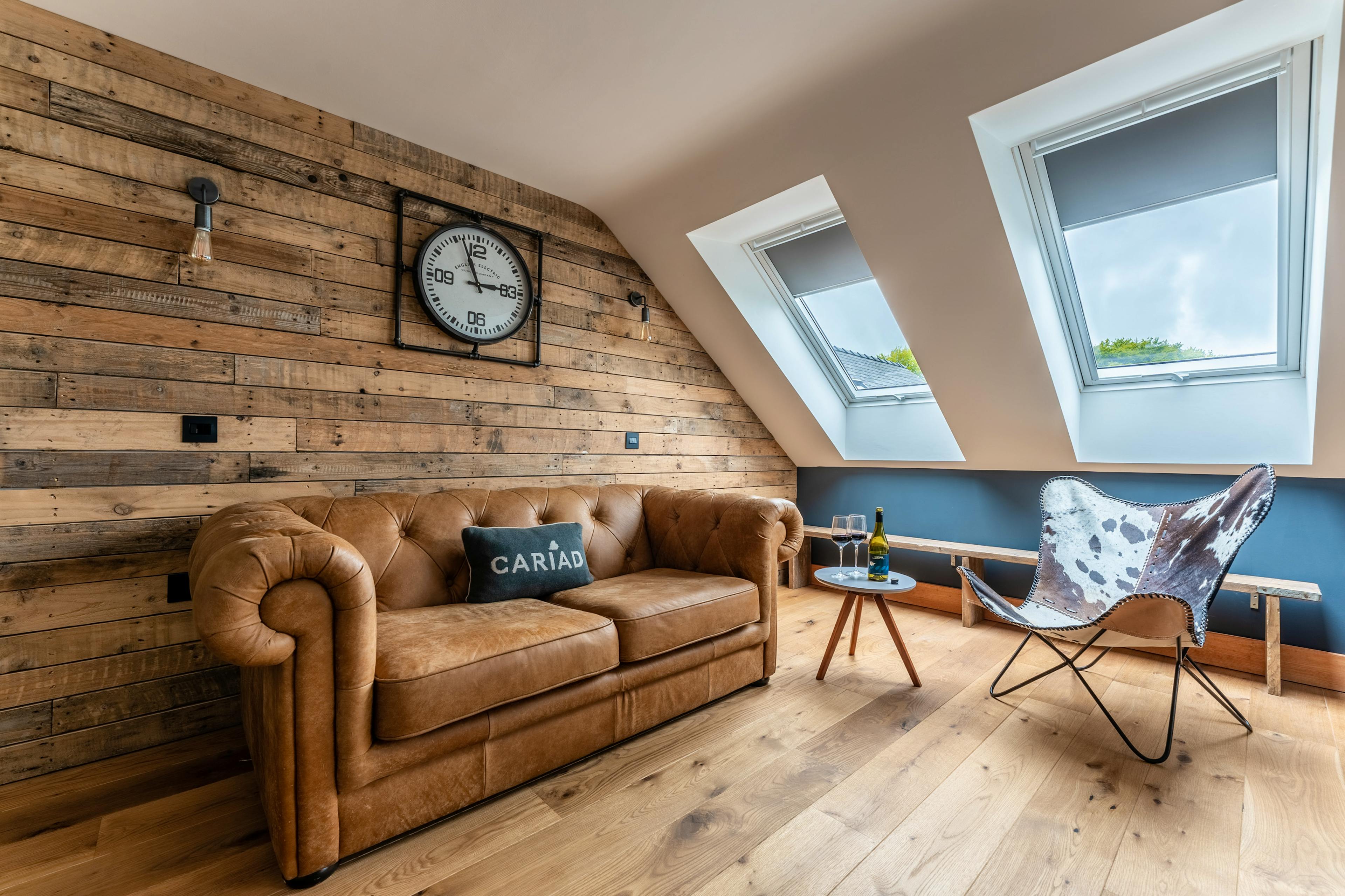 Mezzanine snug with skylight views across the countryside and distant sea.