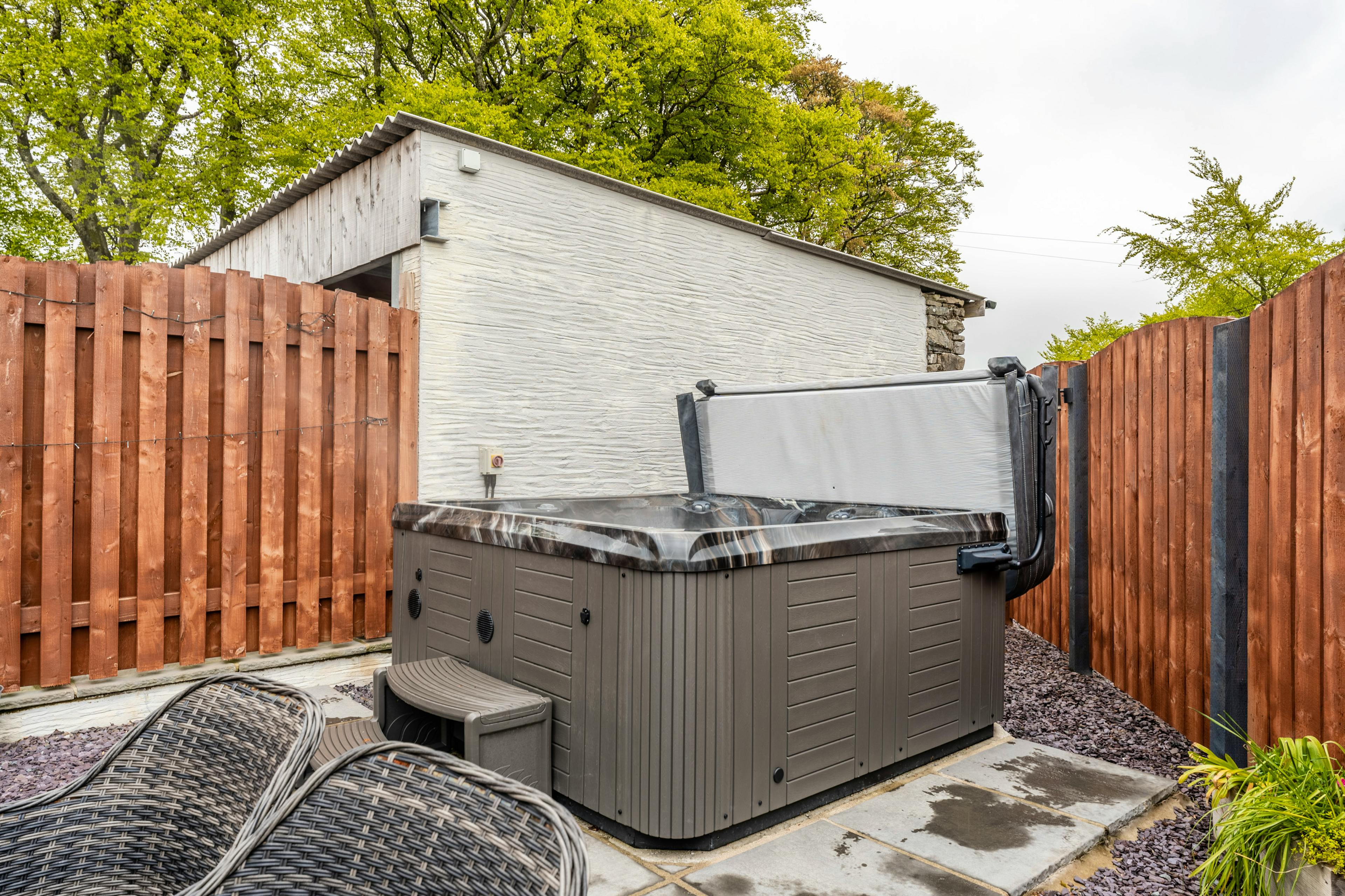 Private enclosed garden with bubbling hot tub and outdoor dining area for relaxing evenings.