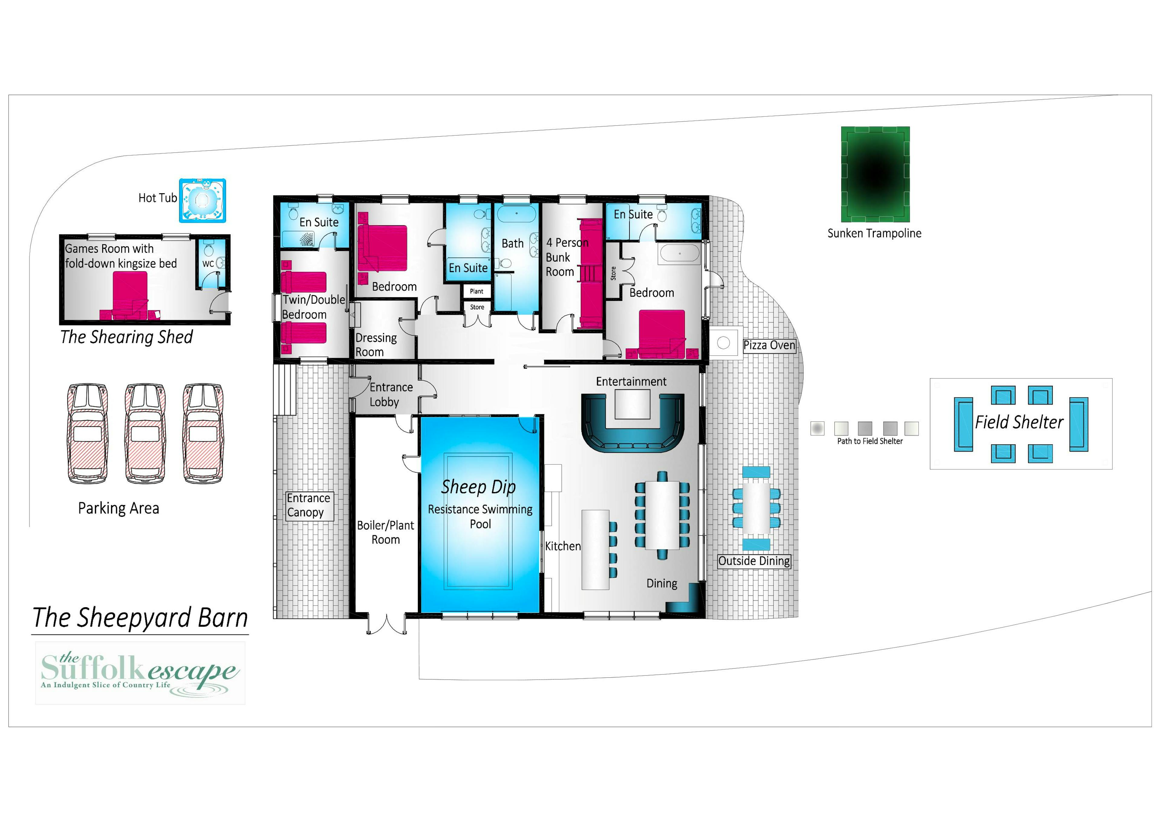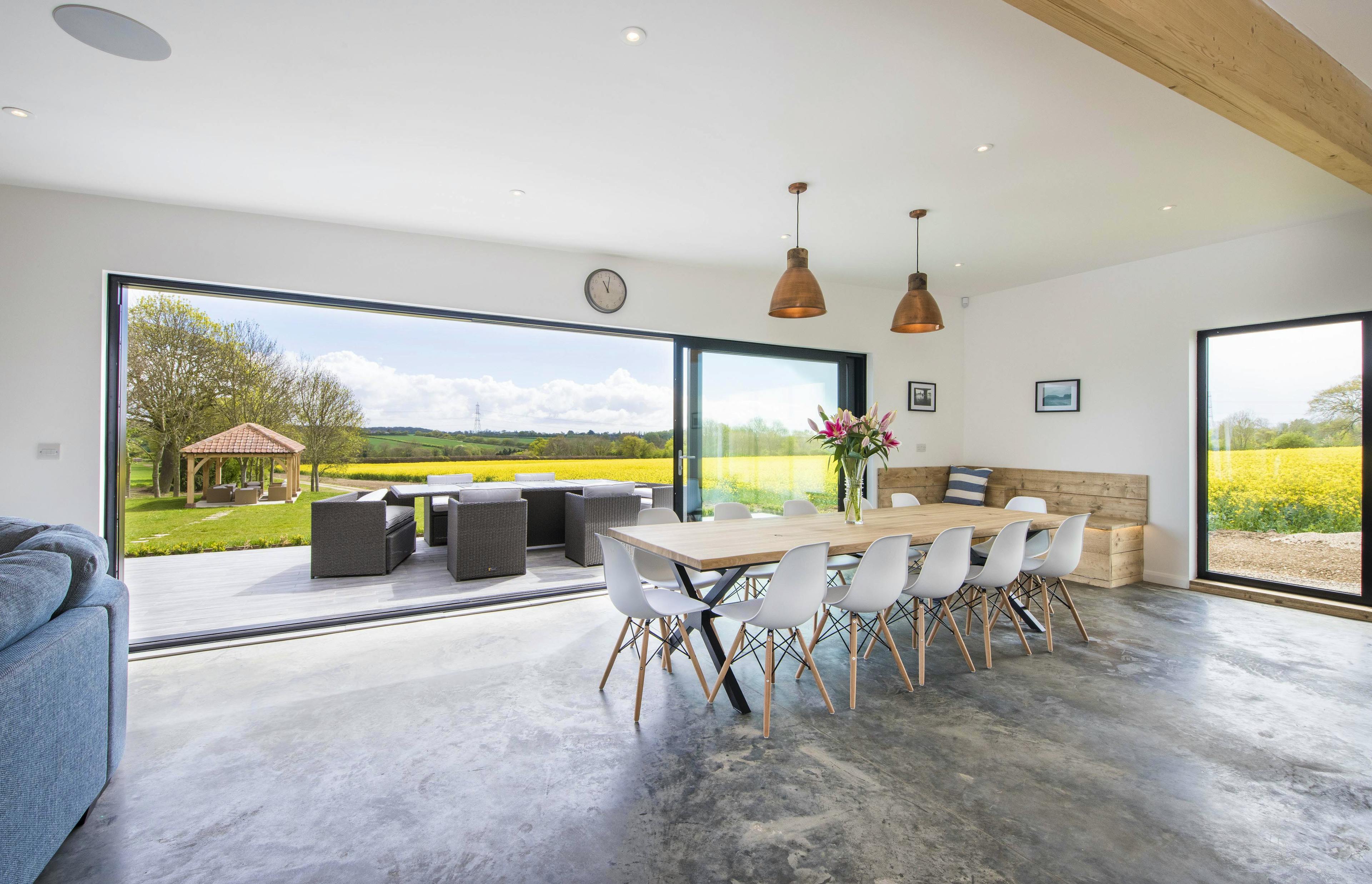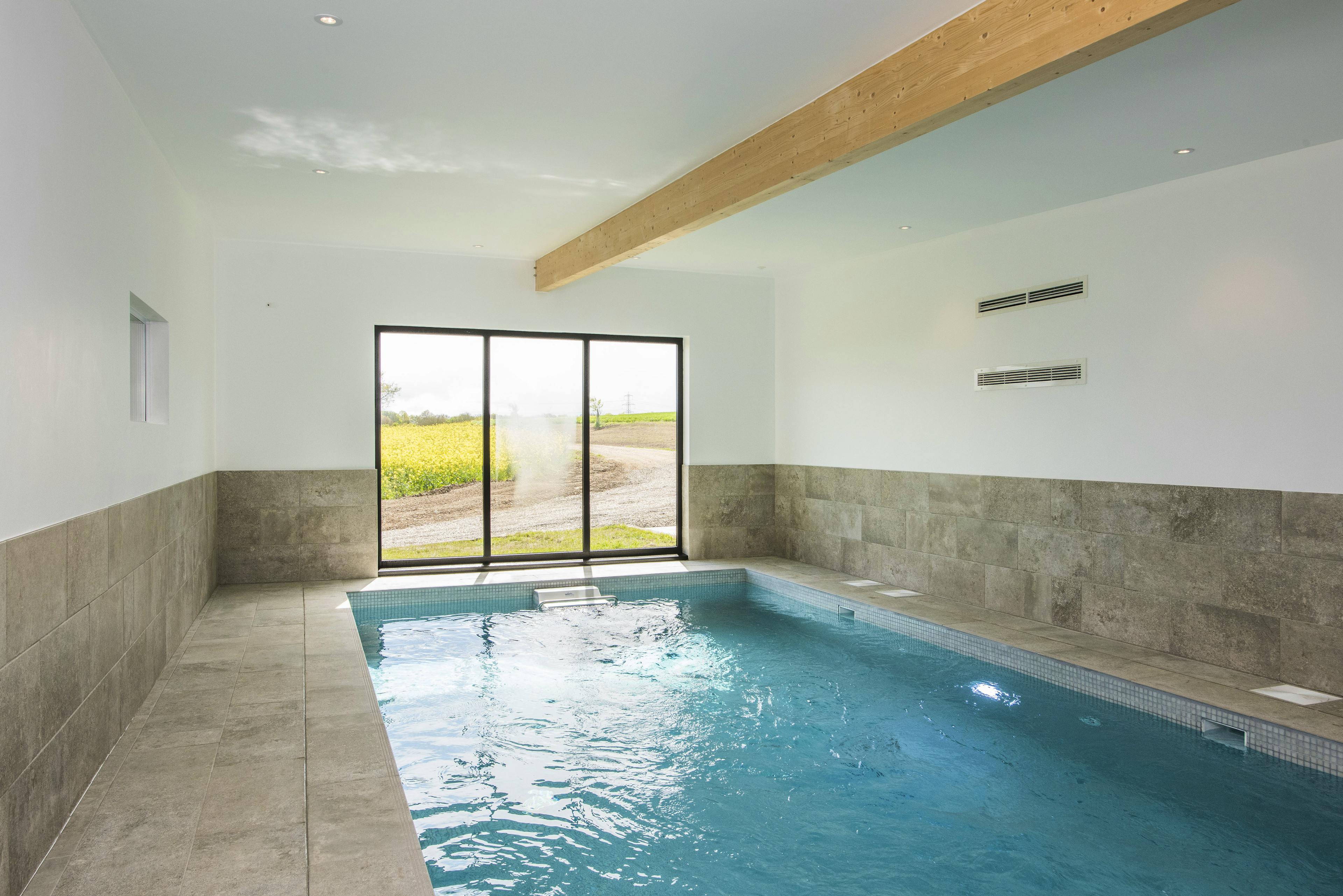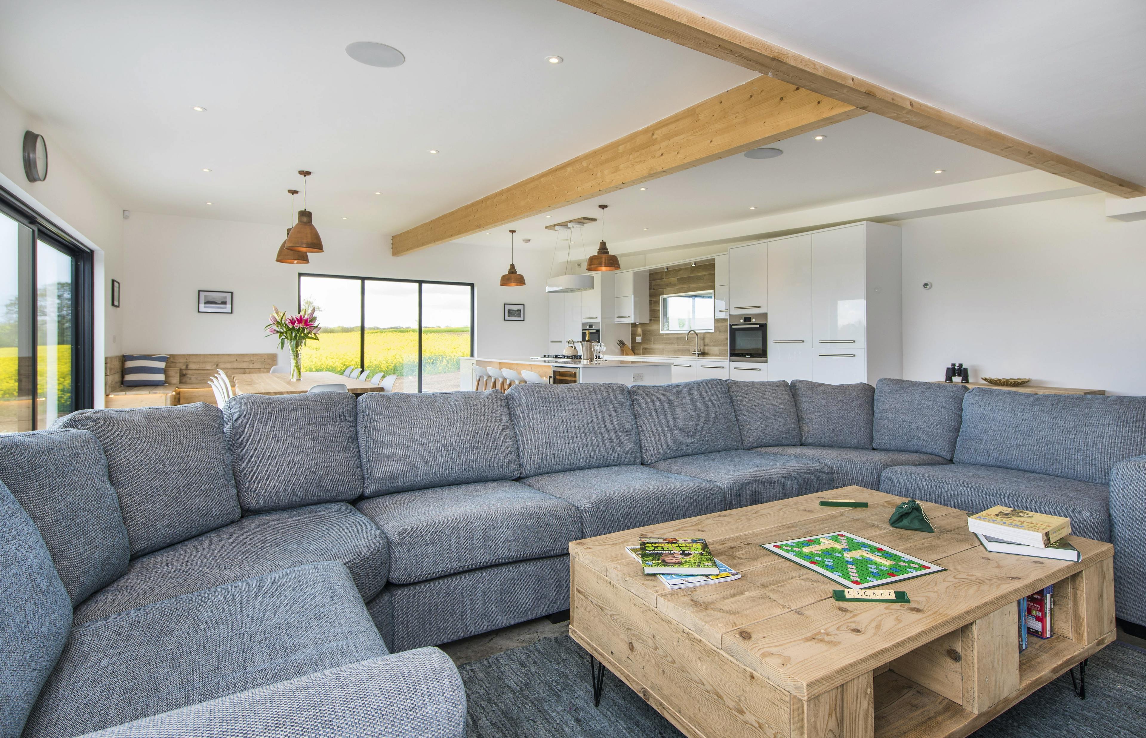 This spectacular barn is situated in a peaceful, rural location, one mile off the road and is surrounded by luscious fields and woodlands under the expansive blue Suffolk sky. Sheepyard Barn is a luxurious modern sanctuary, the perfect place to unwind, relax and spend precious moments with friends and family. There is something for everyone to enjoy, the kids will love the 'Sheep Dip' swimming pool, which even has a Fastlane counter-current machine. It is situated at the heart of the home and is accessible from the lounge, but adults can keep an eye on the fun through handy windows in the kitchen and hallway. The games room will also prove popular giving the young ones space to game, watch and chill while the grown-ups can enjoy late-night drinks in the hot tub and leisurely outdoor dinners. Foodies won't be able to keep out of the stylish kitchen, surrounded by expansive windows showing off the beautiful countryside which encompasses the property. Fellow guests can enjoy canapés at the kitchen counter before the party moves to the large dining table, beautifully lit with pendant lamps, for supper catching up and making memories. Cosy chats can be continued on the huge sofa which occupies the living area of this wonderful space. Again, chic and modern, the hues are grey and off-whites, giving a spacious contemporary atmosphere. Alternatively, simplify the suppers and cook homemade pizzas in the wood fired pizza oven before finishing the party in the hot tub under the expansive skies, spotting constellations while sipping bubbly. Bedrooms are lush, peaceful and beautiful, tastefully decorated in bright whites while beds have deep, comfy mattresses dressed in quality linens. And that view is never far away, as the large windows stretch around the quality offering natural light and views in all of the rooms. There are two super king doubles, a twin and a bespoke bunk room, which has been designed for all ages with high ceilings, double beds and phone charging shelves. The bathrooms all have huge walk-in showers and there are two Corian baths. The barn has been renovated to such a high standard that guests would be forgiven for not budging an inch from this lovely spot but those wishing to explore the wider area will not be disappointed. There are circular walks from the door of the barn and Suffolk is a hidden treasure with lovely sandy beaches, quaint villages and market towns and lots of cosy pubs for Sunday roasts with the family or romantic evenings out.