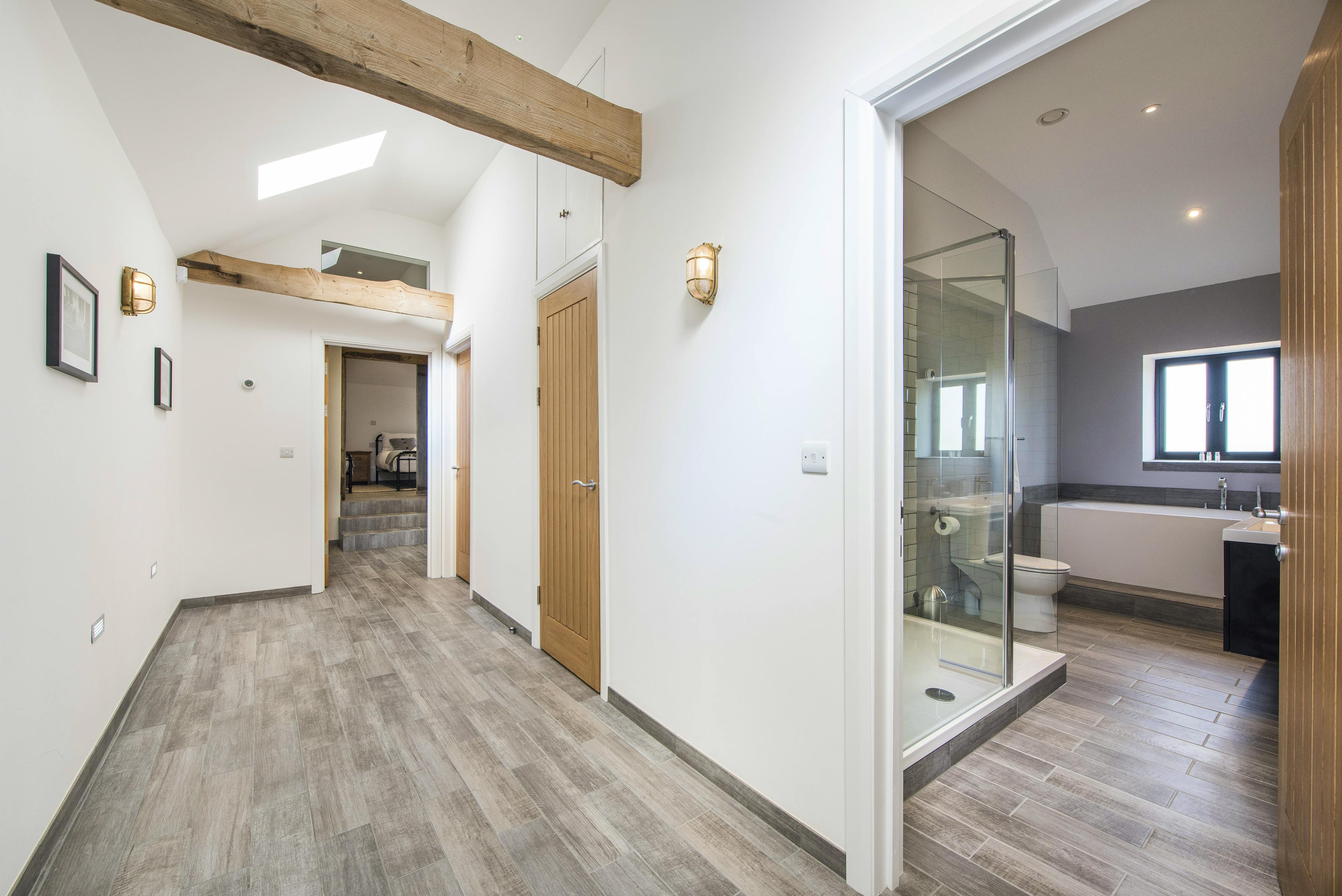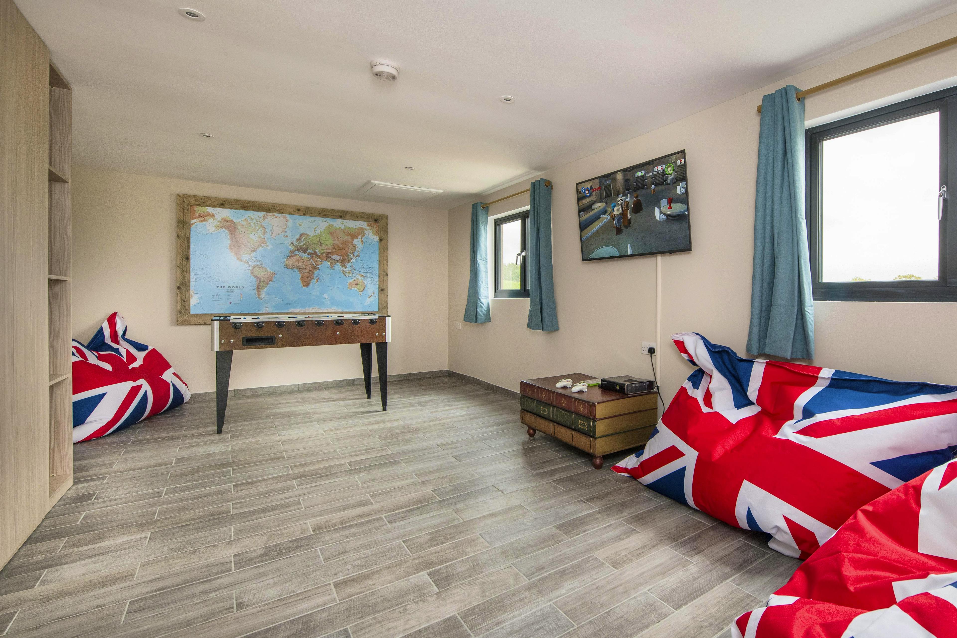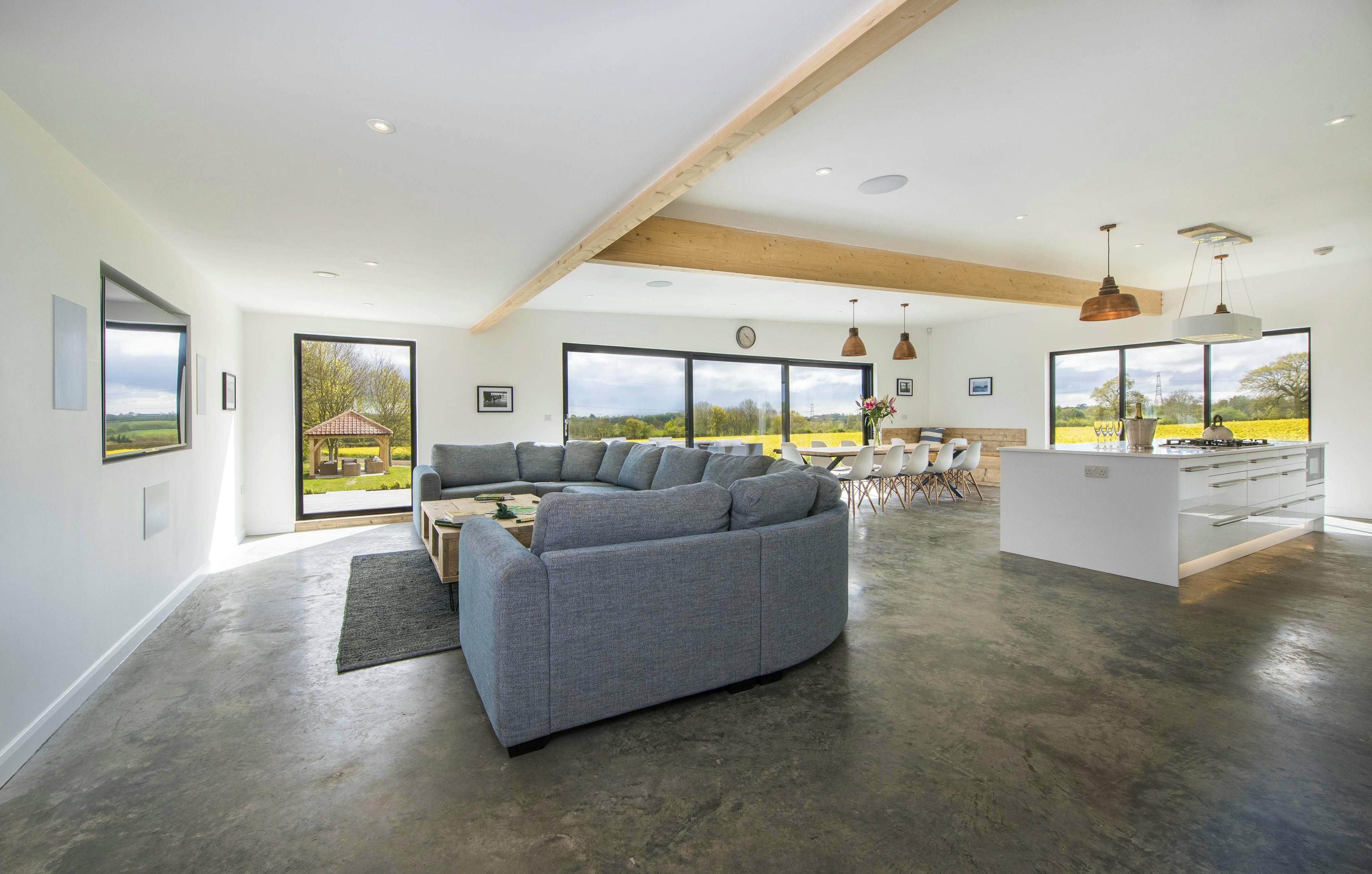 This spectacular barn is situated in a peaceful, rural location, one mile off the road and is surrounded by luscious fields and woodlands under the expansive blue Suffolk sky. Sheepyard Barn is a luxurious modern sanctuary, the perfect place to unwind, relax and spend precious moments with friends and family. There is something for everyone to enjoy, the kids will love the 'Sheep Dip' swimming pool, which even has a Fastlane counter-current machine. It is situated at the heart of the home and is accessible from the lounge, but adults can keep an eye on the fun through handy windows in the kitchen and hallway. The games room will also prove popular giving the young ones space to game, watch and chill while the grown-ups can enjoy late-night drinks in the hot tub and leisurely outdoor dinners. Foodies won't be able to keep out of the stylish kitchen, surrounded by expansive windows showing off the beautiful countryside which encompasses the property. Fellow guests can enjoy canapés at the kitchen counter before the party moves to the large dining table, beautifully lit with pendant lamps, for supper catching up and making memories. Cosy chats can be continued on the huge sofa which occupies the living area of this wonderful space. Again, chic and modern, the hues are grey and off-whites, giving a spacious contemporary atmosphere. Alternatively, simplify the suppers and cook homemade pizzas in the wood fired pizza oven before finishing the party in the hot tub under the expansive skies, spotting constellations while sipping bubbly. Bedrooms are lush, peaceful and beautiful, tastefully decorated in bright whites while beds have deep, comfy mattresses dressed in quality linens. And that view is never far away, as the large windows stretch around the quality offering natural light and views in all of the rooms. There are two super king doubles, a twin and a bespoke bunk room, which has been designed for all ages with high ceilings, double beds and phone charging shelves. The bathrooms all have huge walk-in showers and there are two Corian baths. The barn has been renovated to such a high standard that guests would be forgiven for not budging an inch from this lovely spot but those wishing to explore the wider area will not be disappointed. There are circular walks from the door of the barn and Suffolk is a hidden treasure with lovely sandy beaches, quaint villages and market towns and lots of cosy pubs for Sunday roasts with the family or romantic evenings out.
