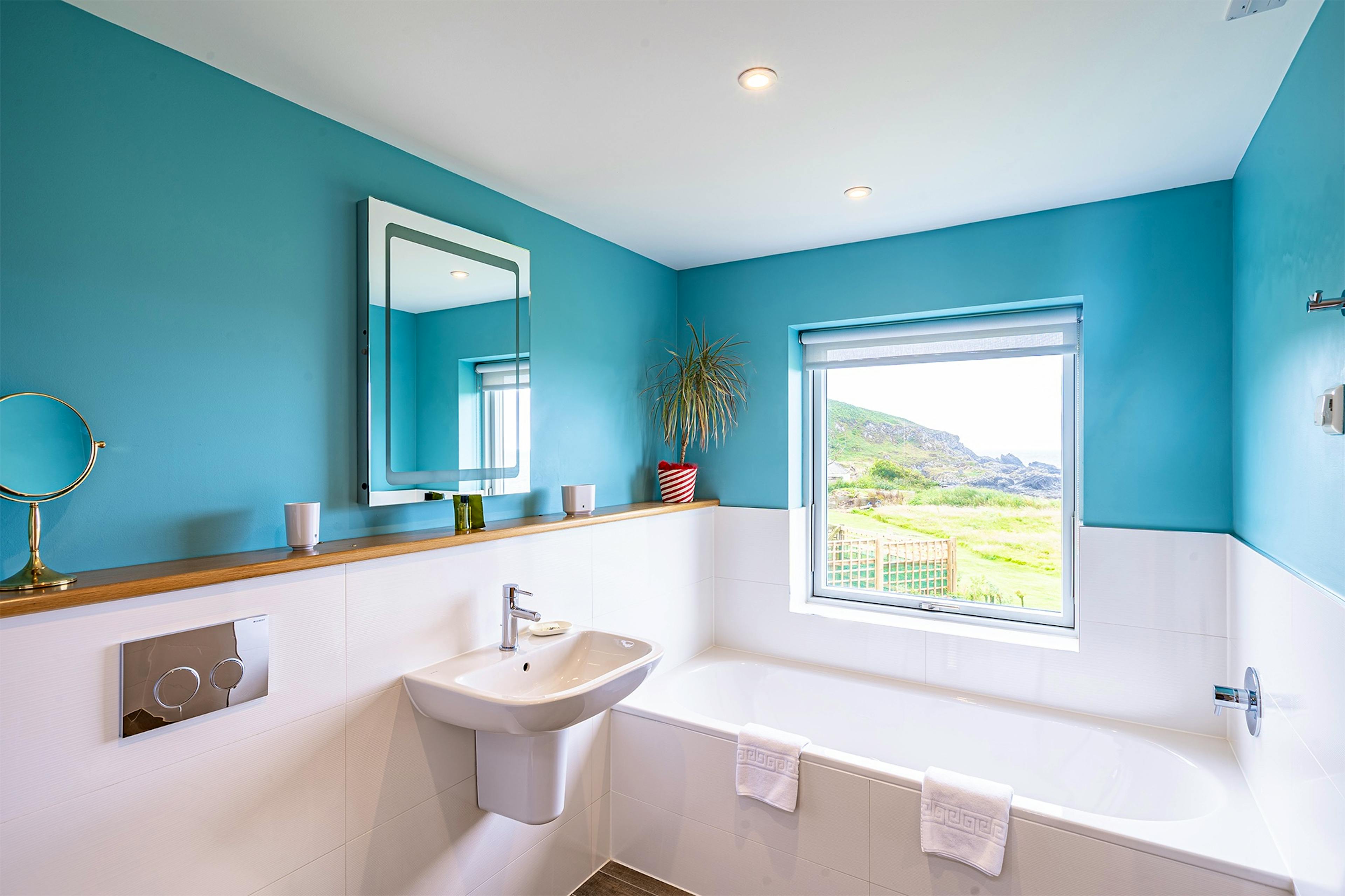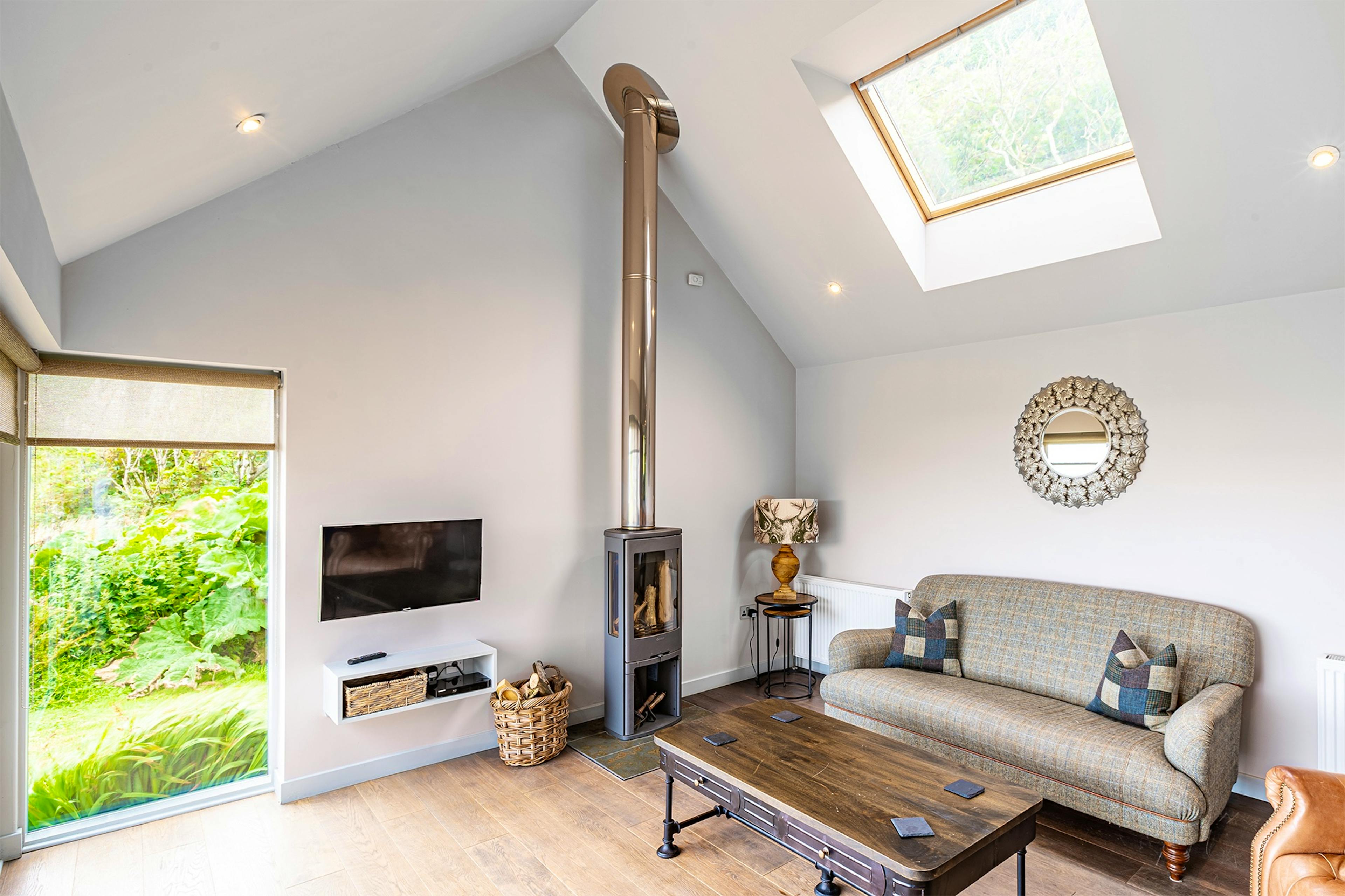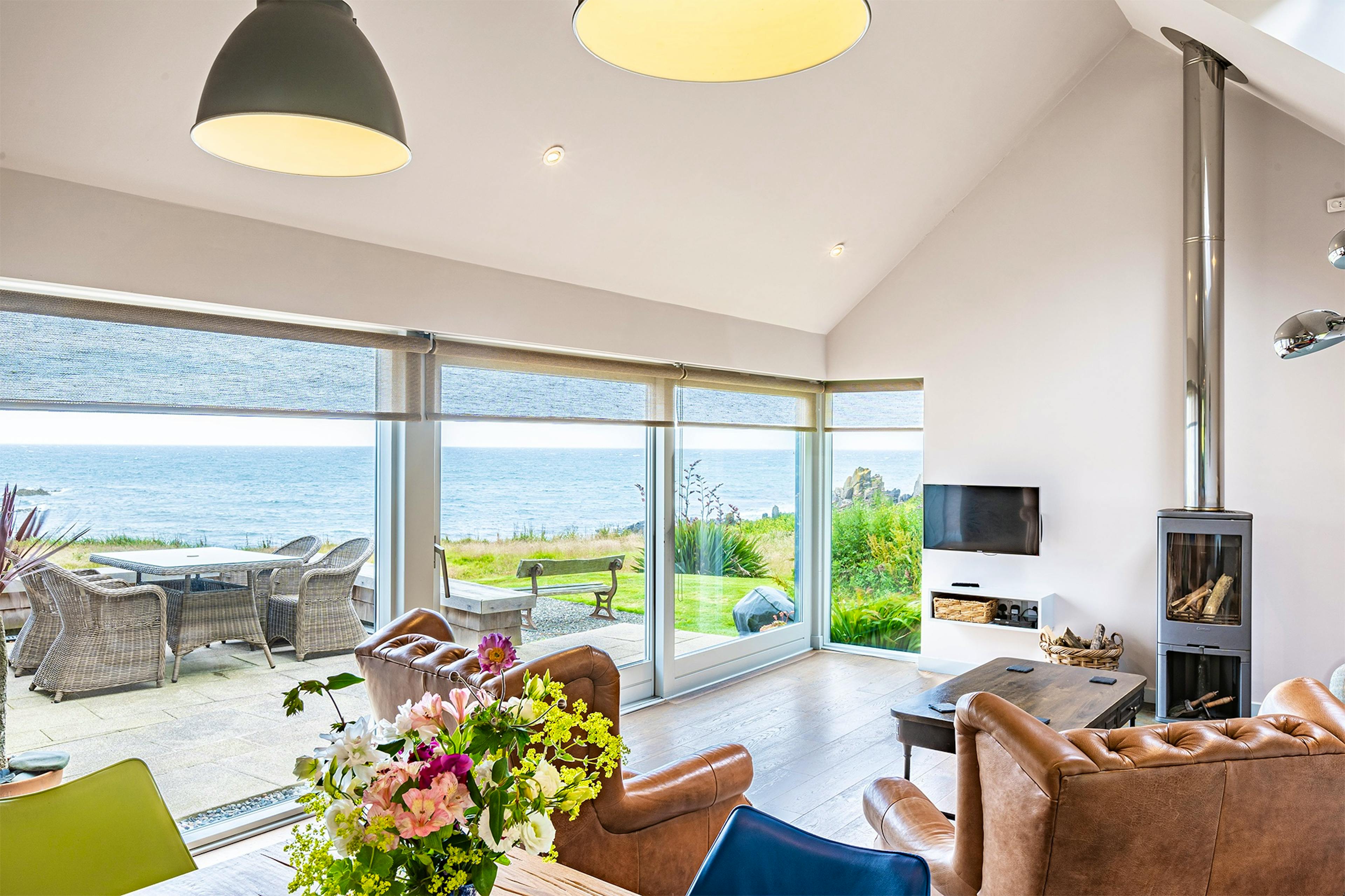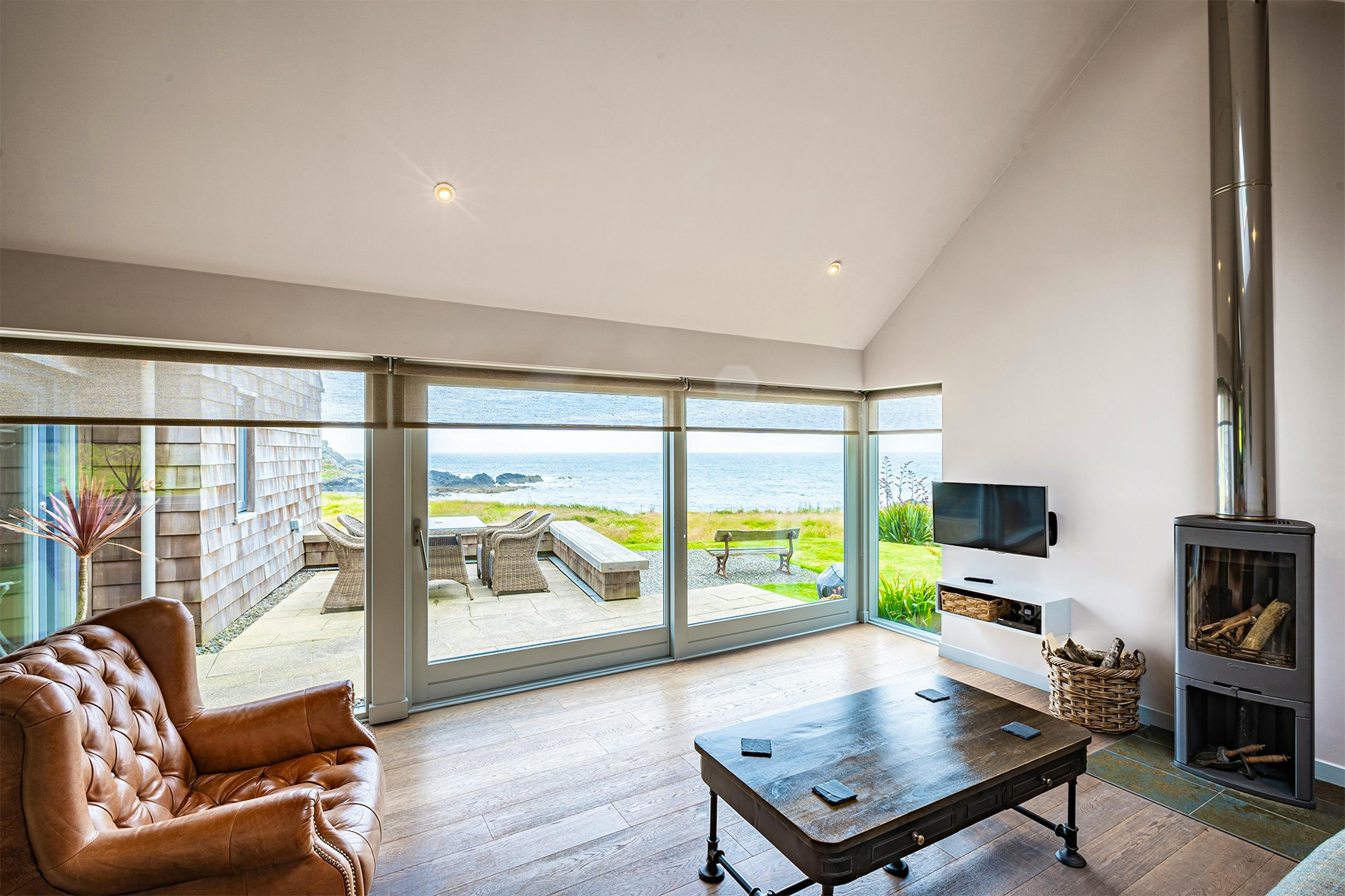 The bright and airy open-plan living space features huge windows framing the coastal scenery, a wood-burning fireplace, underfloor heating and remote-controlled skylight blinds.