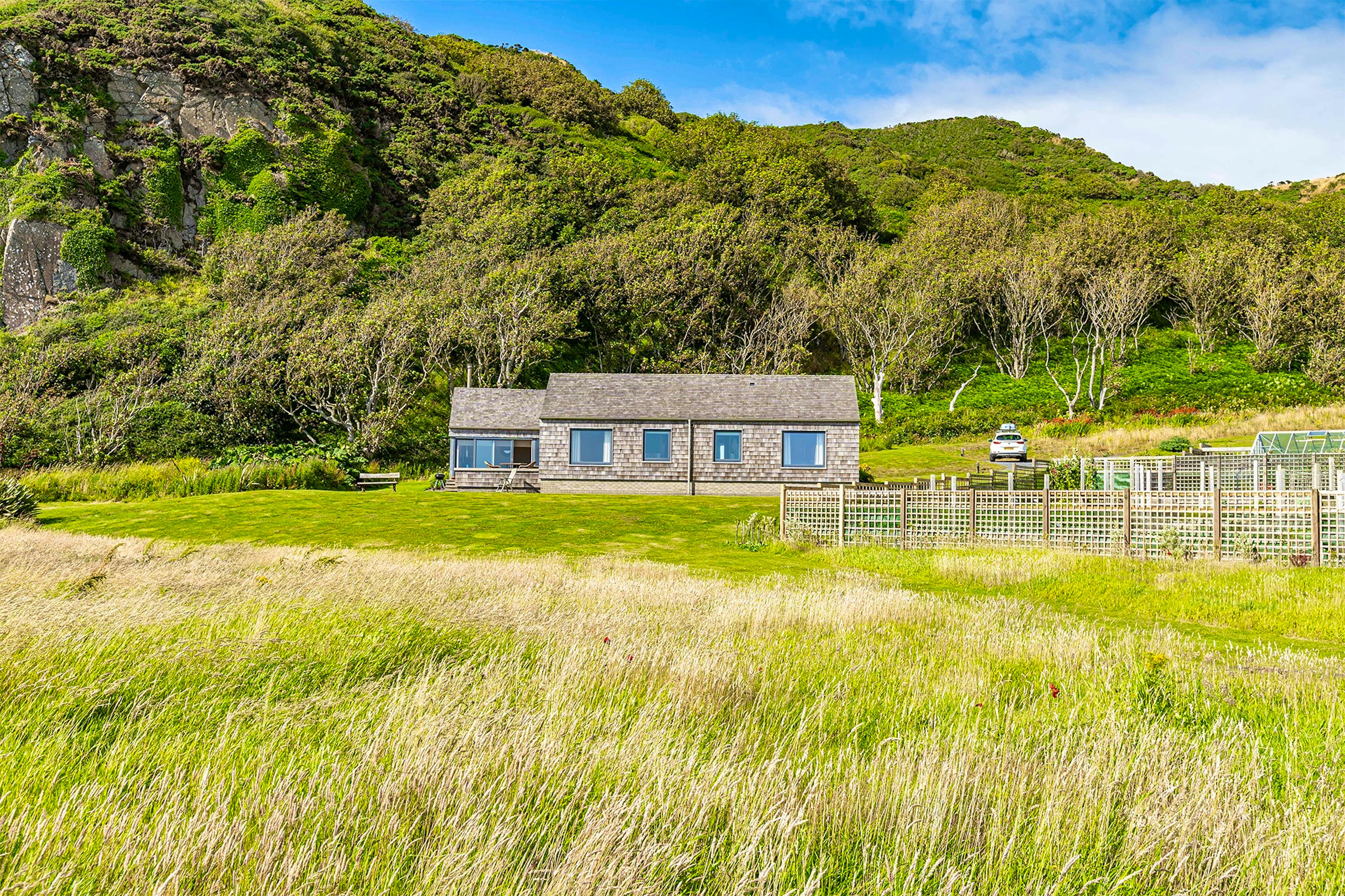 Shingle Lodge offers a peaceful coastal retreat for up to four guests, with stunning views of a picturesque beach, towering cliffs and the sea below.