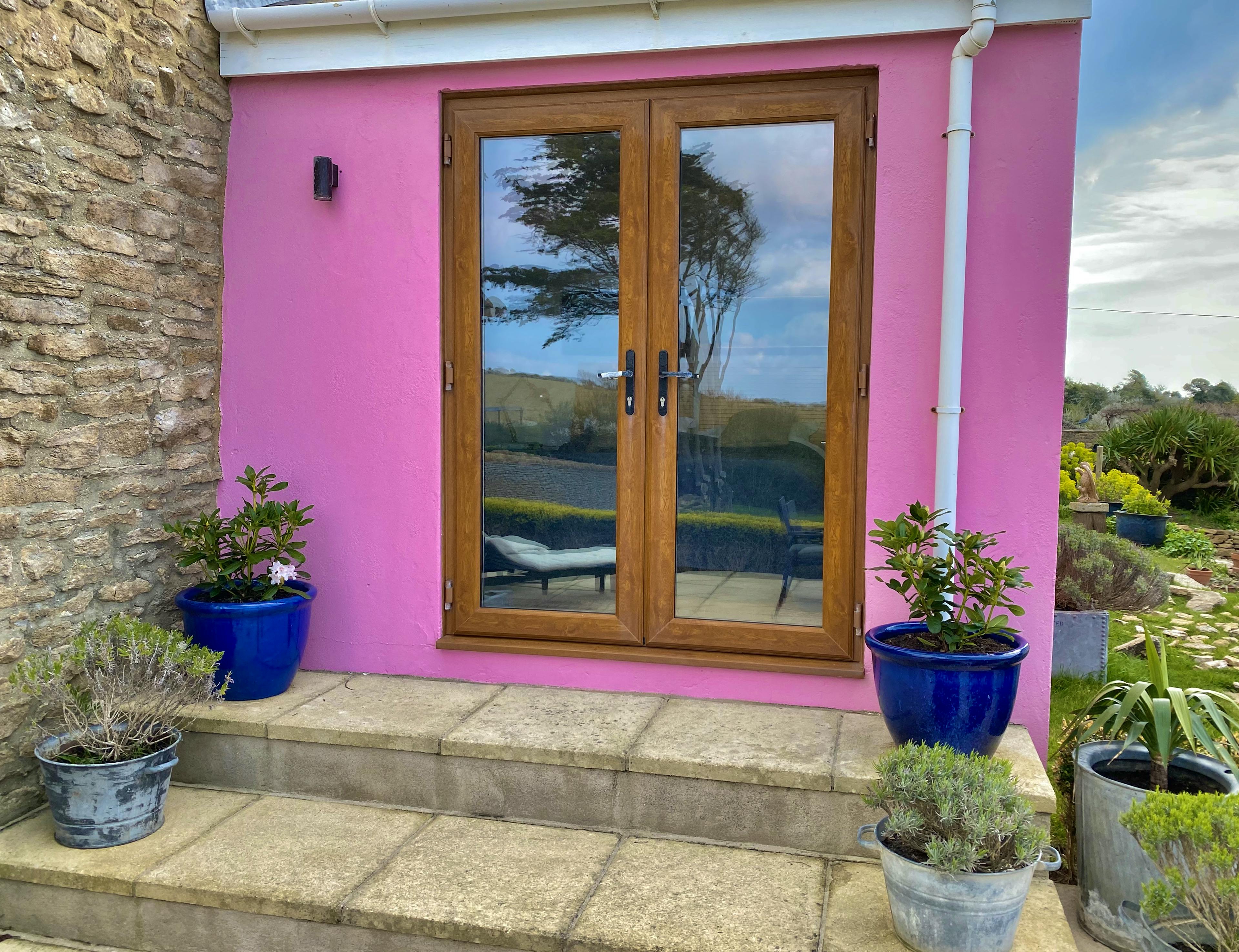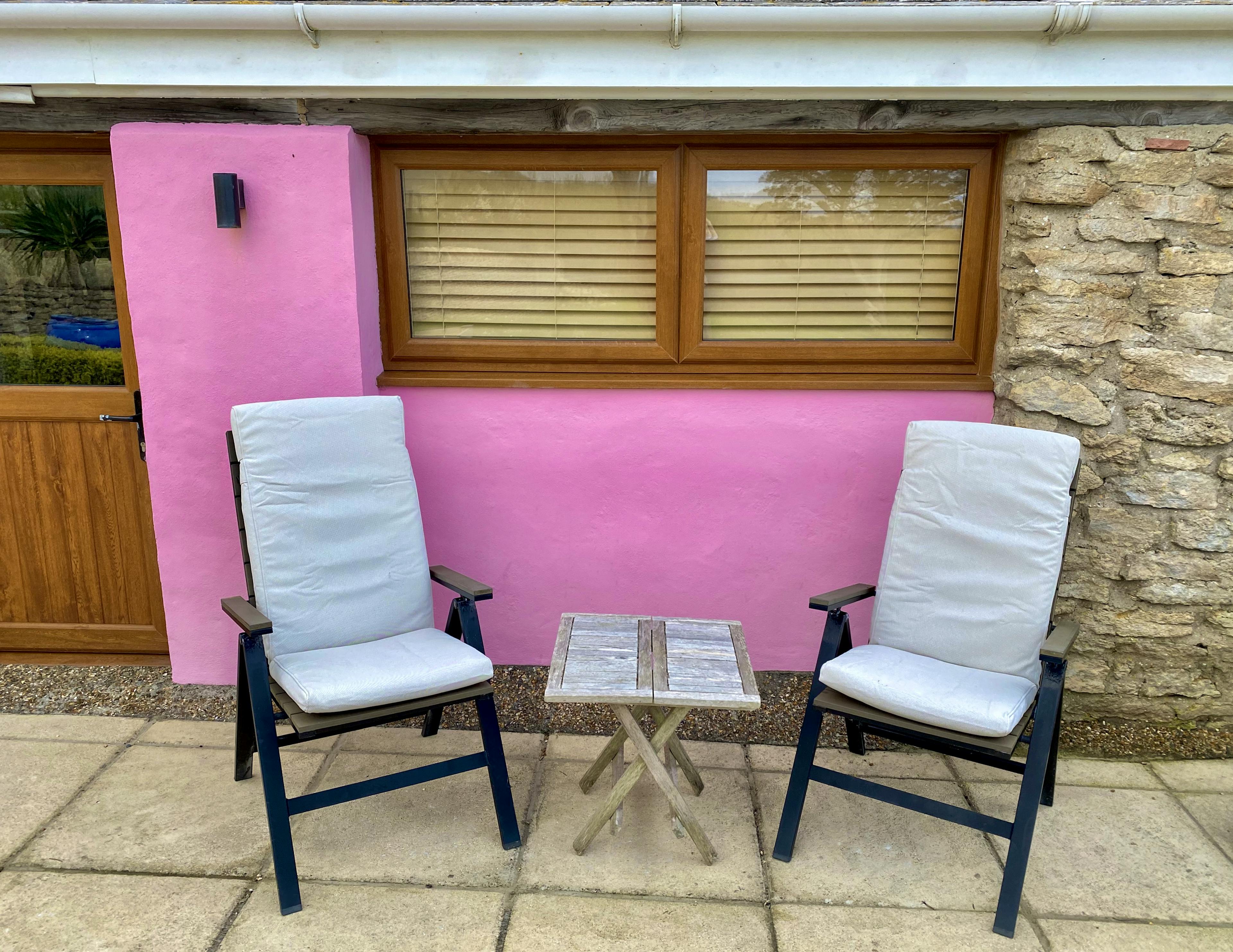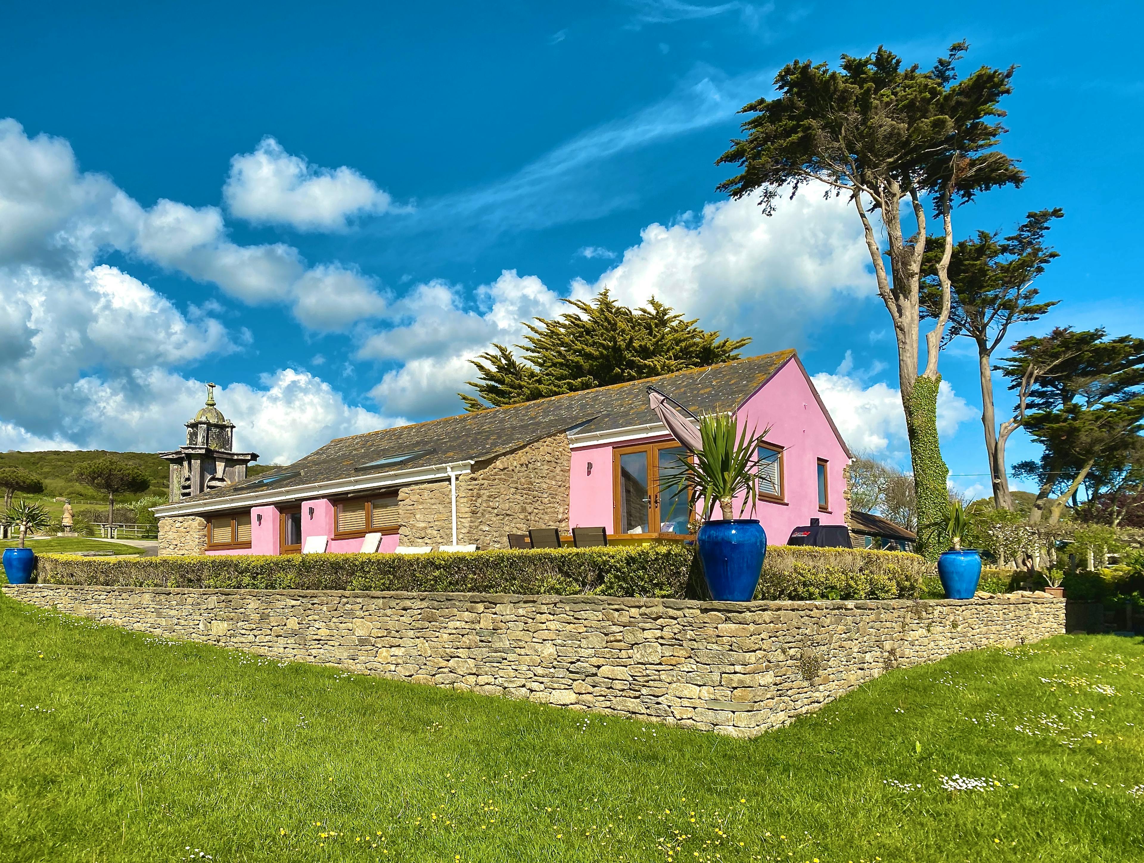 An immaculate converted stone and pink rendered barn with a lovely garden surrounded by National Trust farmland.