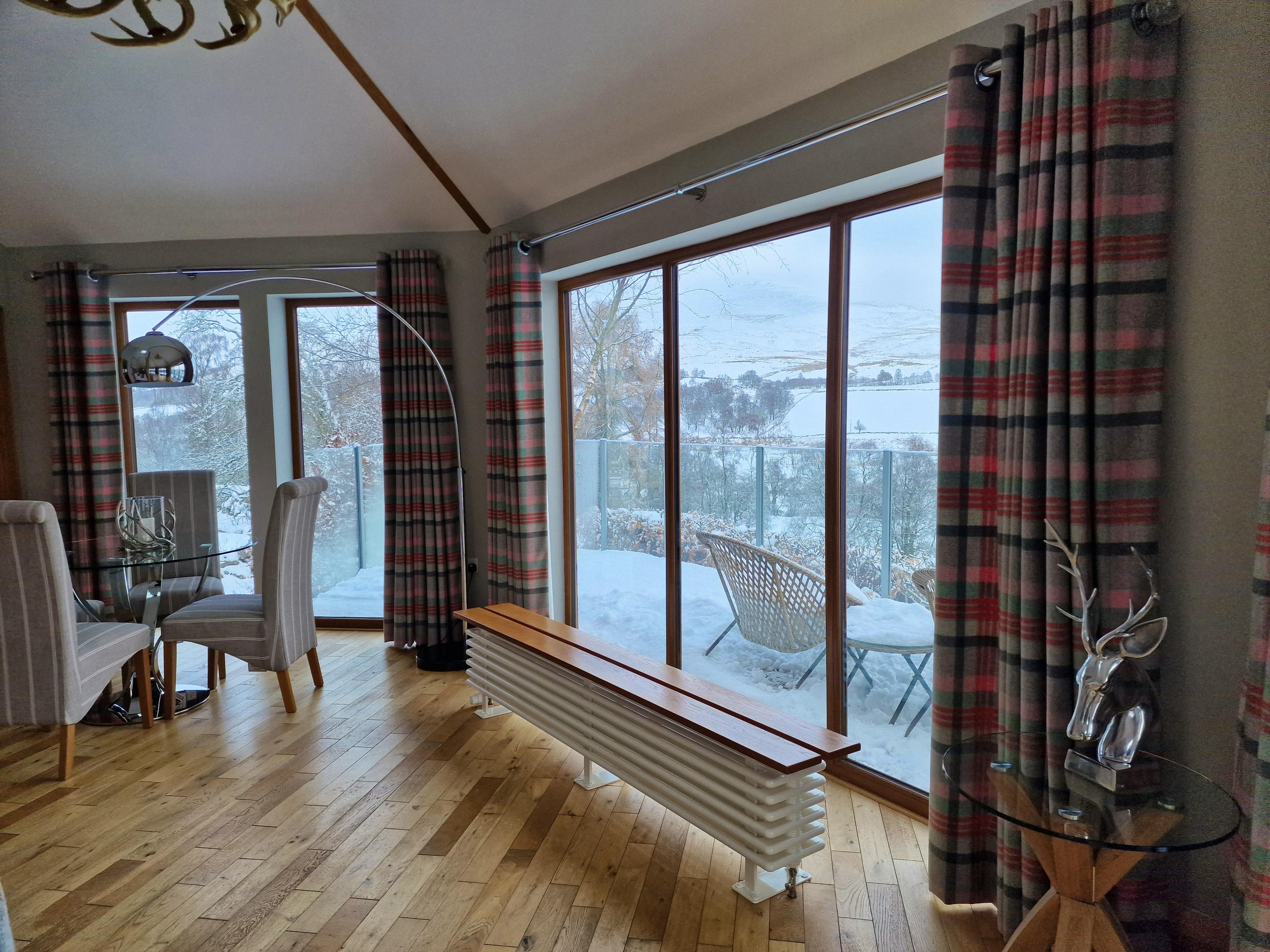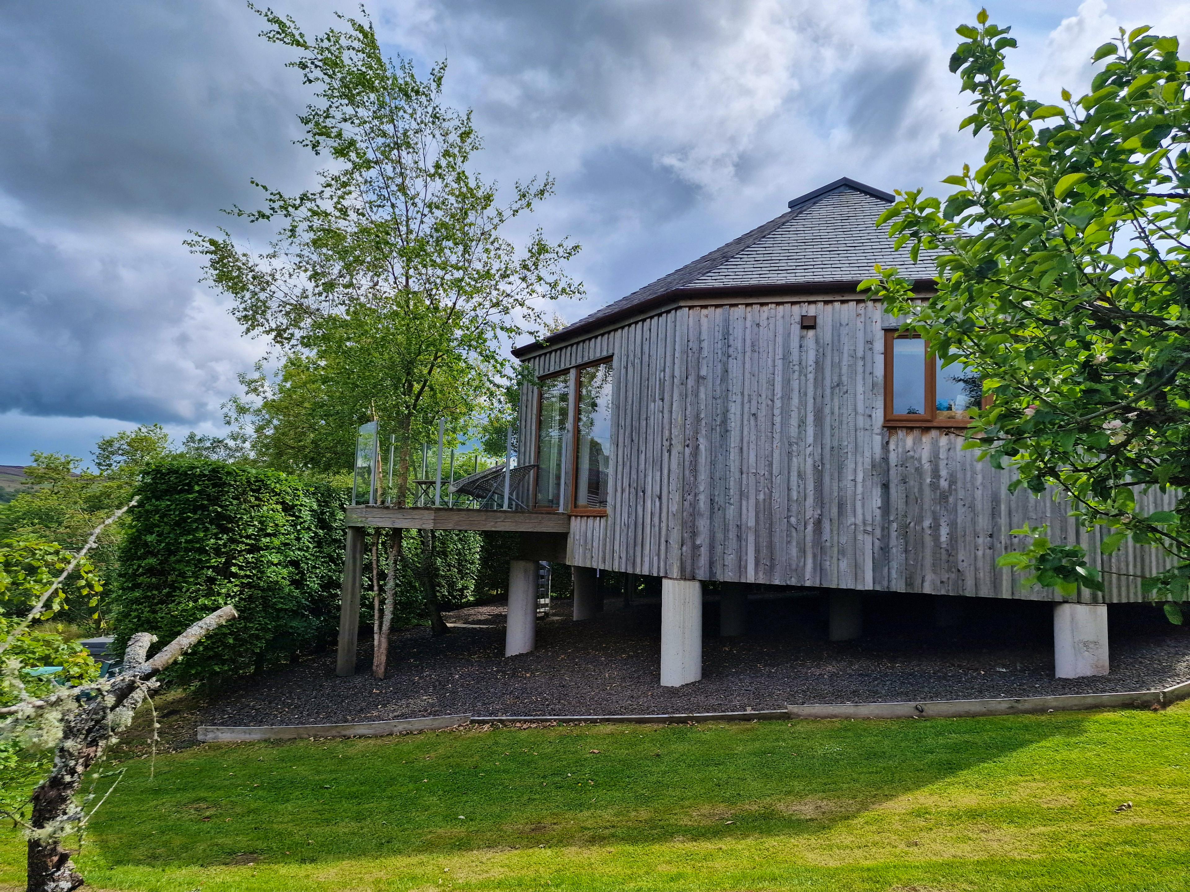 Secluded luxury treehouse in Highland Perthshire with 180 degree floor to ceiling windows framing panoramic views across the Glen to the Cairngorms.