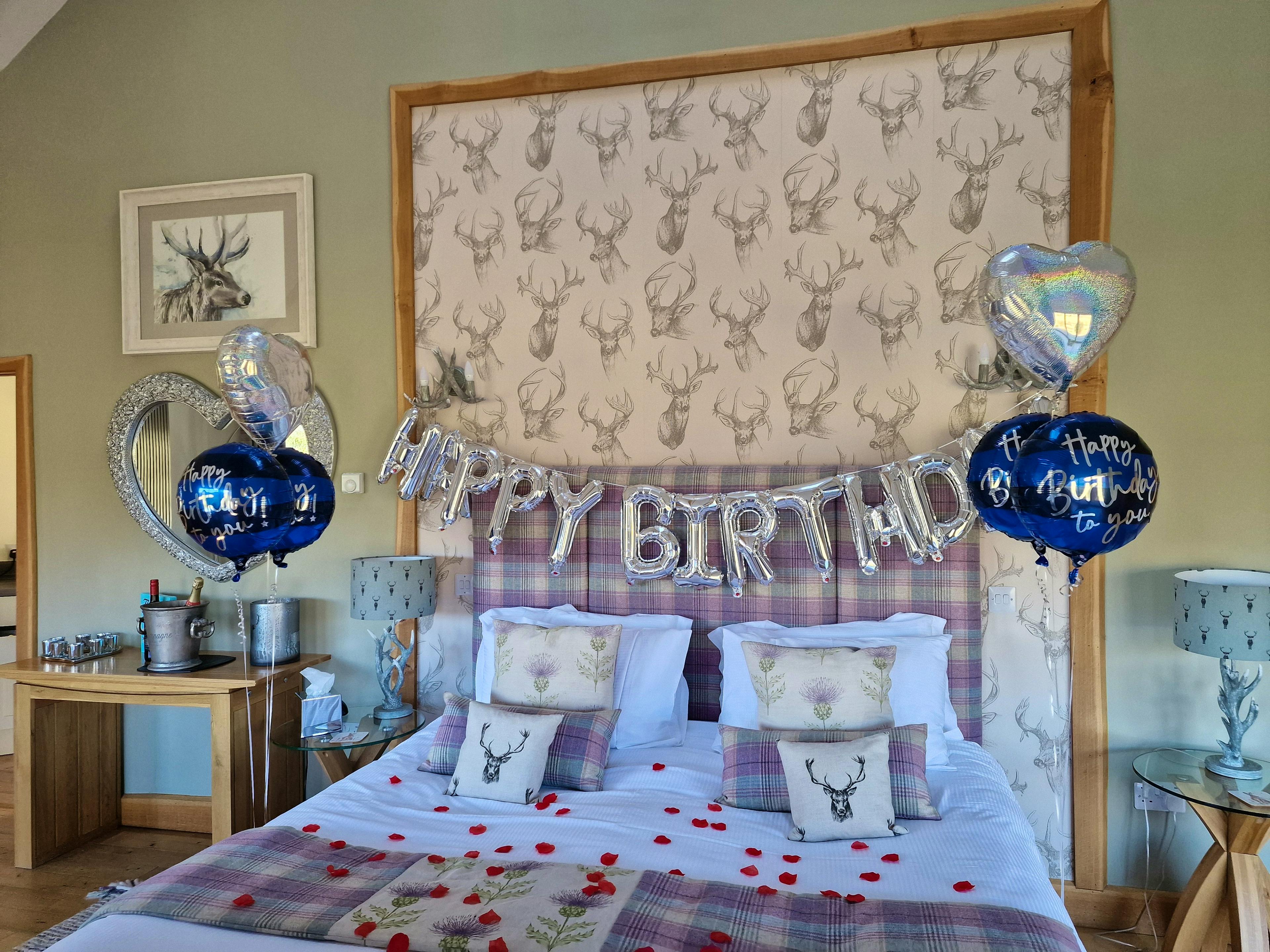 Perched among silver birch and hazel trees in the heart of Highland Perthshire, Silver Birch Treehouse is a romantic hideaway with truly breathtaking views. From the moment you wander through its private wall of logs and follow the fairy-light lit path, there’s a sense of stepping somewhere special. Then the landscape reveals itself. With 180 degrees of floor to ceiling windows, the living space opens out to sweeping views across the Glen towards the Cairngorms, where mountains, moorland and ever-changing skies create a cinematic backdrop to your stay. Inside, the large open plan bedroom and living area feels both indulgent and serene. The super-king size bed sits beneath a vaulted ceiling with a glass pyramid rooflight, inviting you to lie back and watch the stars appear one by one. A comfortable sofa is perfectly positioned for soaking up the scenery or settling in with a film, while the dining area offers a cosy spot for slow breakfasts and relaxed suppers. The kitchen is fully equipped with fridge, freezer, microwave, electric oven, gas hob, dishwasher and washing machine, while the breakfast bar makes the most of those far-reaching northern views towards the Cairngorms. The bathroom adds a touch of playful luxury, with its feature bubble wall, double-ended freestanding bath with water-blade tap and generous walk-in rainfall shower. His and hers wash basins complete the spa-like feel, making even the simplest morning routine feel indulgent. Step through the patio doors onto the wrap-around deck and the views become even more immersive. There’s space for alfresco dining and morning coffee, surrounded by birdsong and rustling leaves. From here, a spiral staircase leads you down and through an arched hedge-way to your private hot tub, tucked into a secluded spot where you can sink into warm bubbles while gazing out across the Glen. Set within easy reach of the Cairngorms National Park, Royal Deeside and the Angus Glens, this is a dream base for outdoor lovers. Drive the dramatic Snow Road along the A93, visit iconic castles such as Balmoral and Braemar, or spend a day skiing at Glenshee in winter. In summer, hike heather-clad hills, spot red deer and Highland cows, and explore nearby towns like Pitlochry and Ballater before returning to your treetop retreat for a sunset soak beneath vast Scottish skies.