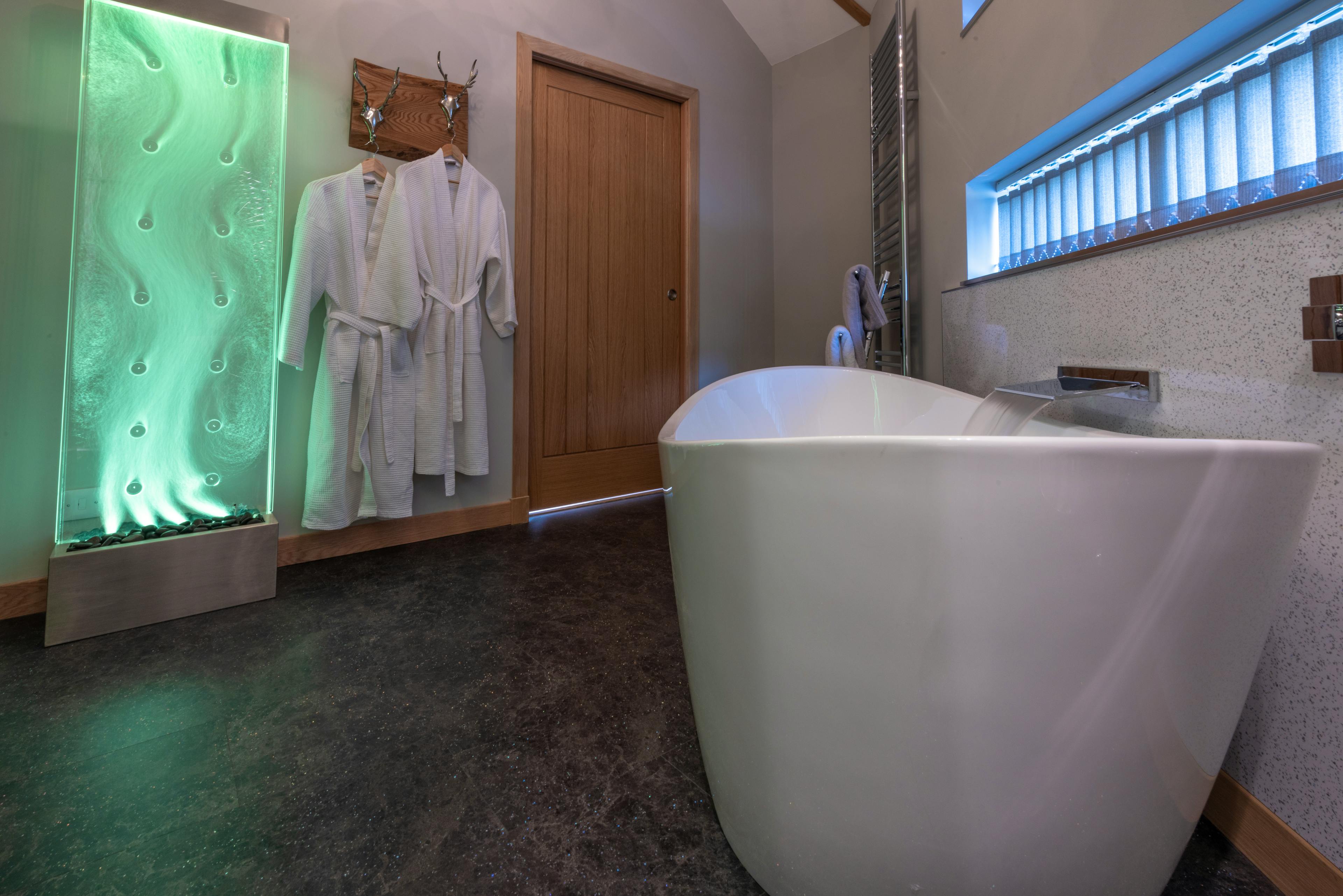 Spa-style bathroom featuring a double-ended freestanding bath, generous rainfall shower, his and hers basins and a playful bubble wall that glows softly in the evening.